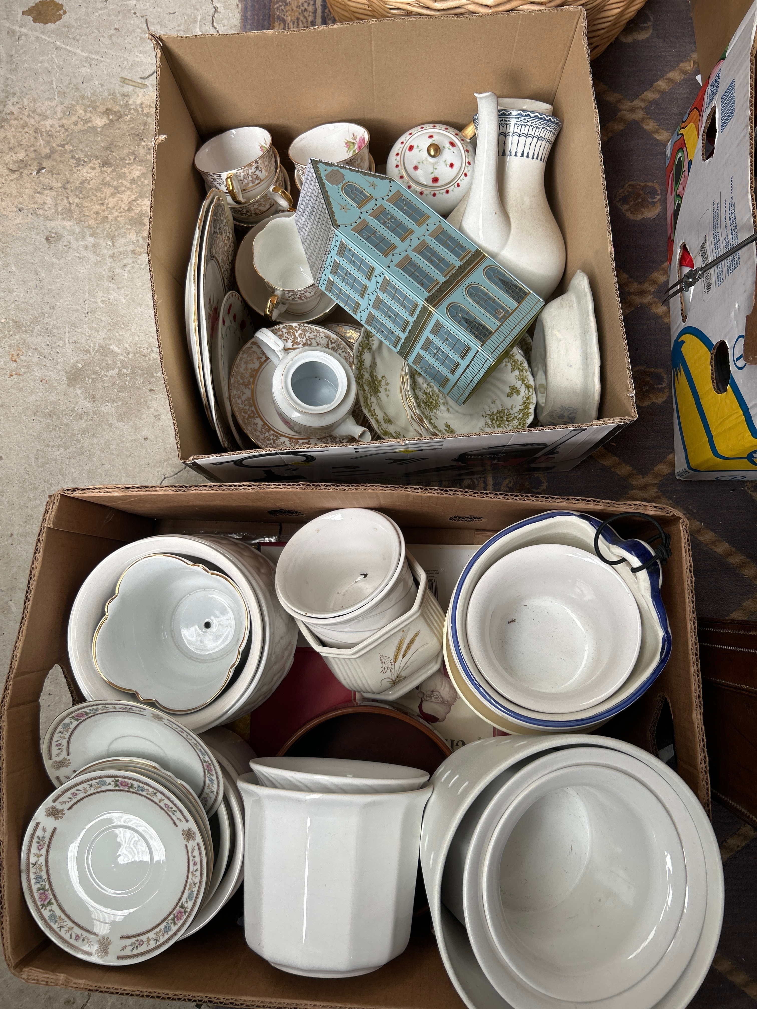 This lot comprises a varied collection of porcelain and ceramic dinnerware and decorative items. The top box contains a mix of fine china tea cups and saucers with gilded and floral patterns, some featuring pink roses or green foliage. Also present are a small lidded sugar bowl with red floral decoration, a plain white ribbed vase, and another white vase or creamer with a blue Greek key pattern along the rim. A light blue decorative tin shaped like a building, marked “M&S,” is included. The bottom box holds a selection of predominantly white ceramic bowls, plates, and saucers; some feature fluted or scalloped edges, one bowl has a faint wheat design, and another set of nesting bowls exhibits a distinct blue rim. The saucers display intricate floral and geometric border patterns. Materials are primarily porcelain and various ceramics, with one tin item.