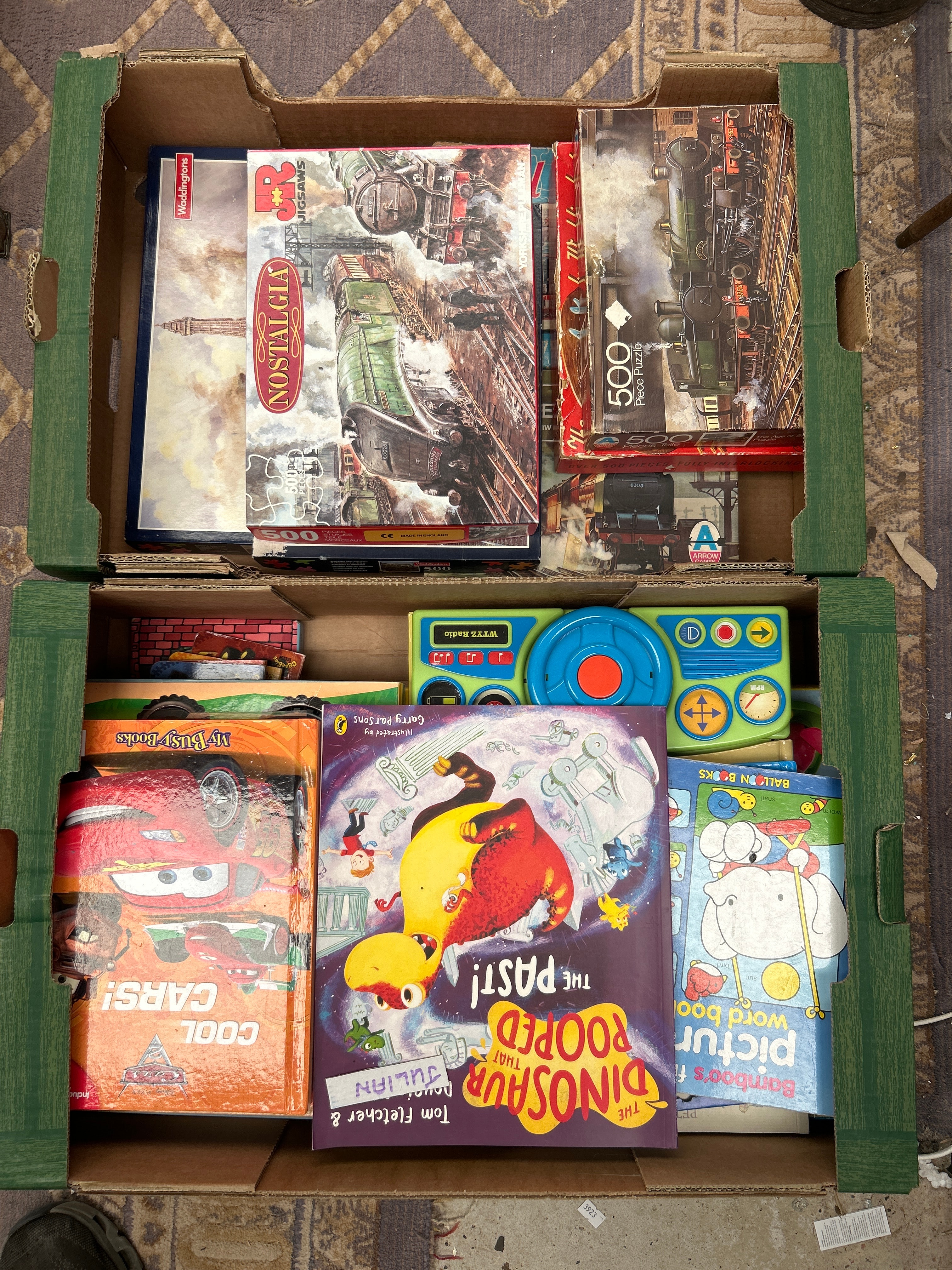 This lot comprises a collection of recreational items housed within a two-tiered, repurposed corrugated cardboard box. The upper section contains a group of cardboard jigsaw puzzles, primarily depicting vintage steam trains, including a “Waddingtons Nostalgia” puzzle and others labeled “JR JIGSAWS” and “Arrow Games.” One puzzle specifically features a “YORKSHIRE PULLMAN” train, noted as a “500 Piece Puzzle,” “CE Made in England,” and related to “The Age of Steam.” The lower section holds a group of children’s hardcover books, such as “My Busy Books: Cool Cars!” featuring Disney’s Lightning McQueen, “The Dinosaur That Pooped The Past!” by Tom Fletcher & Julian, illustrated by Garry Parsons, and “Bambino’s First Picture Word Book” from “Balloon Books.” Additionally, a brightly colored plastic child’s electronic toy resembling a radio, with visible text “W.T.Y.X. Radio” and an “RPM” dial, is included. A small tag bearing the number “3923” is also visible.