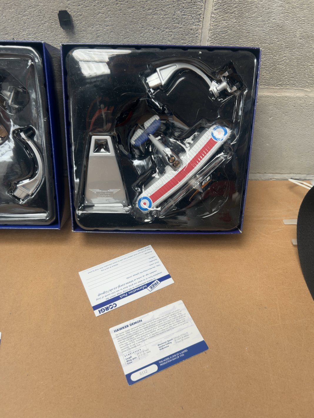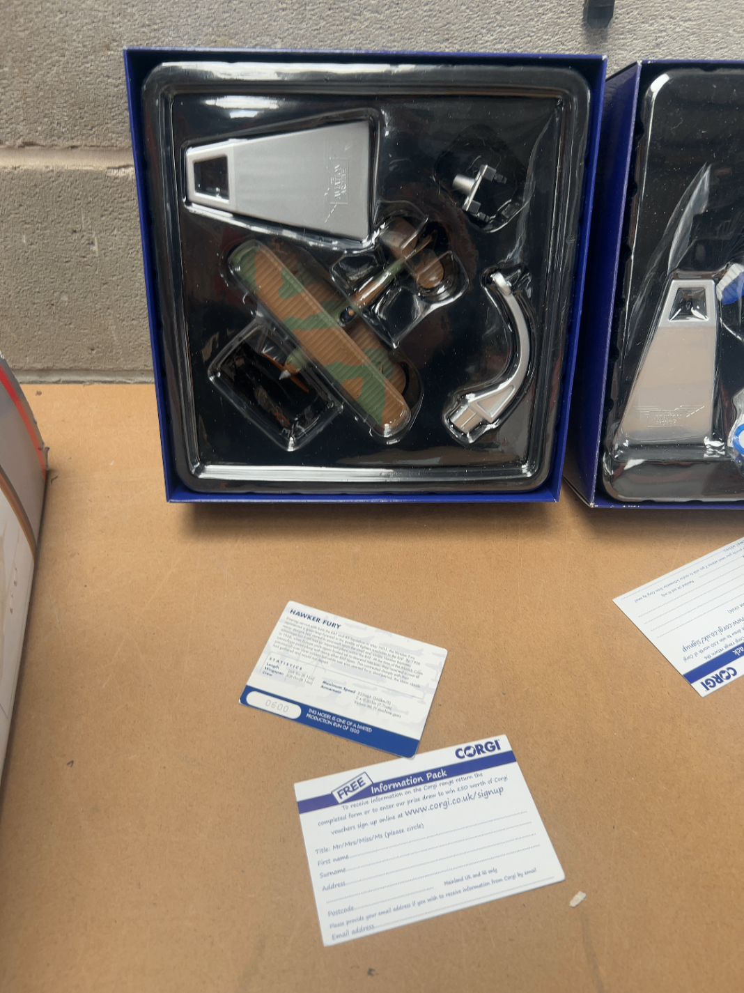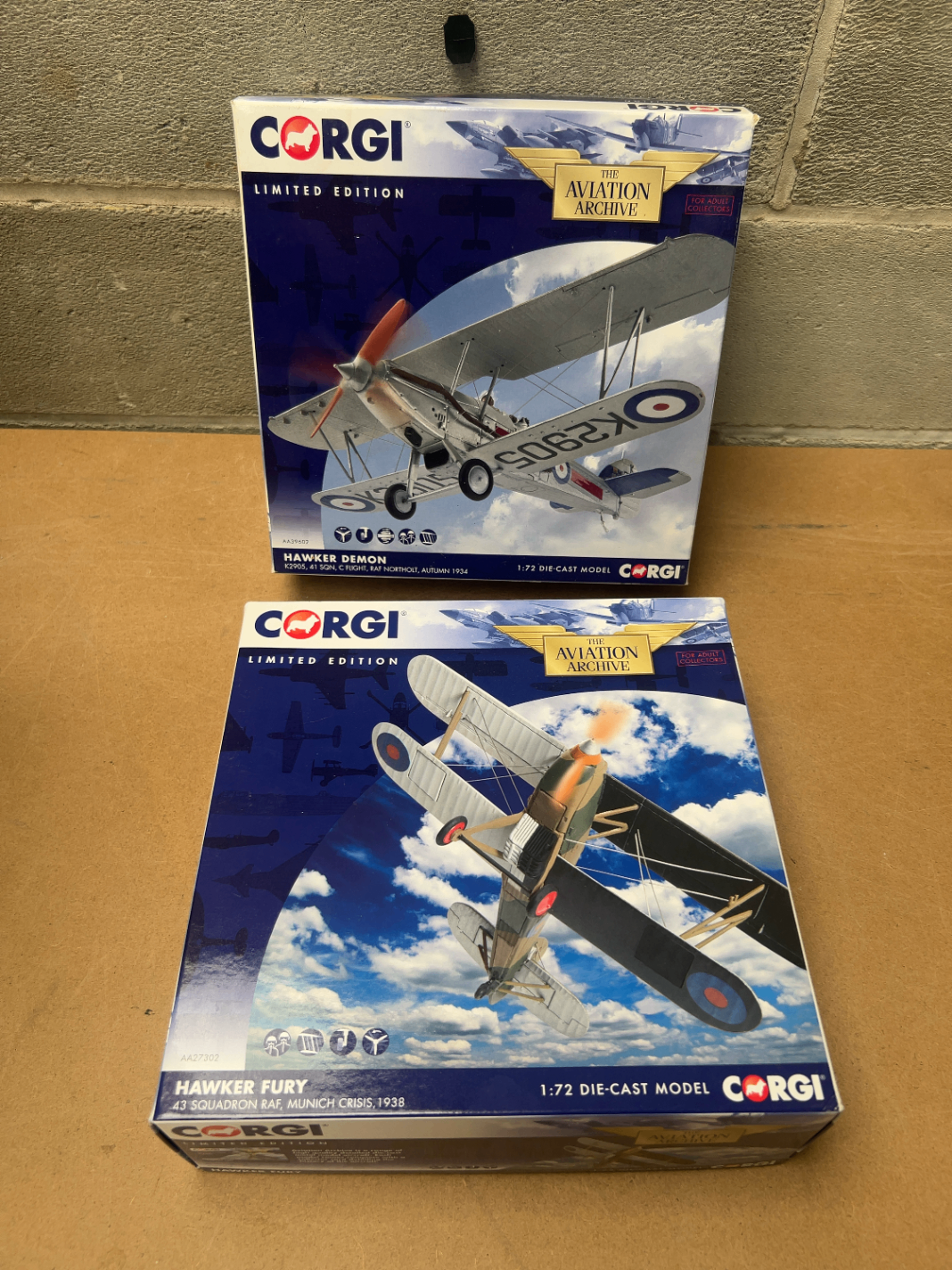The lot comprises two Corgi Aviation Archive 1:72 scale die-cast model aircraft. The first, Corgi AA33604, depicts a Hawker Demon, No. 23 Squadron RAF, Biggin Hill, Autumn 1934, in a silver livery with a red propeller. The second, Corgi AA27302, depicts a Hawker Fury, 43 Squadron RAF, Munich Crisis, 1938, in a camouflage scheme. Both models are marked as ‘LIMITED EDITION’ and ‘THE AVIATION ARCHIVE,’ with a stated production limit of 5,600 pieces for each. They are presented in their original cardboard boxes, unopened within clear plastic vacuum-formed trays, accompanied by components for display stands and ‘Information Pack’ inserts.