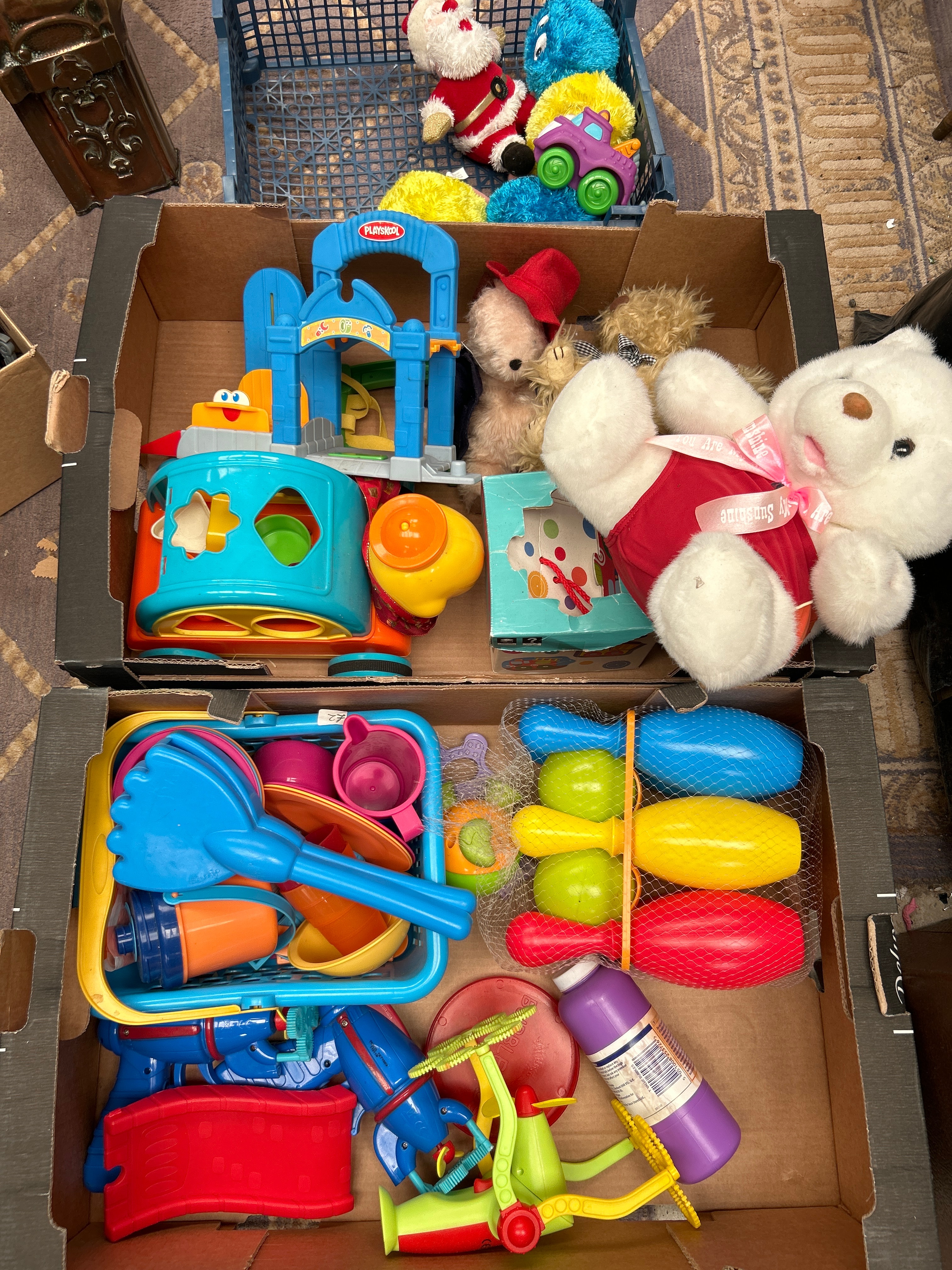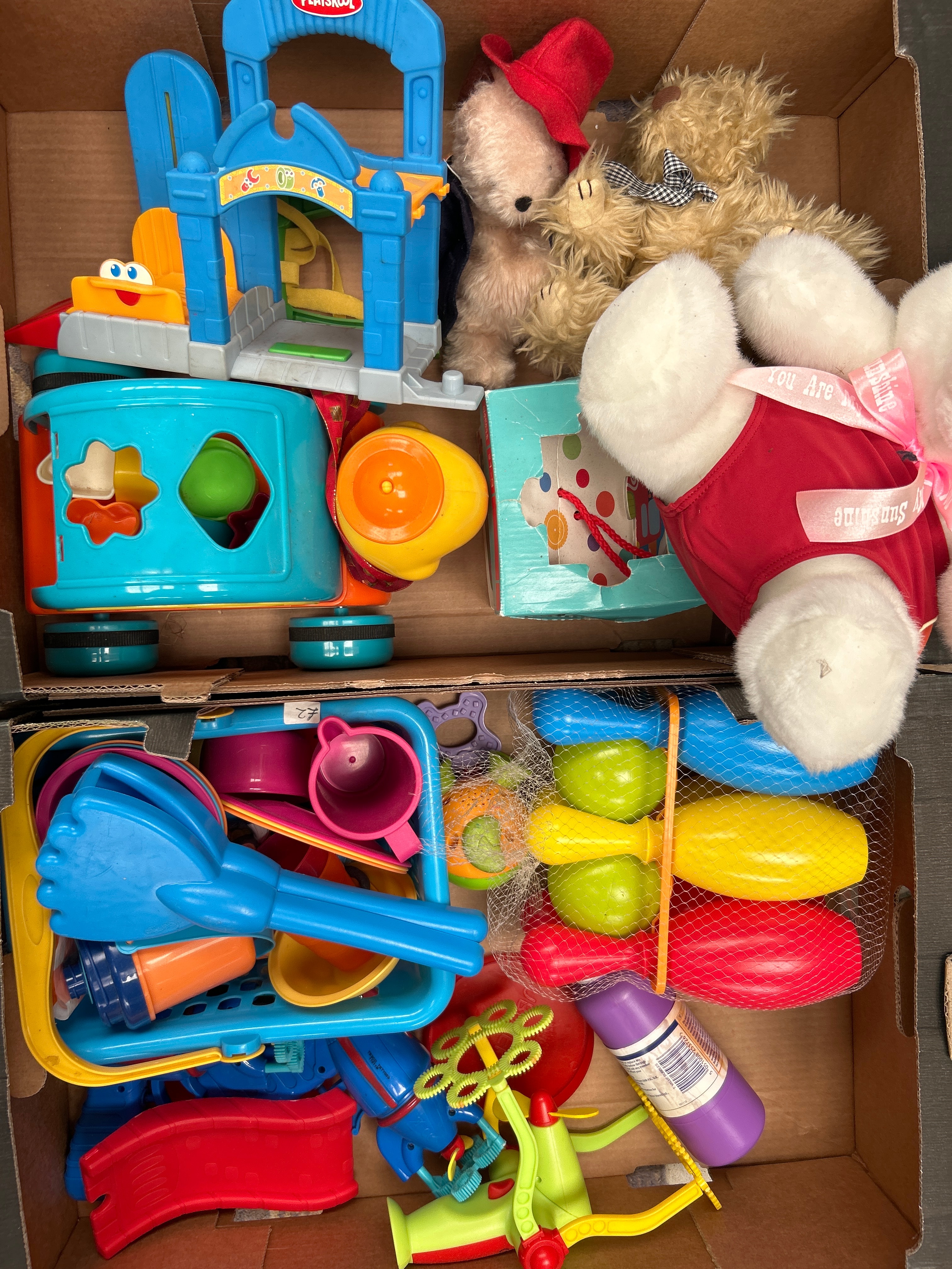 A collection of modern children’s toys, stored within two cardboard boxes. The top box contains various plastic playsets, including a blue and yellow Fisher-Price branded structure, a multi-colored shape sorter, and several plush toys, notably a large white teddy bear adorned with a red top and a pink ribbon inscribed with “You Are My Sunshine.” The bottom box holds a diverse array of plastic items, including sand and beach toys (shovels, buckets, molds), a set of colorful bowling pins within a mesh bag, a red plastic sled, and other miscellaneous plastic play items such as a blue water gun and bubble wands. The predominant materials are plastic and plush fabric.