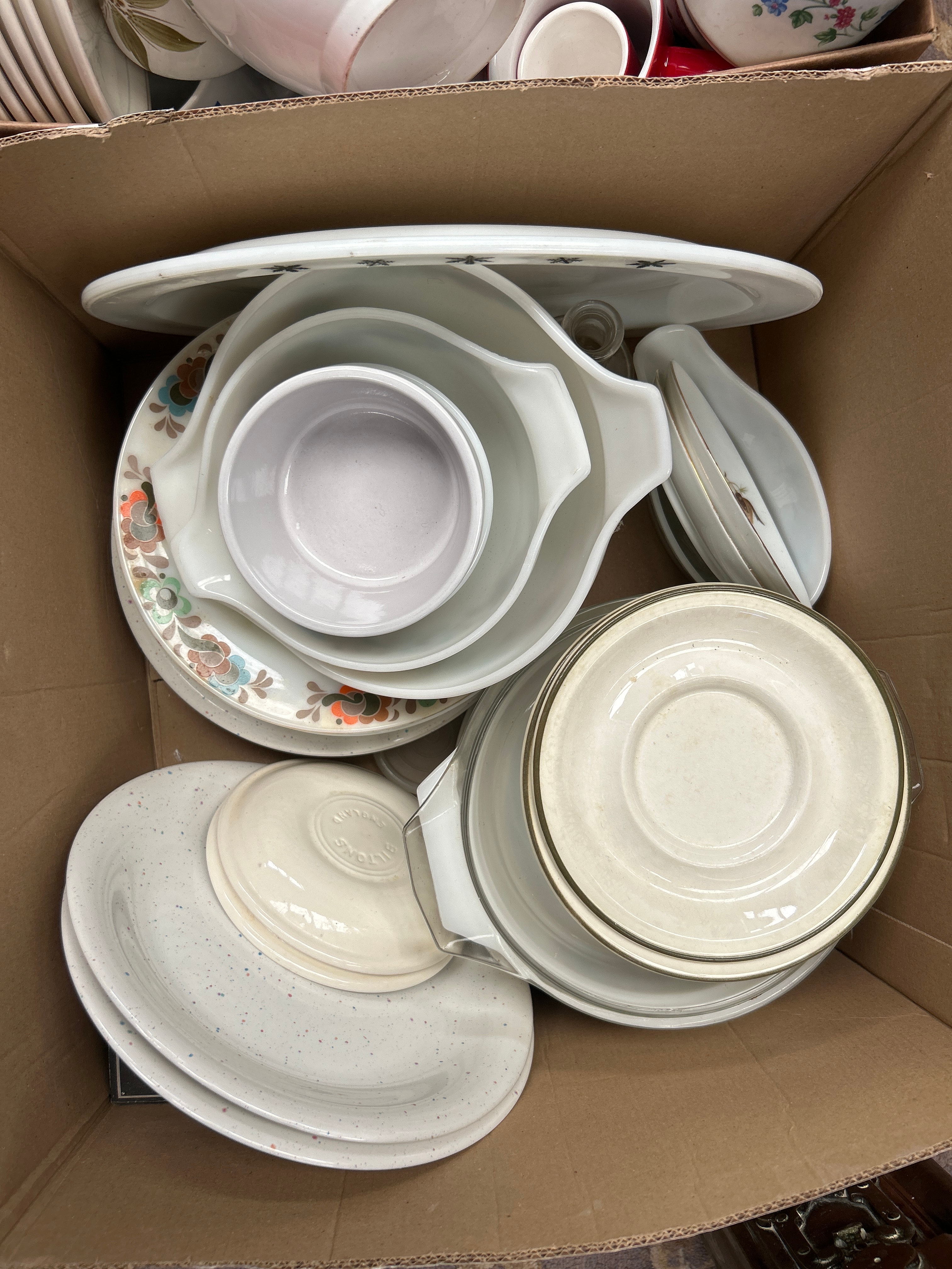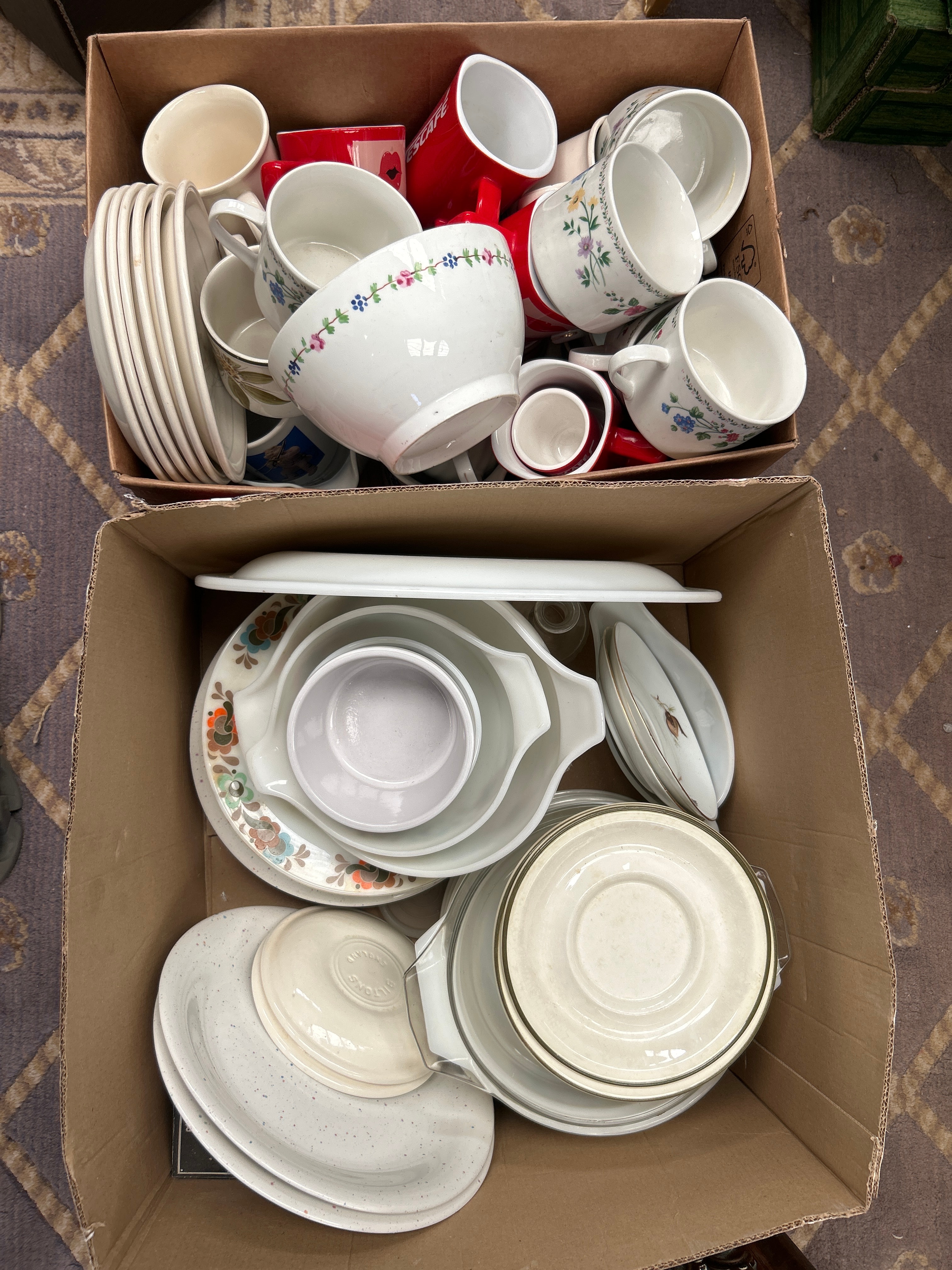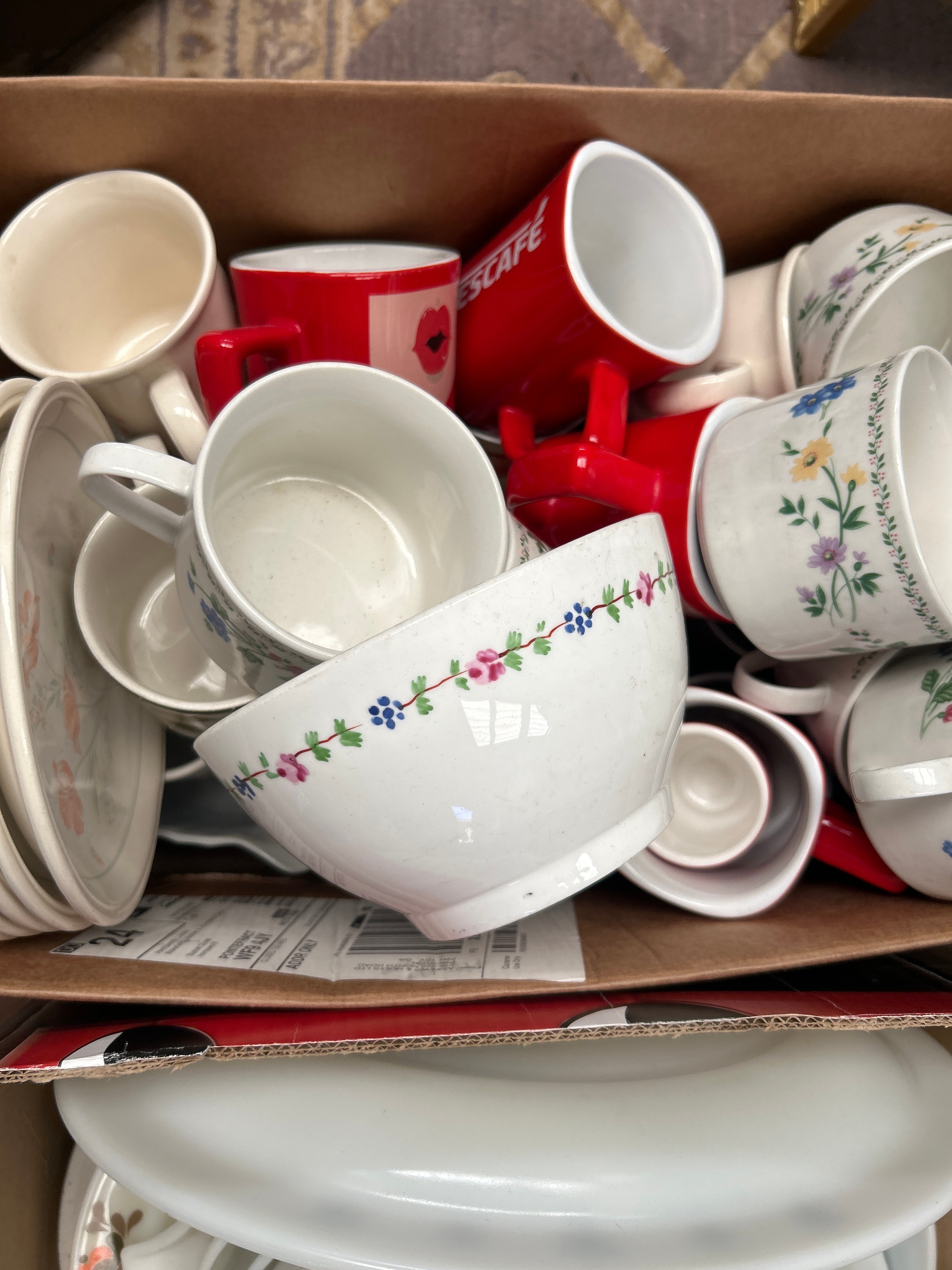 A collection primarily featuring Farberware ‘English Garden’ pattern stoneware dinnerware, presented within two cardboard boxes. The collection comprises a varied assortment of ceramic and glass kitchenware and tableware, including numerous mugs, bowls, plates, and saucers. Styles present range from plain white and solid red pieces, with one red mug clearly marked “NESCAFÉ” in white lettering, to items decorated with floral and abstract patterns, and speckled stoneware. Also visible is a nested set of white glass mixing bowls with handles, alongside various additional plates and a lidded cream-colored bowl with indistinct embossed text.