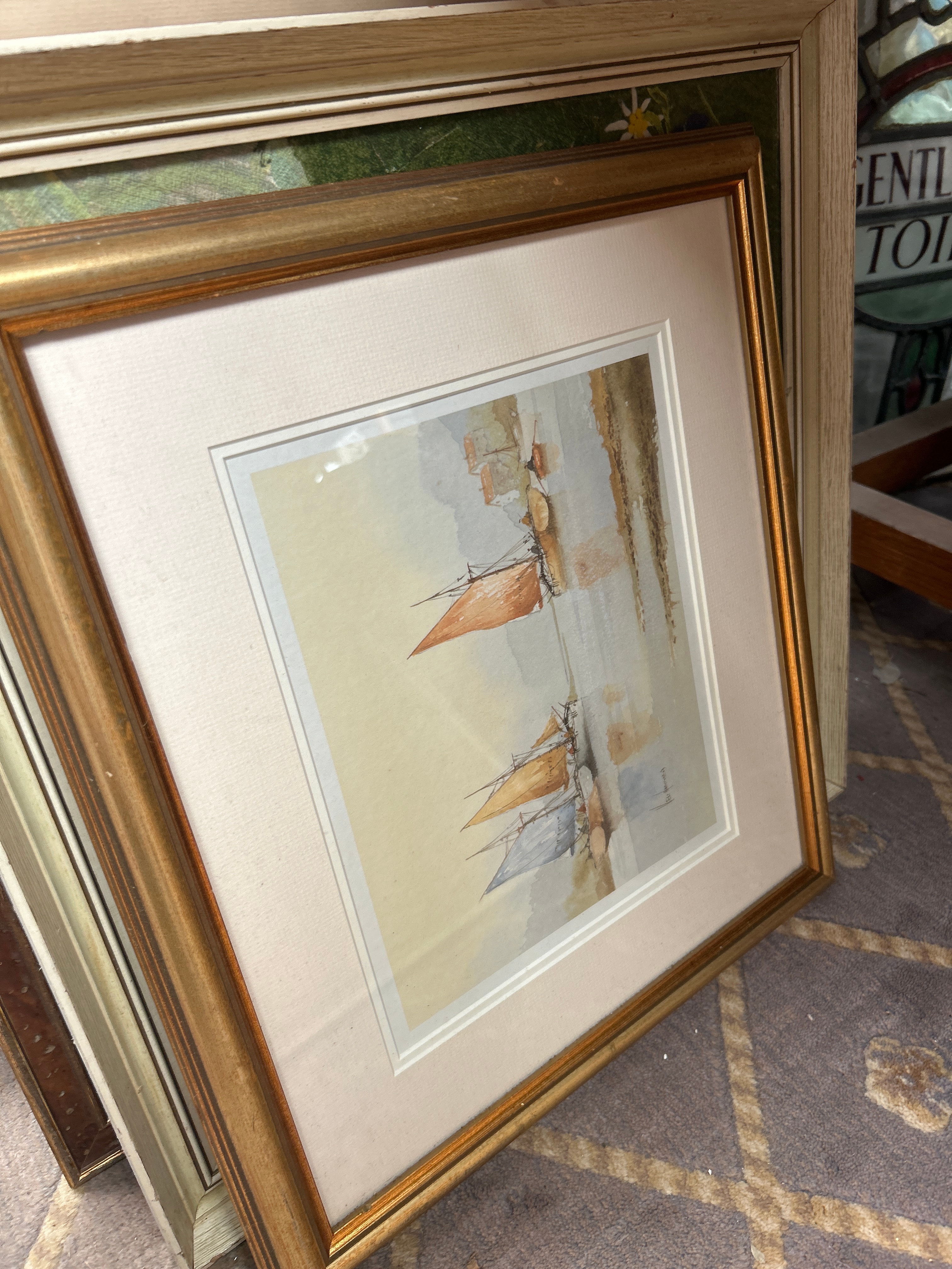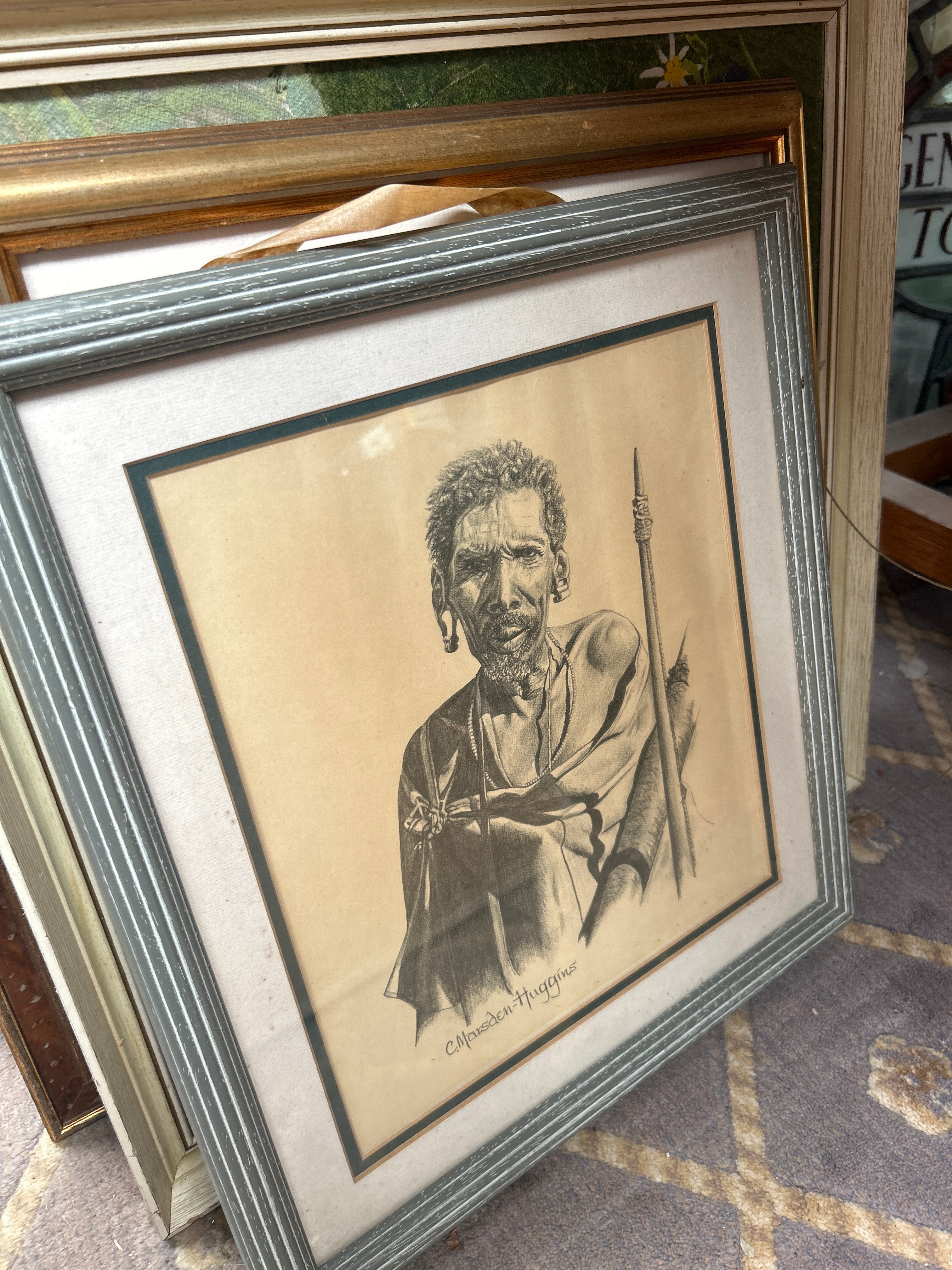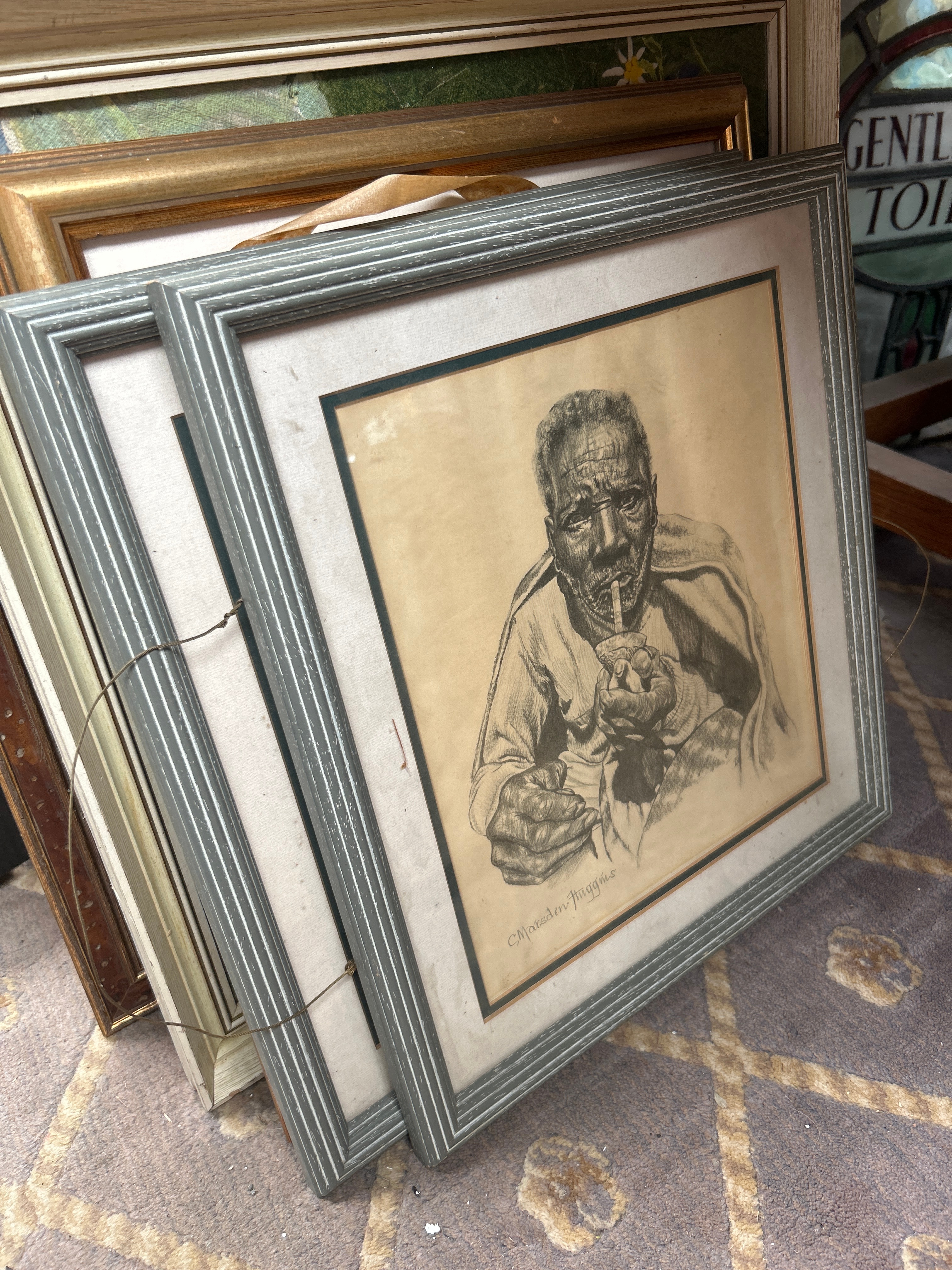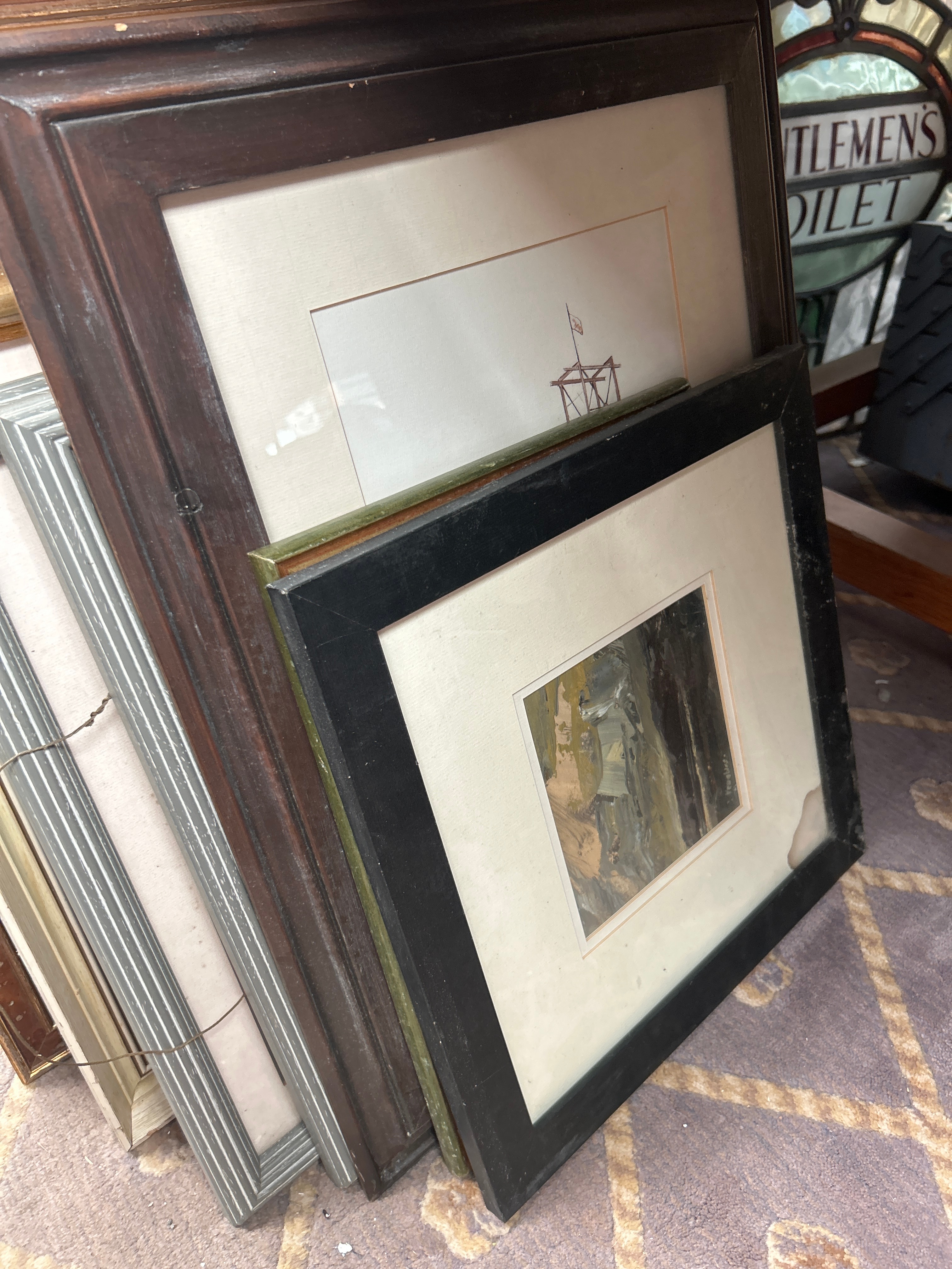 A collection of approximately twelve framed artworks and decorative items. The collection includes a watercolor depicting a mining structure, signed “Rosemarie Abrahams 1978”; an etching of Big Ben with a visible signature “Rechert”; a pair of charcoal or pencil portrait drawings of men, both signed “Charlesen Huggins”; a watercolor of sailboats; a textile collage with a landscape motif; and an embroidered piece titled “An English Village”. Also present is a watercolor bearing a label “A WHISTLE STOP” by W. Hildebrand, and an Indian miniature painting featuring untranslated script, accompanied by a label identifying it as “THE HUNT OF BILAUVERY’S AN INDIAN MINIATURE C. 1820”. Frames are predominantly wood, exhibiting a range from ornate gilt and dark stained traditional designs to simpler painted and contemporary profiles.
