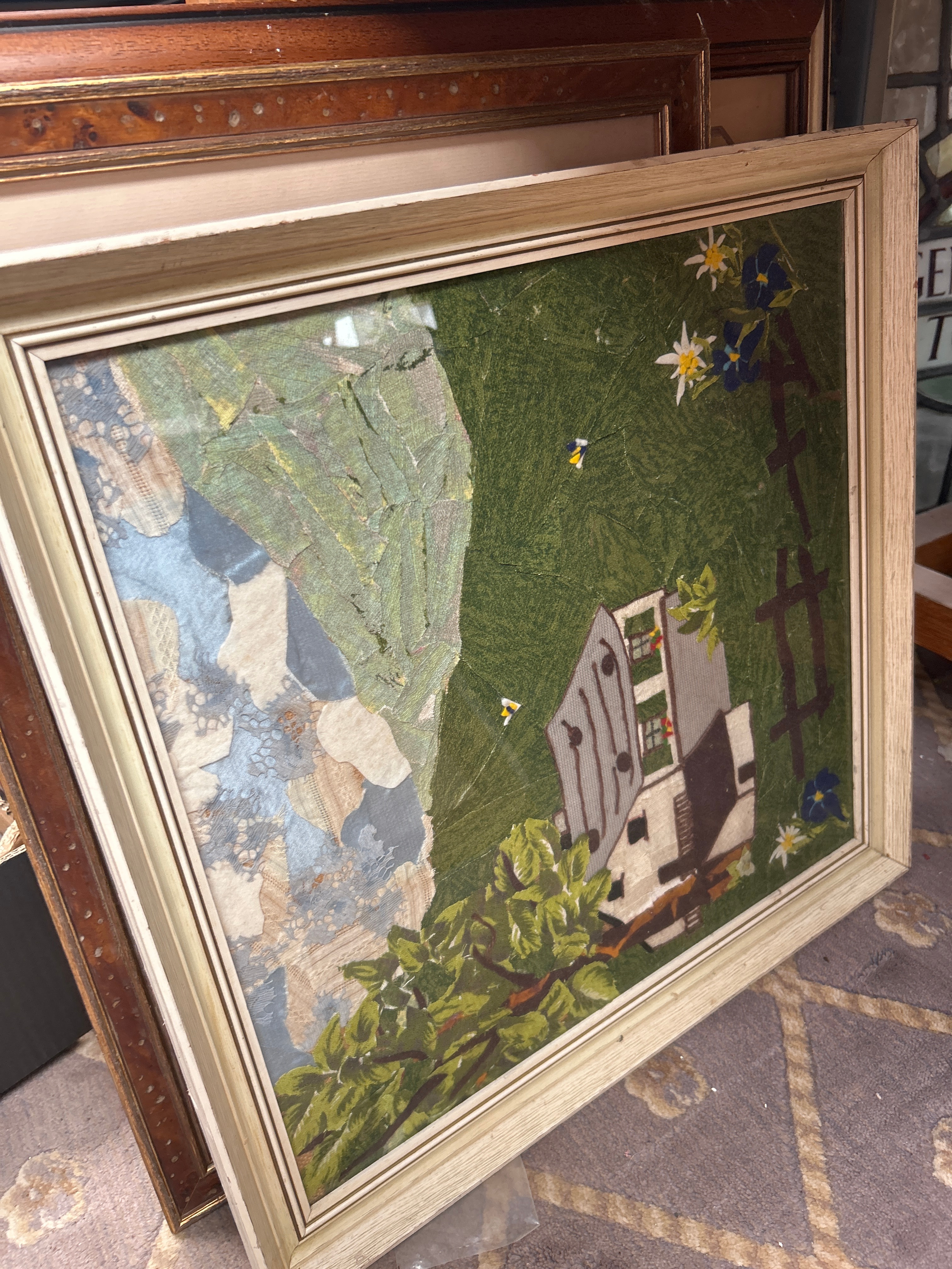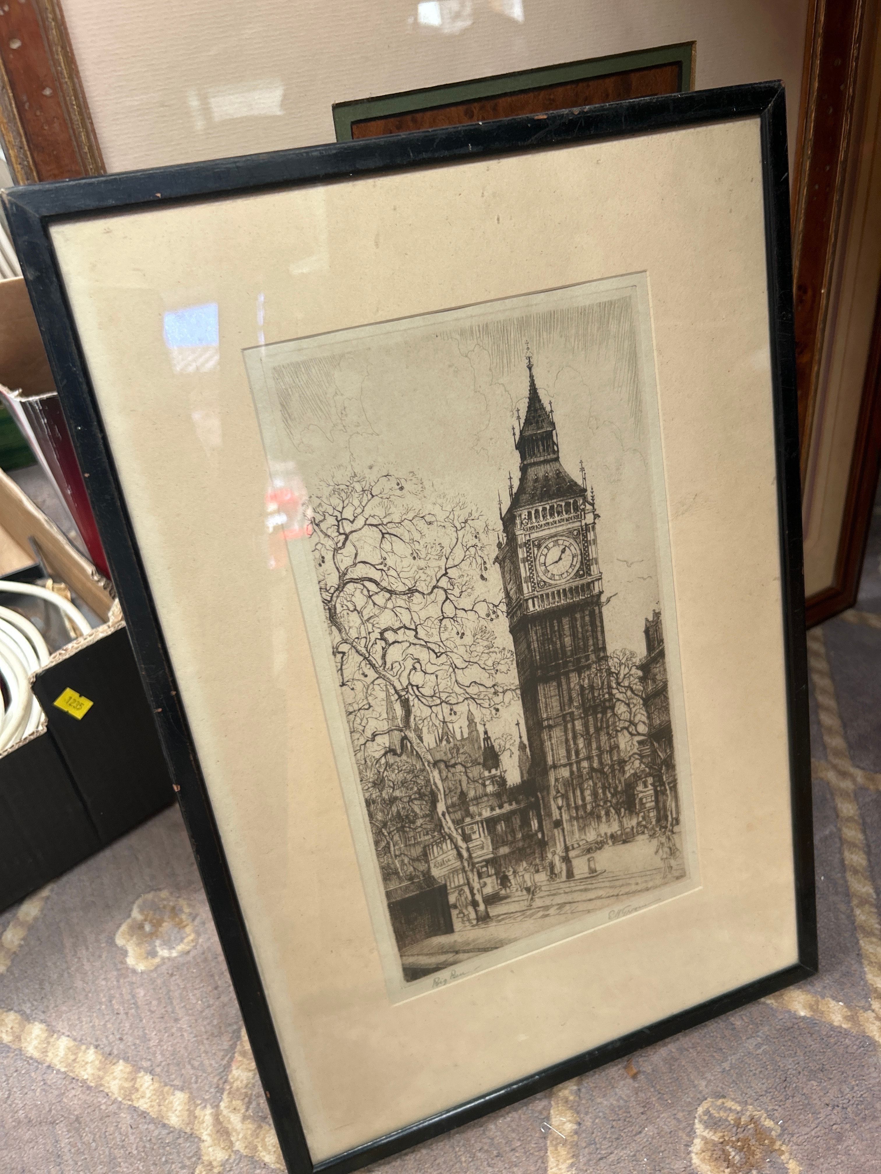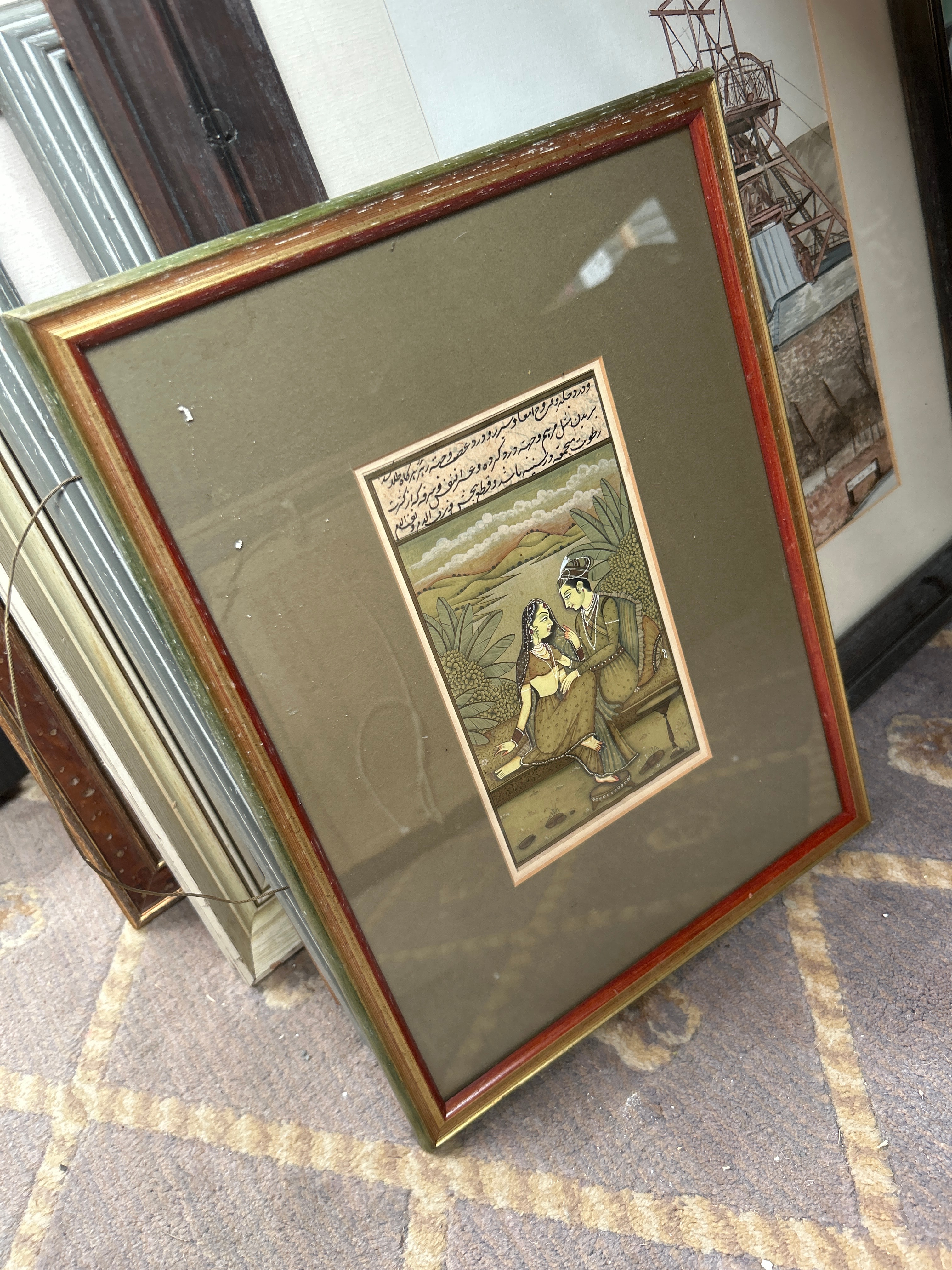 A collection of approximately twelve framed artworks and decorative items. The collection includes a watercolor depicting a mining structure, signed “Rosemarie Abrahams 1978”; an etching of Big Ben with a visible signature “Rechert”; a pair of charcoal or pencil portrait drawings of men, both signed “Charlesen Huggins”; a watercolor of sailboats; a textile collage with a landscape motif; and an embroidered piece titled “An English Village”. Also present is a watercolor bearing a label “A WHISTLE STOP” by W. Hildebrand, and an Indian miniature painting featuring untranslated script, accompanied by a label identifying it as “THE HUNT OF BILAUVERY’S AN INDIAN MINIATURE C. 1820”. Frames are predominantly wood, exhibiting a range from ornate gilt and dark stained traditional designs to simpler painted and contemporary profiles.