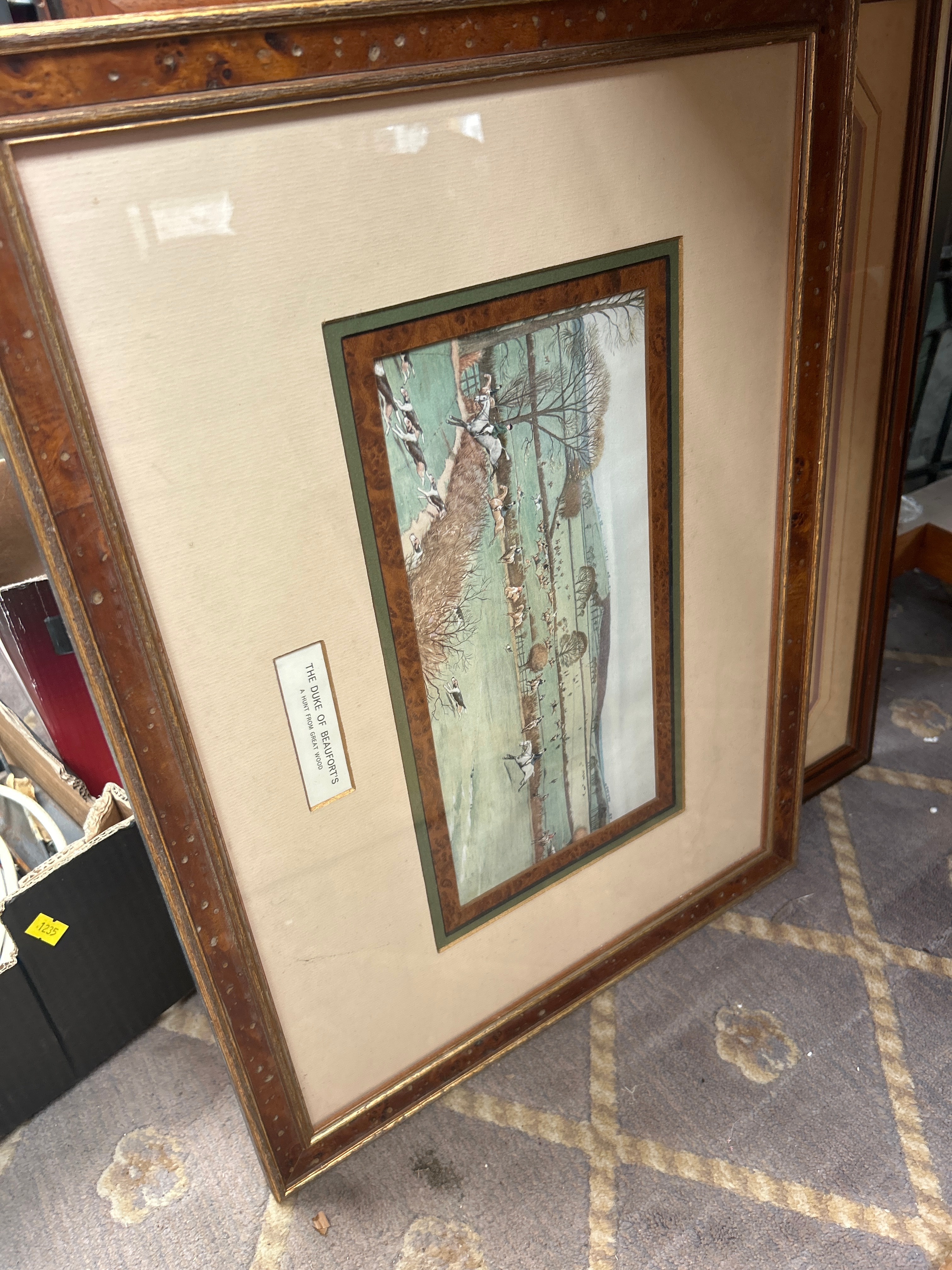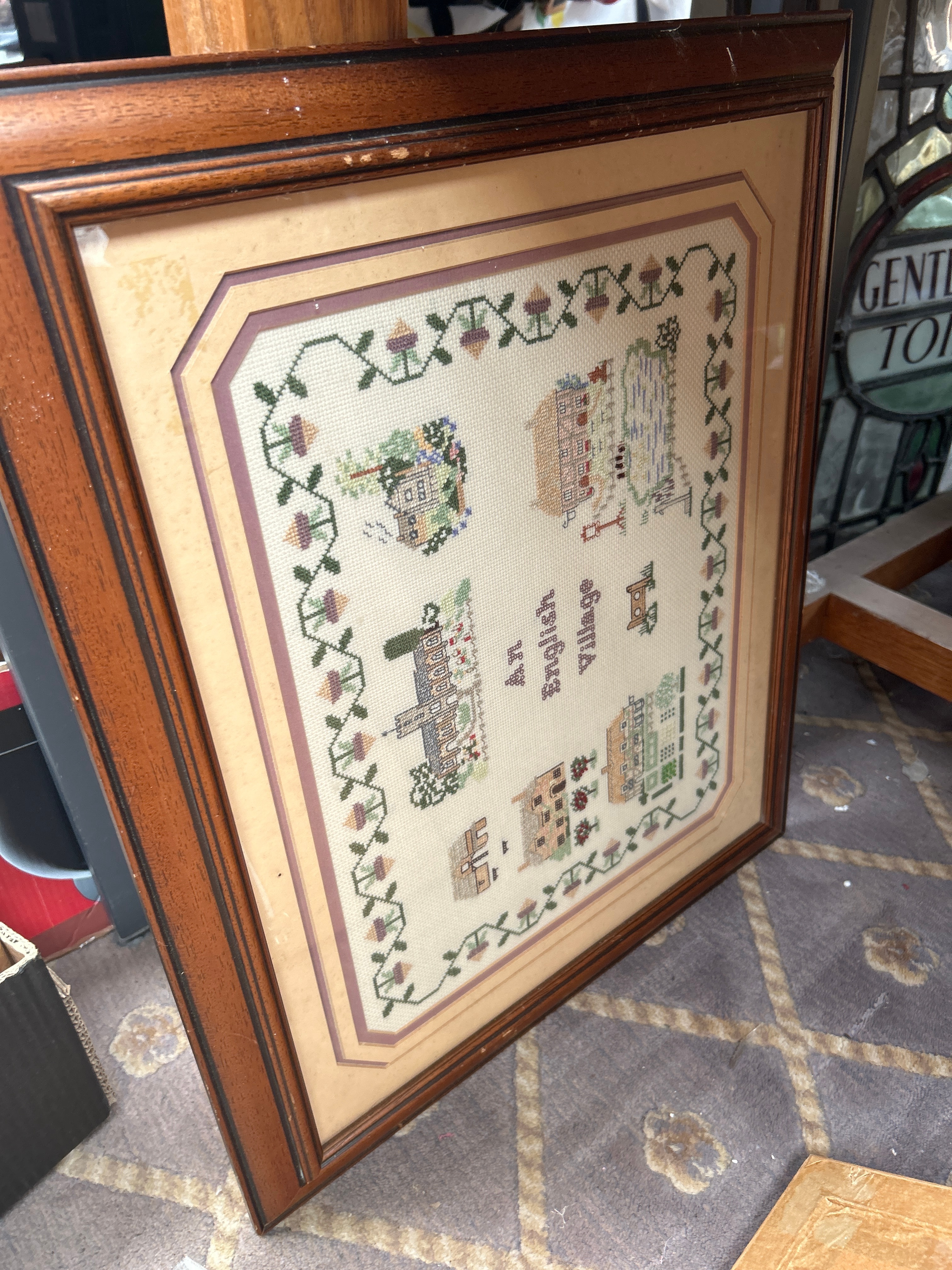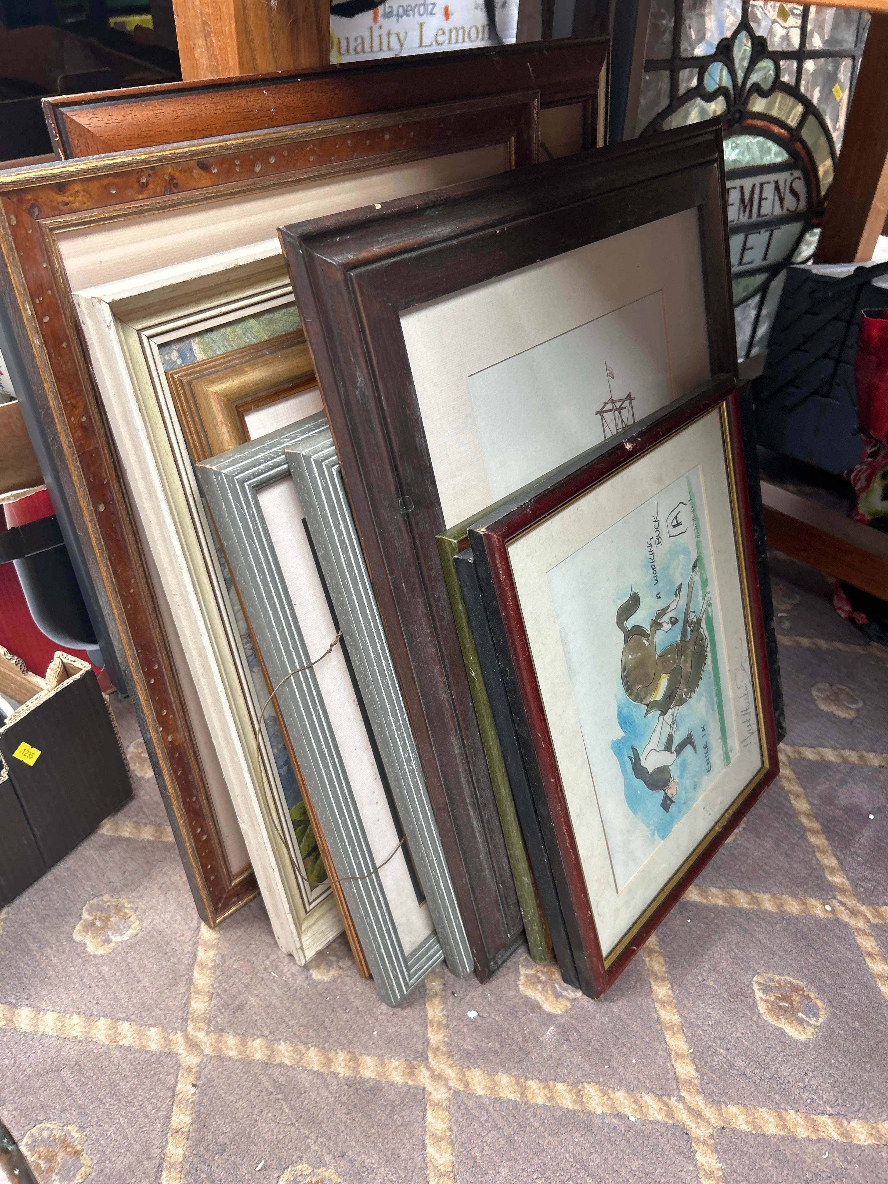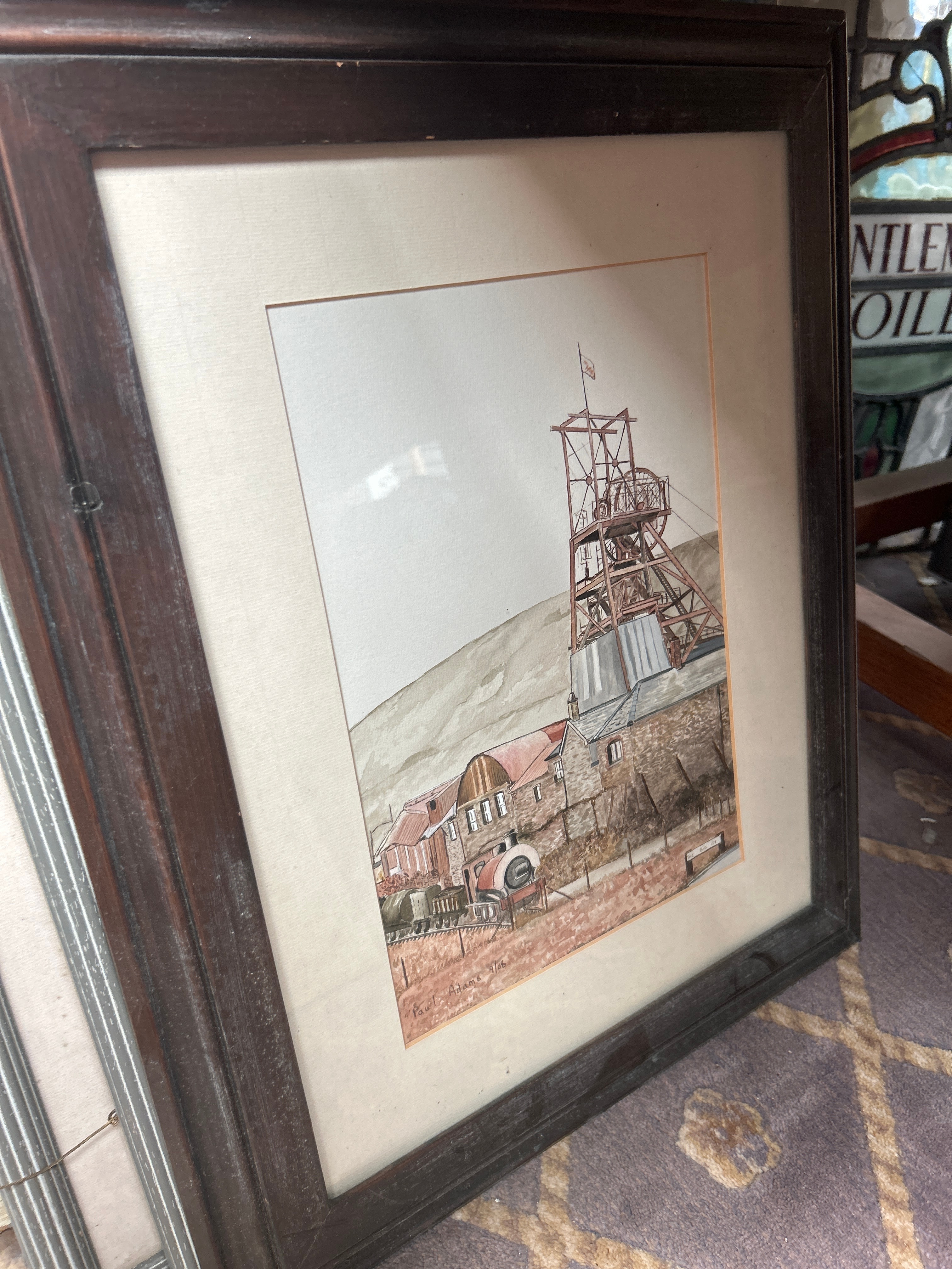 A collection of approximately twelve framed artworks and decorative items. The collection includes a watercolor depicting a mining structure, signed “Rosemarie Abrahams 1978”; an etching of Big Ben with a visible signature “Rechert”; a pair of charcoal or pencil portrait drawings of men, both signed “Charlesen Huggins”; a watercolor of sailboats; a textile collage with a landscape motif; and an embroidered piece titled “An English Village”. Also present is a watercolor bearing a label “A WHISTLE STOP” by W. Hildebrand, and an Indian miniature painting featuring untranslated script, accompanied by a label identifying it as “THE HUNT OF BILAUVERY’S AN INDIAN MINIATURE C. 1820”. Frames are predominantly wood, exhibiting a range from ornate gilt and dark stained traditional designs to simpler painted and contemporary profiles.