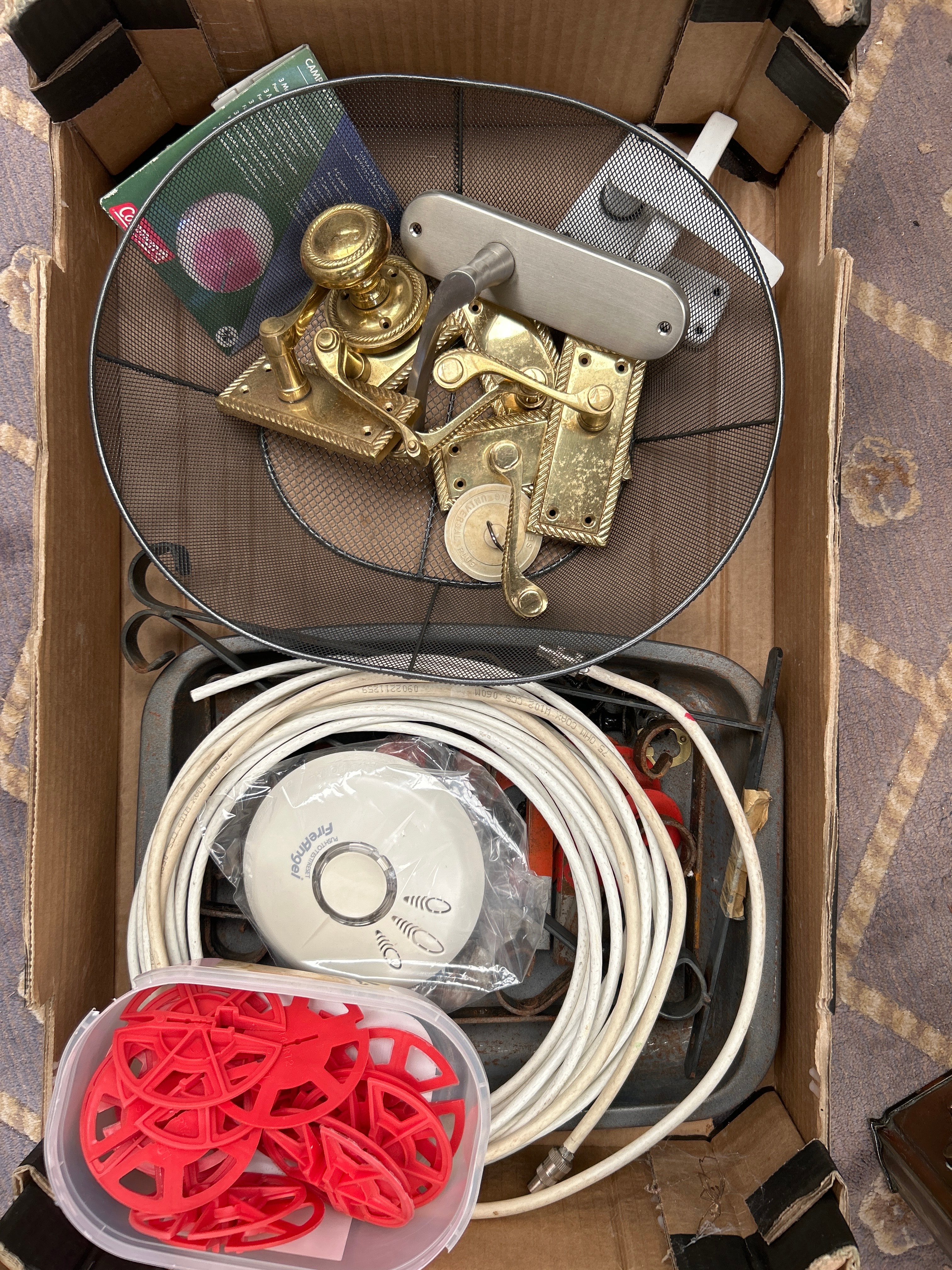 This lot comprises an assortment of domestic hardware and electronic components. The collection includes numerous brass door hardware pieces, primarily in an ornate, traditional style featuring rope-twist borders, encompassing various knobs, levers, and backplates. A small circular brass element marked “UNIVERSAL PLUG SE” is present among the brass hardware. Additionally, one contemporary brushed metal door lever set is included. Electronic components consist of a coiled bundle of white coaxial cable, marked “75 OHM COAX RG6 CCS 060M,” and a white FireAngel brand smoke alarm, labeled “PUSH TO TEST/RESET” and “SMOKE ALARM,” sealed in its original clear plastic packaging. The lot is completed by a clear plastic container holding a quantity of red, geometrically-shaped plastic pieces.