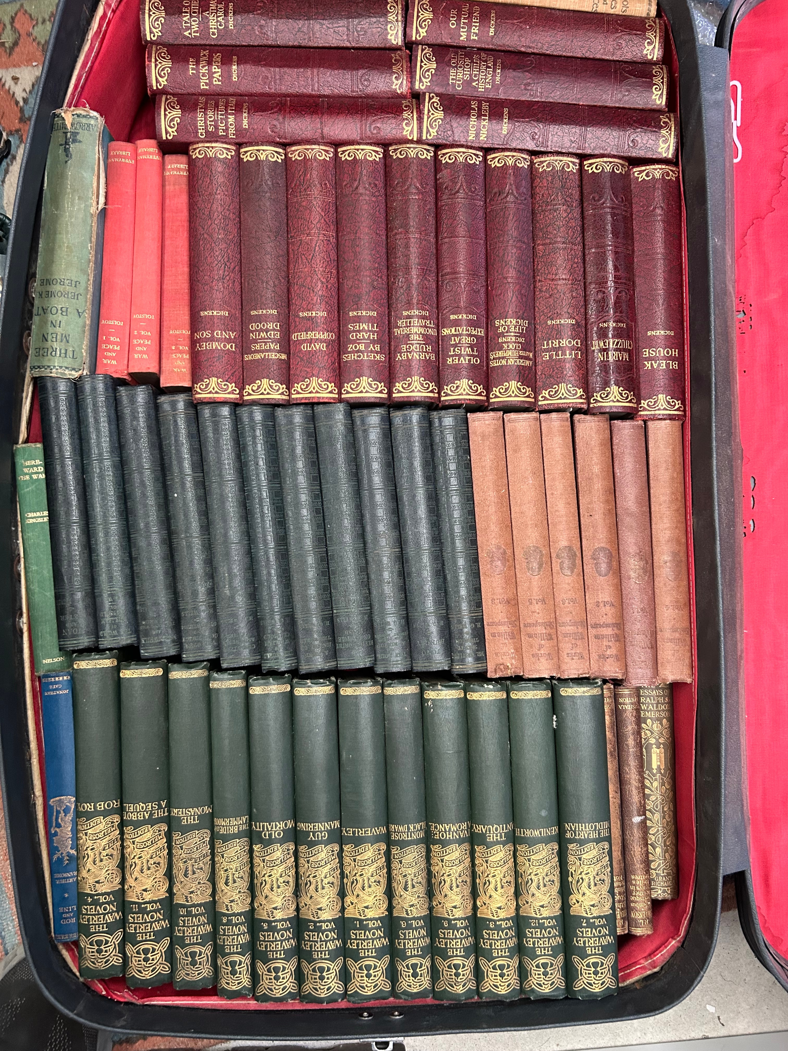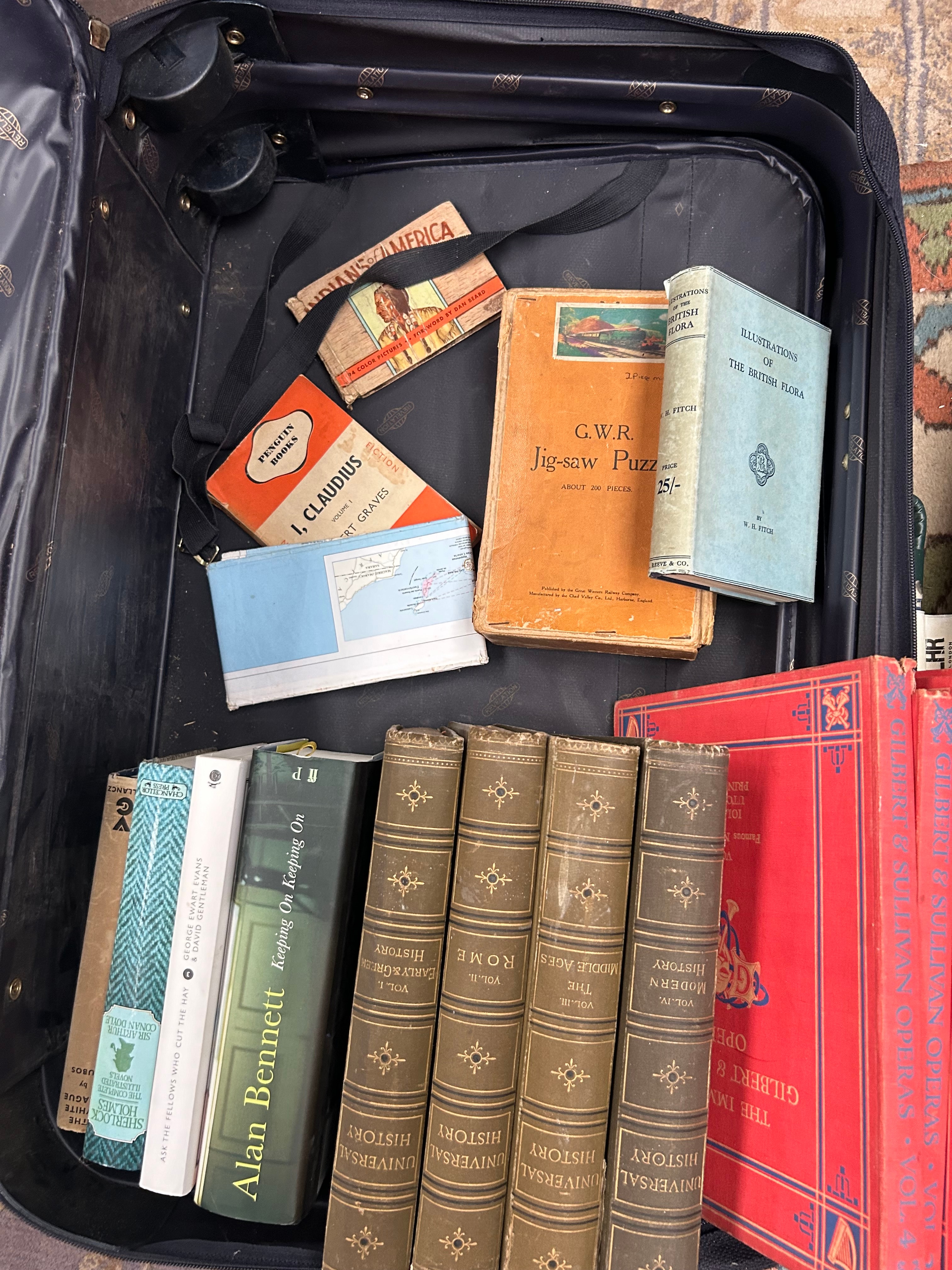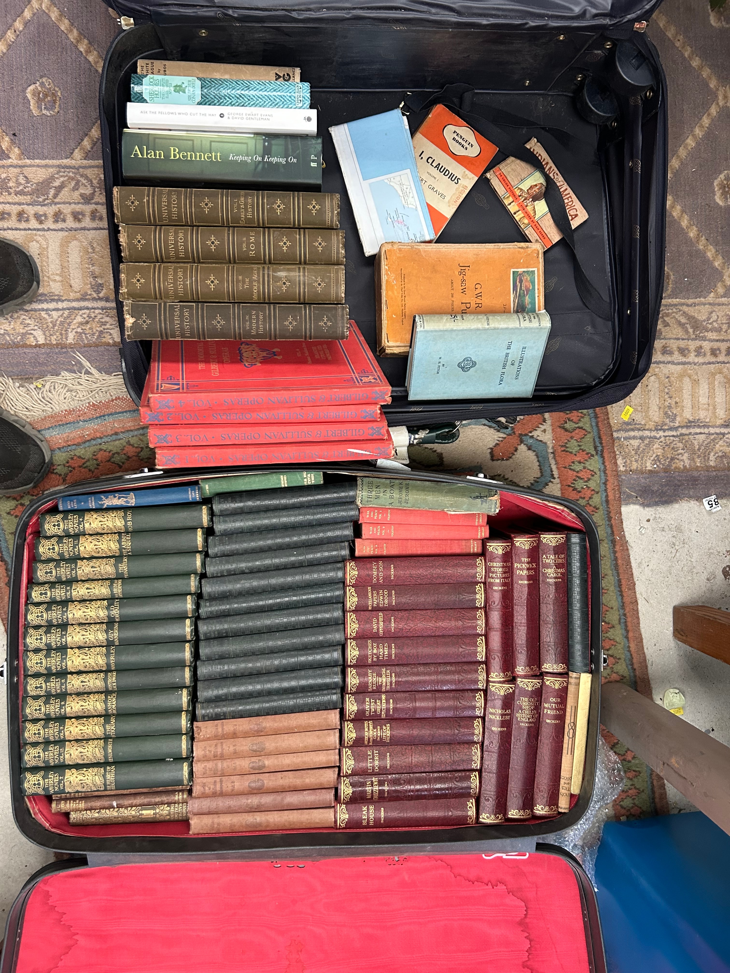 A large collection of predominantly English language hardcover books, neatly arranged within two open suitcases. The collection features a mix of uniform multi-volume sets, including “UNIVERSAL HISTORY” and various author series such as “THE NOVELS” by Charles Dickens, George Eliot, W.M. Thackeray, and Sir Walter Scott. These sets are often bound in dark green, black, light brown, and deep red with gold-tooled spines. Individual titles present include “I, CLAUDIUS” by Robert Graves, “Alan Bennett Keeping On Keeping On,” “ILLUSTRATIONS OF THE BRITISH FLORA,” “GILBERT & SULLIVAN OPERAS,” and “SHERLOCK HOLMES” editions. Also included are several red paperback Penguin books and a “G.W.R. Jig-saw Puzzle” box. The bindings exhibit a mix of cloth, paper, and possibly some leather or faux-leather, suggesting a range of periods.