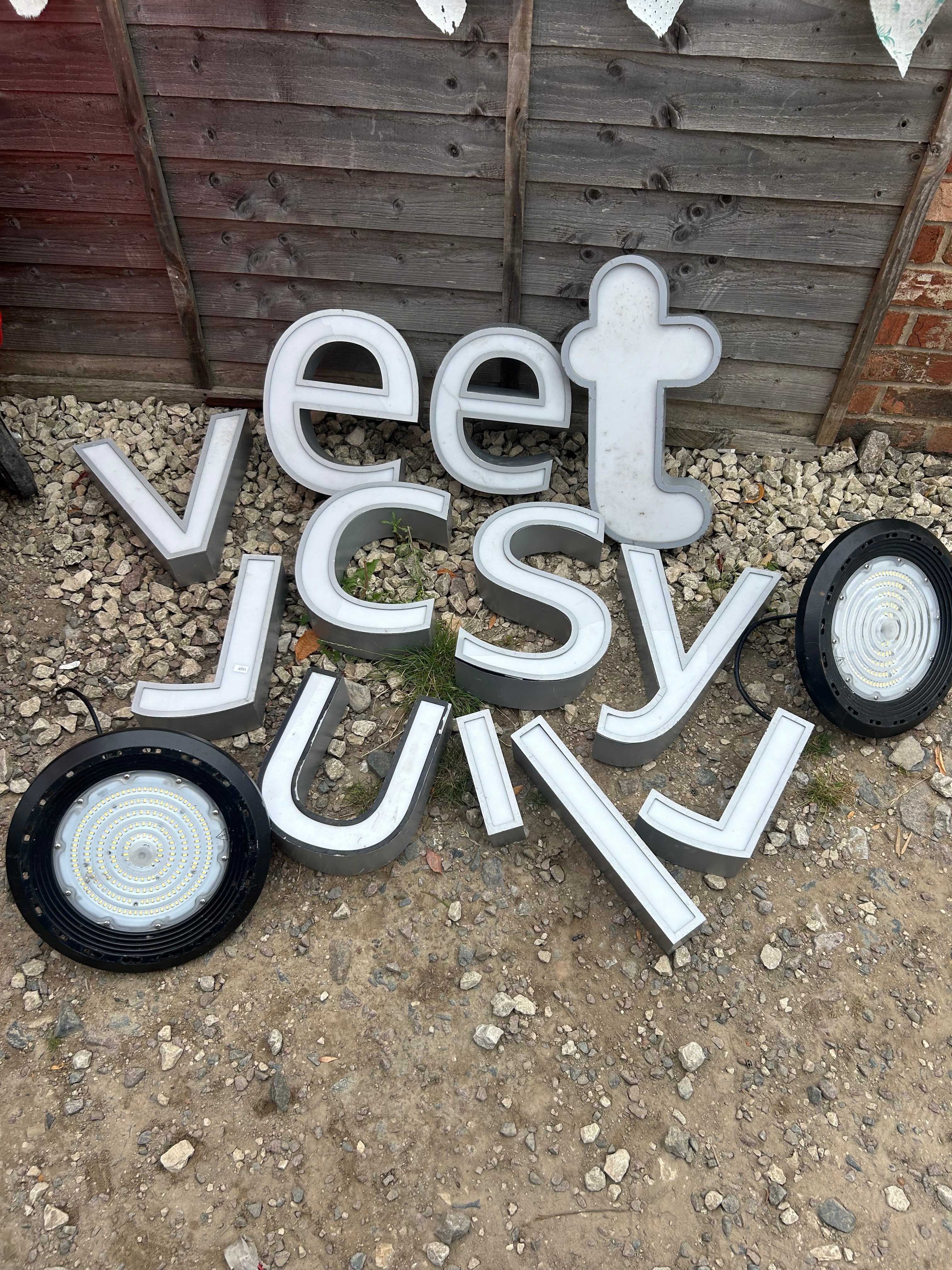 A collection of contemporary commercial signage components, comprising ten individual illuminated letters and two circular LED floodlights. The letters, which include ‘V’, two ‘E’s, ‘J’, ‘C’, ‘S’, ‘Y’, ‘U’, ‘N’, and an ‘L’, are constructed with metallic grey side returns and translucent white acrylic faces, designed for internal illumination. A black printed label with ‘100L’ is visible on the side of the ‘L’ component. The two circular floodlights feature black metal housings, clear diffusers, and an array of numerous small LED chips arranged in concentric spirals, with faint warning symbols visible on one diffuser.