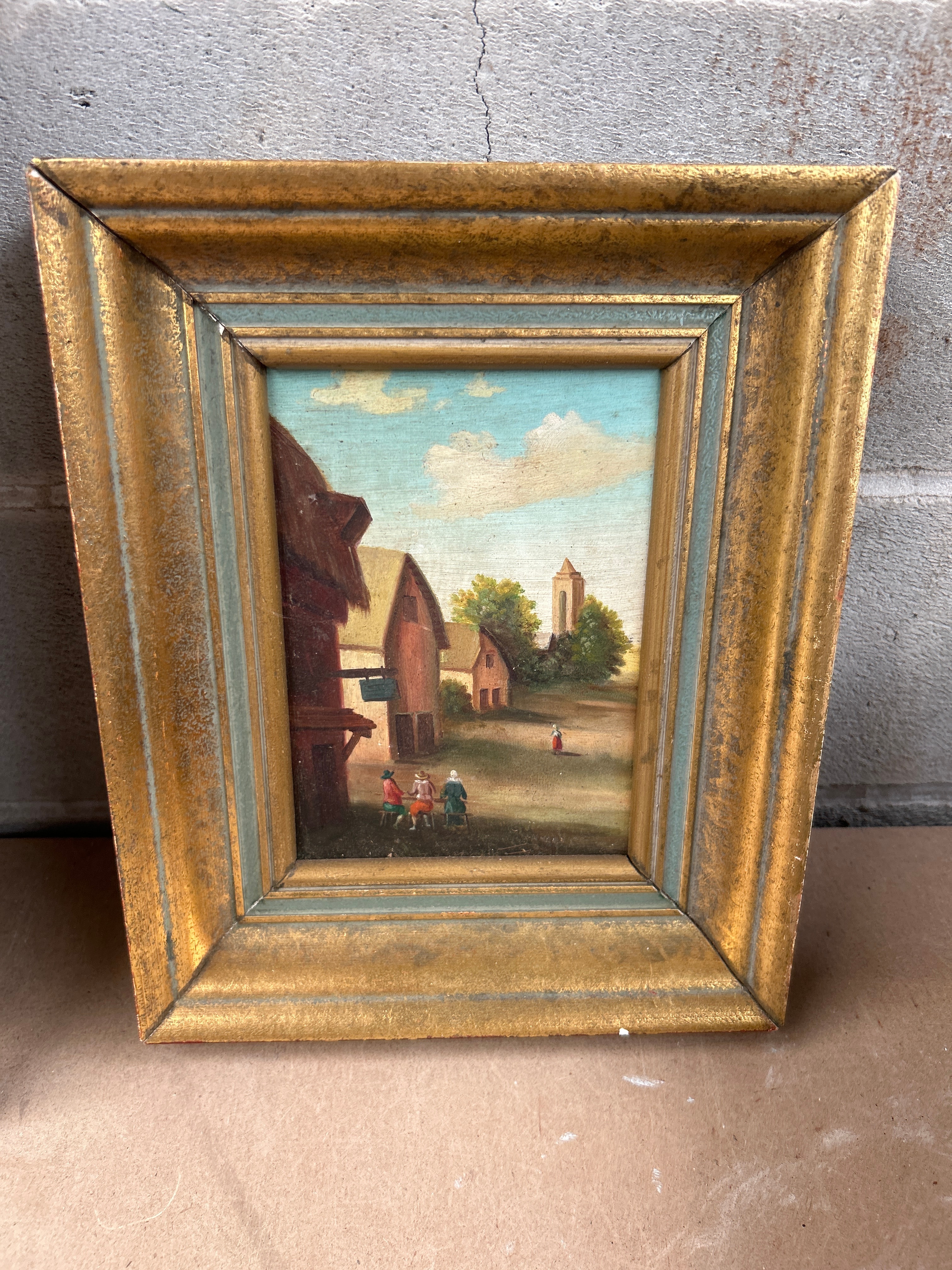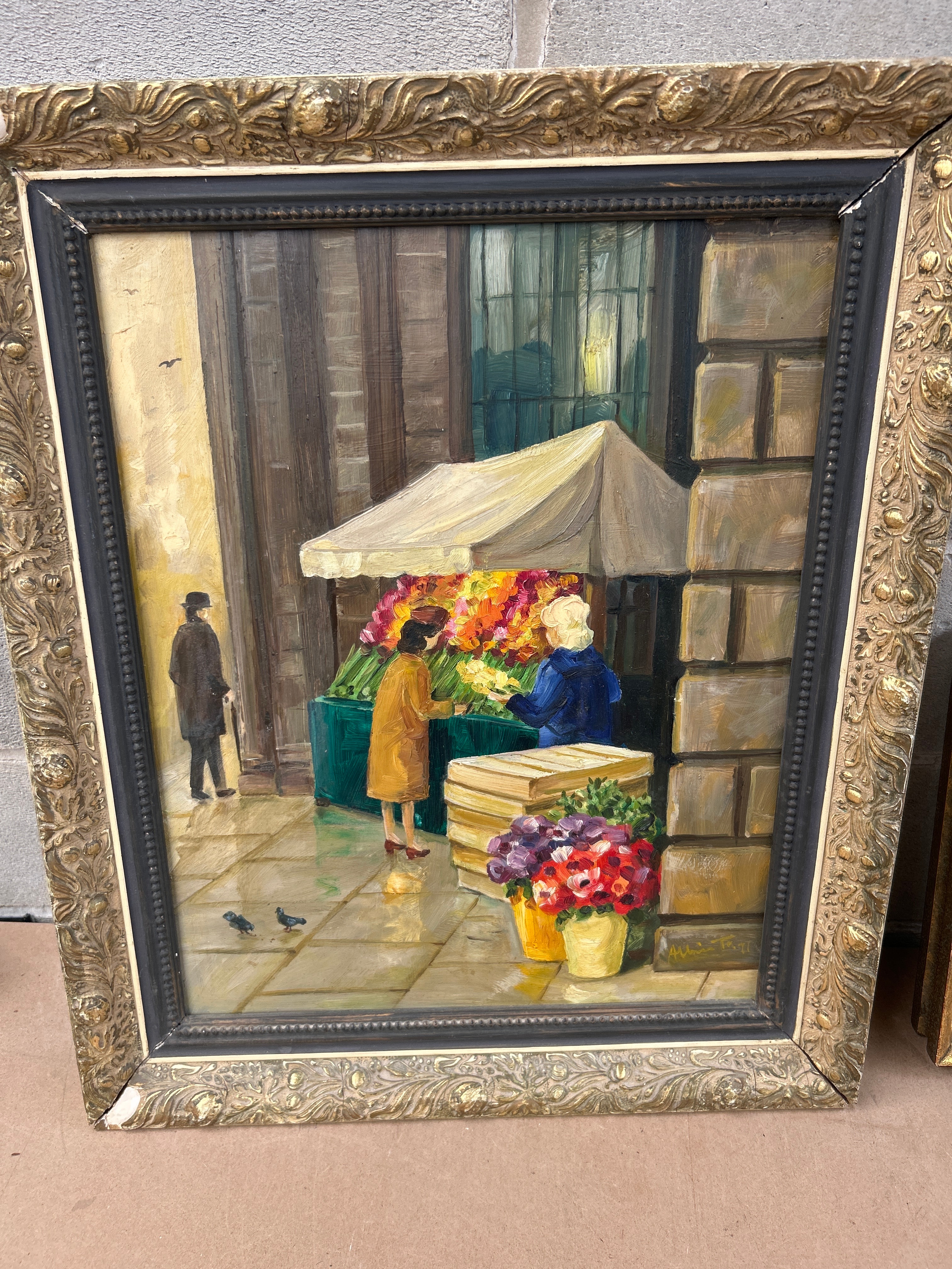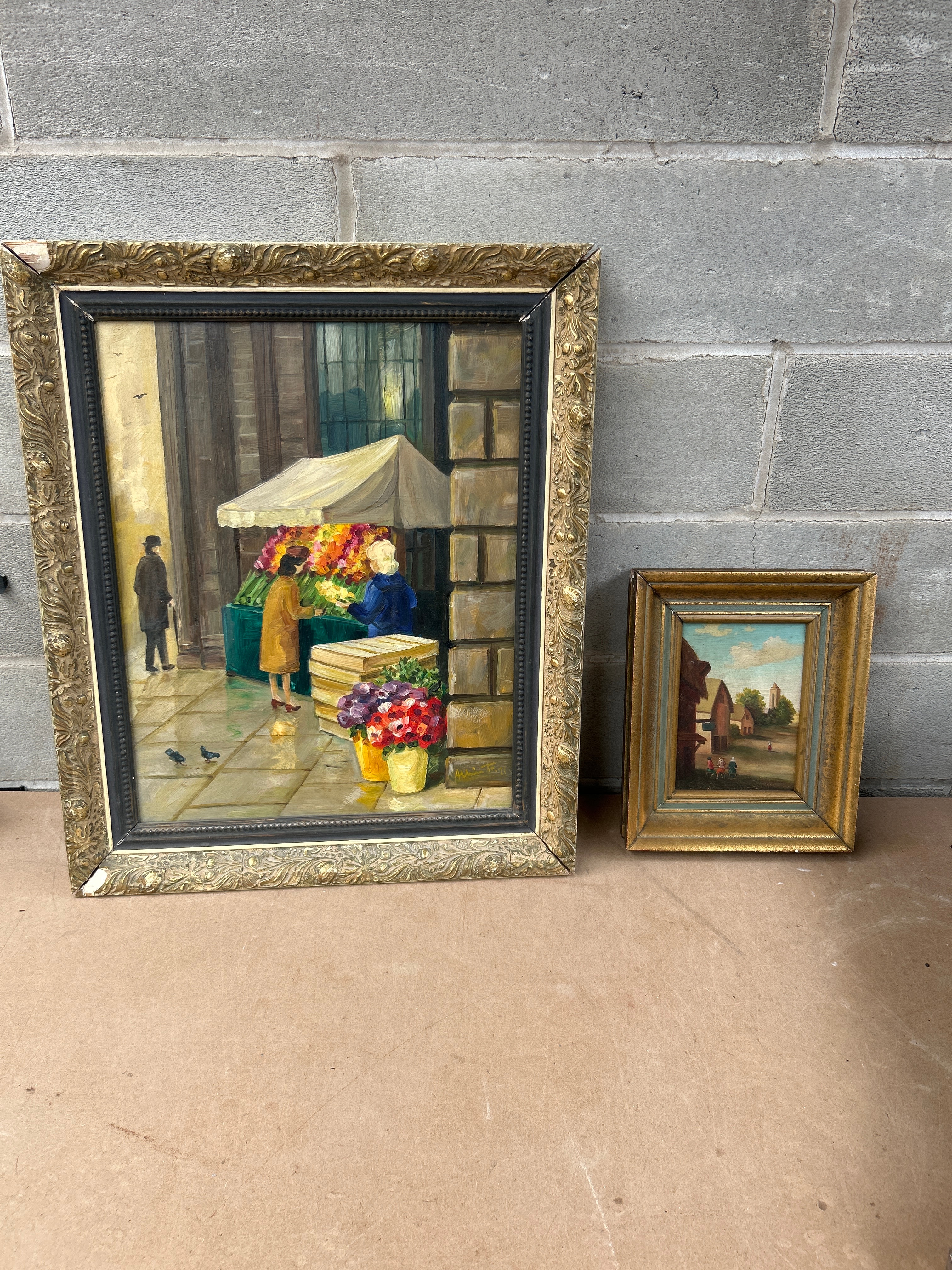 This lot comprises two framed oil paintings. The larger painting is attributed to Søren Christian Bjulf (Danish, 1890-1958), depicting The Flower Market at Højbro Plads in Copenhagen. Rendered in an Impressionistic style, it shows a vibrant street-side flower market scene with figures. It is presented in a substantial ornate gilt and black-painted frame. The smaller painting features a traditional, possibly naïve, rural landscape with distant buildings and figures, set within a simpler gilt and painted wood frame. Both paintings appear to be oil on canvas or board.