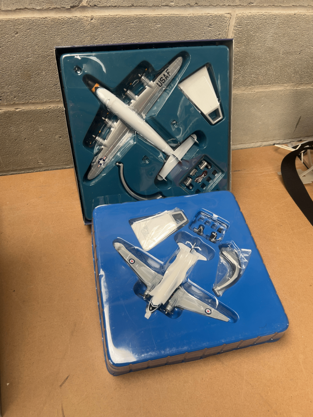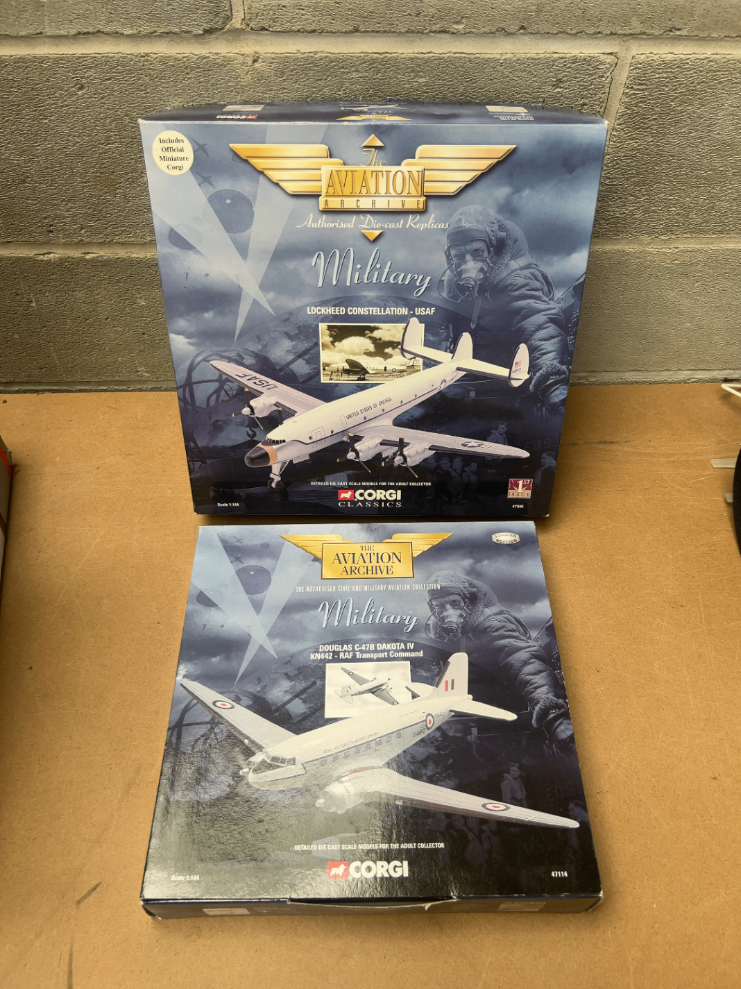This lot comprises two boxed die-cast military aircraft models from Corgi’s Aviation Archive series, both presented at 1:144 scale. The first model is a Lockheed Constellation – US Air Force, identified by web intelligence as Corgi model 47506. The second model is a Douglas C-47 Dakota IV – RAF Transport Command, featuring the distinctive RAF roundel insignia. Each model, constructed from die-cast metal with plastic components, remains securely held within its original internal plastic tray packaging, complete with associated display stands and accessories.