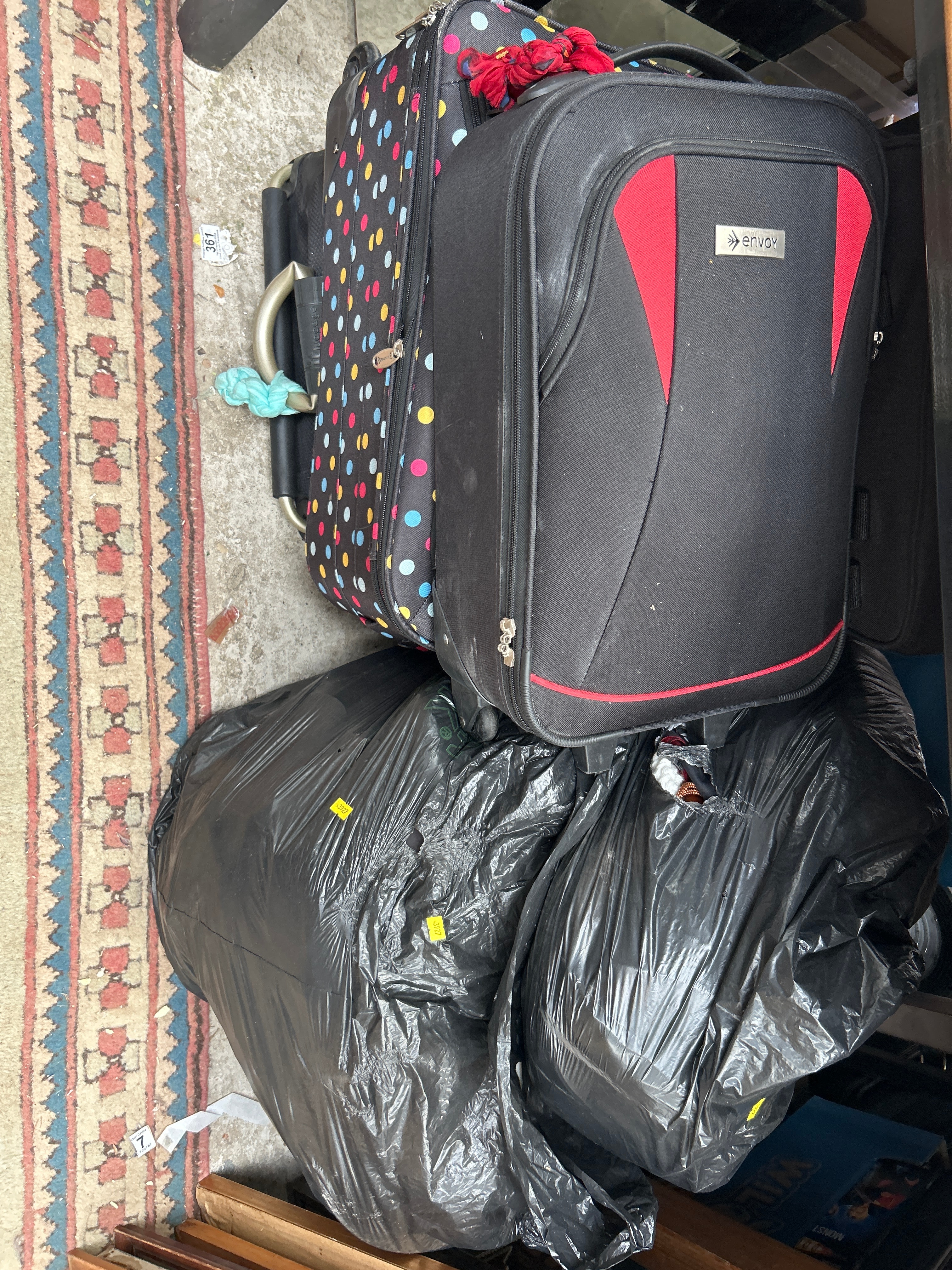 This lot comprises two contemporary wheeled travel suitcases constructed from synthetic textile. One suitcase is black with a multi-colored polka dot pattern and is accessorized with red and light blue fabric items. The second suitcase is black with red accent panels and features a metallic plaque marked “envoy.” Accompanying the suitcases are several crumpled black plastic bags, some displaying yellow stickers with the number “3927.” One of these bags is torn, revealing obscured contents. A partial view of a traditional textile rug with geometric patterns in muted red, blue, and cream is visible on the floor. Scattered paper labels marked “361” and “7 / 72767” are present on the concrete. A blue item beneath the bags shows partially reversed text, likely “MONSTER” and “WII.”