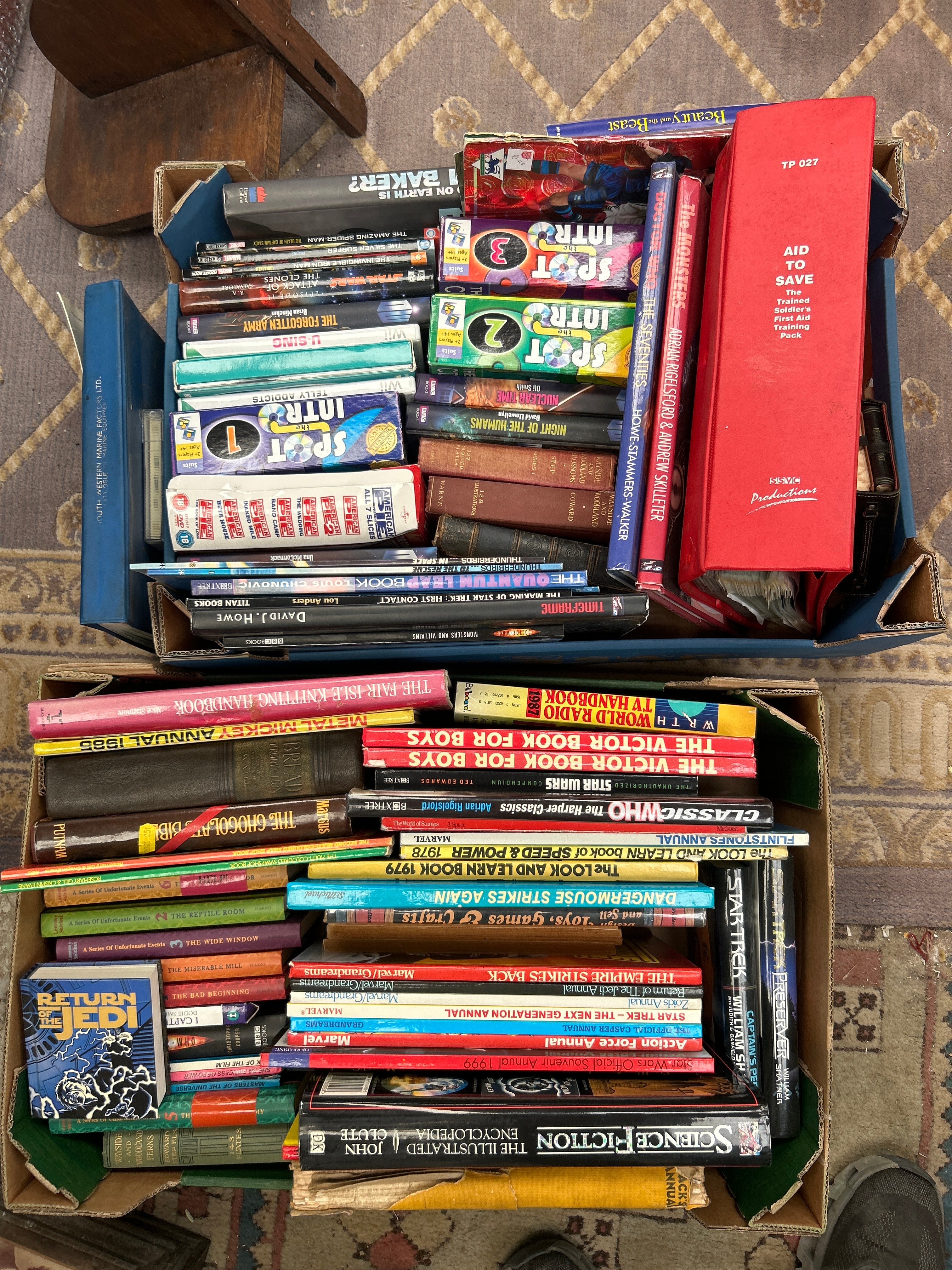 This lot comprises two cardboard boxes filled with a diverse collection of books, annuals, comics, graphic novels, and a few board game or media cases, primarily featuring popular culture, science fiction, and children’s literature from the late 20th and early 21st centuries. Notable titles include “Star Wars,” “Marvel” comics and annuals, “Doctor Who,” “A Series of Unfortunate Events,” “Thunderbirds,” and various annuals such as “Mickey Annual 1985” and “Flintstones Annual.” Also present are older reference works like “The World Radio Handbook 1987,” “The Illustrated John Clute Science Fiction Encyclopedia,” and several “Wayside and Woodland” natural history volumes. The collection also includes a red “AID TO SAVE The Trained Soldier’s First Aid Training Pack” case marked “TP 027” and “SSMC Productions.” Materials consist mainly of paper, cardboard, and various binding types (hardcover, softcover), with some plastic cases for games or media. All visible text is in English.