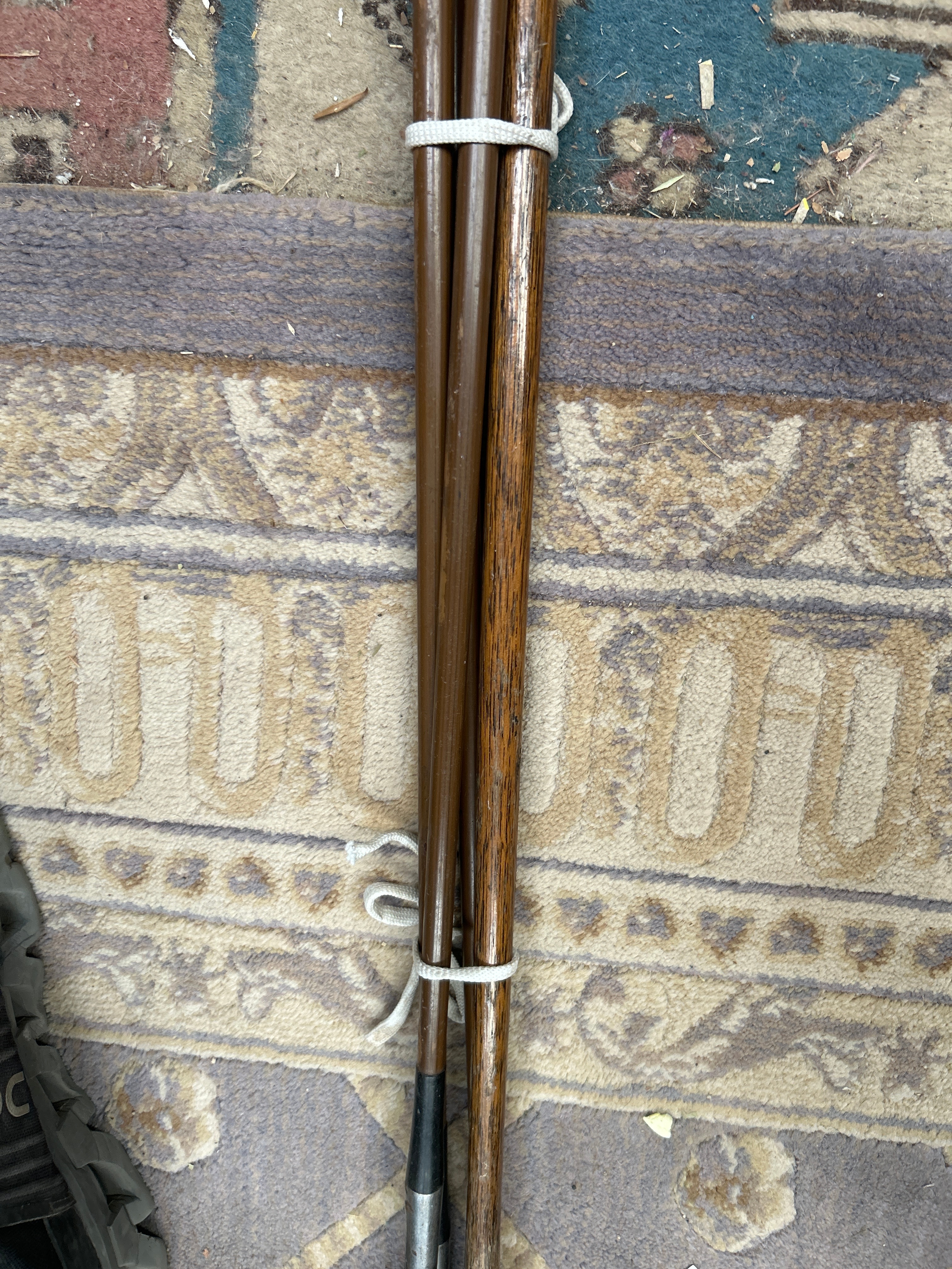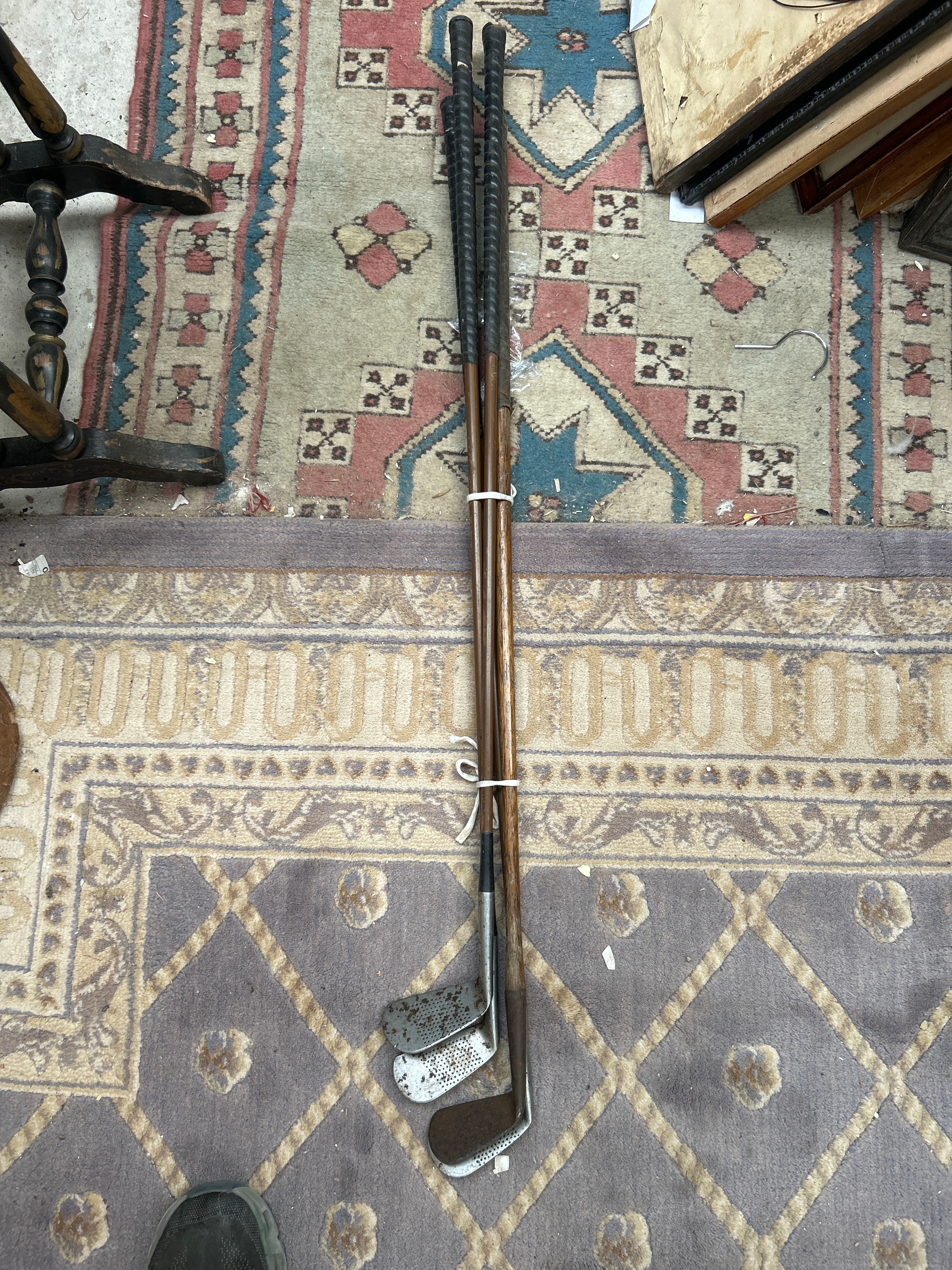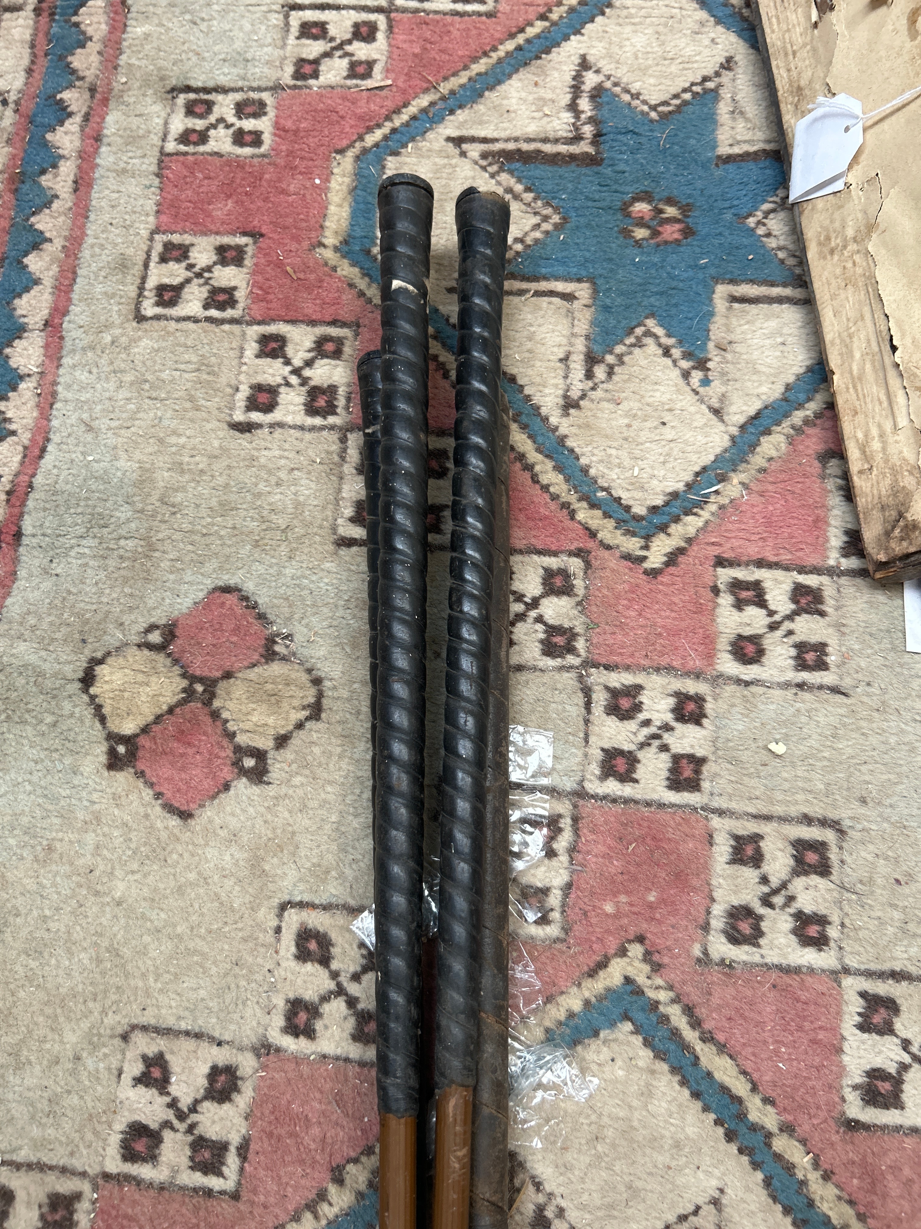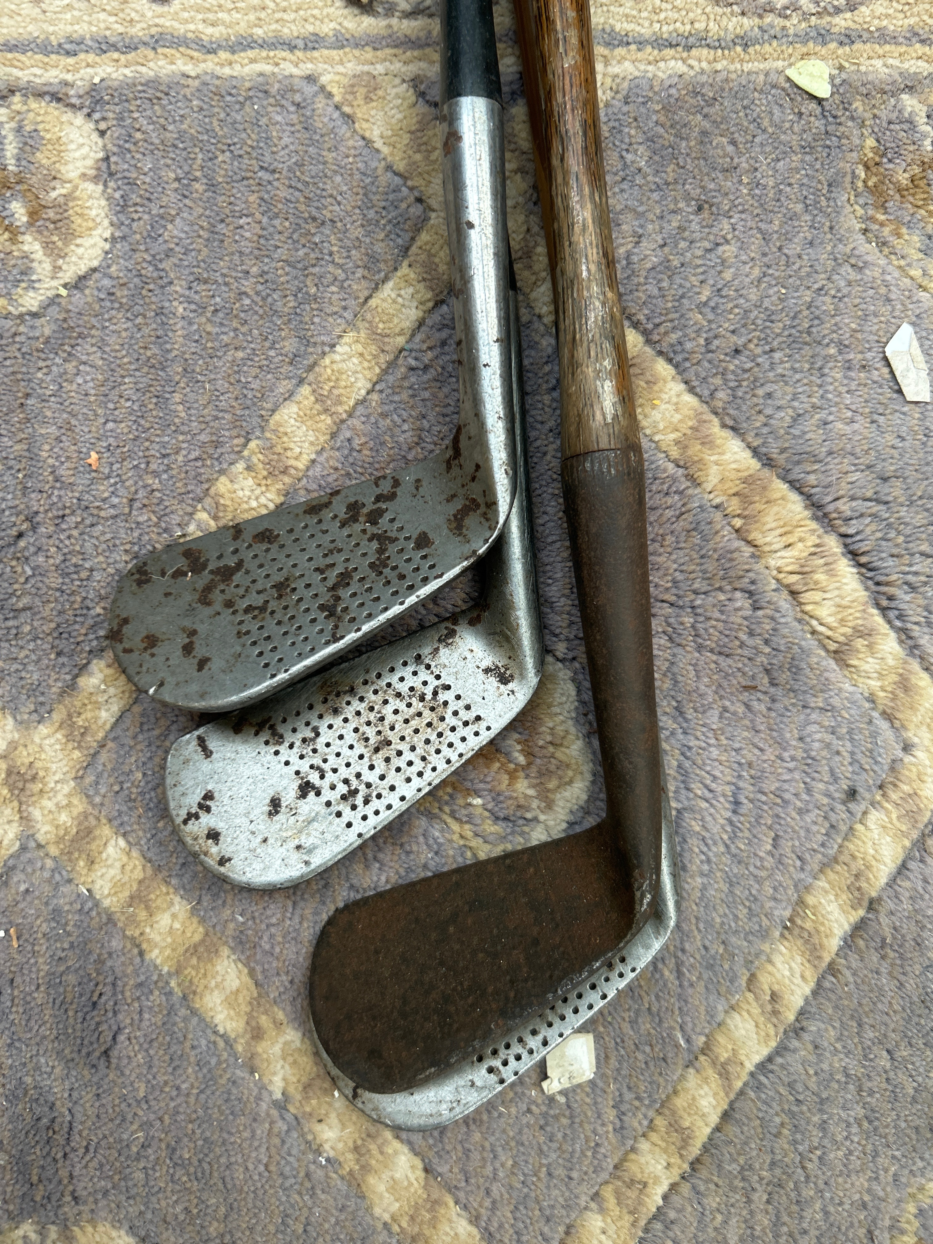 A set of three antique Spalding hickory shaft golf clubs, each featuring a darkened wooden shaft and a wrapped, textured grip, likely leather. The metal club heads are consistent with irons or wedges.