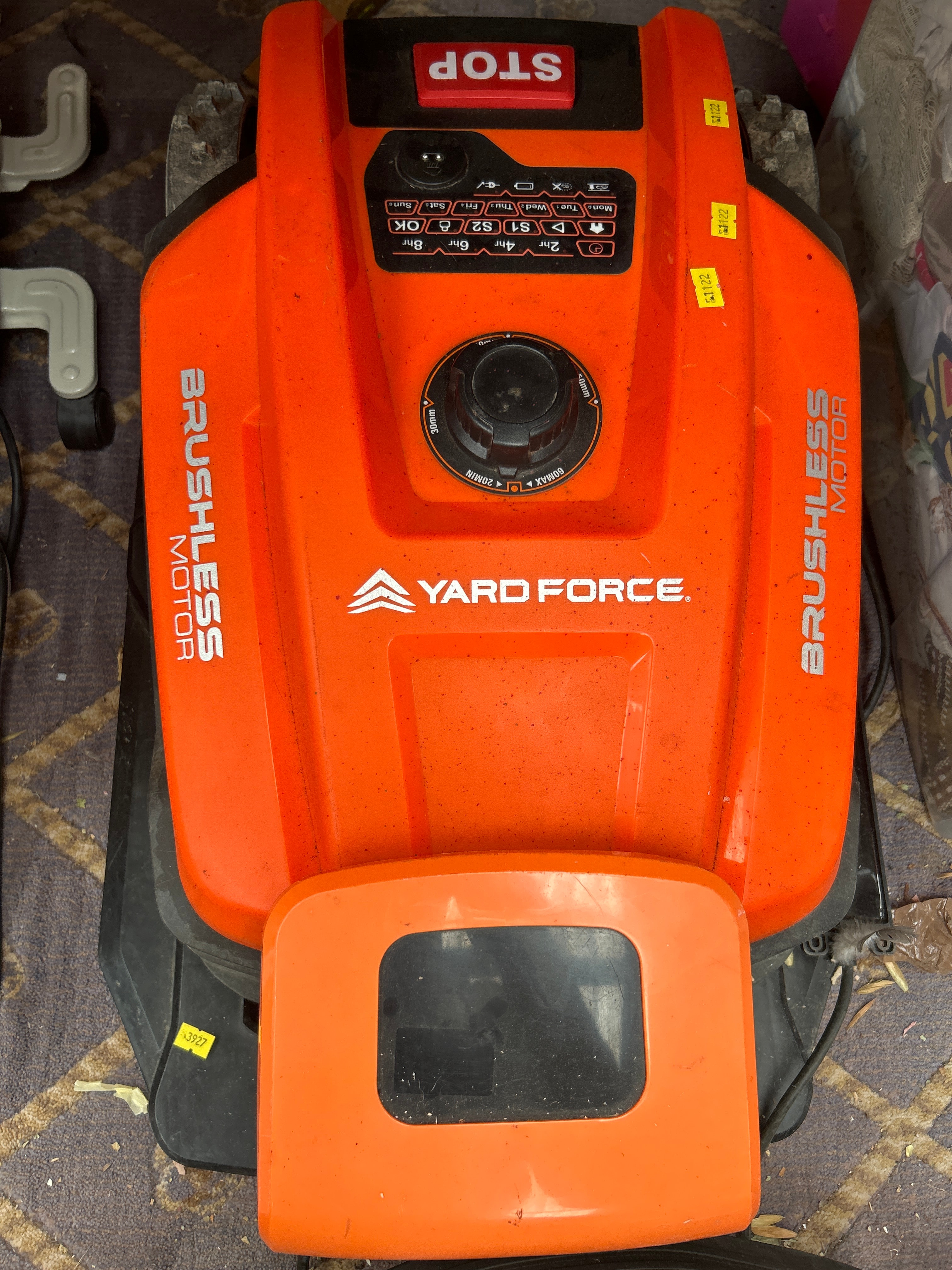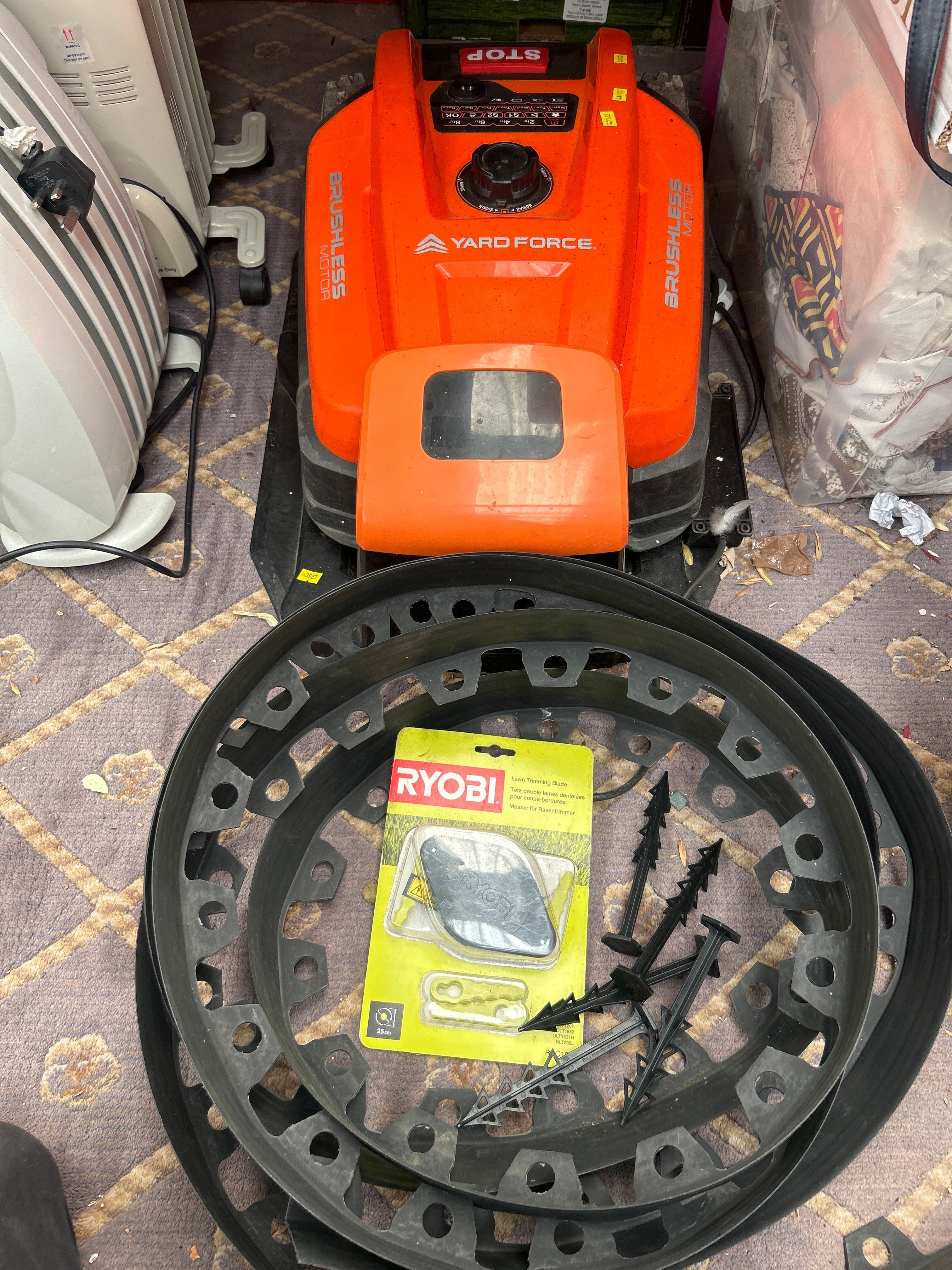 A contemporary Yard Force robotic lawnmower, predominantly bright orange with black accents, featuring “BRUSHLESS MOTOR” text on its sides. The top panel includes a rotary cutting height adjustment, control buttons for scheduling (e.g., 2hr, 4hr, 6hr, 8hr, 60MAX, 20MIN), and a prominent red “STOP” button. Accompanied by a quantity of flexible black plastic boundary wire and a group of black plastic ground stakes. Also included is a new, unopened Ryobi-branded blister pack containing a metal “Robot Mower Trimming Blade” with associated fixings.