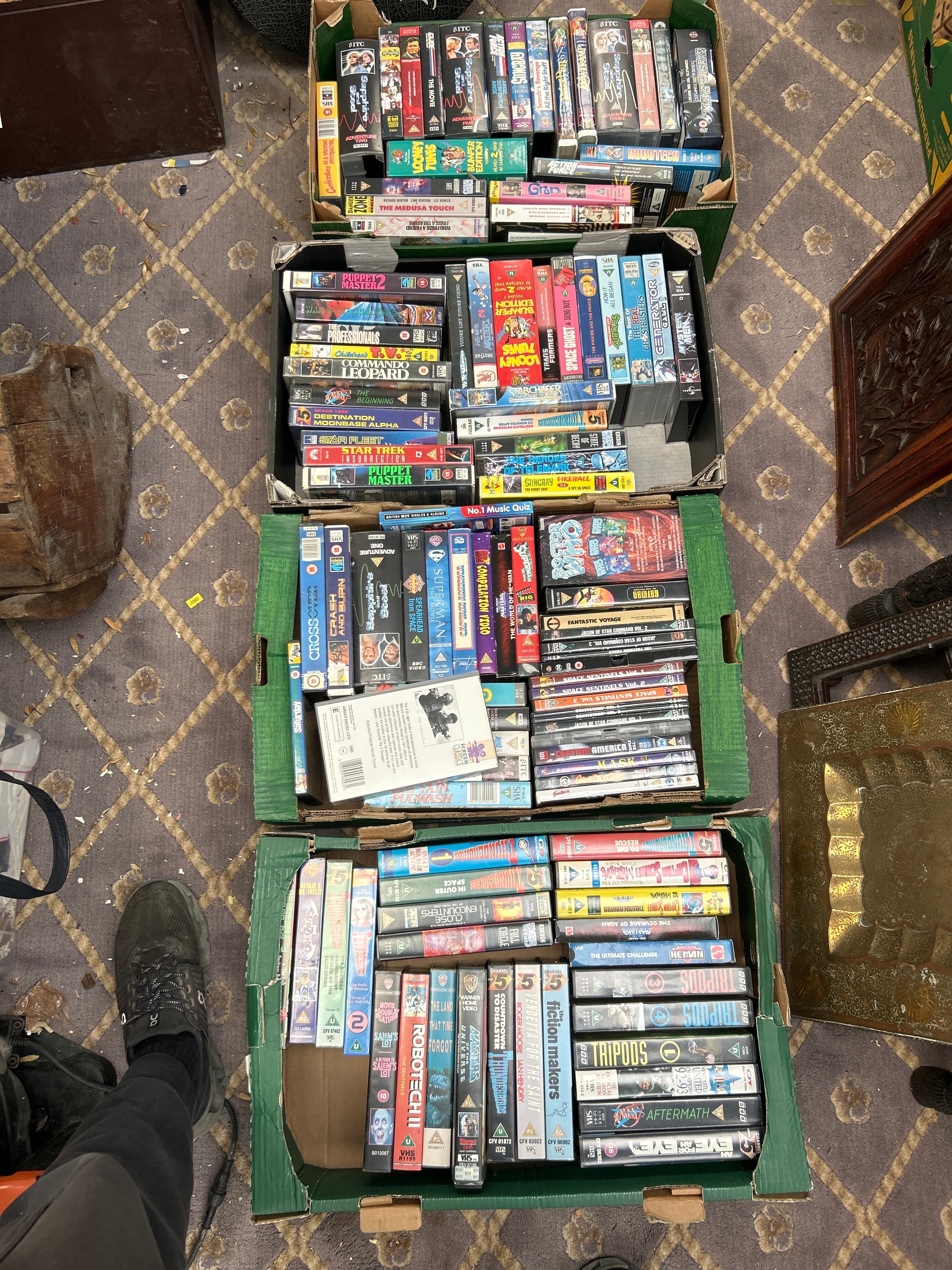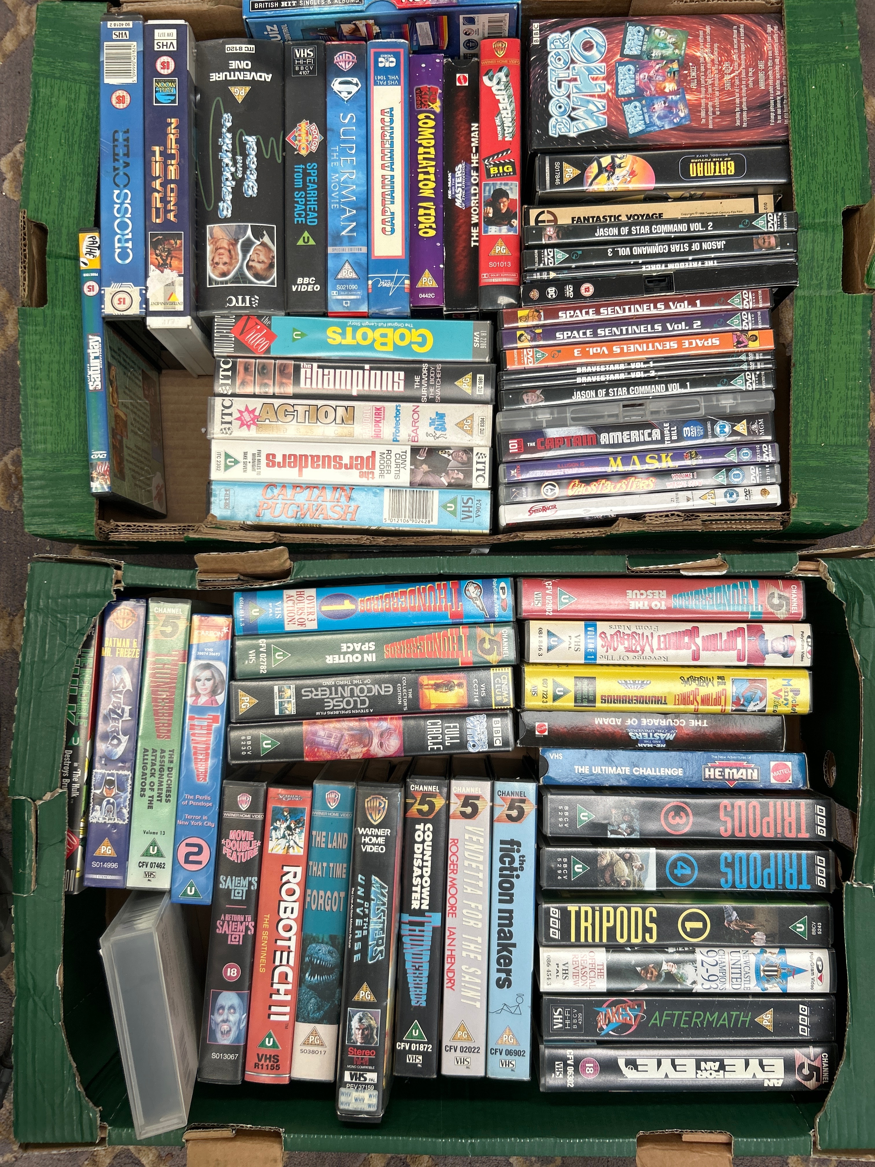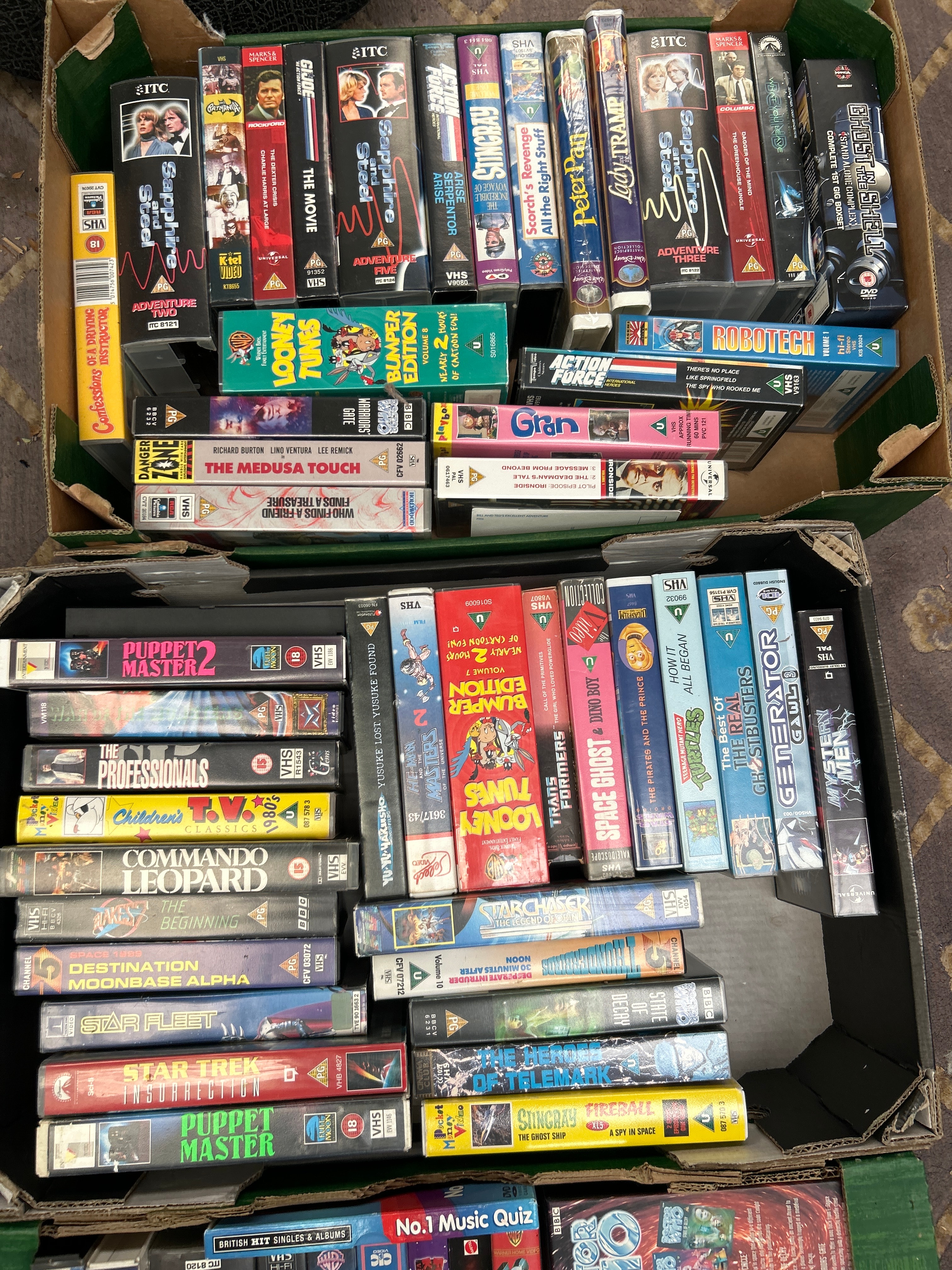 A substantial collection of entertainment media, primarily VHS tapes with a lesser quantity of DVDs, presented in four large cardboard boxes. The collection spans diverse genres including science fiction, action, animation, children’s programming, and drama. Identifiable titles include *Indiana Jones*, *Star Trek*, *Robotech*, *Thunderbirds*, *Looney Tunes*, *He-Man*, *Tripods*, *The Professionals*, *Sapphire & Steel*, and *Puppet Master*. The media formats, comprising plastic cassettes and discs within cardboard and paper sleeves, suggest a date range from the 1980s through the early 2000s. Prominent logos for VHS, DVD, BBC, ITC, and various film studios are visible.