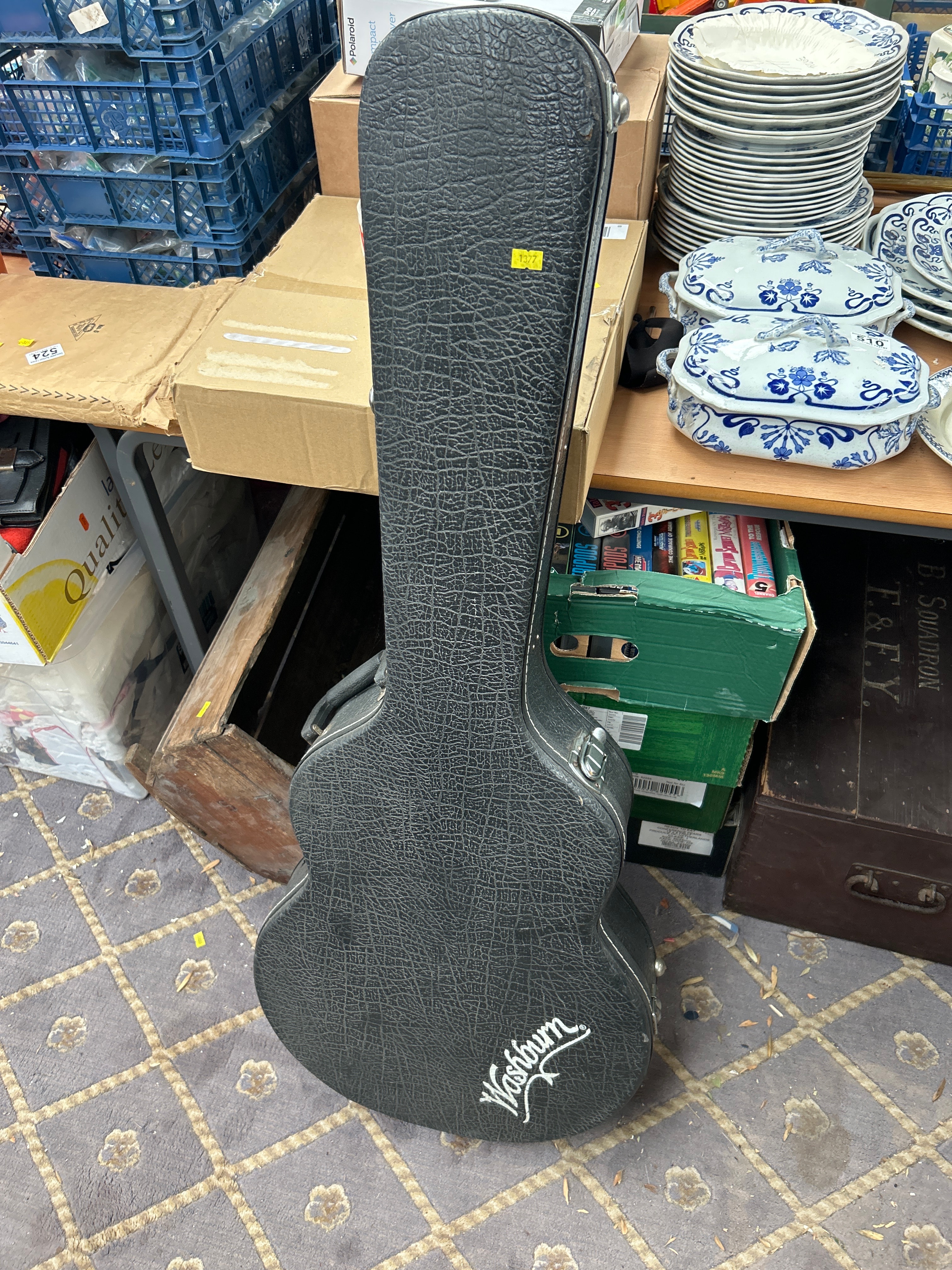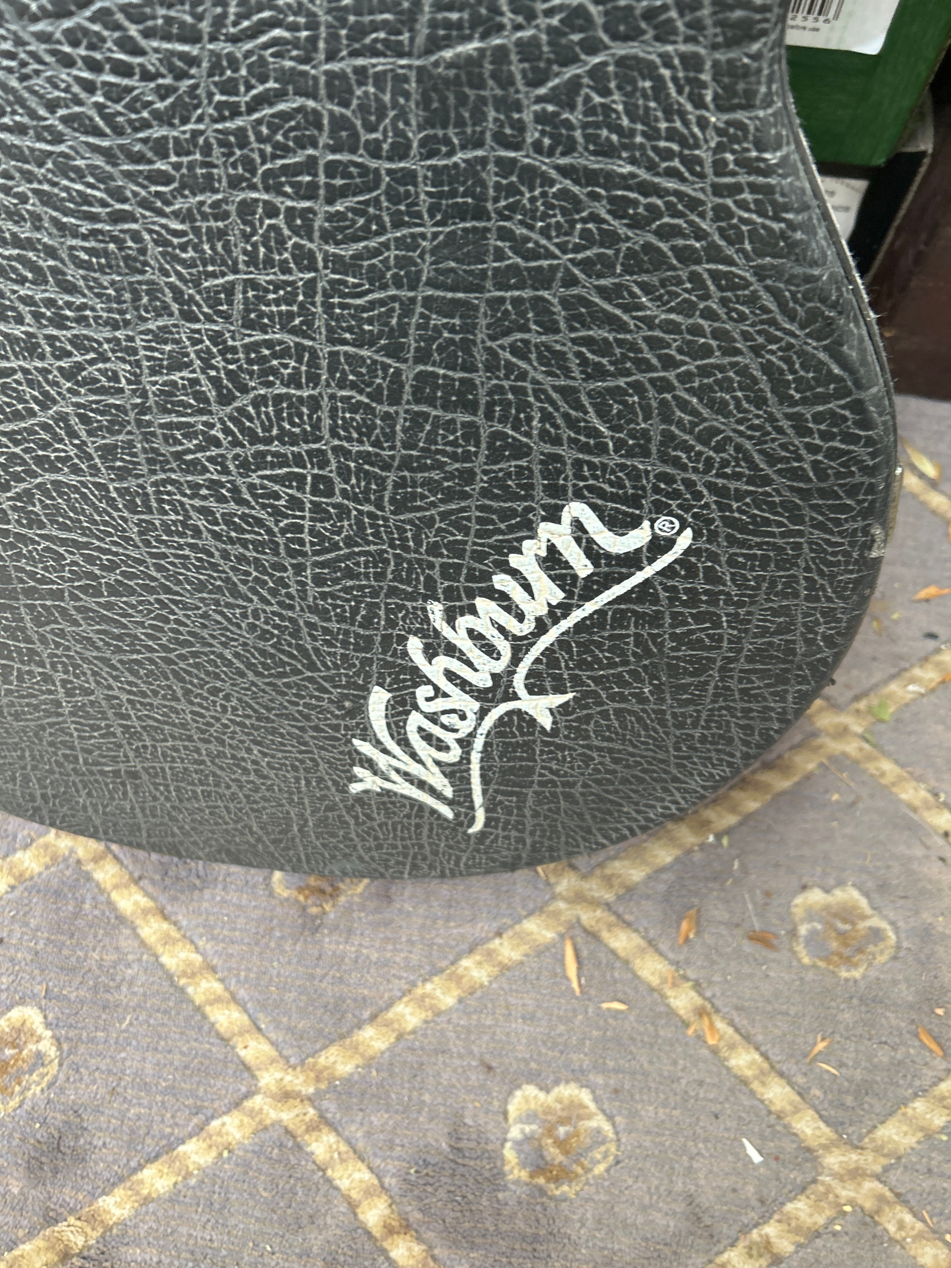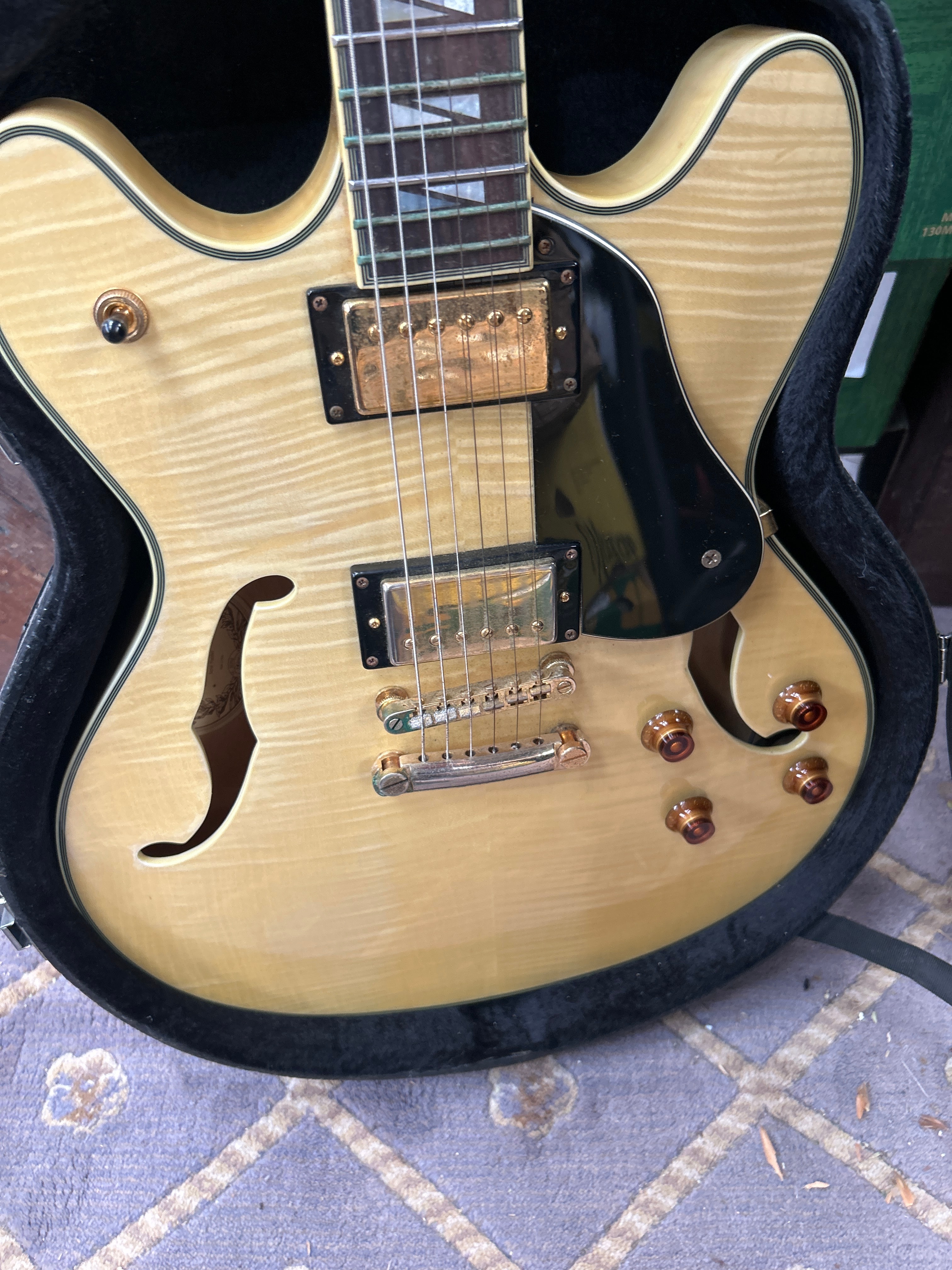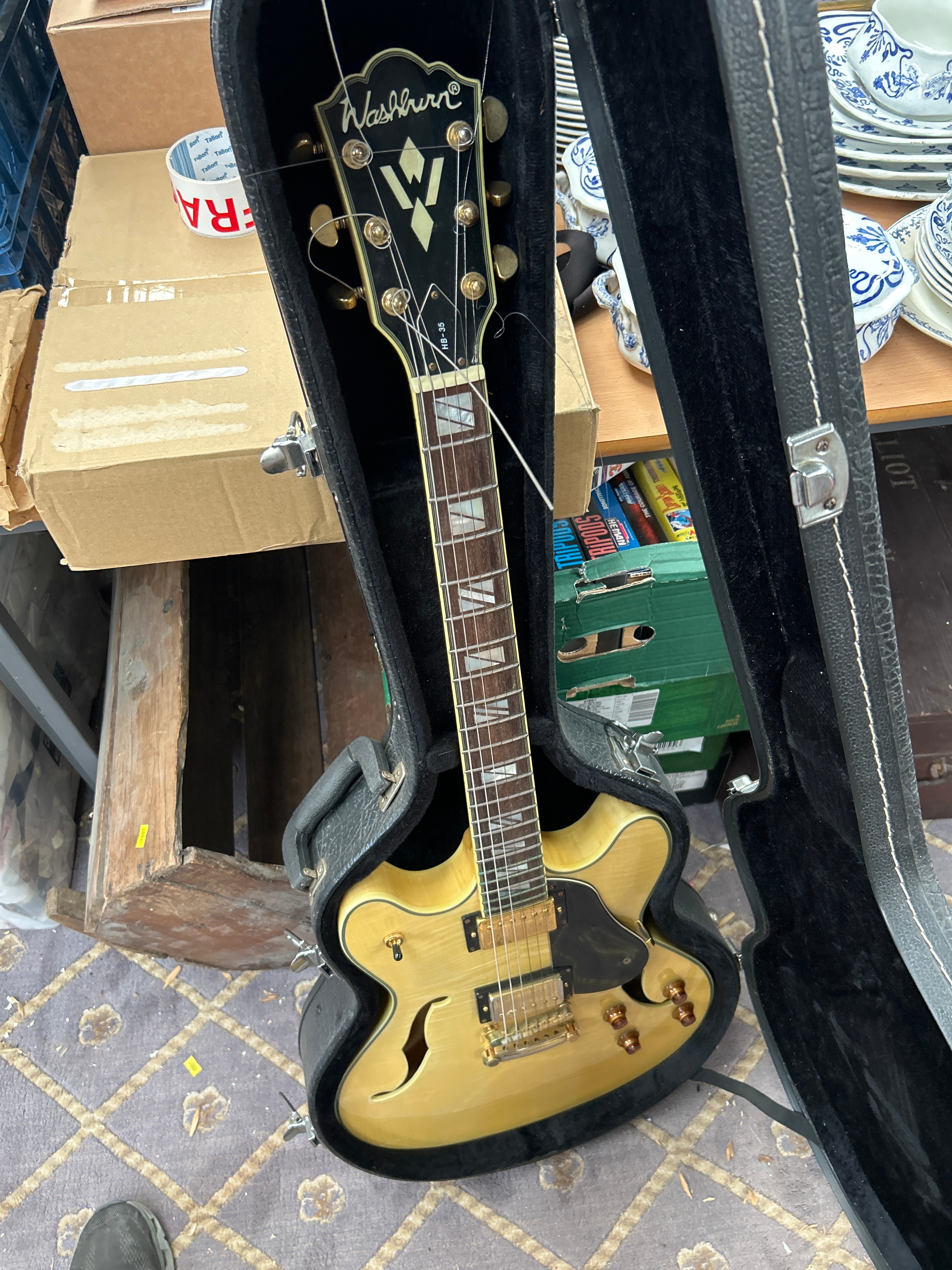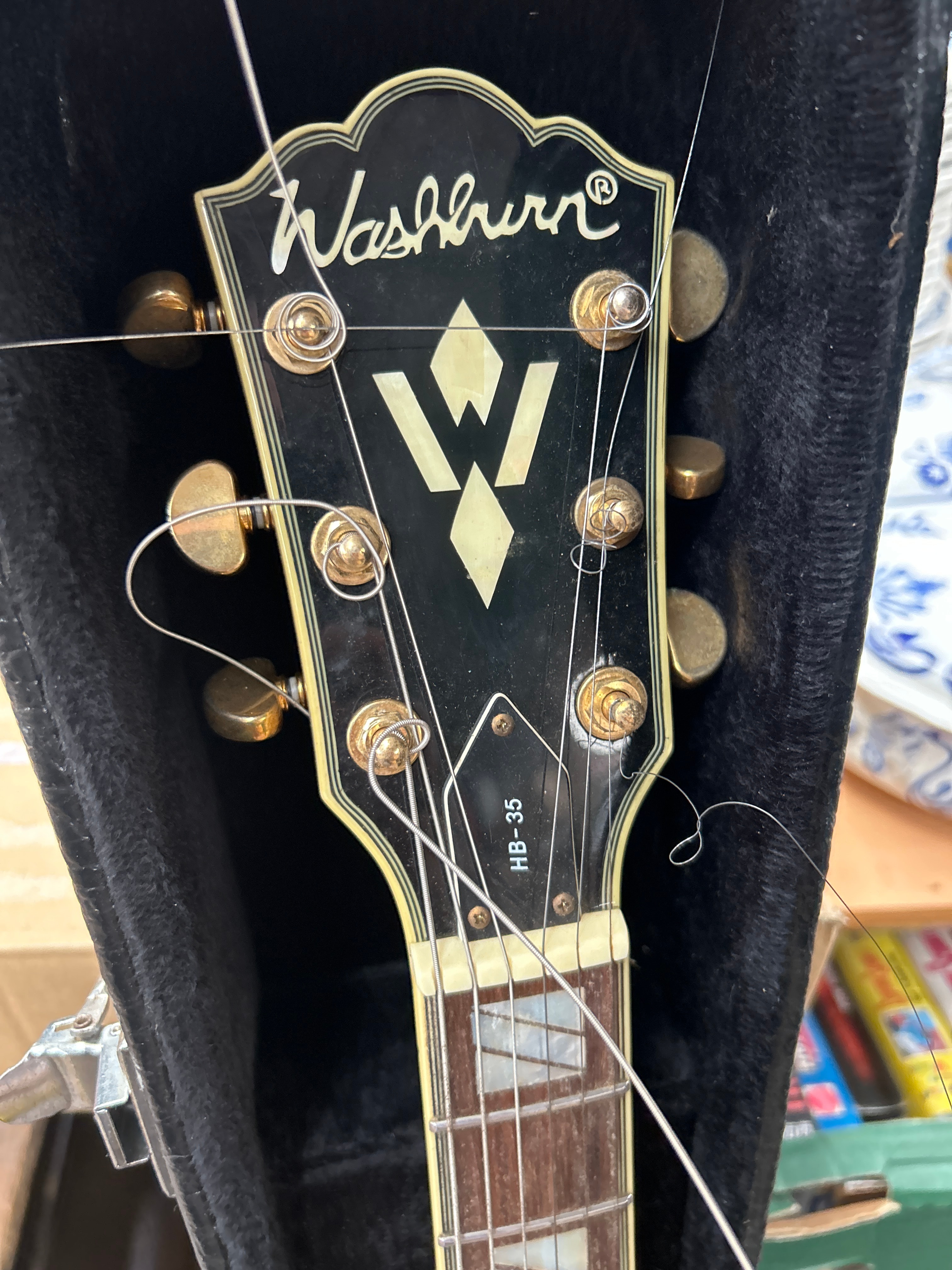 A Washburn HB-35 semi-hollow electric guitar. The guitar features a natural blonde finish with a visible figured wood grain, a black pickguard, and gold-tone hardware including two humbucker pickups, a tune-o-matic bridge, and four control knobs. The black headstock displays the white ‘Washburn’ script logo, a stylized ‘W’ inlay, and the model designation ‘HB-35.’ The fretboard is adorned with rectangular block inlays. It is housed within a fitted black textured hardshell case, which also bears the ‘Washburn’ logo in white script on its lower bout.
