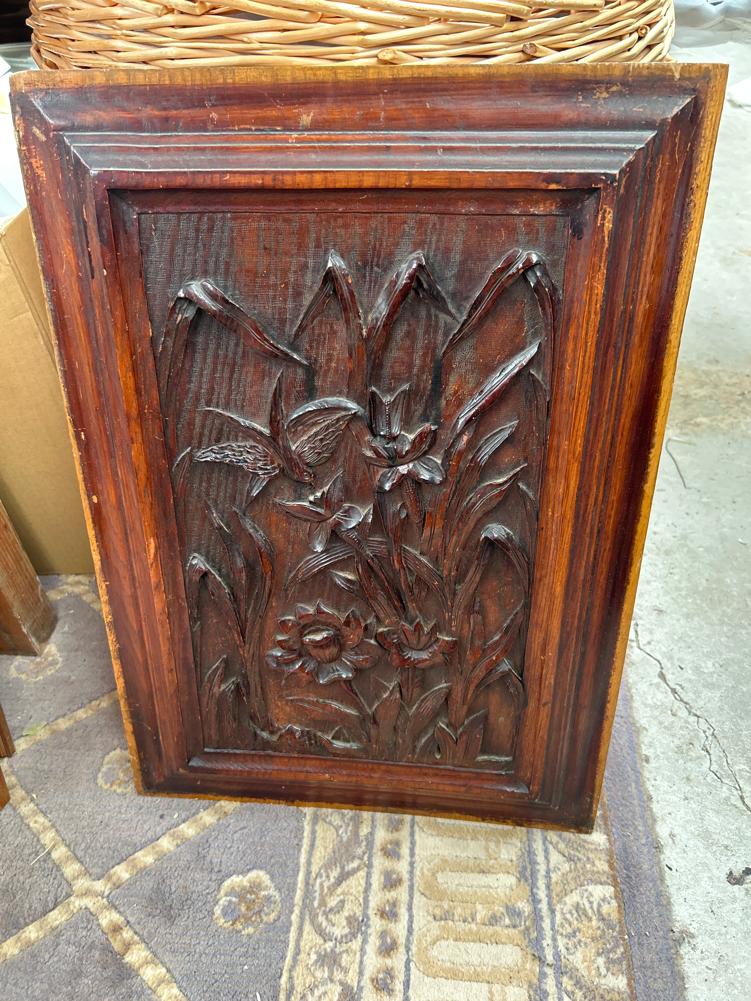 An English Arts and Crafts carved oak panel, attributed to Edwin Ridgeway, dating from the 19th century. This rectangular panel features deep relief carving depicting a naturalistic scene with a small bird, possibly a hummingbird, amidst various flowering plants such as lilies and what appears to be a sunflower or chrysanthemum, surrounded by foliage. The panel is crafted from oak, exhibiting a dark reddish-brown finish. No visible text or distinctive maker’s marks are apparent.
