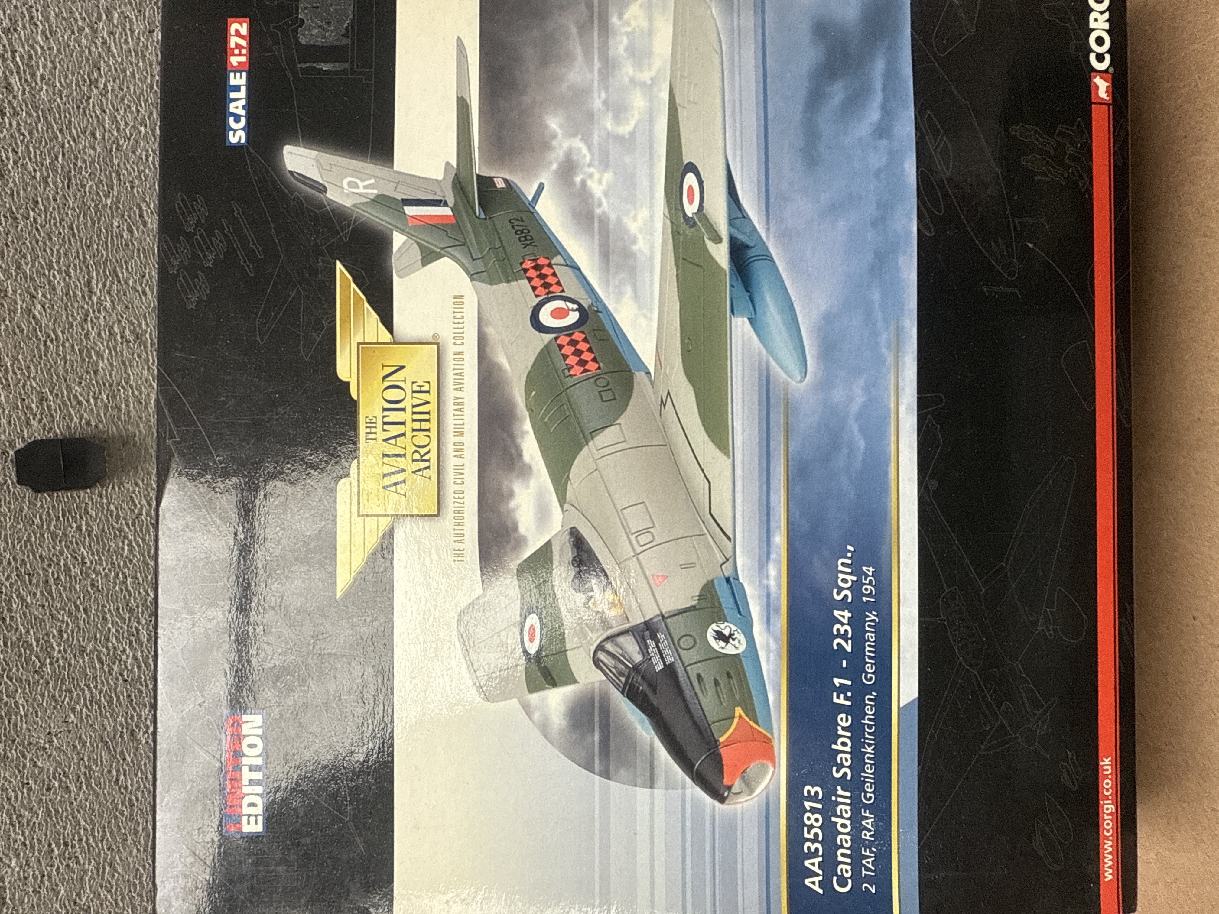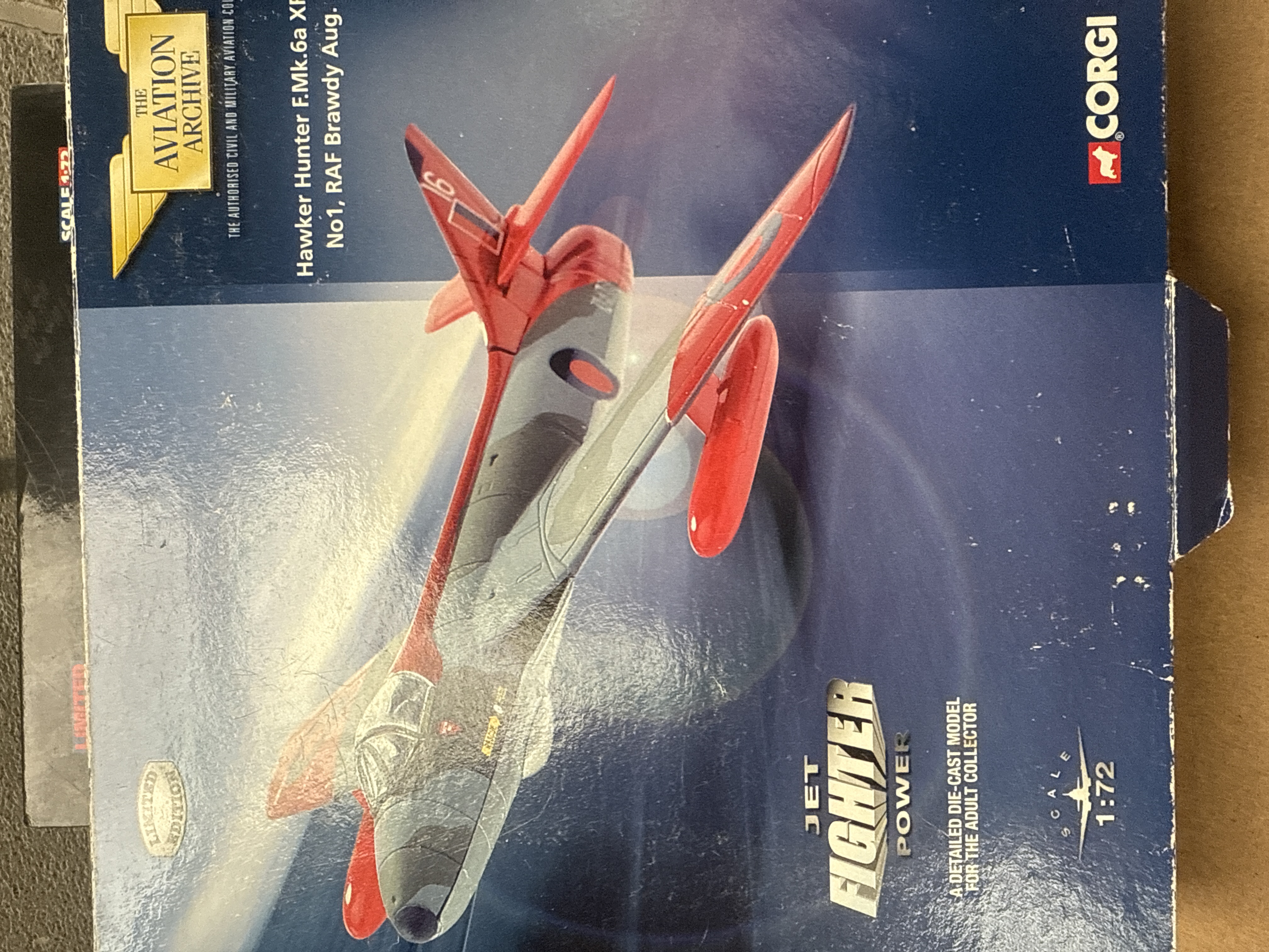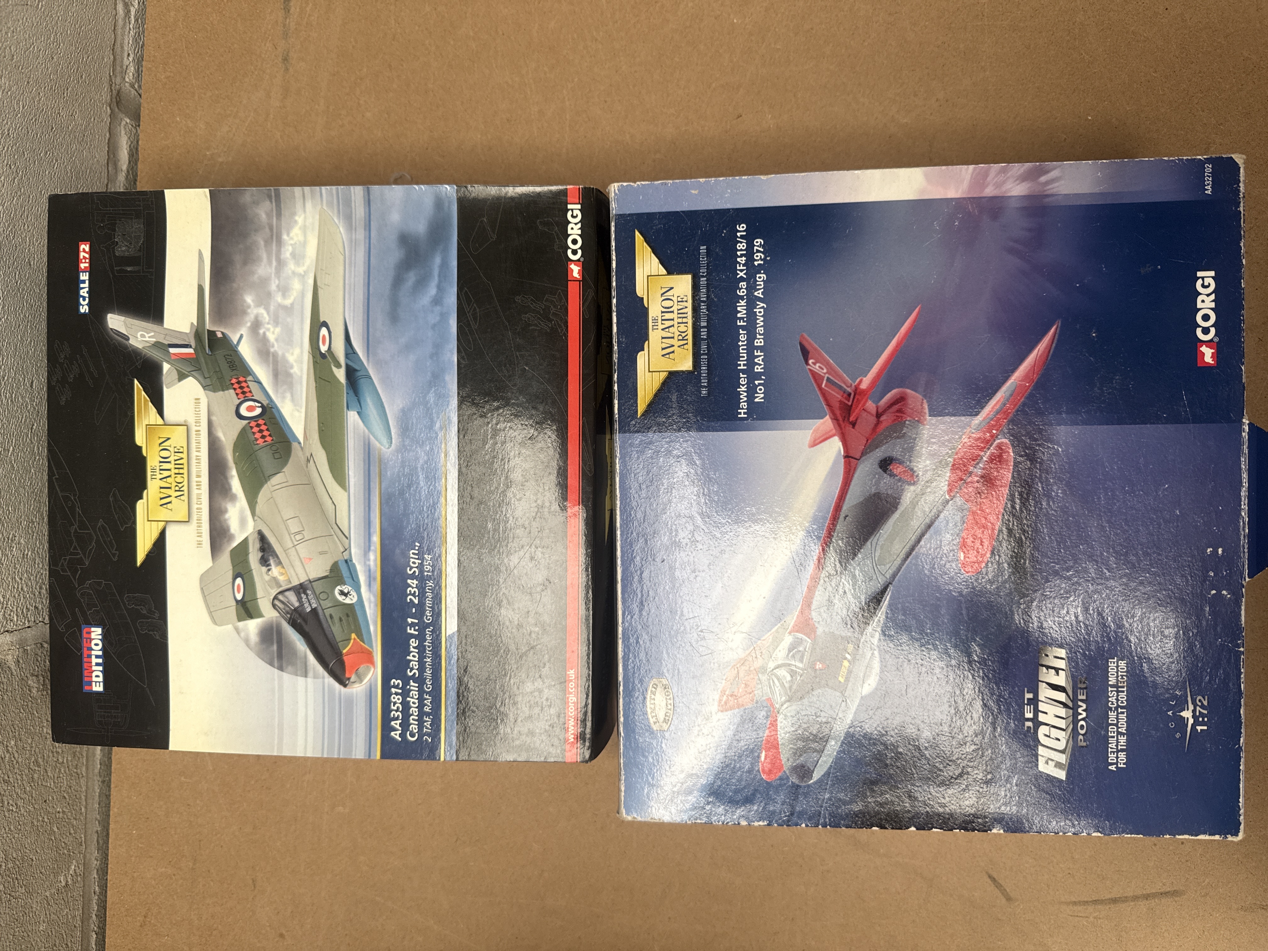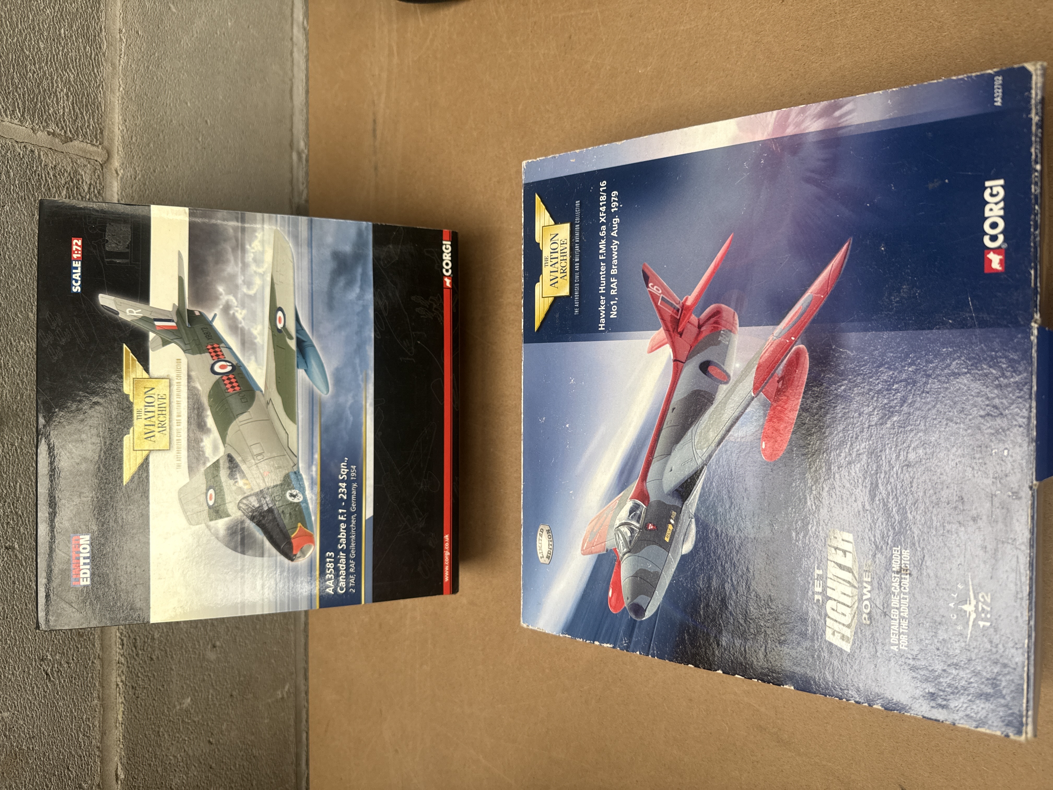 A pair of Corgi ‘Aviation Archive’ limited edition 1:72 scale die-cast model aircraft. The first model depicts a camouflage-painted Canadair Sabre F.1, designated as AA35813, from 234 Sqn., RAF Geilenkirchen, Germany, dated 1954, featuring British roundels and tail number XB872. The second model, from the “Jet Fighter Power” series, showcases a grey and red Hawker Hunter F.Mk.6a, identified as XF418/16 from No.1, RAF Brawdy, August 1979. Both models are presented in their original cardboard boxes.