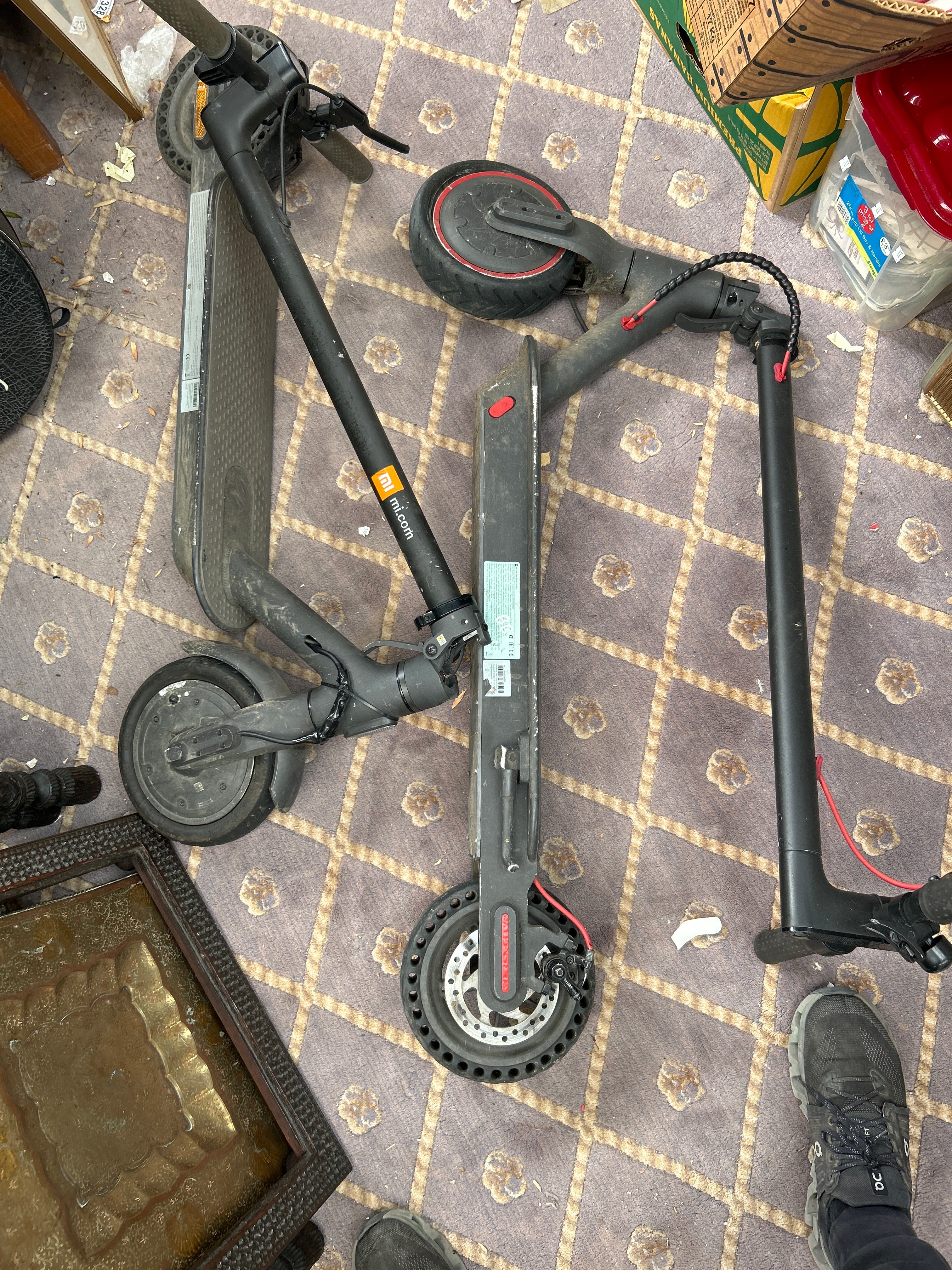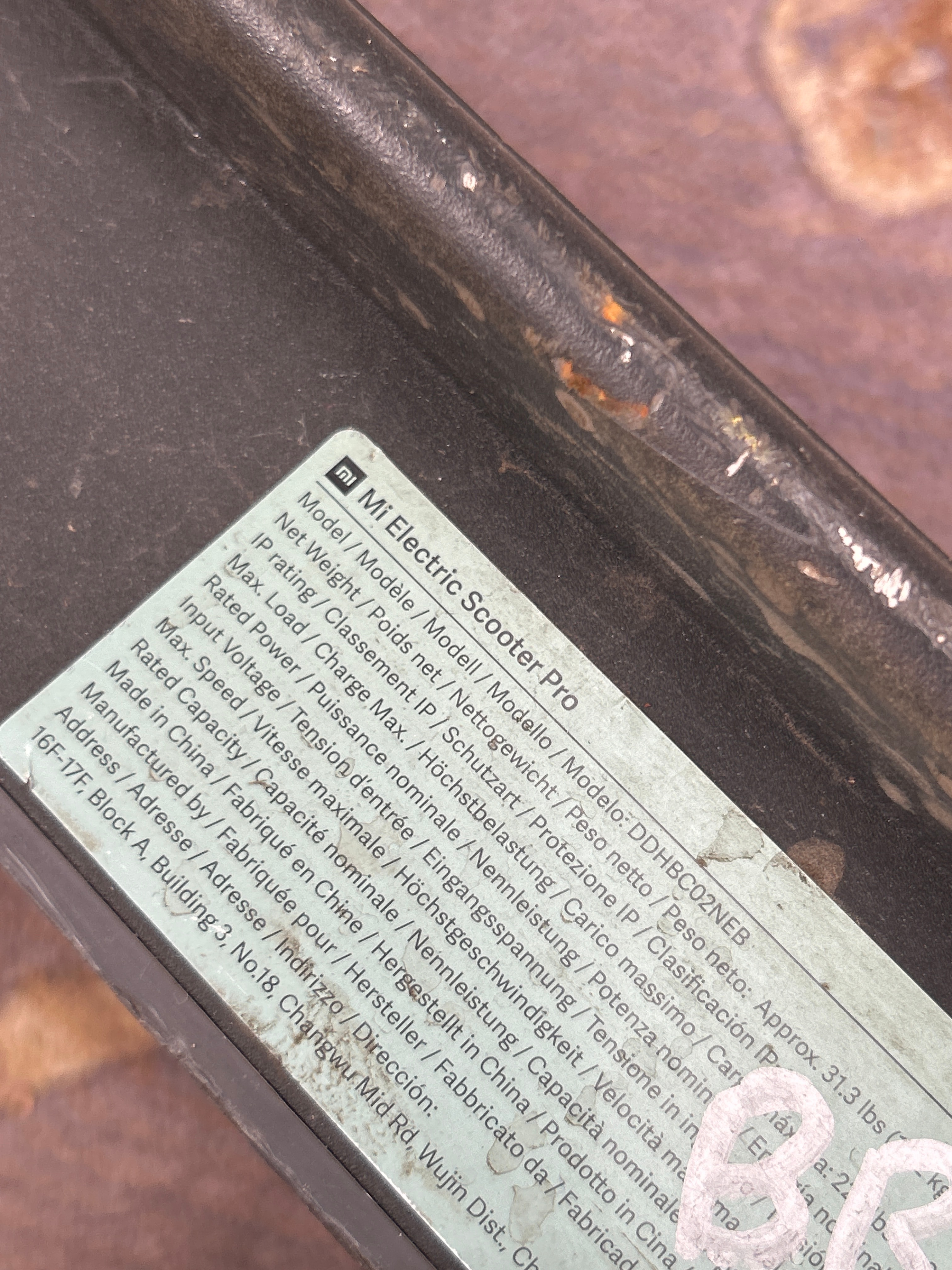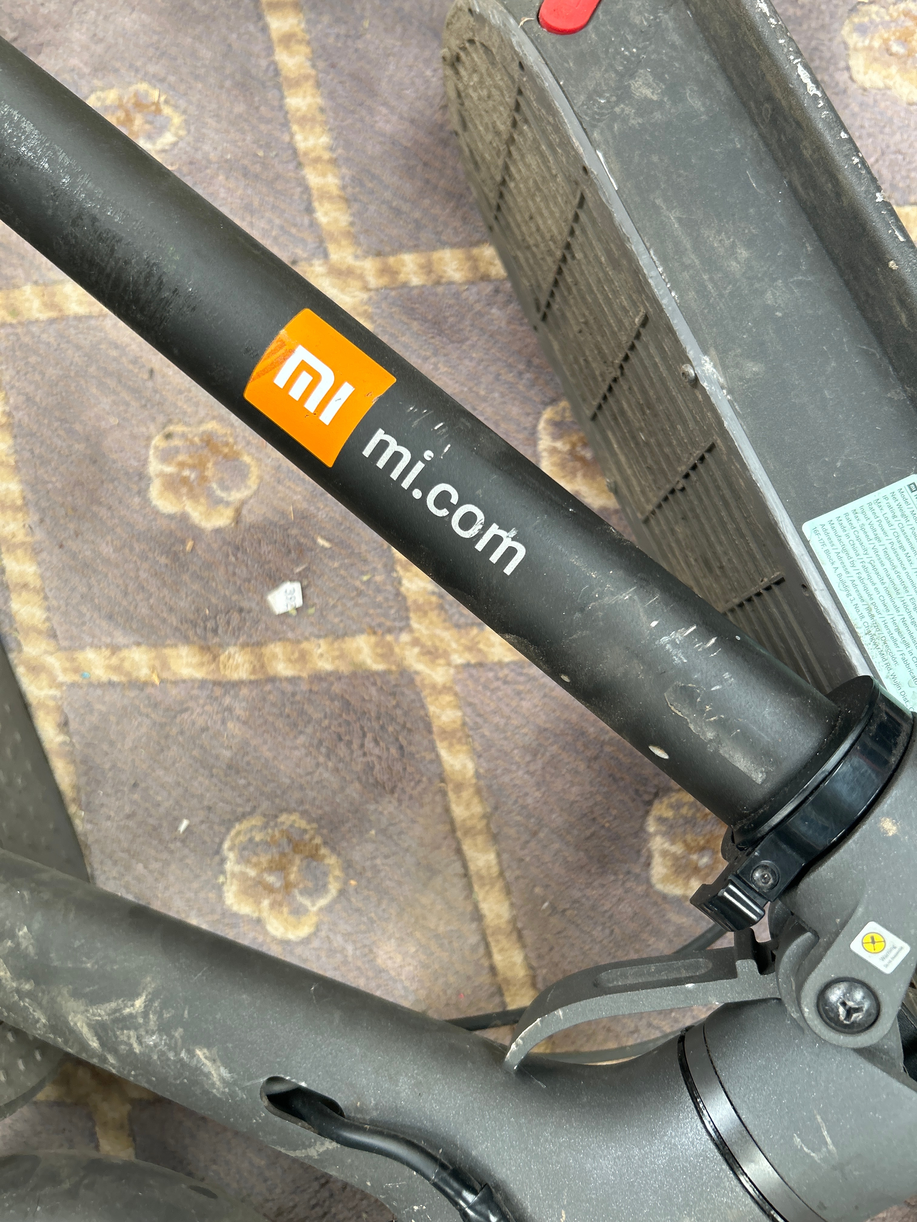 A pair of Xiaomi Mi Electric Scooter Pro (M365 Series) electric scooters, offered for parts. Each unit, model DDHBC02NEB, is finished in dark grey/black with red accents, branded with the ‘Mi’ logo and ‘mi.com’. Constructed primarily from metal and plastic components. The manufacturer’s label states ‘Made in China’ and ‘Net Weight: Approx. 31.3 lbs.’.