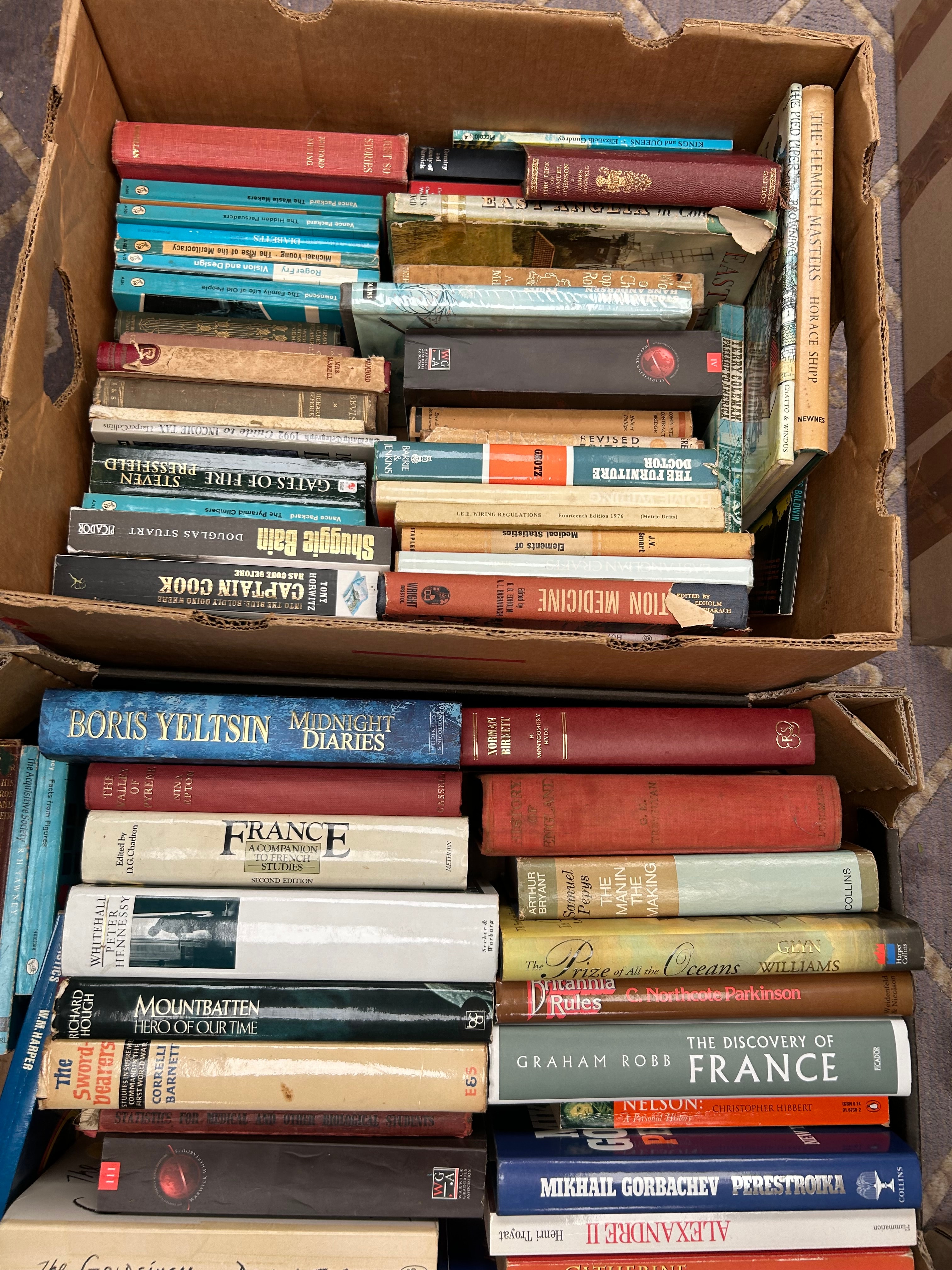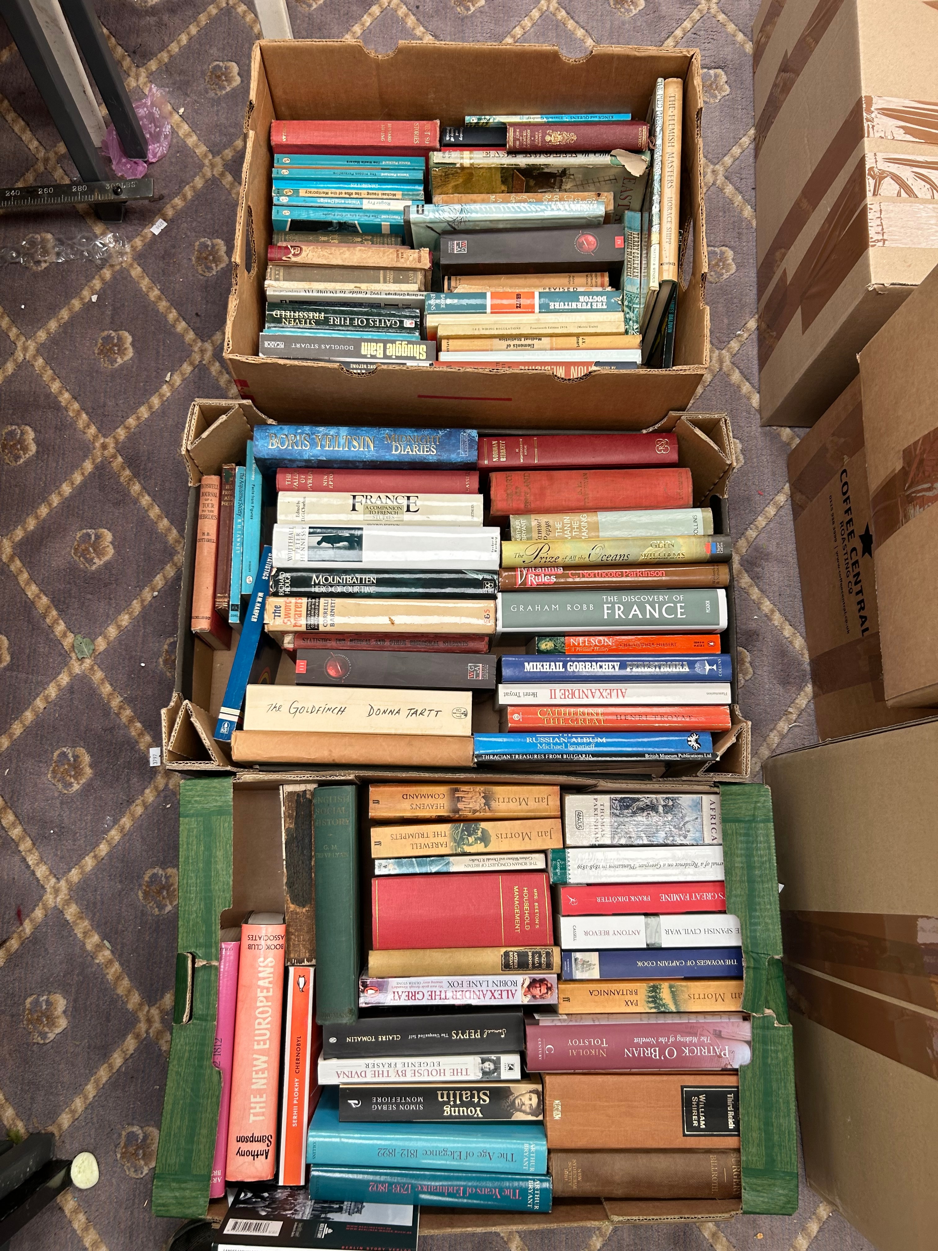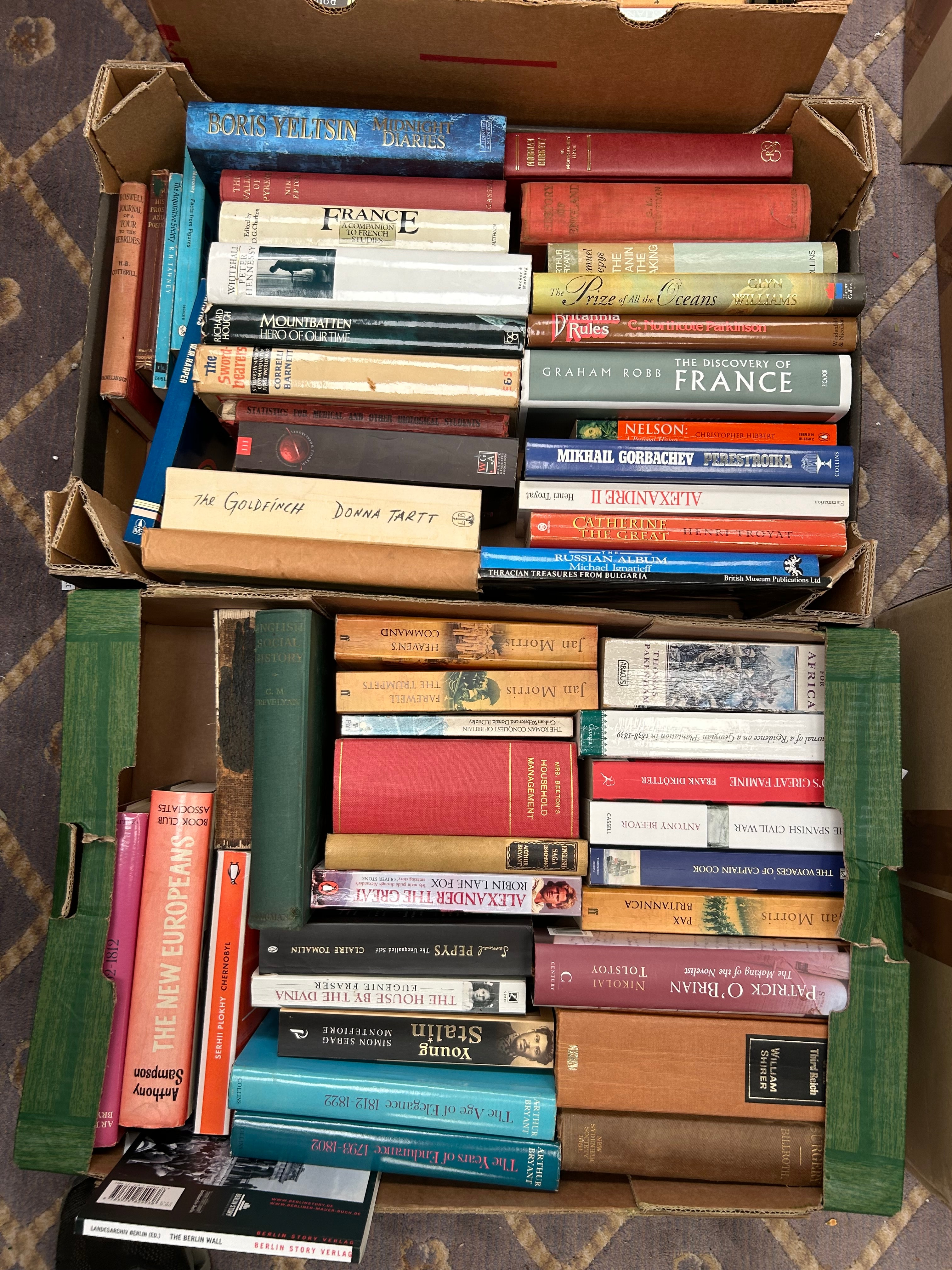 This lot comprises approximately three large boxes containing a diverse collection of books, primarily consisting of modern and contemporary works in both hardcover (many with dust jackets) and paperback formats. The collection includes a strong emphasis on non-fiction, with numerous biographies of historical and political figures (e.g., *Boris Yeltsin Midnight Diaries*, *Mountbatten*, *Mikhail Gorbachev Perestroika*, *Nelson*), history (e.g., *The Discovery of France*, *The Age of Equipoise 1812-1872*), and military or maritime subjects (e.g., *Gate of Fire*, *Das Boot*, *A Captain Cook*). Fiction is also represented by titles such as *The Godolphin* by Donna Tartt and multiple works by Patrick O’Brian. The books are constructed from typical paper, cardboard, and cloth binding materials.