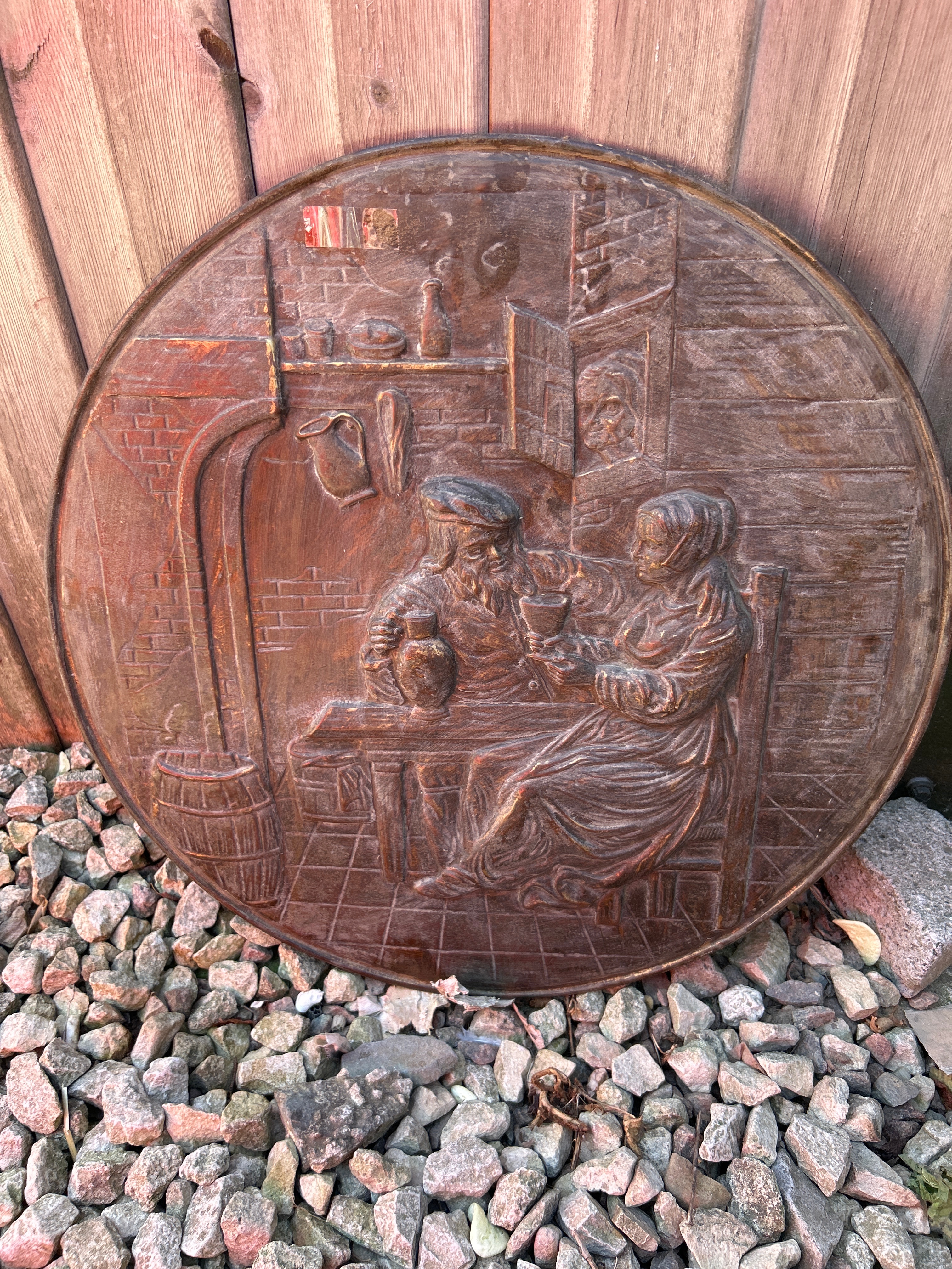A circular embossed copper relief plaque, depicting a high-relief genre scene. Two figures, a bearded man in a cap and a woman in a headscarf, are seated at a table in an interior setting, possibly a tavern or home, with a fireplace/stove, barrels, and various vessels in the background, suggesting a drinking scene. The artistic style evokes historical European genre paintings, potentially of Dutch or Flemish influence from the 17th to 19th centuries. A small, partially torn red label is visible in the upper left quadrant of the plaque, but its text is illegible.