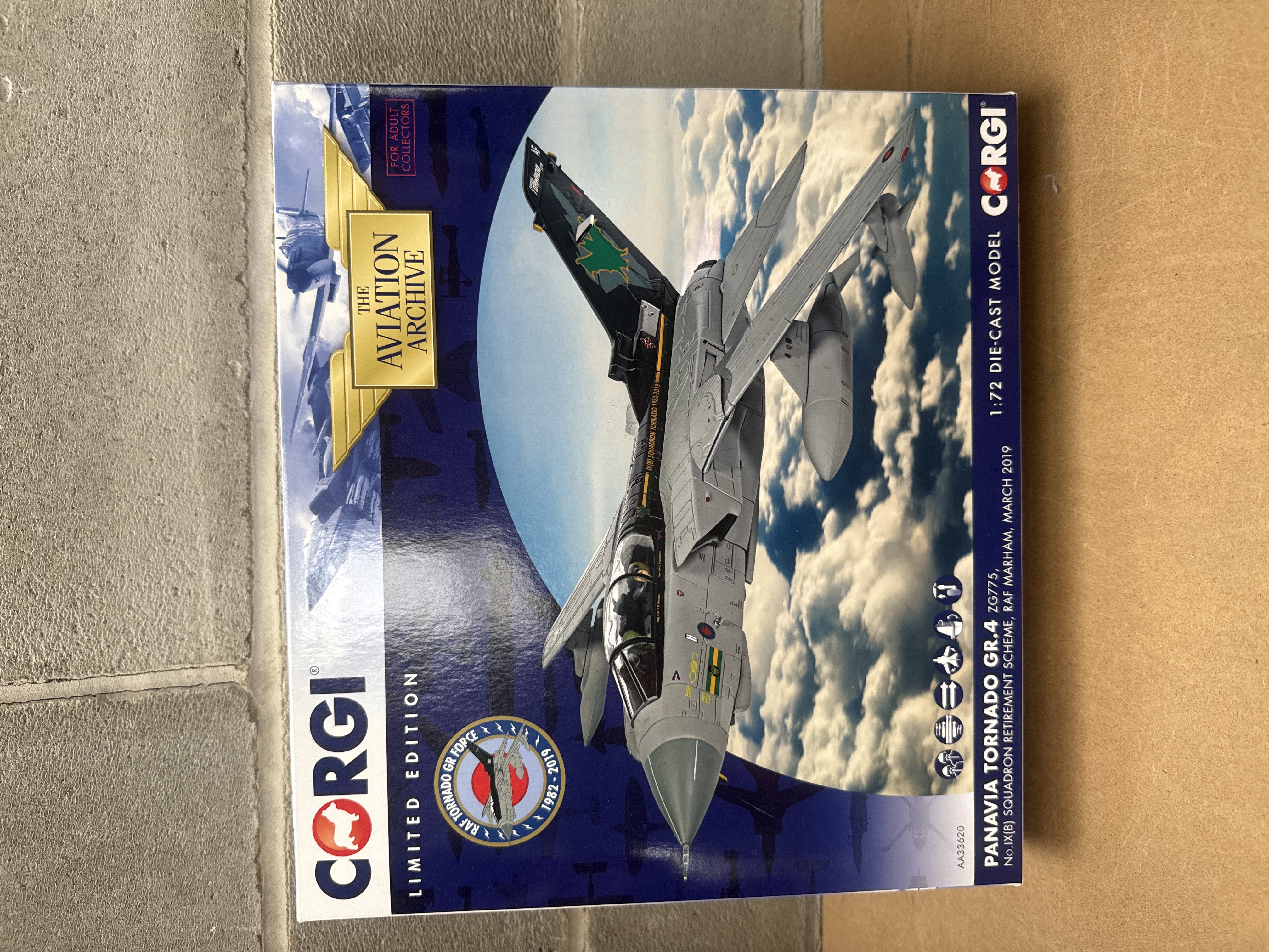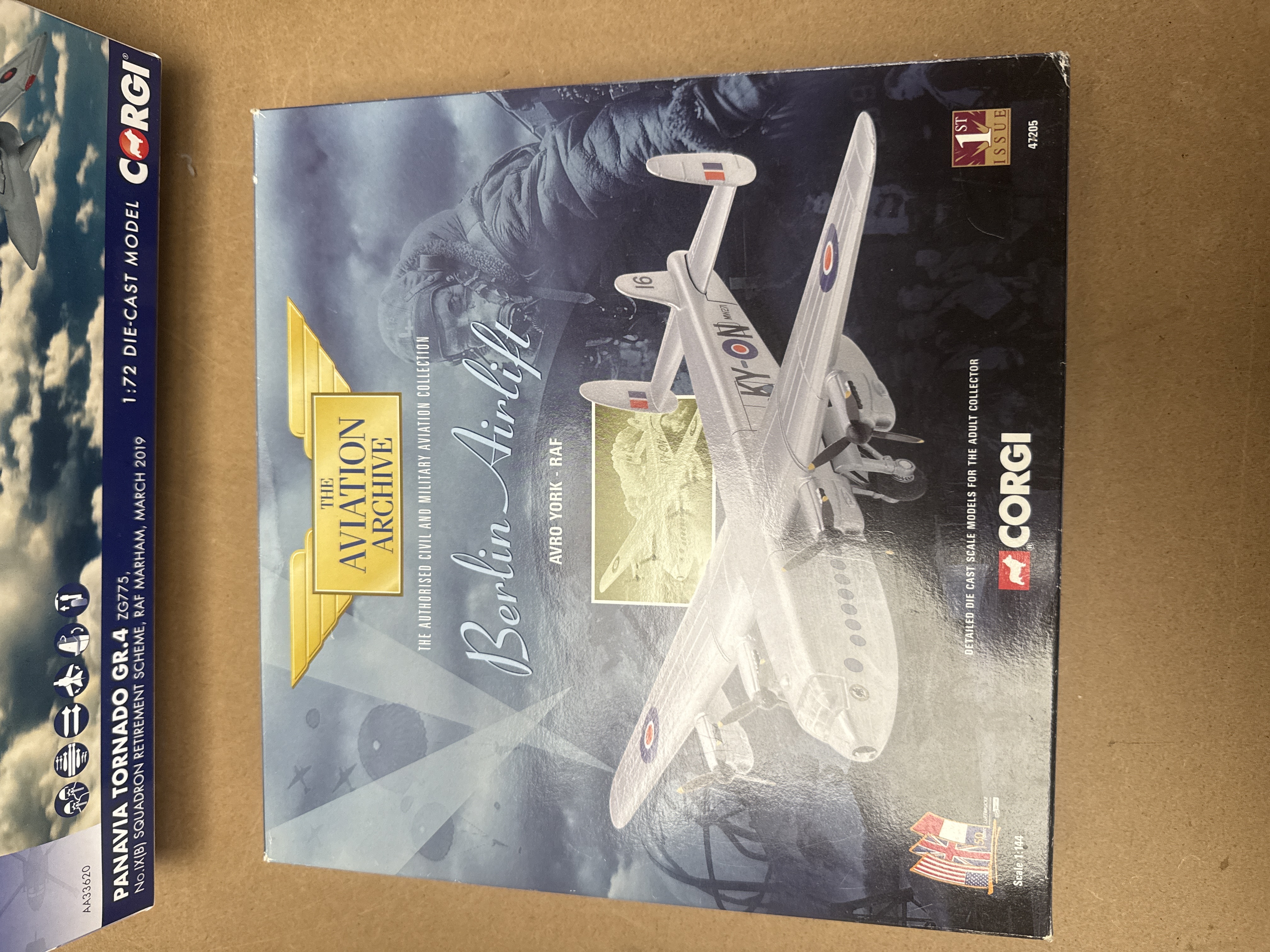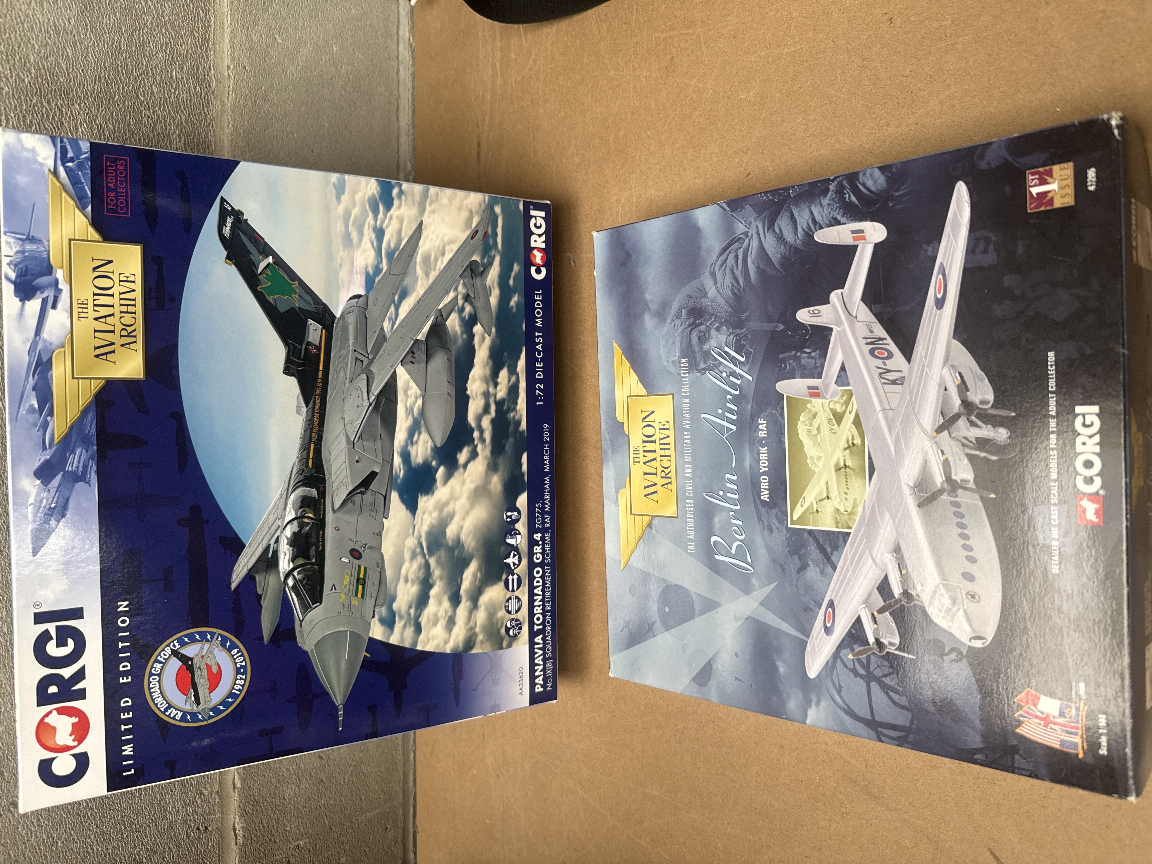 A pair of Corgi ‘The Aviation Archive’ die-cast model aircraft. The first is a Limited Edition 1:72 scale model of a Panavia Tornado GR.4, registration ZG775, in the No. IX(B) Squadron Retirement Scheme, RAF Marham, March 2019, commemorating the RAF Tornado GR Force (1982-2019). This model is marked AA33620 and is intended “For Adult Collectors.” The second model is a 1:144 scale AVRO YORK – RAF, registered KY-ON, themed ‘Berlin Airlift,’ marked as ‘Issue 1’ and product number 47205. This model is also described as a “Detailed Die-Cast Scale Model for the Adult Collector.” Both models are presented in their original full-color printed cardboard boxes or covers.