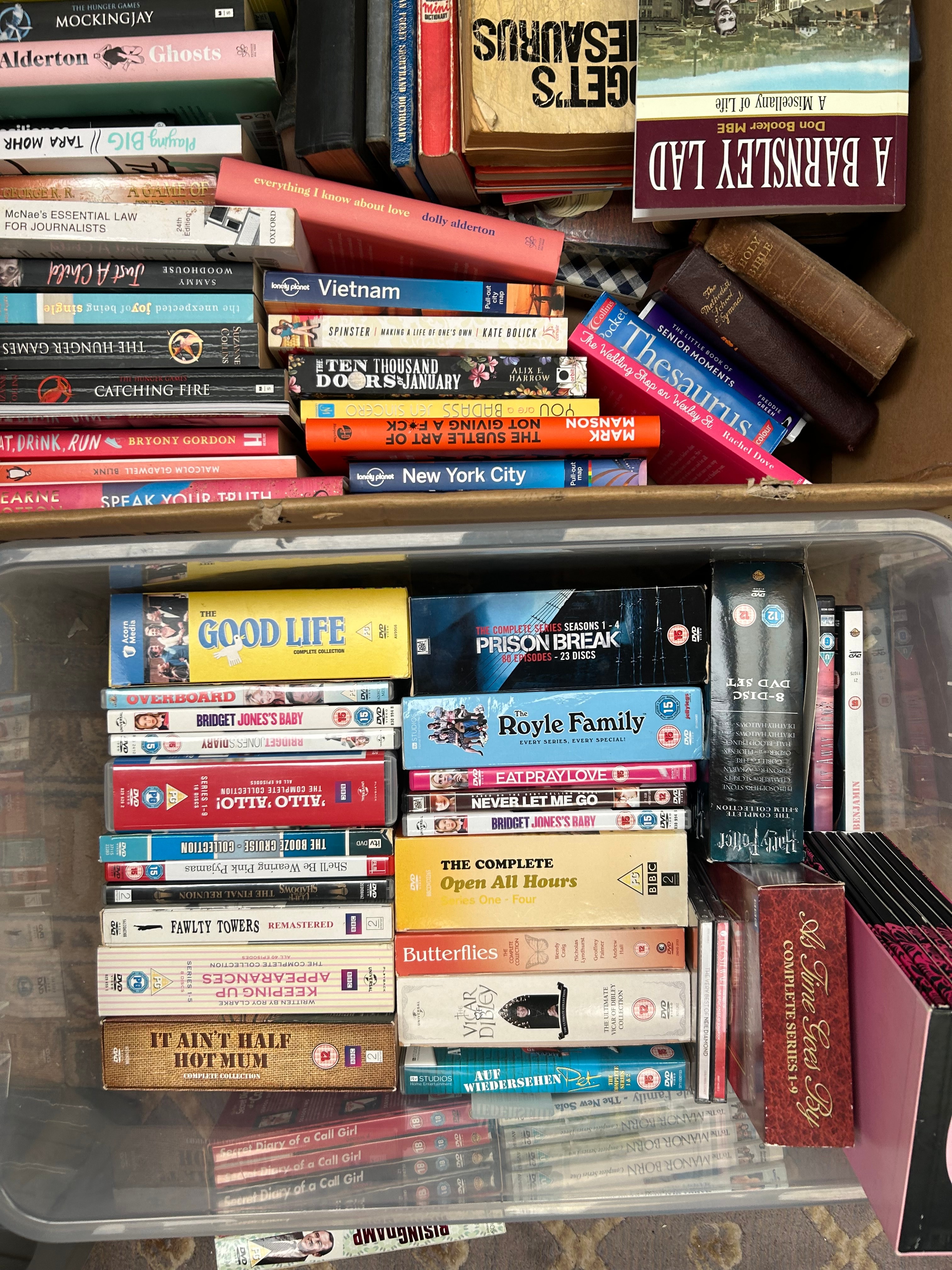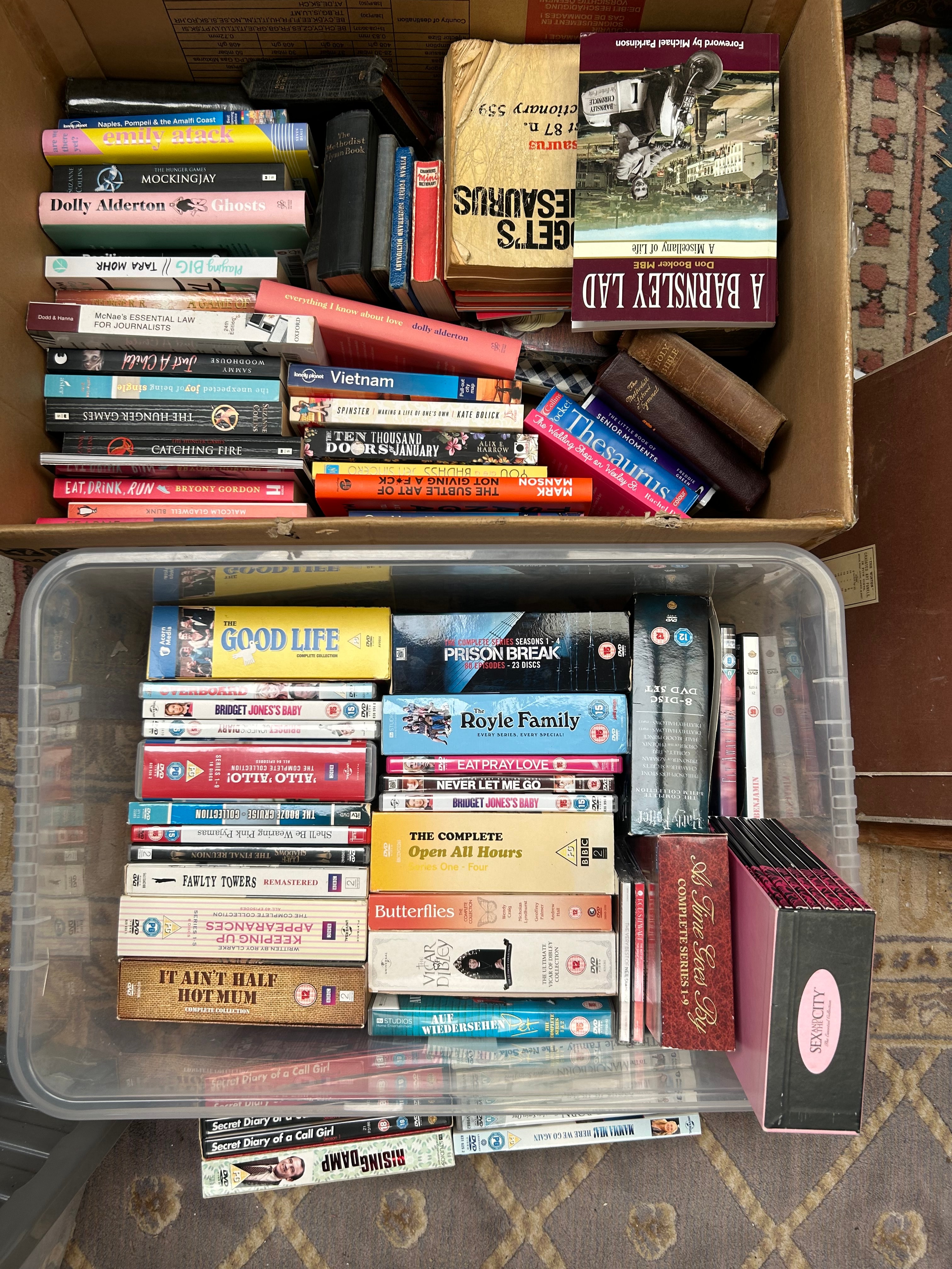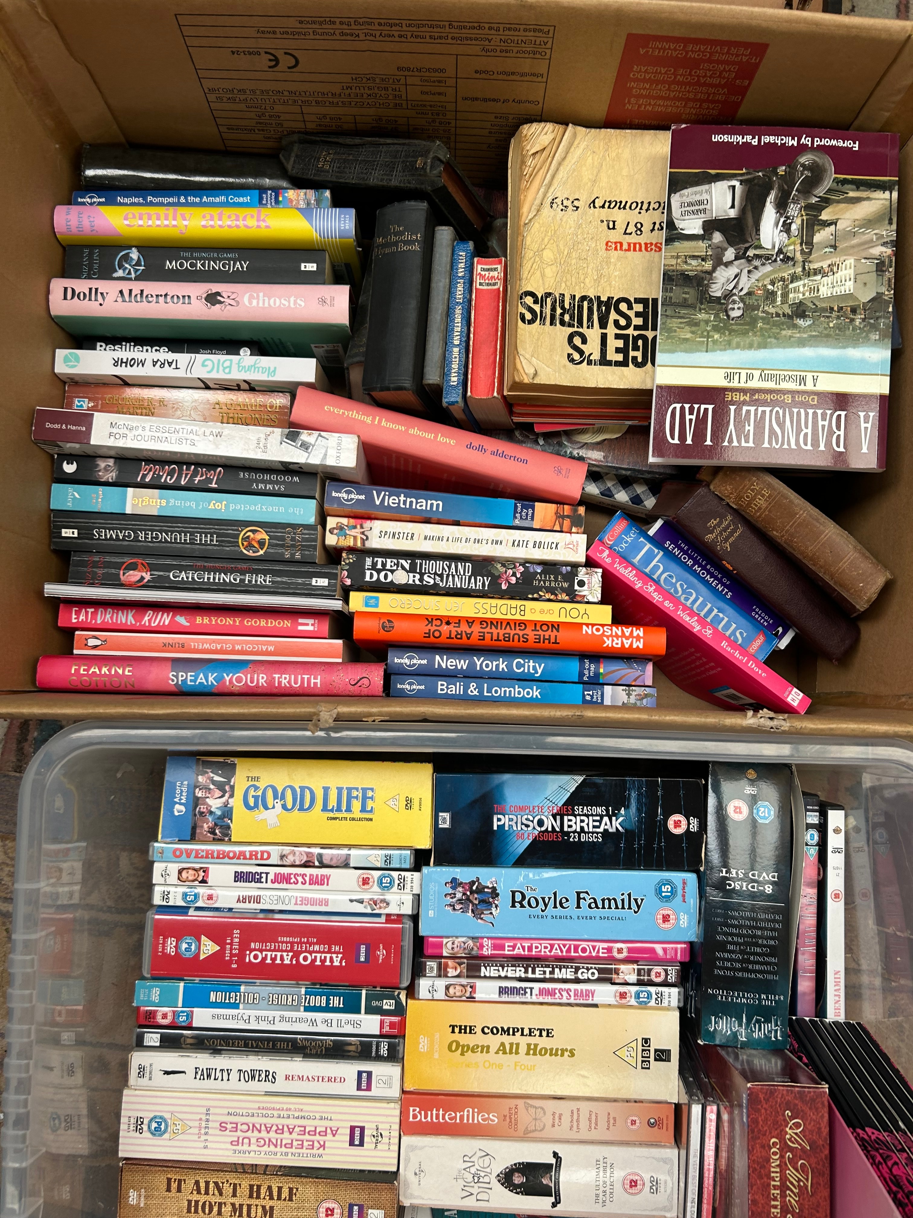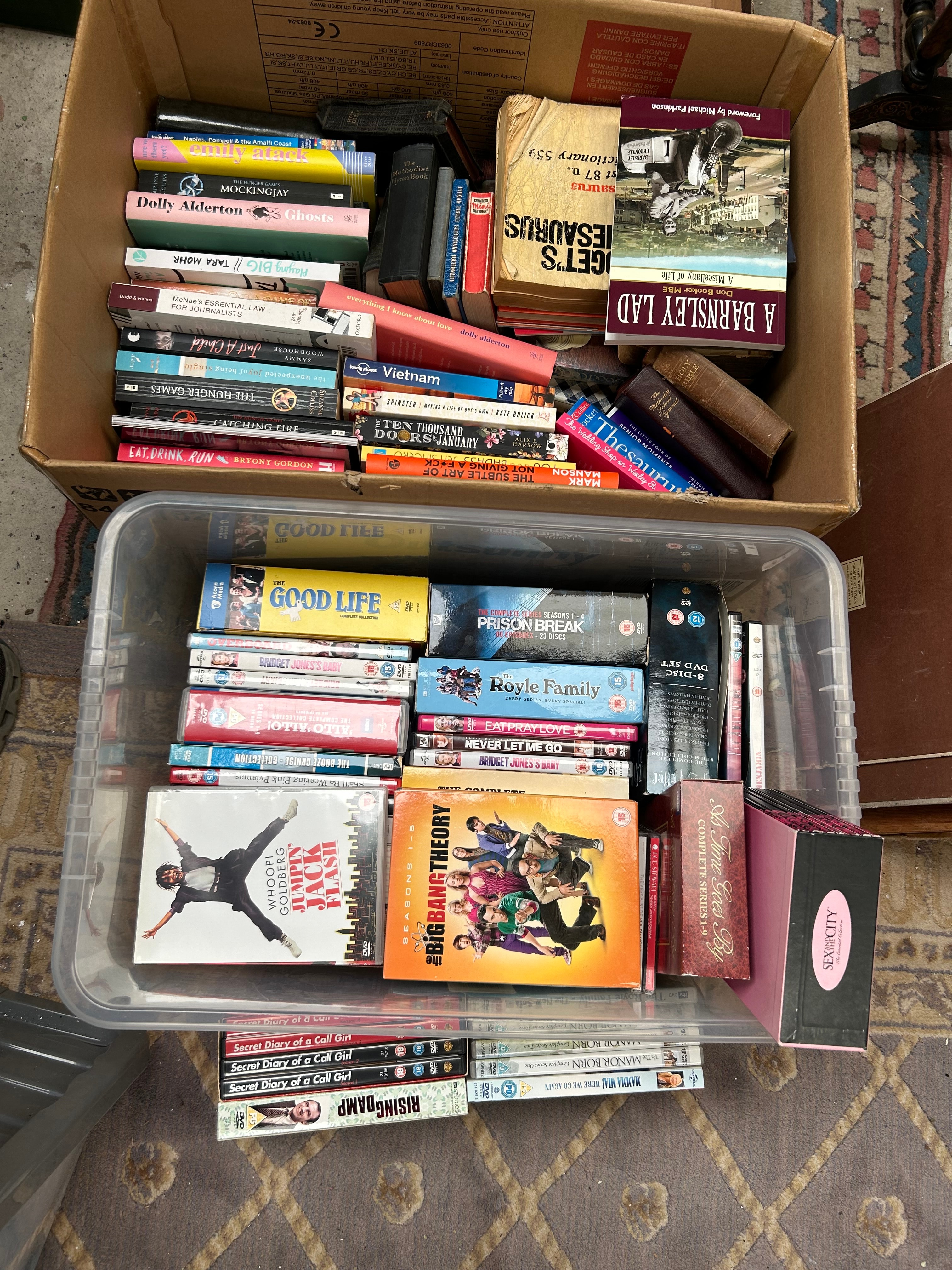 This lot comprises a bulk collection of contemporary media, presented in two containers: an open cardboard box filled with books and a clear plastic tub containing DVDs and possibly Blu-rays. The books, predominantly softcover with some hardcovers, are a mix of popular fiction, non-fiction, and reference titles from the late 20th and 21st centuries, with visible examples including “Mockingjay,” “Dolly Alderton Ghosts,” “The Hunger Games,” “A Barnsley Lad,” “The Subtle Art of Not Giving a F*ck,” and a German title “Auf Wiedersehen.” The DVDs, housed in standard plastic cases, feature complete series and films such as “The Good Life,” “Prison Break,” “The Royle Family,” “The Big Bang Theory,” “Fawlty Towers Remastered,” and “Secret Diary of a Call Girl.”