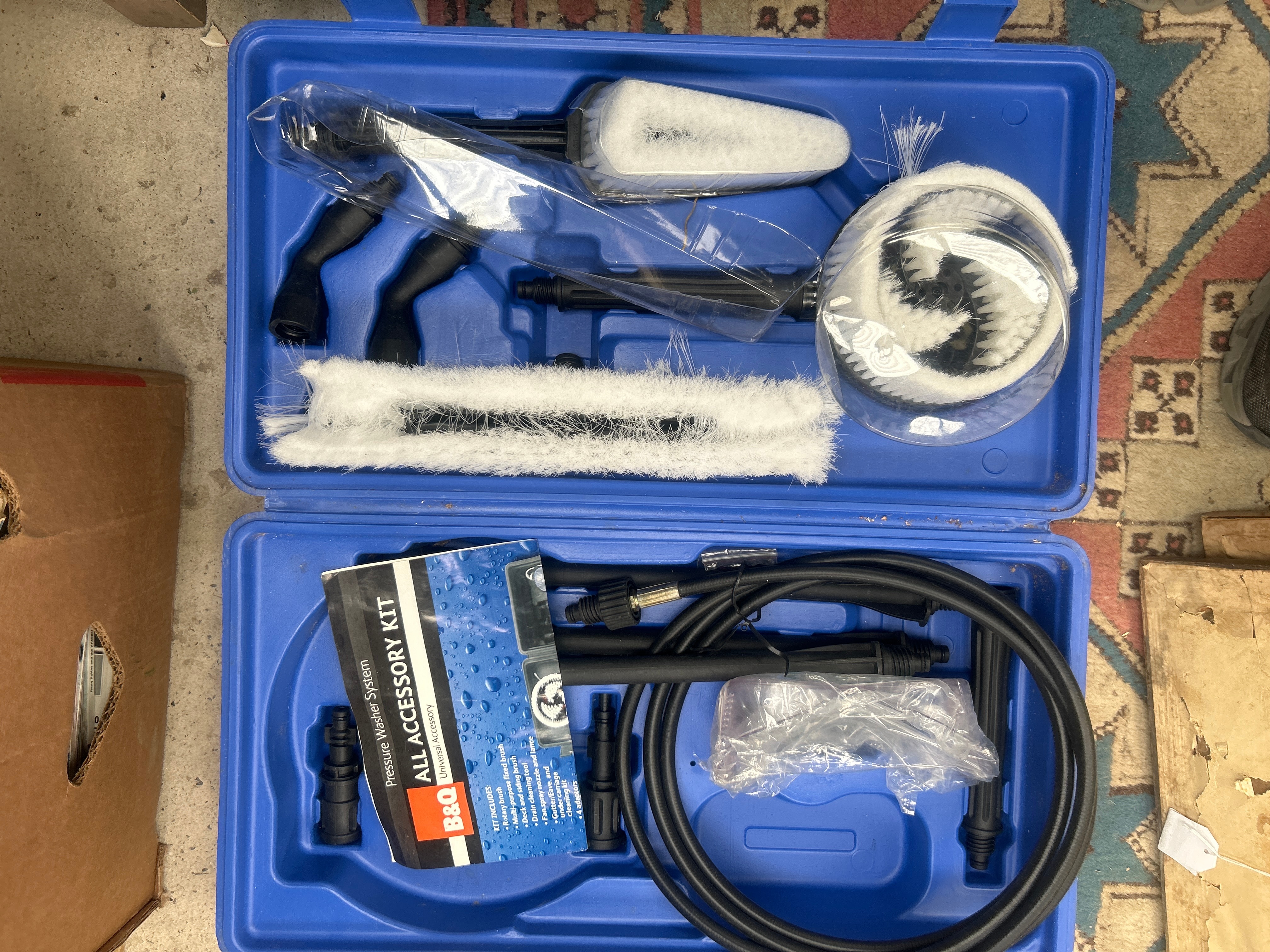 A B&Q “ALL ACCESSORY KIT” for a “Pressure Washer System,” labeled as a “Universal Accessory.” Presented in a blue molded plastic carrying case, the kit includes a rotary brush, multi-purpose fixed brush, deck and siding brush, drain cleaning tool, fan-spray nozzle and lance, gutter/eave and undercarriage cleaning kit, and four adaptors. Components are primarily black plastic and white synthetic bristles/fibers, with a coiled black hose.