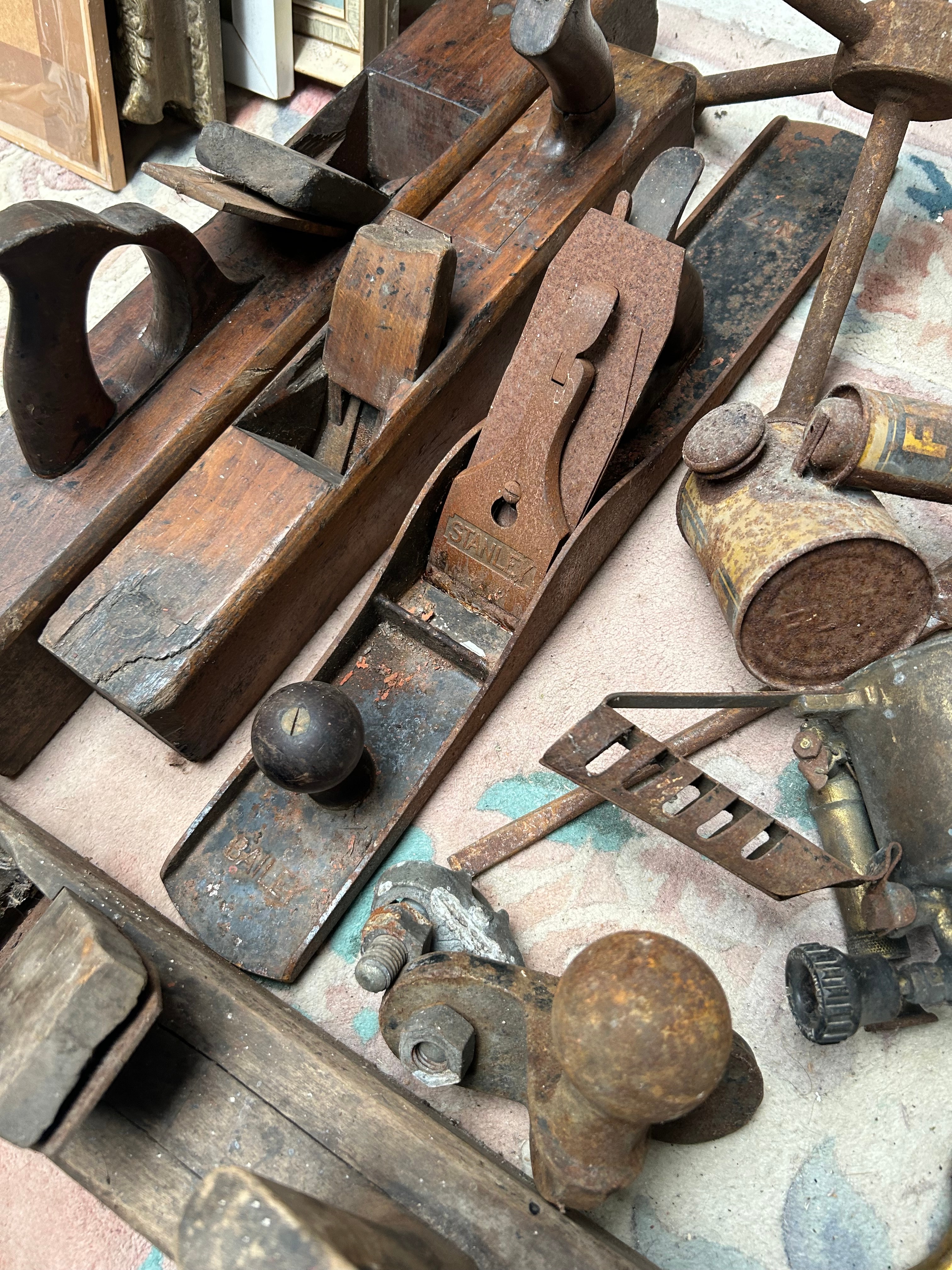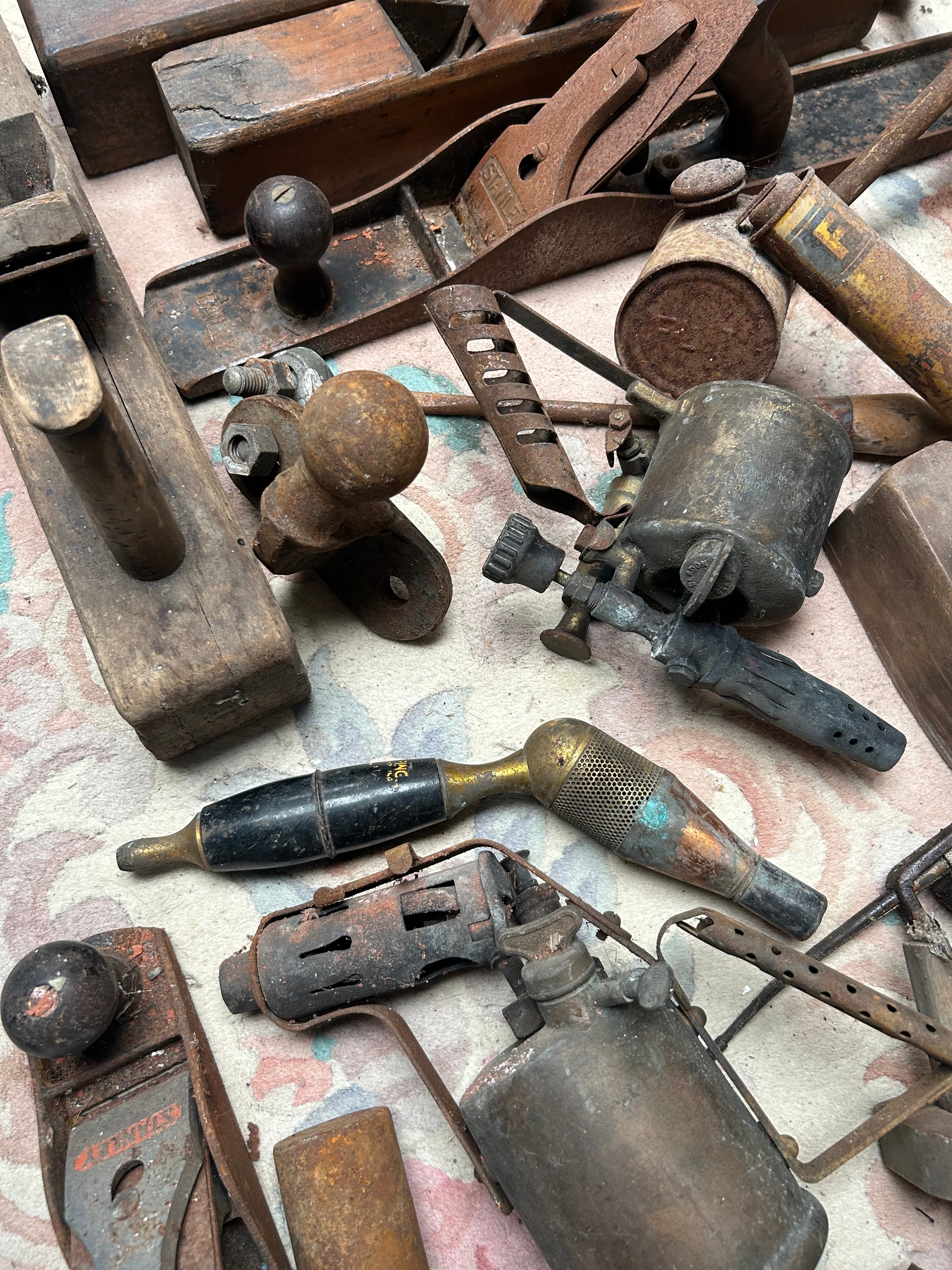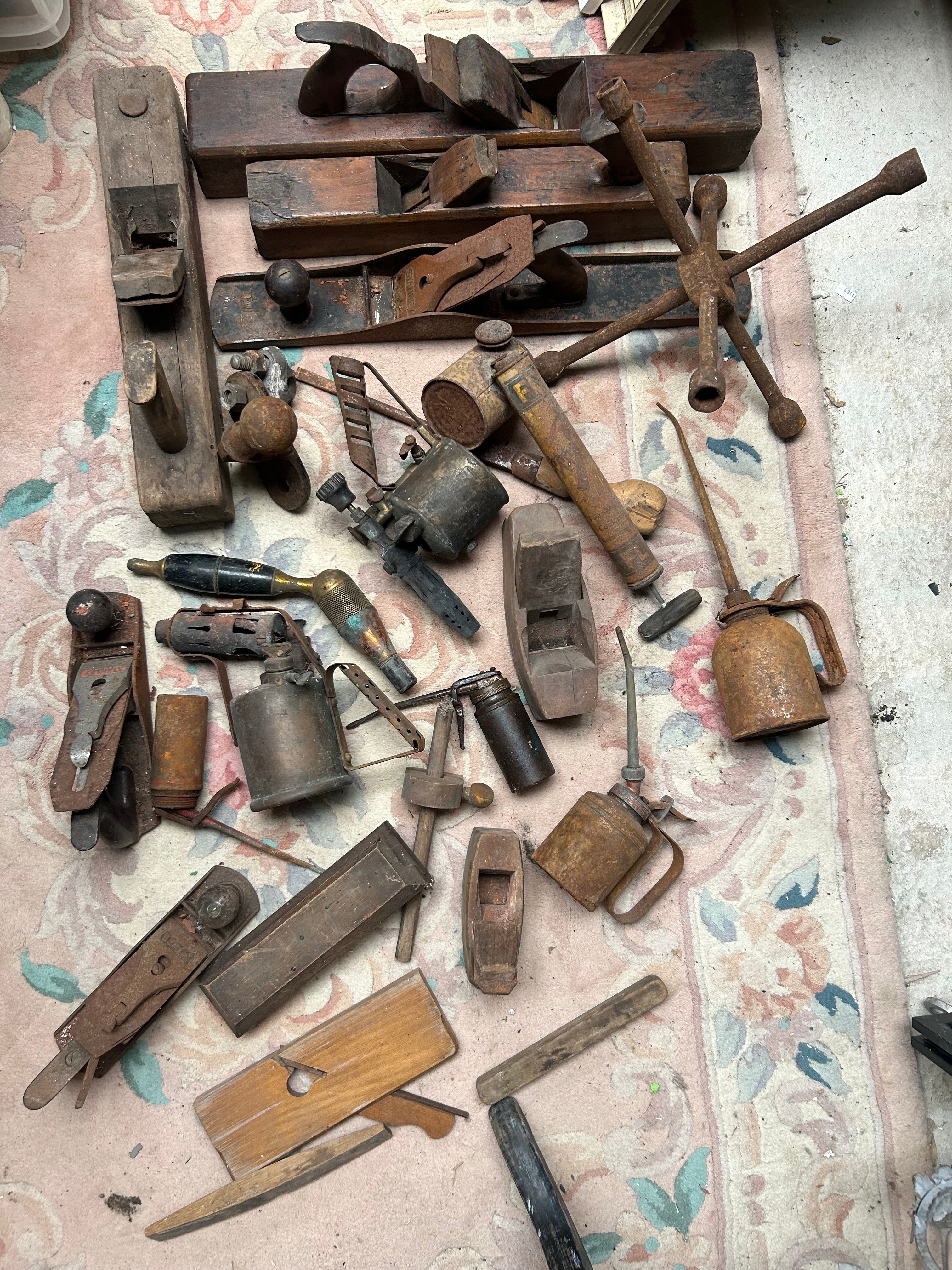 A diverse assortment of vintage hand tools, predominantly featuring woodworking planes of various types, including large wooden examples and several metal-bodied planes. The collection also comprises multiple brass and steel blow torches or soldering irons, several metal oil cans, and other workshop implements such as a large iron “spider” wrench and a wooden marking gauge. Materials primarily consist of wood, cast iron, steel, and brass. Visible markings include “STANLEY” on some plane irons, “PATENT,” and “COLEMAN FUEL” on a yellow-capped cylindrical container. The items are consistent with those likely dating from the late 19th to mid-20th century.