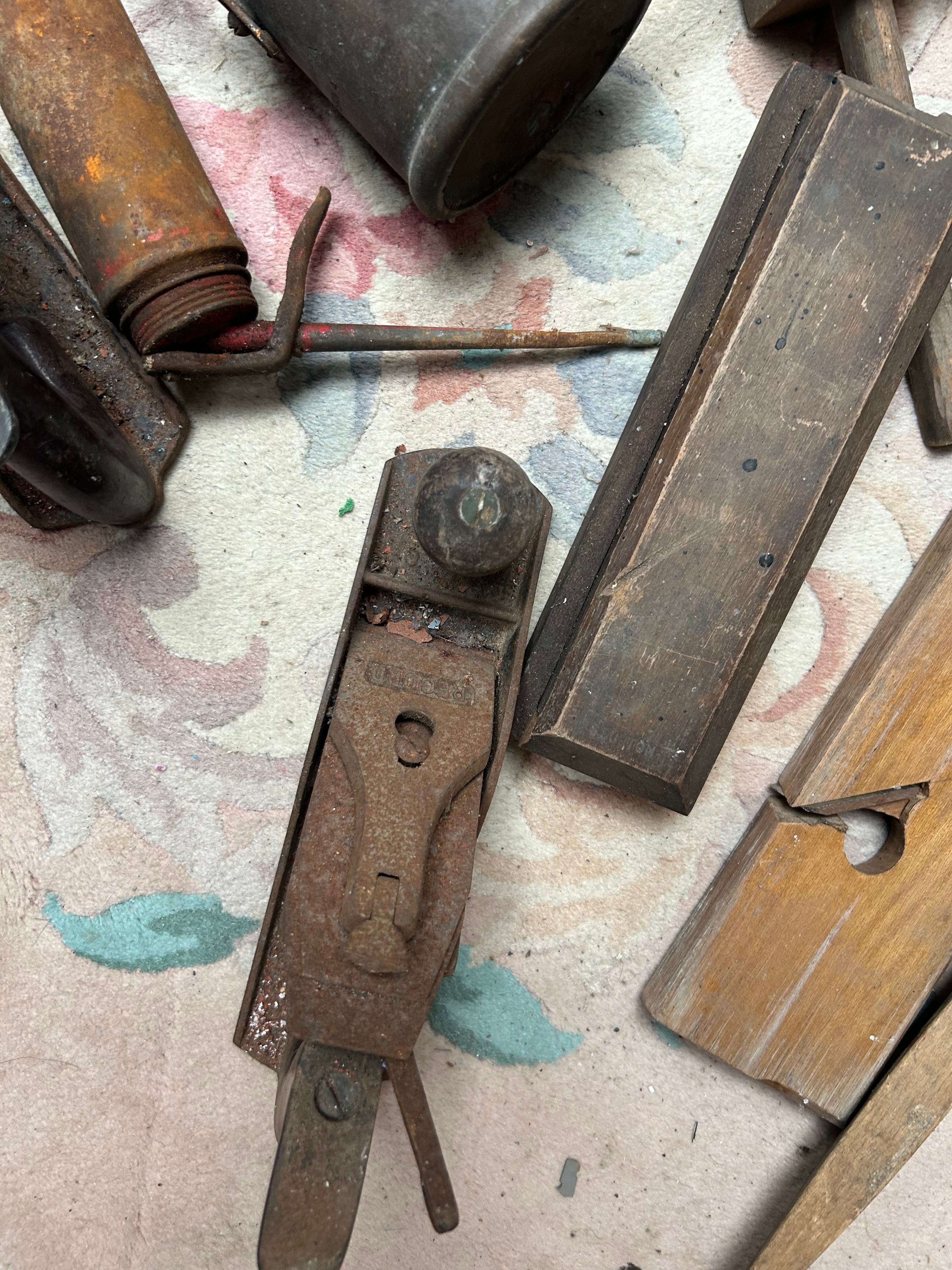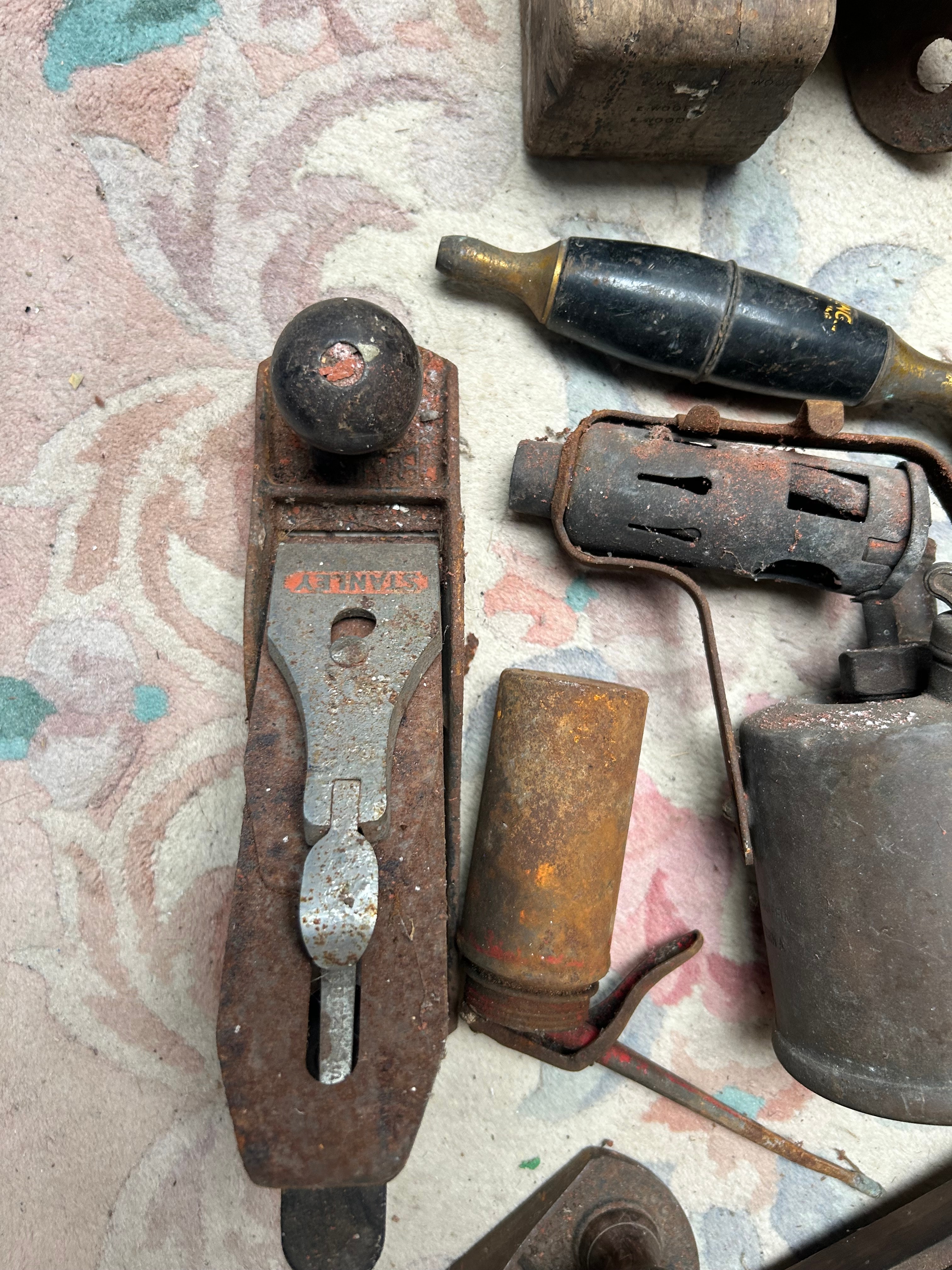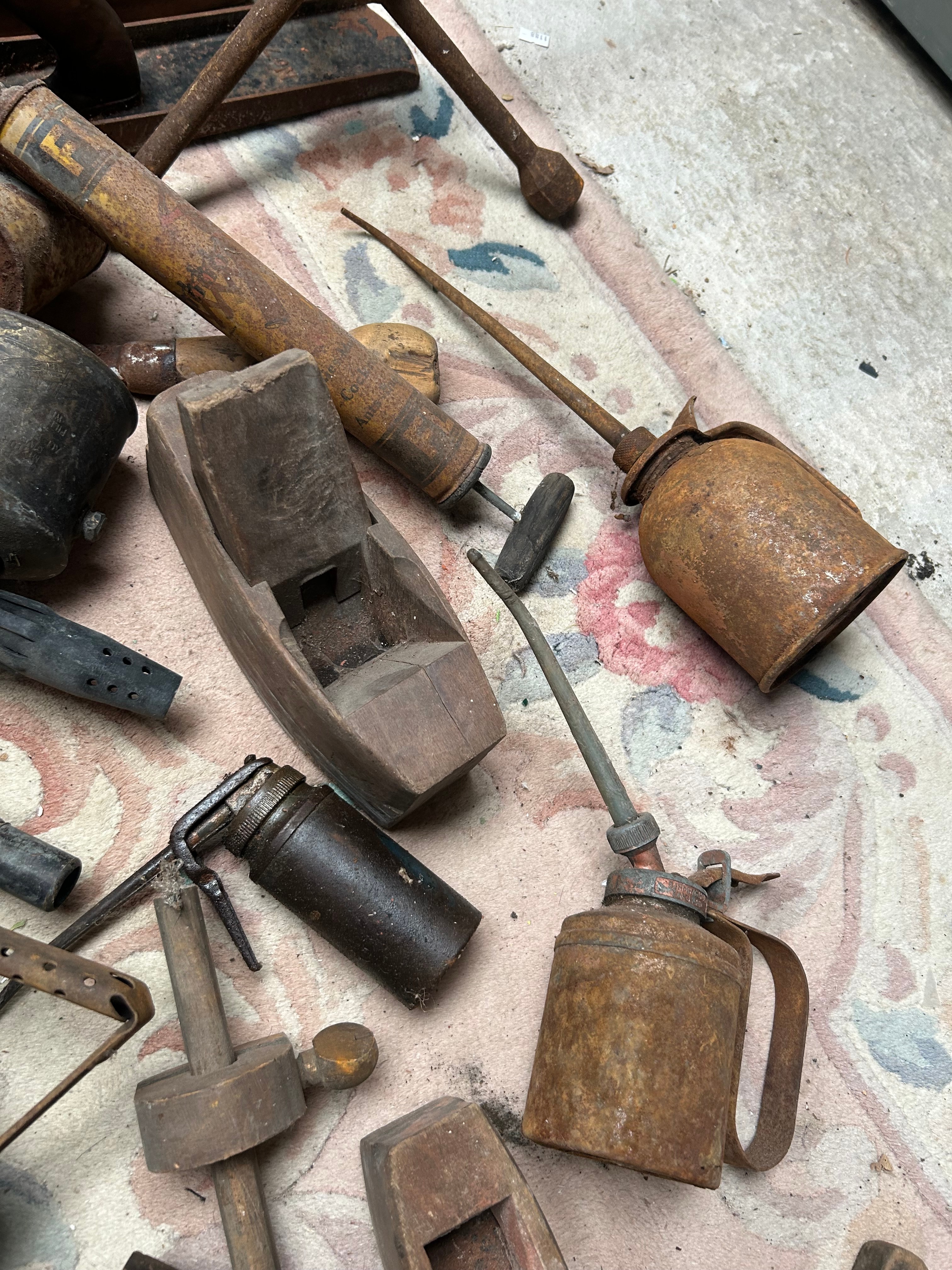 A diverse assortment of vintage hand tools, predominantly featuring woodworking planes of various types, including large wooden examples and several metal-bodied planes. The collection also comprises multiple brass and steel blow torches or soldering irons, several metal oil cans, and other workshop implements such as a large iron “spider” wrench and a wooden marking gauge. Materials primarily consist of wood, cast iron, steel, and brass. Visible markings include “STANLEY” on some plane irons, “PATENT,” and “COLEMAN FUEL” on a yellow-capped cylindrical container. The items are consistent with those likely dating from the late 19th to mid-20th century.