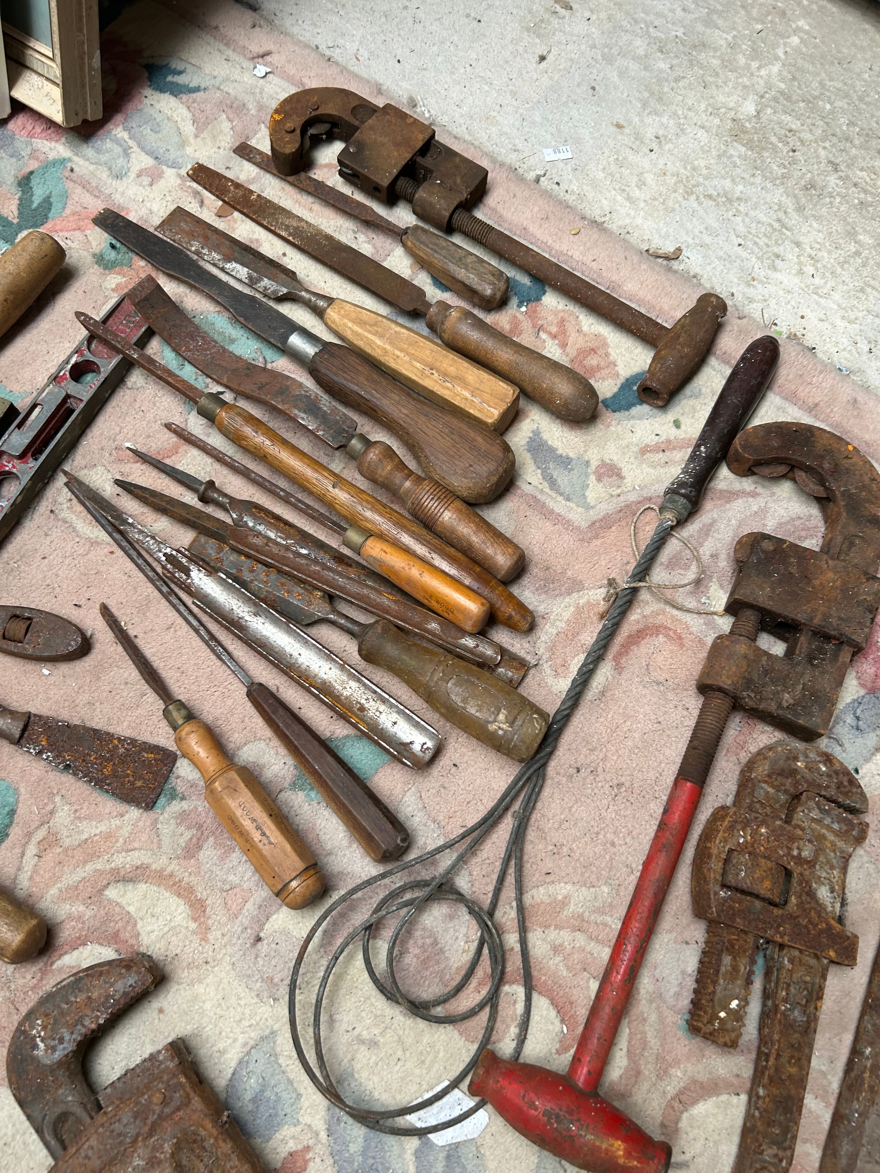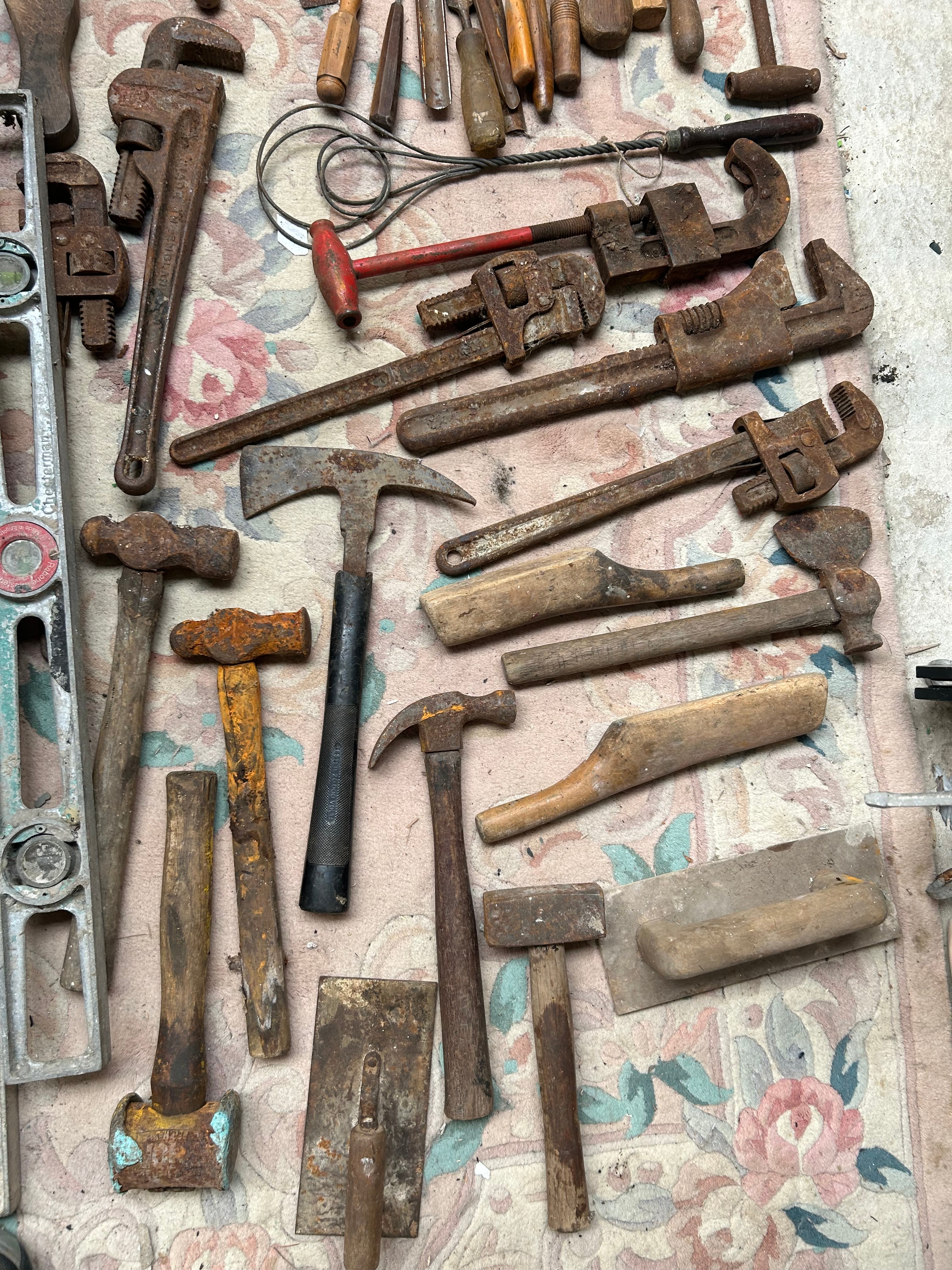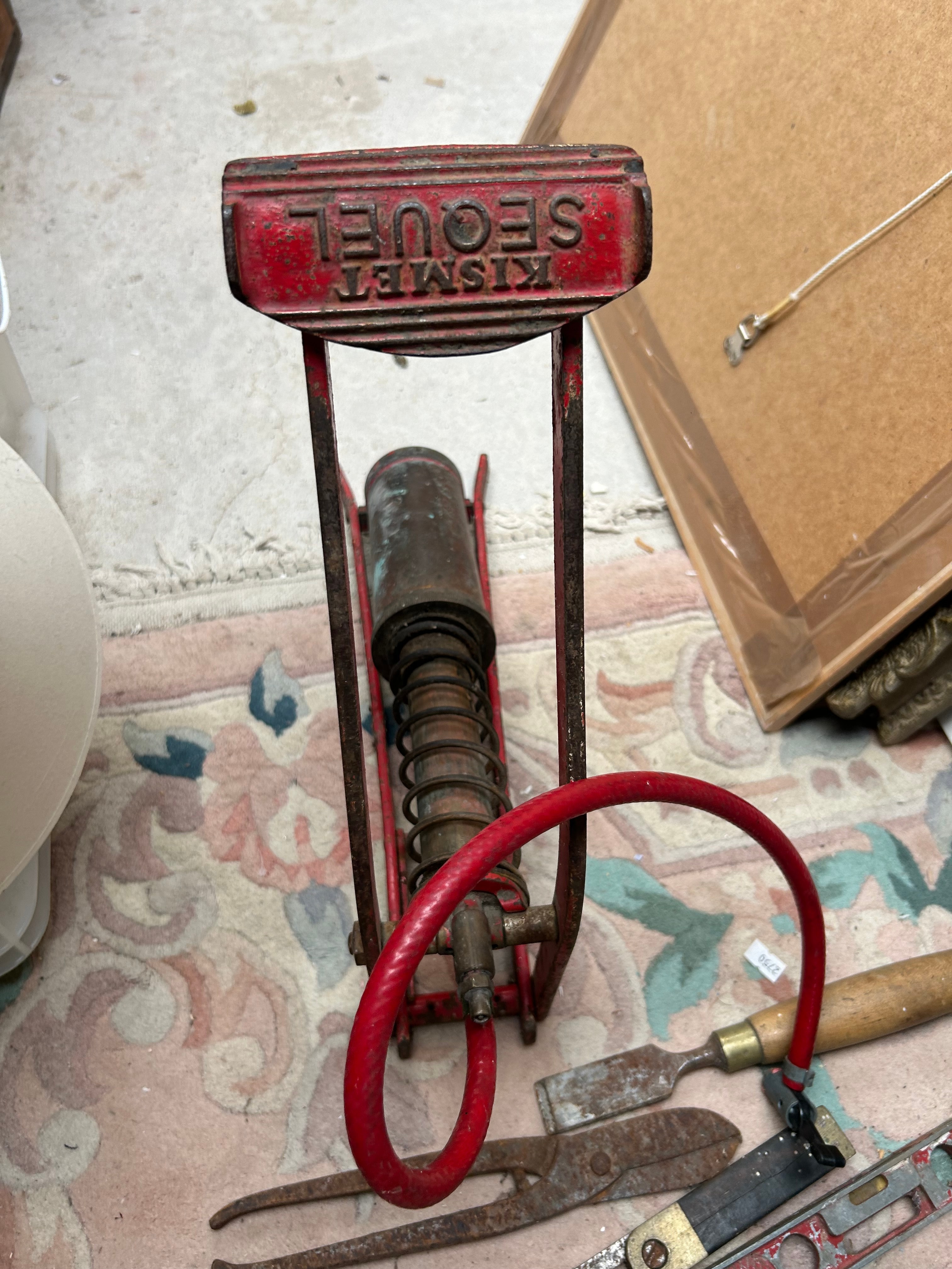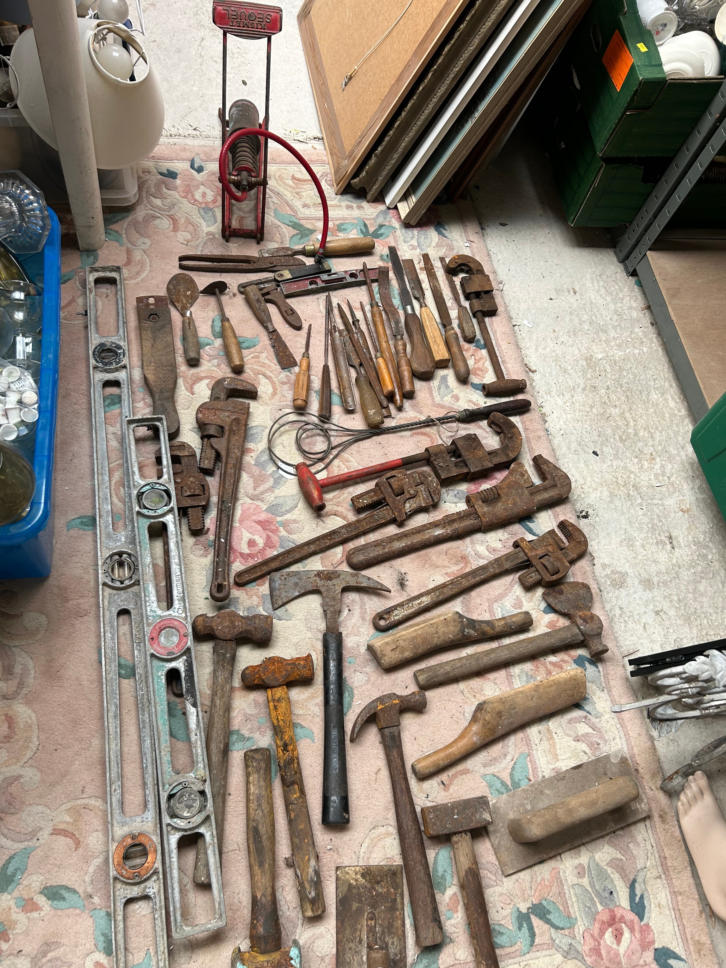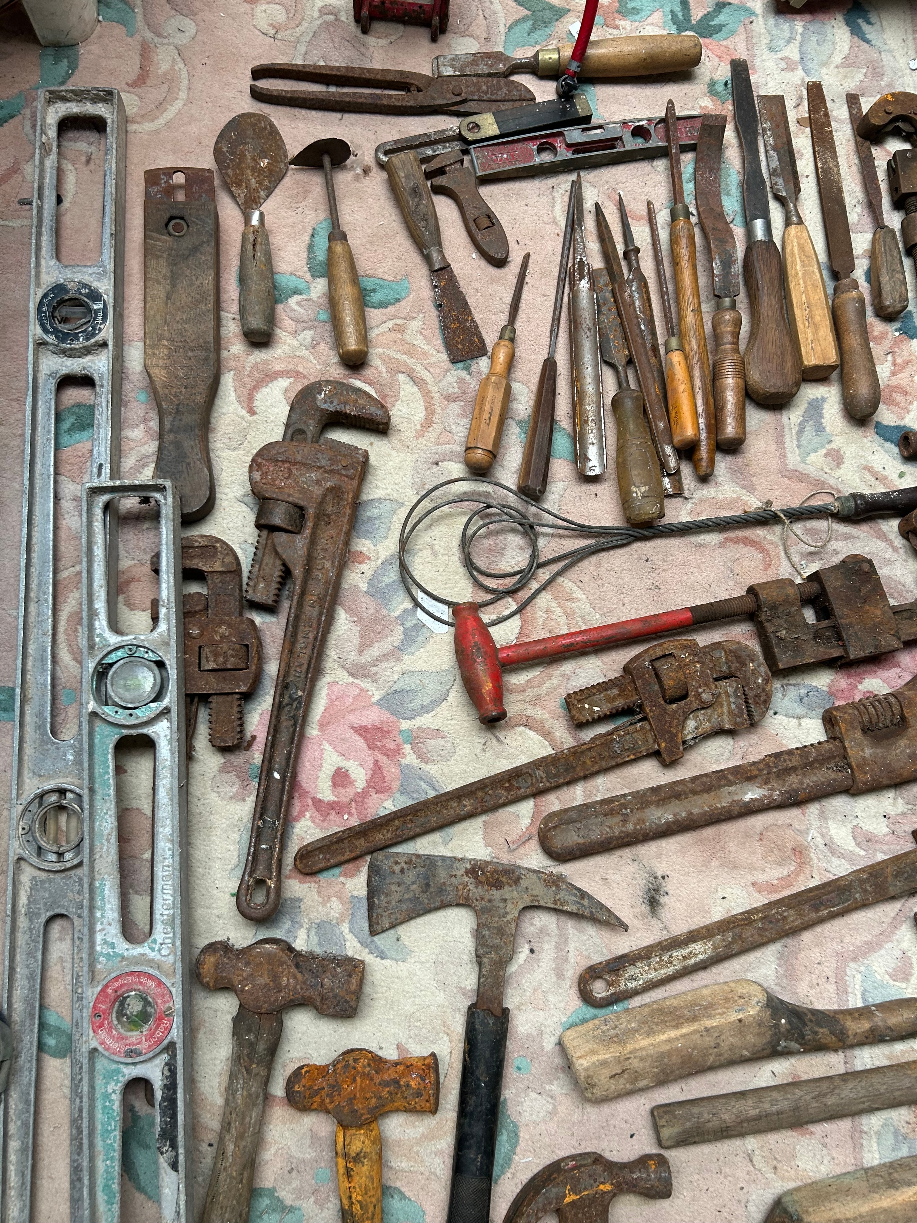 A collection of approximately 50-60 vintage to antique hand tools. The lot comprises predominantly iron or steel tools with wooden handles, including multiple large pipe wrenches, various hammers (such as claw, ball-peen, and masonry types), a selection of woodworking chisels and gouges, screwdrivers, and trowels. Also present are several aluminum or steel spirit levels. A distinct red-painted metal foot pump with a red rubber hose is included, bearing the prominent inscription “KISMET SEQUEL” on its foot pedal.