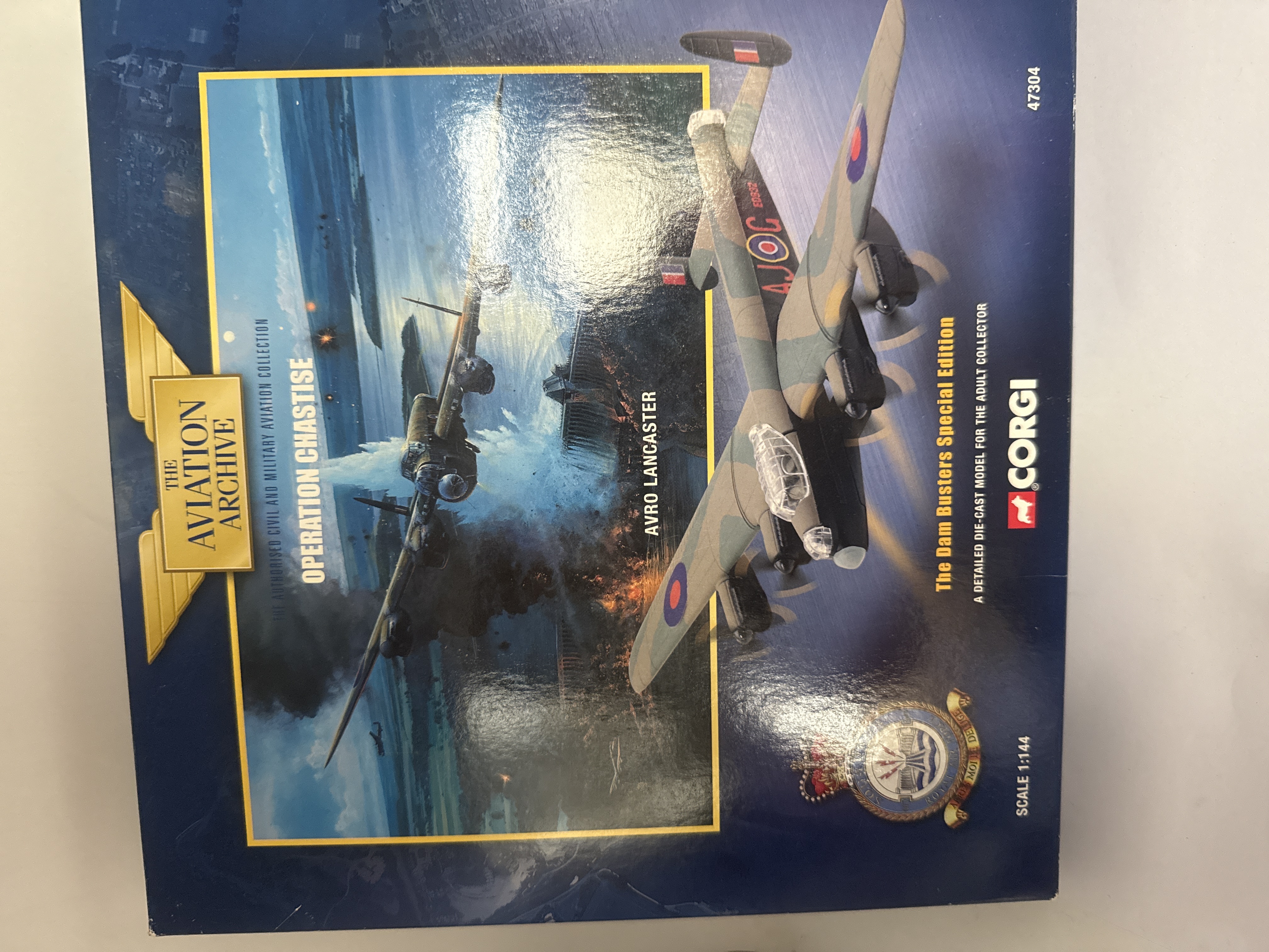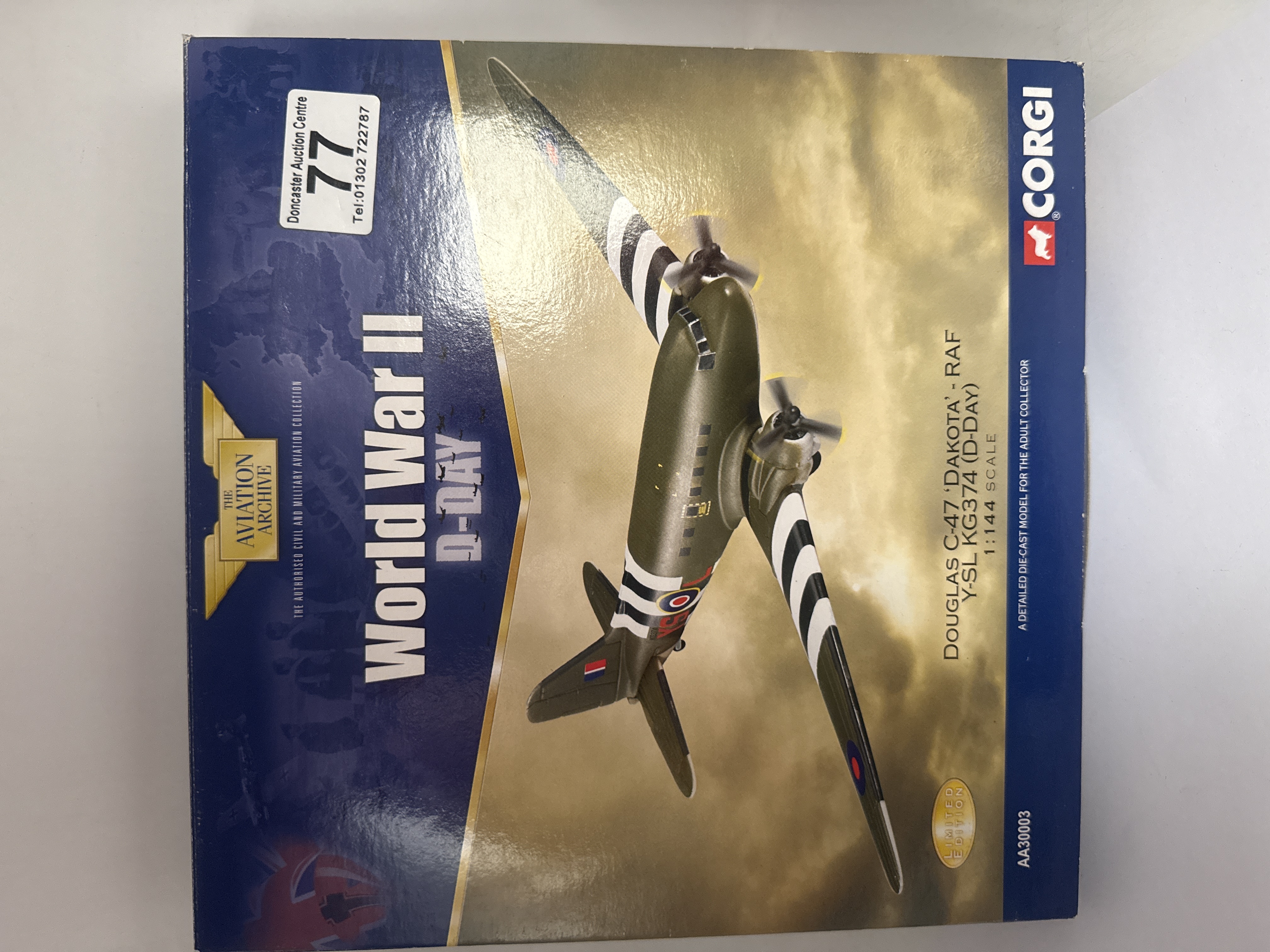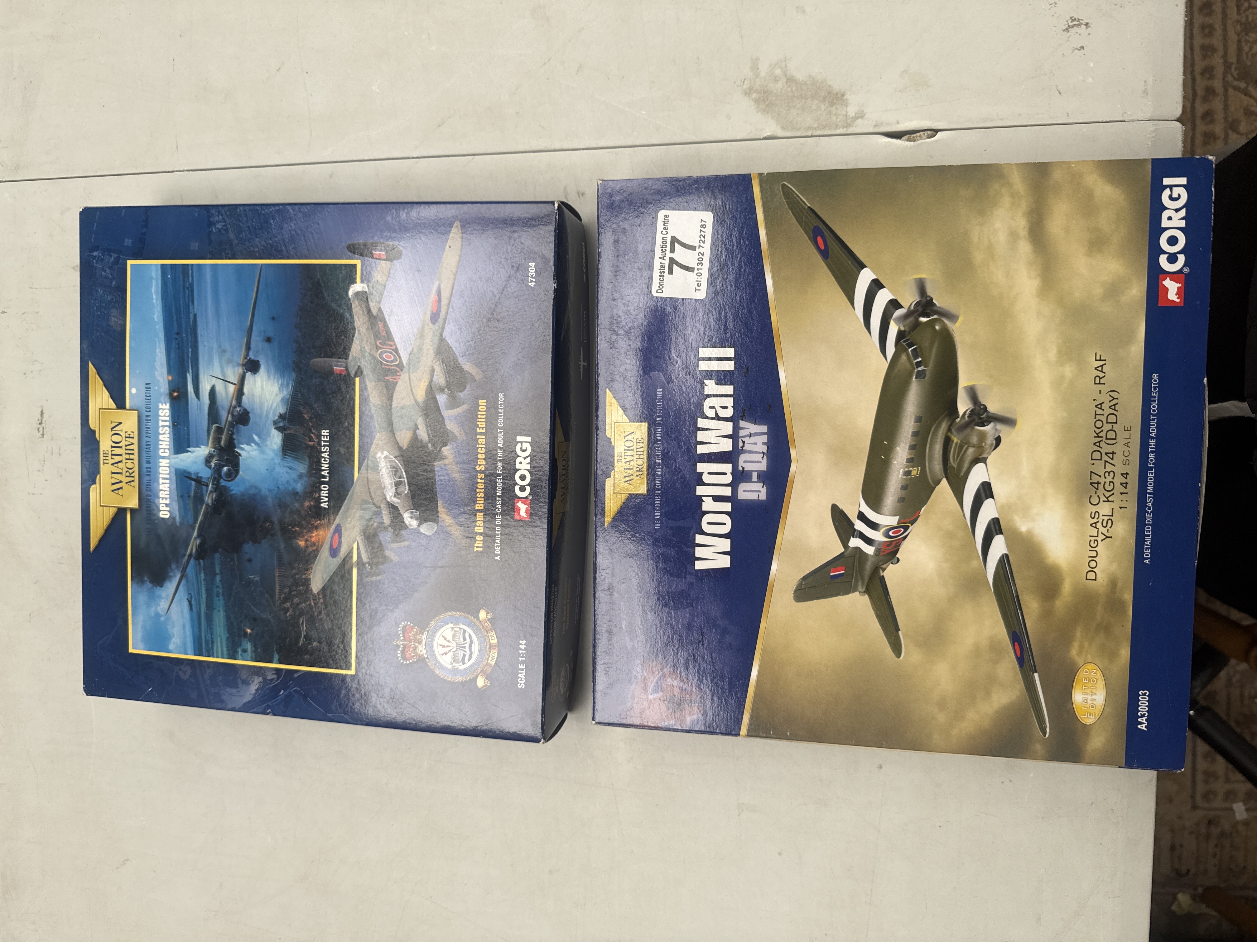 A pair of Corgi ‘The Aviation Archive’ die-cast military aircraft models, presented in their original cardboard packaging. The first model is a Douglas C-47 ‘Dakota’ RAF, identified as ‘Y-SL KG374’ from the ‘World War II D-Day’ series, marked as a ‘Limited Edition’ and depicting invasion stripes. The second model is an Avro Lancaster, titled ‘Operation Chastise’ and ‘The Dam Busters Special Edition,’ displaying a Royal Air Force crest and the aircraft identification ‘AJOC ED932.’ Both models are 1:144 scale and described on the packaging as ‘A detailed die-cast model for the adult collector.’