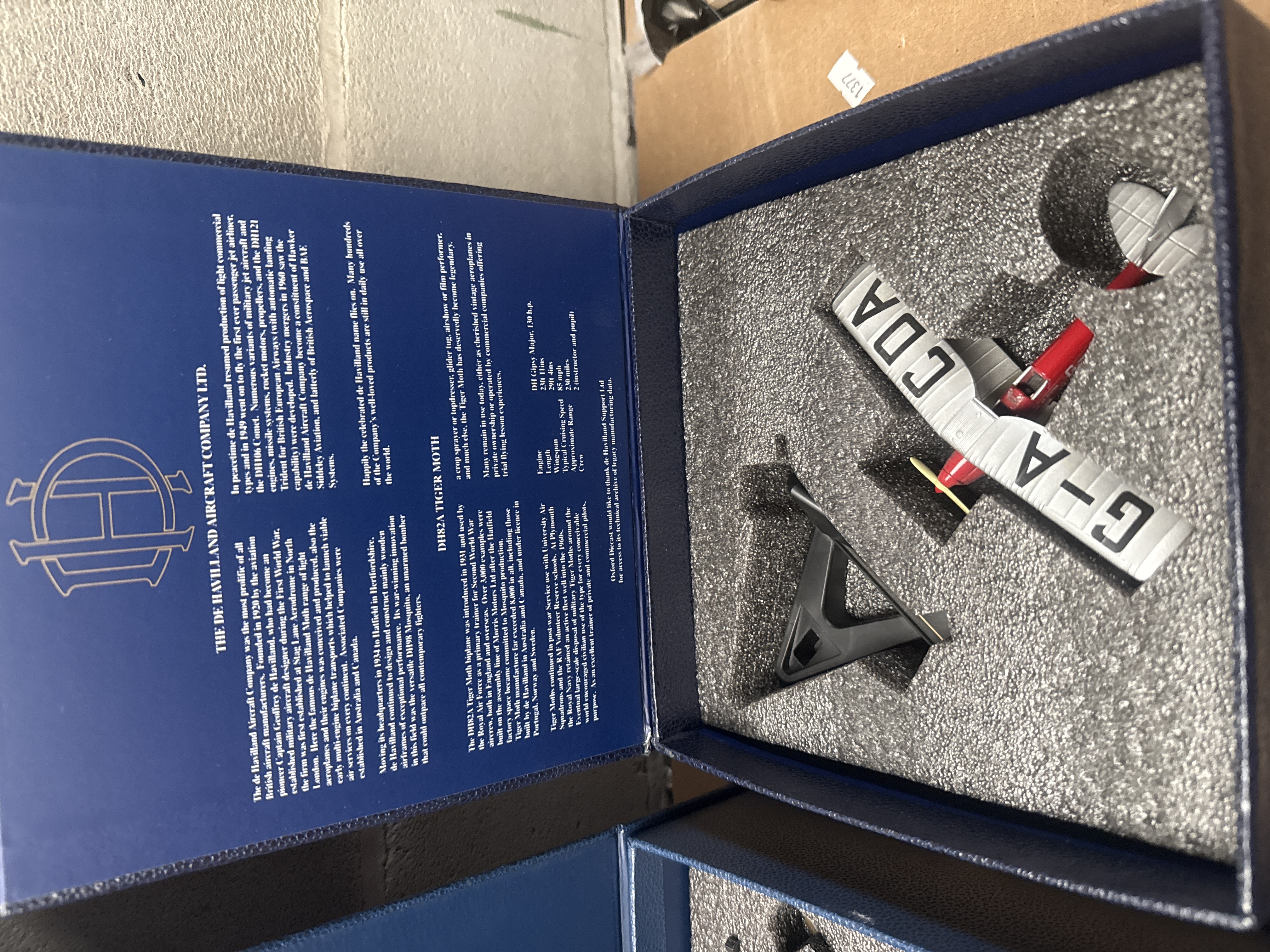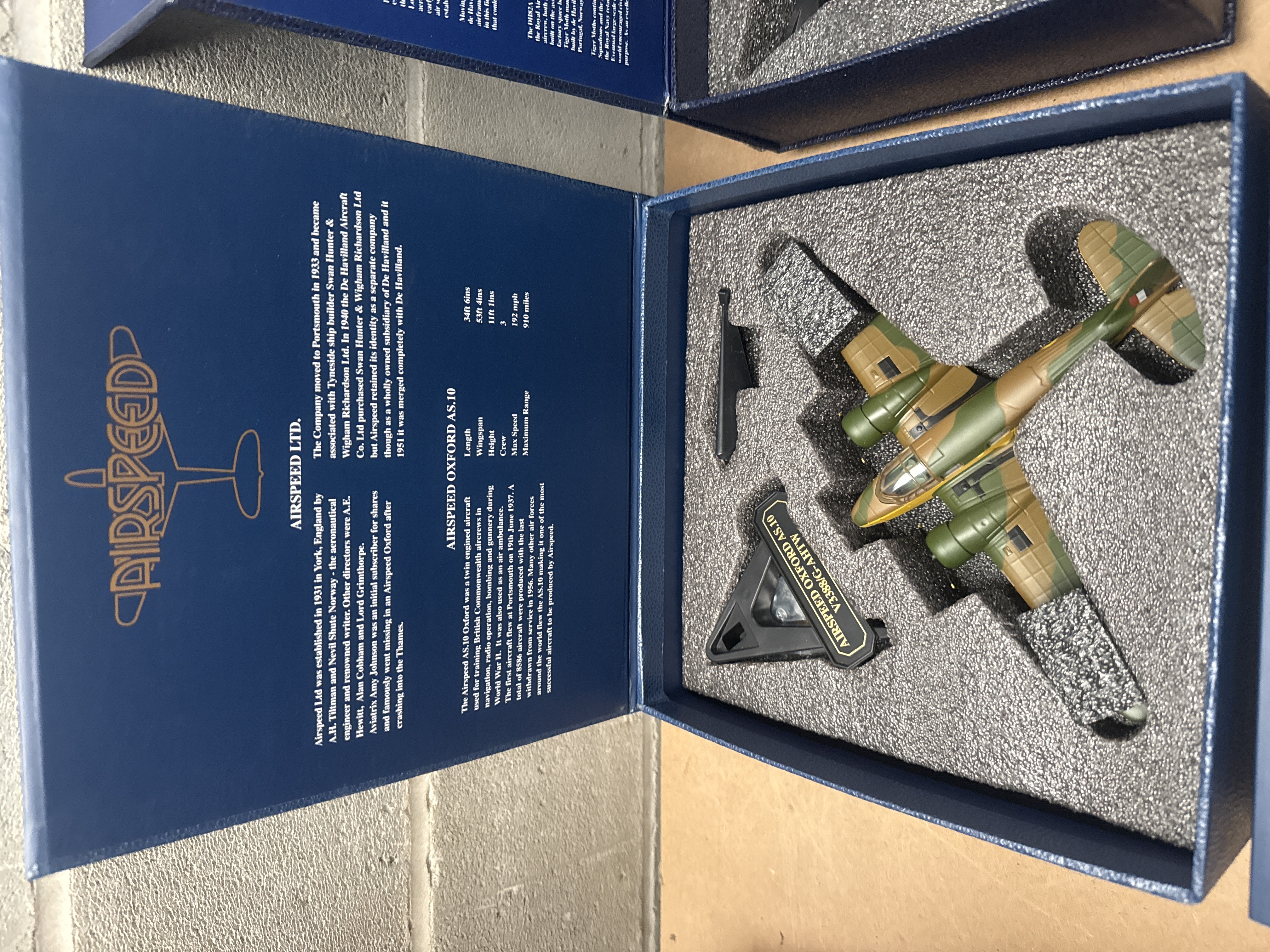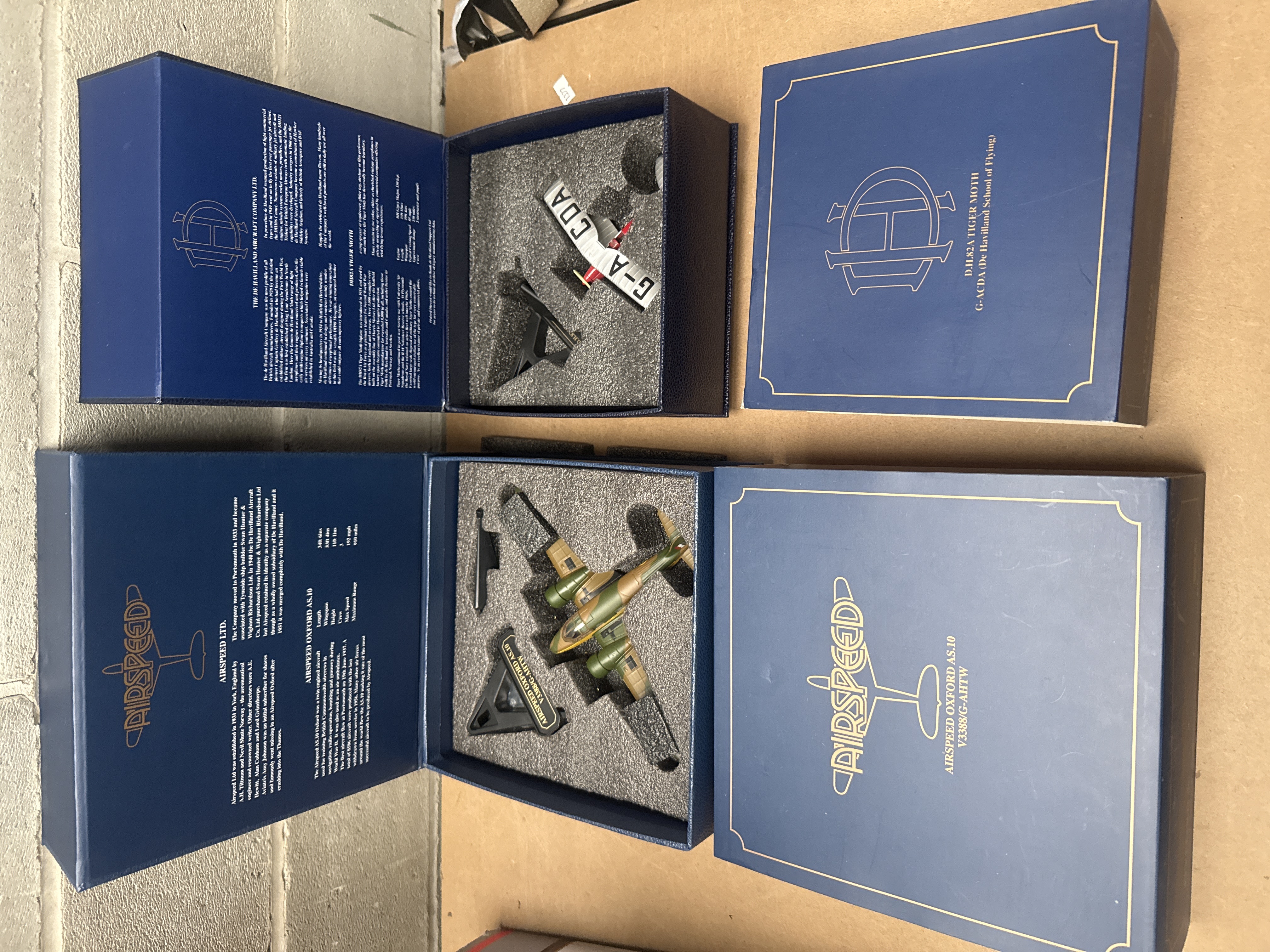 A pair of Oxford Diecast 1:72 scale die-cast model aircraft. Each model is presented in a dark blue commemorative-style box with gold-foiled text and logos. The first model is an Airspeed Oxford AS.10, painted in a camouflage scheme (green, brown, grey) and marked “V3388/G-AHTW” on its display stand. The second model is a De Havilland DH.82A Tiger Moth biplane, predominantly white with red accents and “G-A CDA” visible on its wings, designated for the “De Havilland School of Flying”. Both models are secured within custom-fitted foam inserts and include black display stands. The box lids feature extensive English text providing historical context and specifications for each respective aircraft and manufacturer (Airspeed Ltd. and The De Havilland Aircraft Company Ltd.).