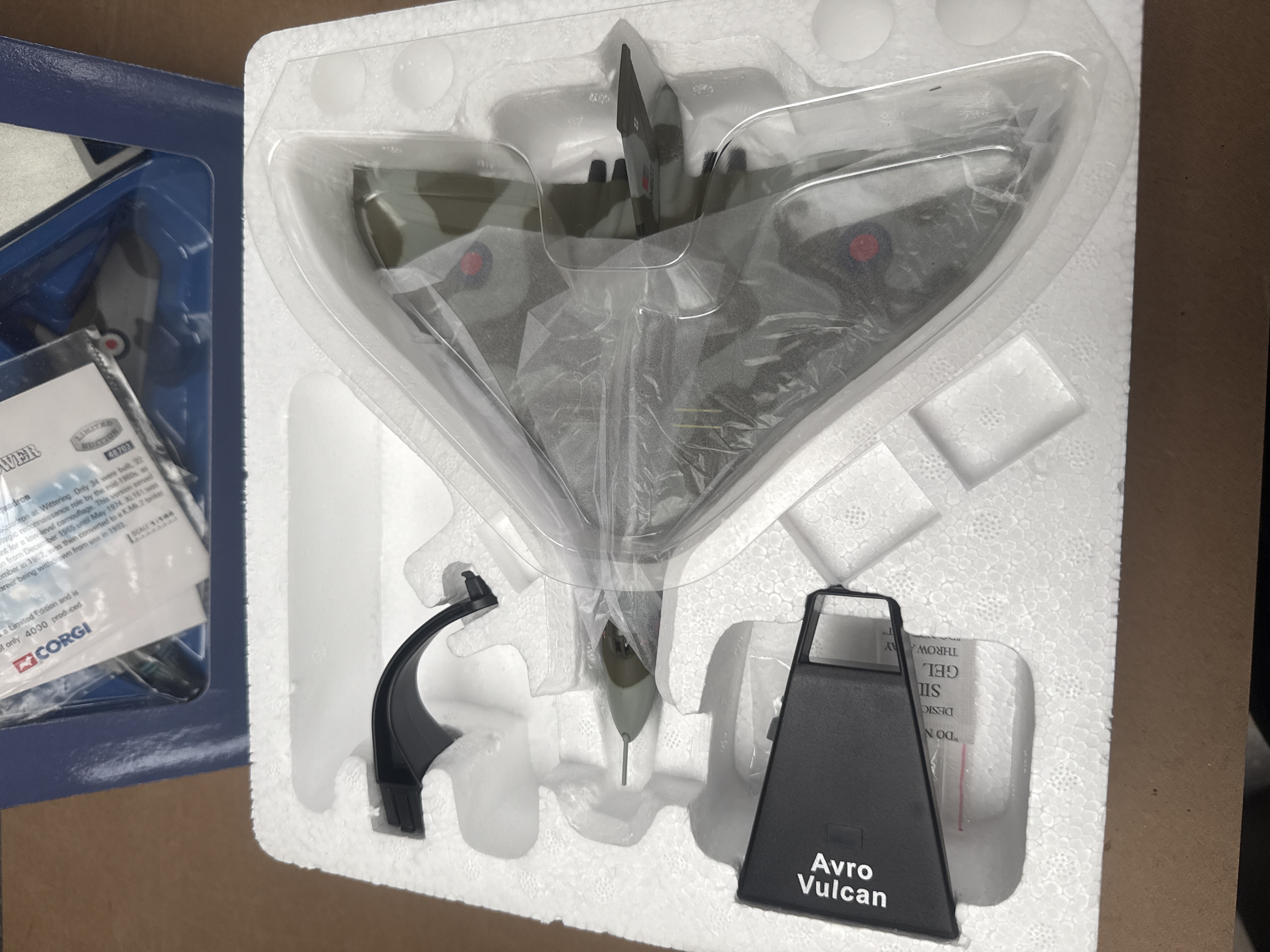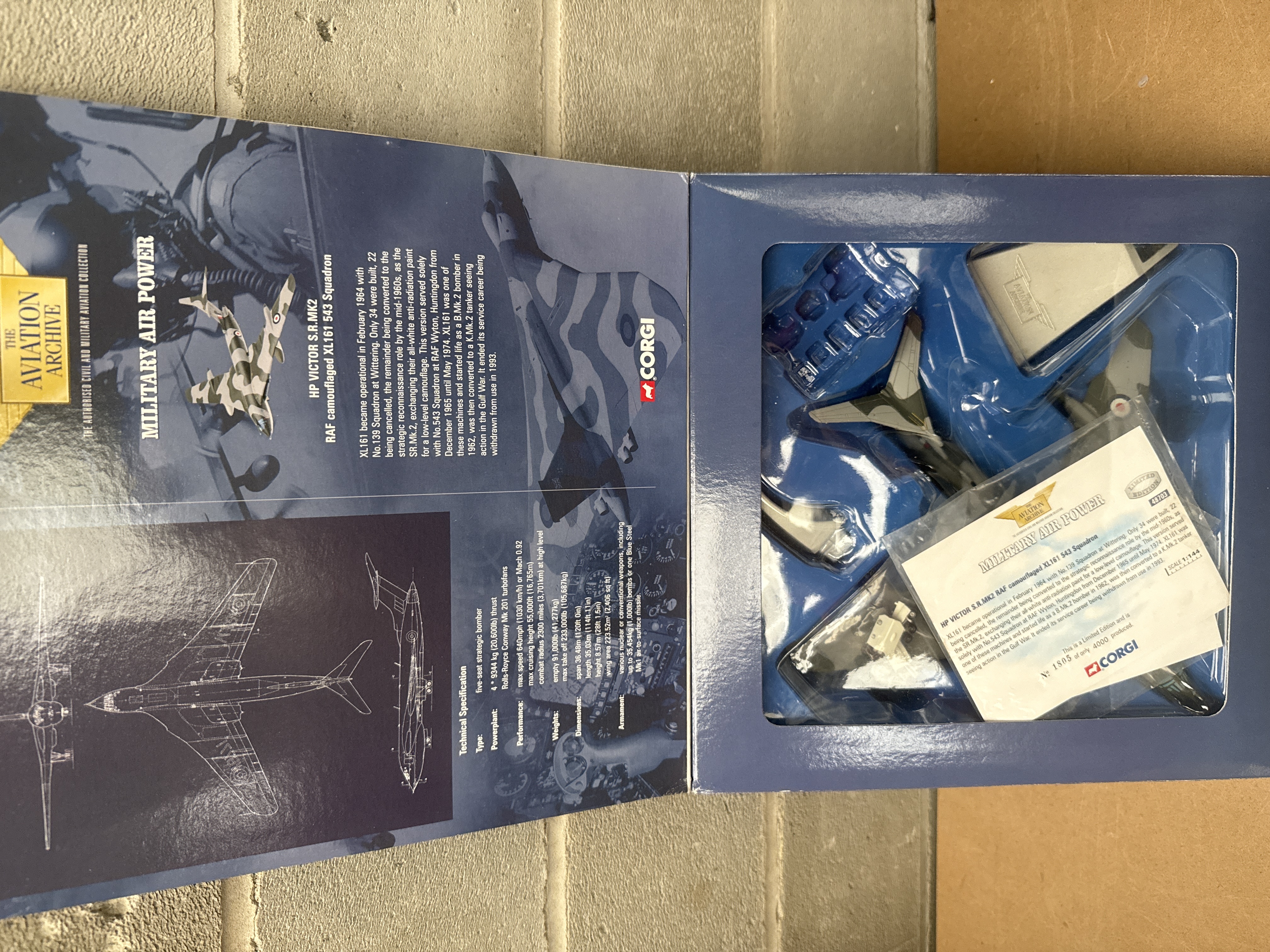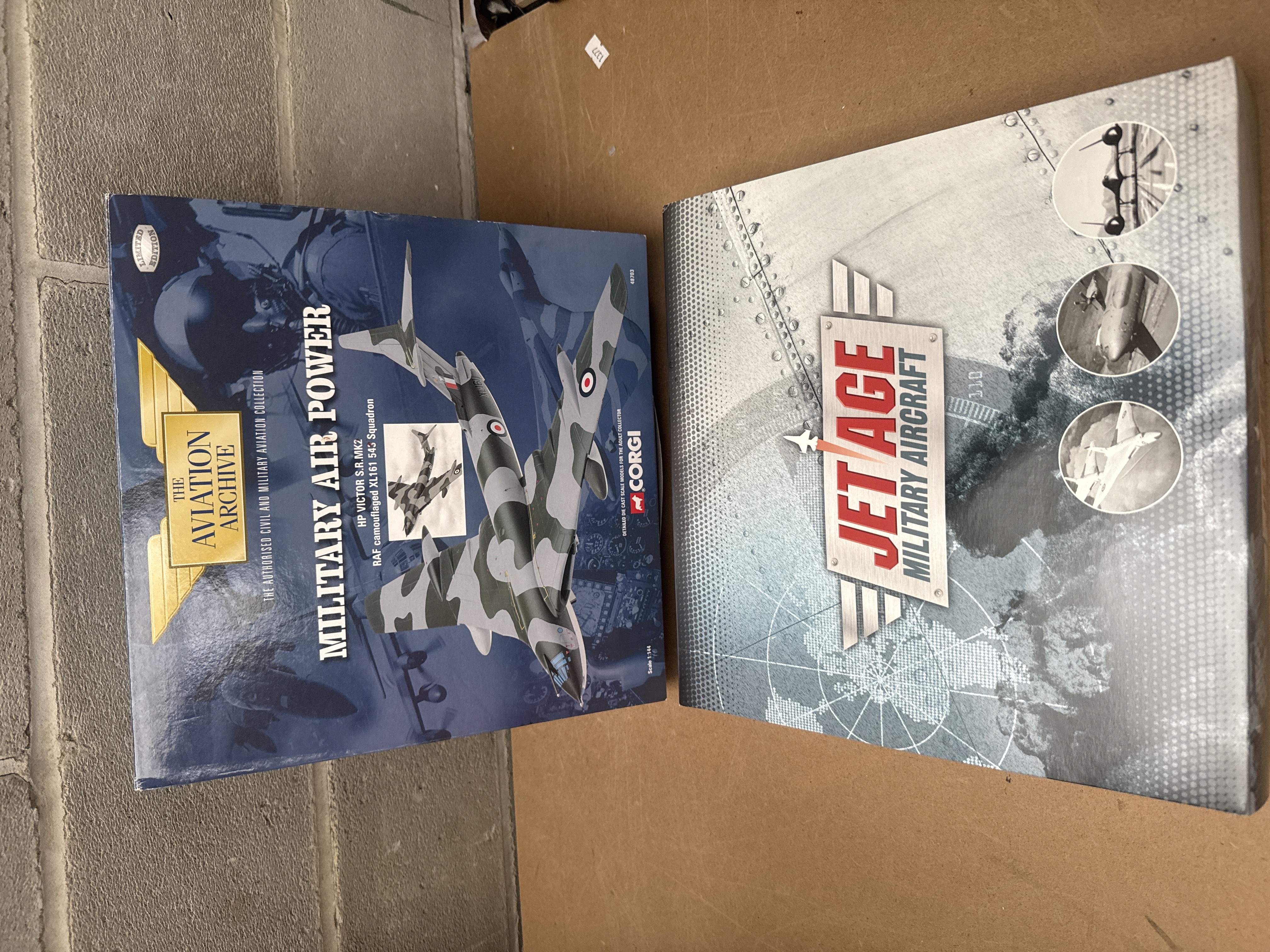 A collection of three items, comprising two Corgi “The Aviation Archive: Military Air Power” die-cast model aircraft and one publication. The first model is a Corgi 48703 Handley Page Victor S.R.MK2 RAF Camouflaged XL161 543 Squadron bomber, scaled at 1:144. It is presented in its original blue box with visible technical specifications in English, the model secured within a blue plastic insert. The second model is a camouflaged delta-wing Avro Vulcan bomber, also from “The Aviation Archive: Military Air Power” series, presented in clear plastic within a white styrofoam insert, complete with a black display stand explicitly marked “Avro Vulcan”. Both aircraft models represent British military jet bombers from the Cold War era. The accompanying publication is a softcover book or large magazine titled “JET AGE MILITARY AIRCRAFT” with a stylized metal-look cover.