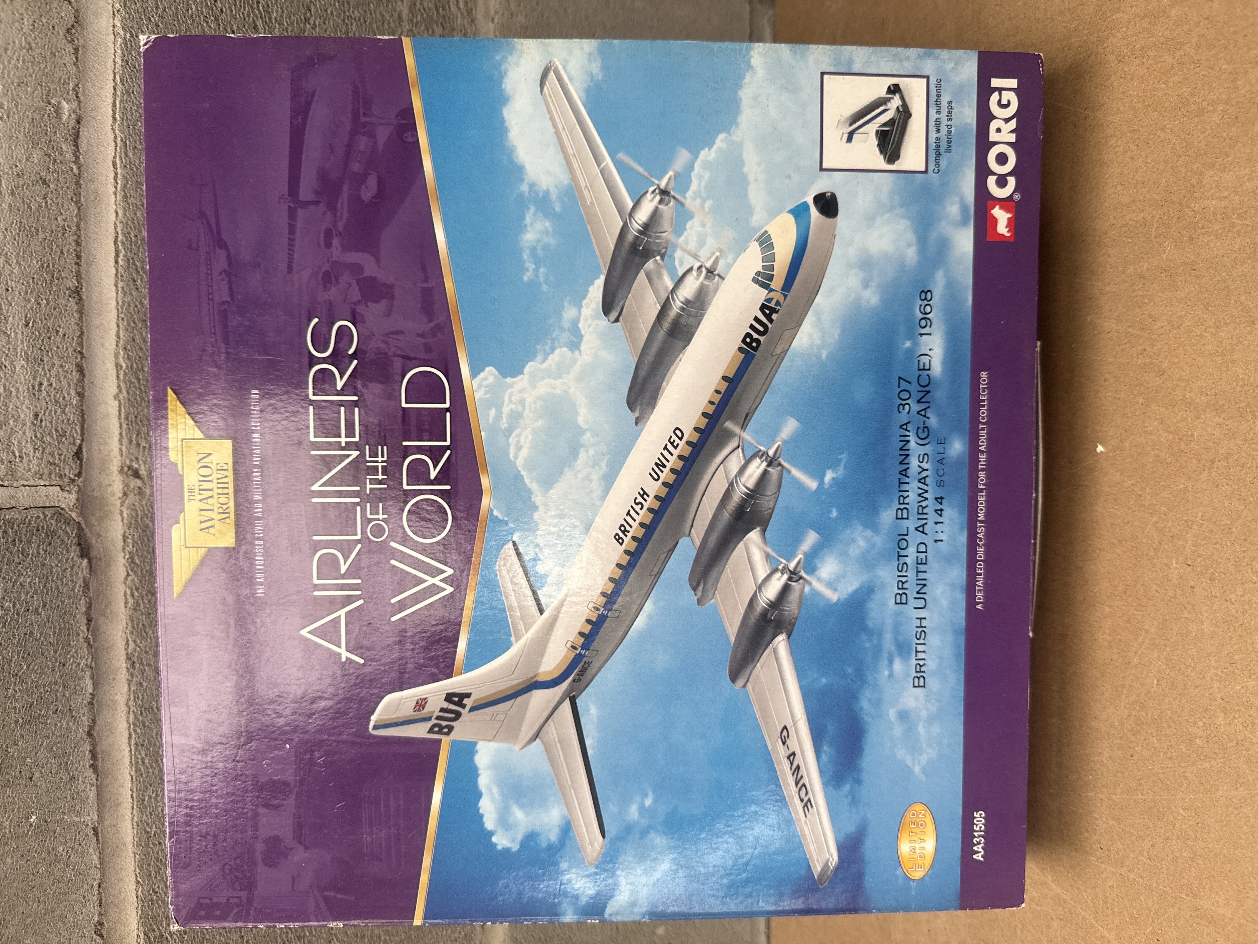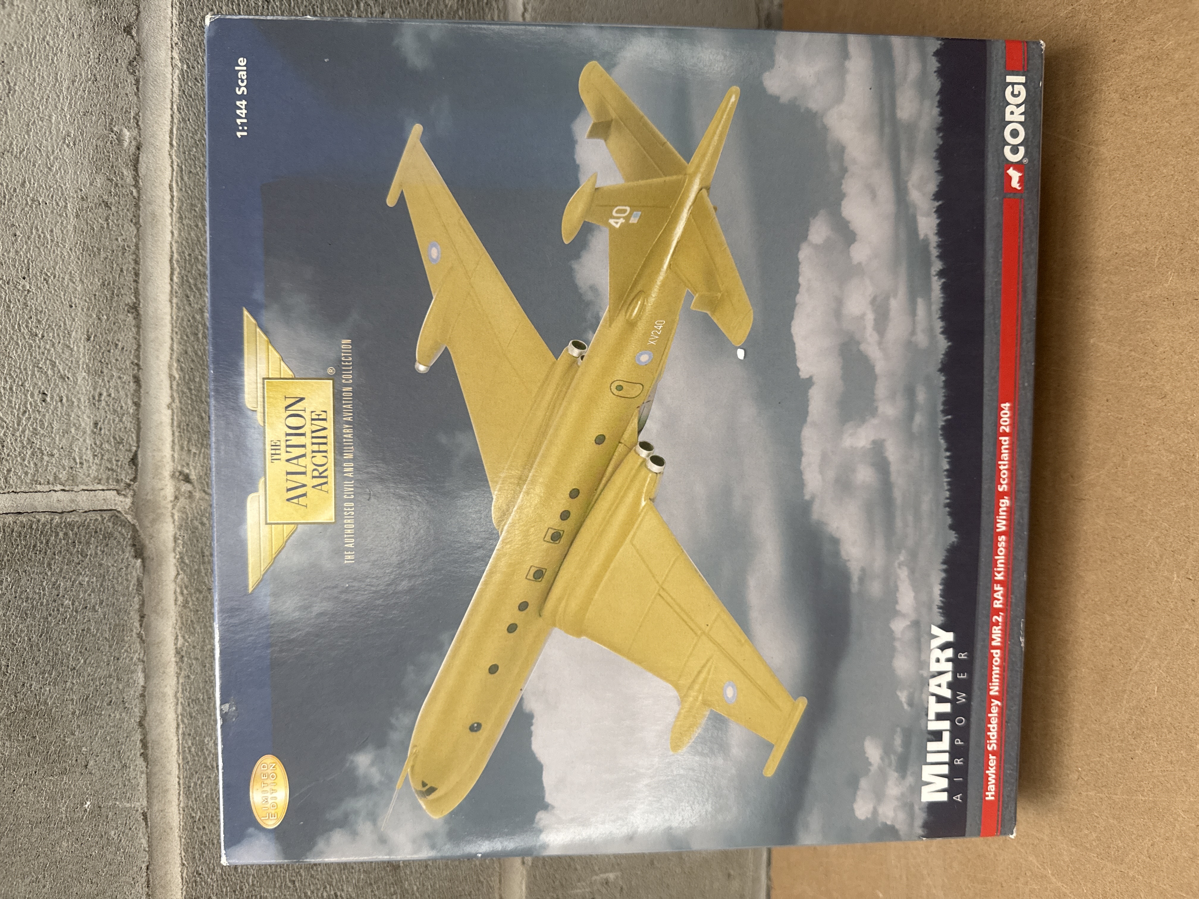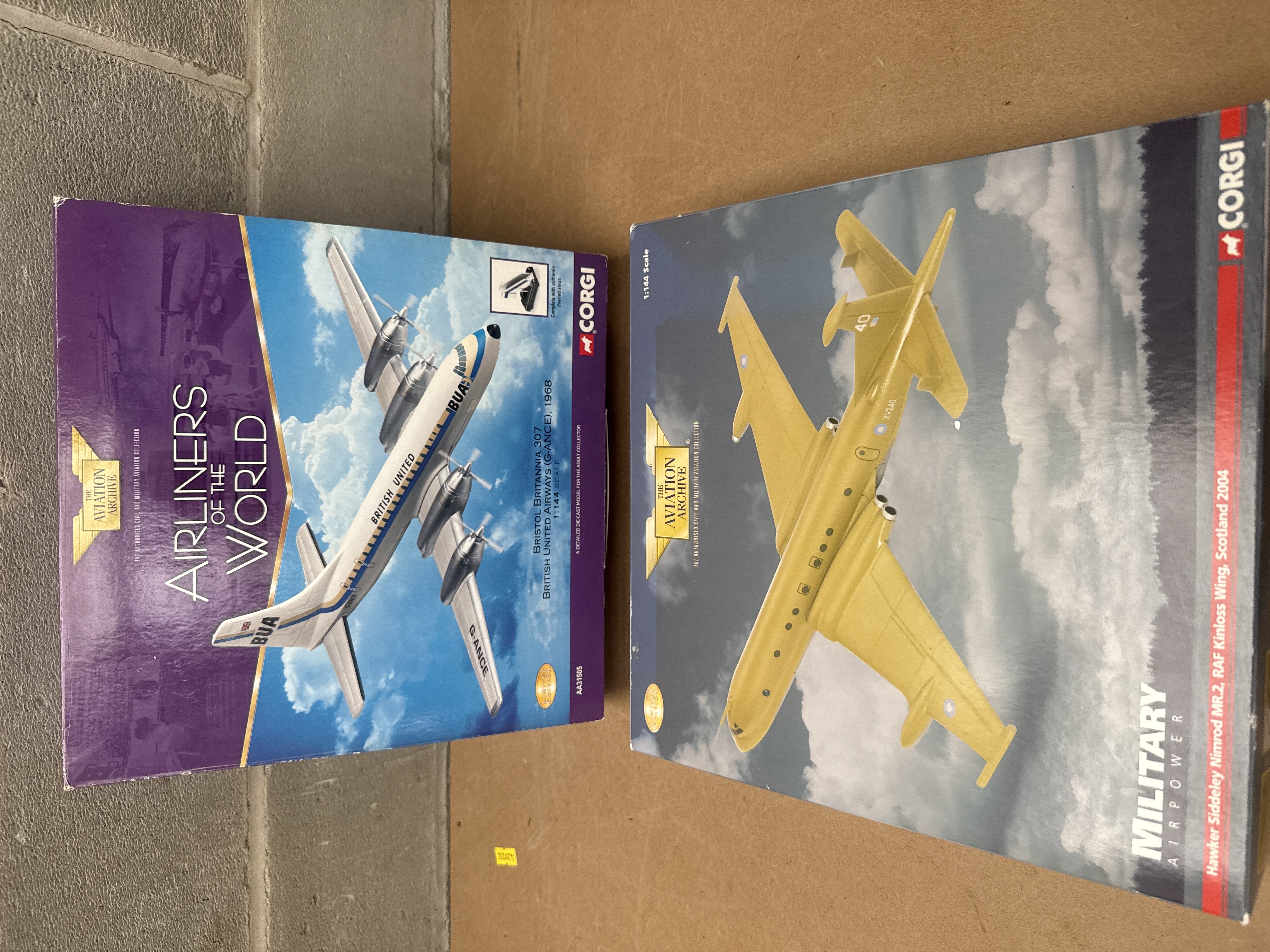A pair of Corgi “The Aviation Archive” die-cast model airplanes, both 1:144 Scale and presented in their original packaging. The first model, identified through web consensus as a Corgi AA35601 Hawker Siddeley Nimrod MR.2, represents the RAF Kinloss Wing, Scotland 2004, and features visible tail markings ’40’ and ‘XV240’. The second model, from the “Airliners of the World” collection, is a Bristol Britannia 307 in British United Airways (G-ANCE) livery from 1968, marked AA31505. Both models are described as detailed die-cast models for adult collectors and are noted as “LIMITED EDITION” releases.