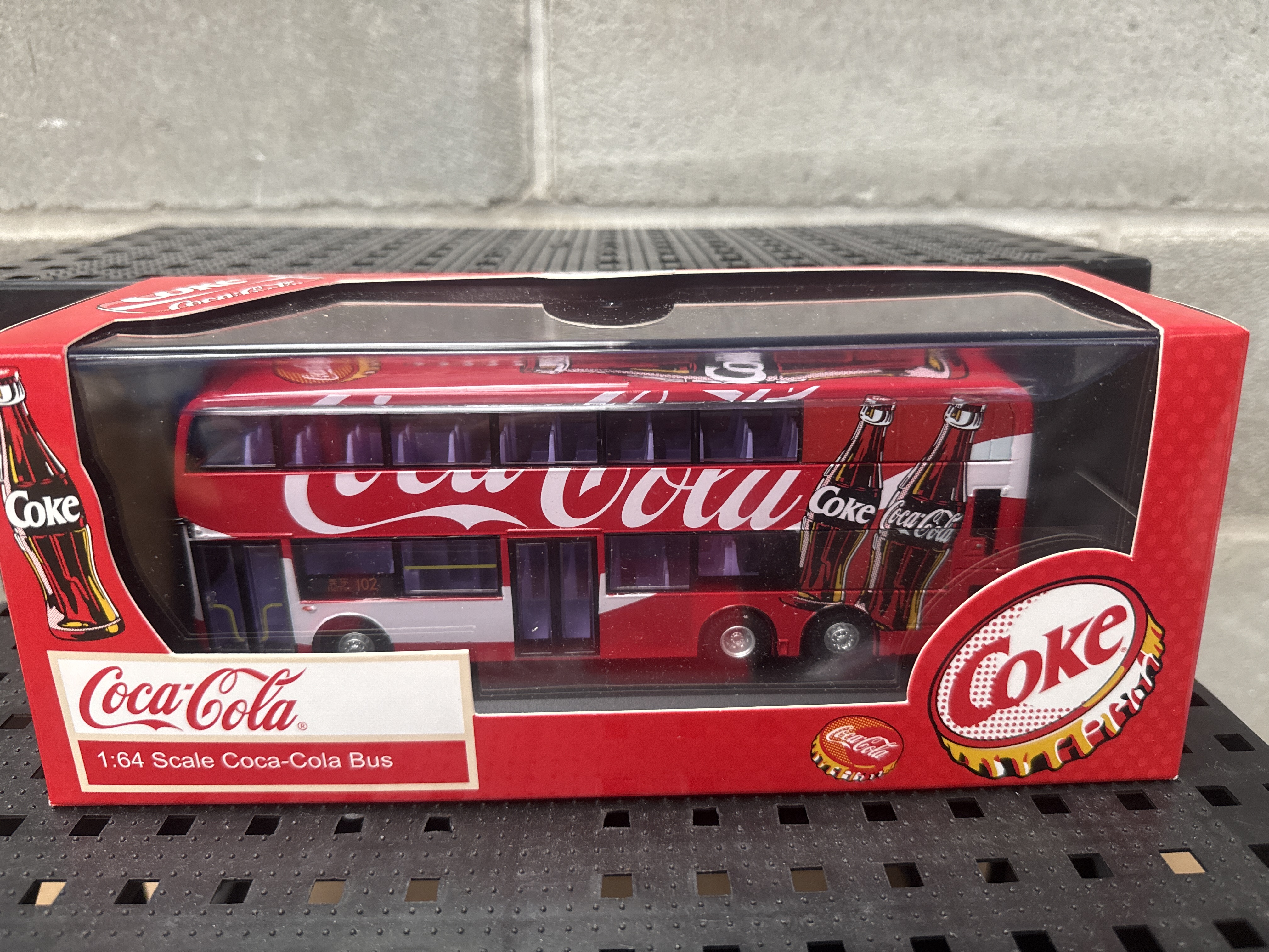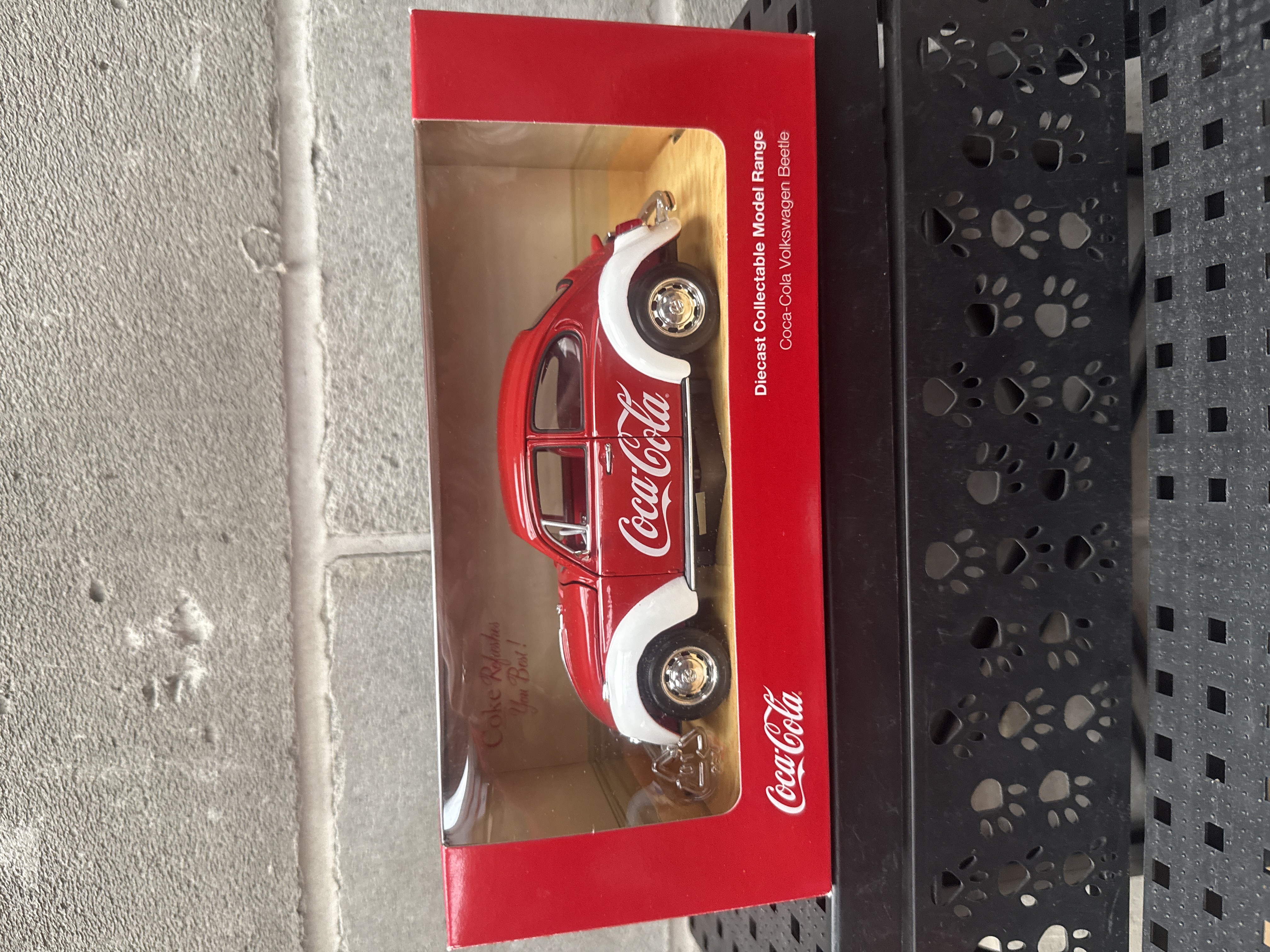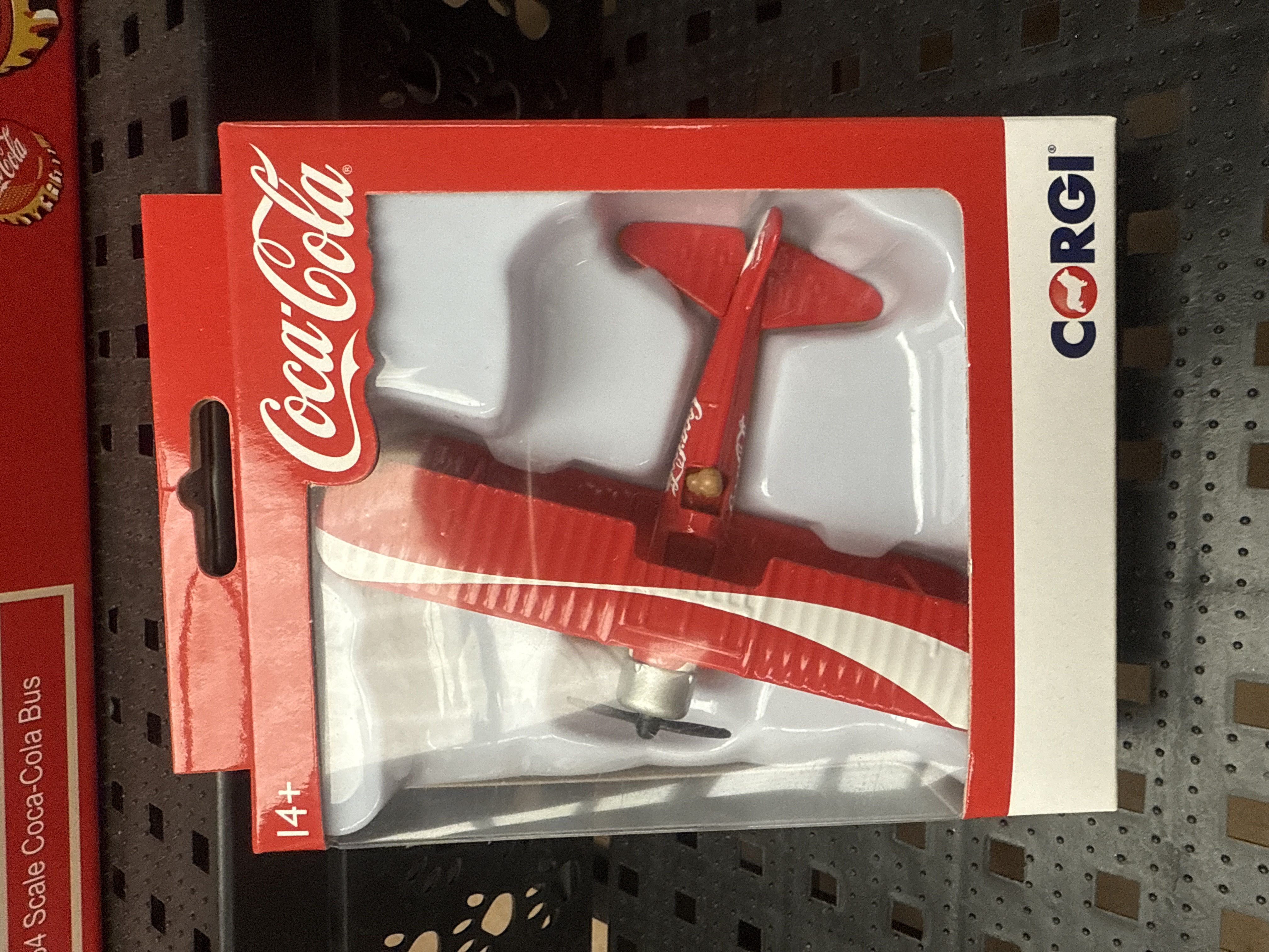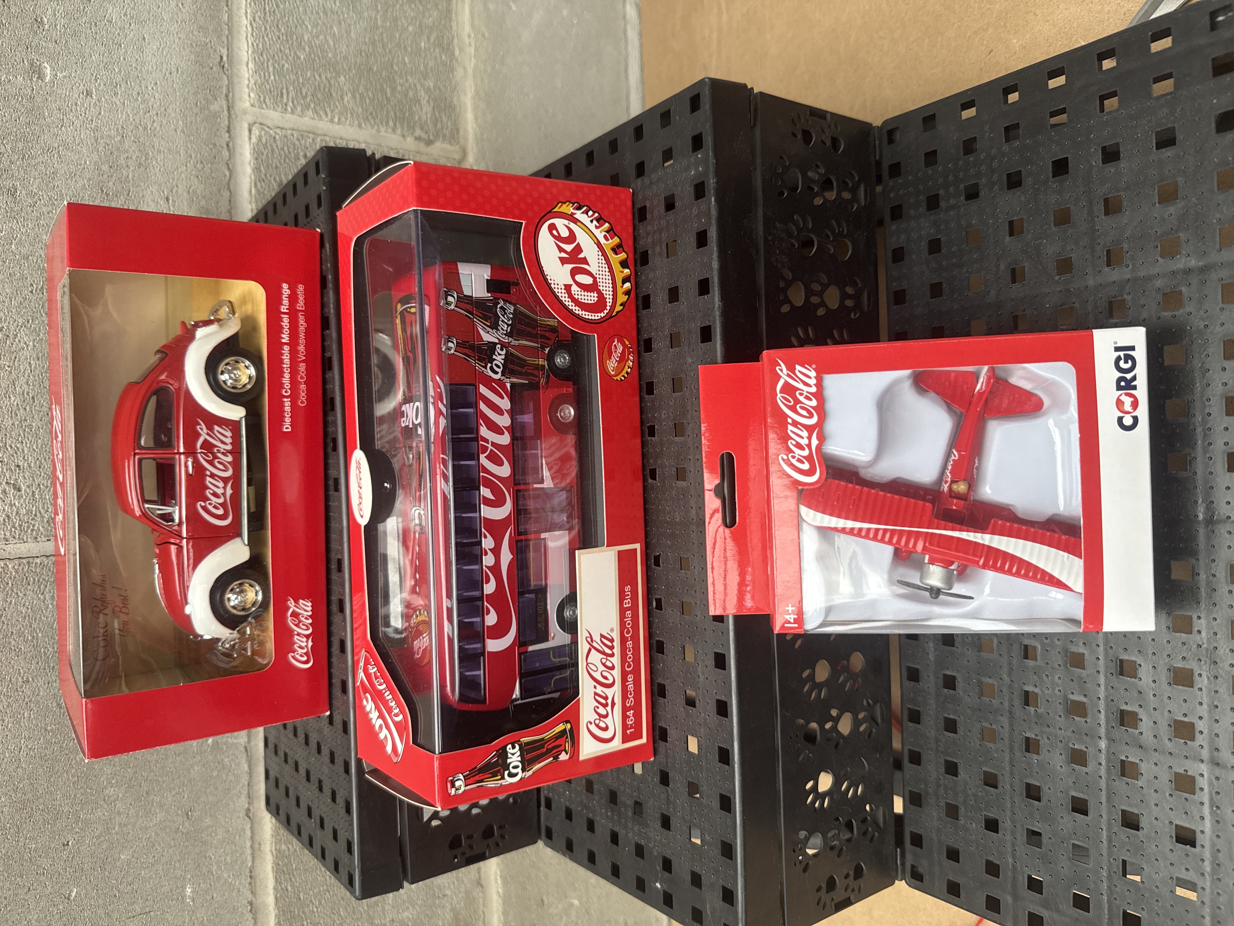 A collection of three new, boxed Coca-Cola branded die-cast model vehicles, each presented in its original red and white cardboard and clear plastic packaging. The lot includes a red and white Volkswagen Beetle, marked “Coca-Cola Volkswagen Beetle” with the vintage slogan “Coke Relishes Your Best!” visible inside the box. Also included is a 1:64 scale double-decker bus, featuring “Coca-Cola,” “Coke,” and “巴士 102” (Bus 102) on its side. The third item is a red and white biplane with “Enjoy Coca-Cola” on its wing, bearing the “Corgi” brand logo and a “14+” age rating.