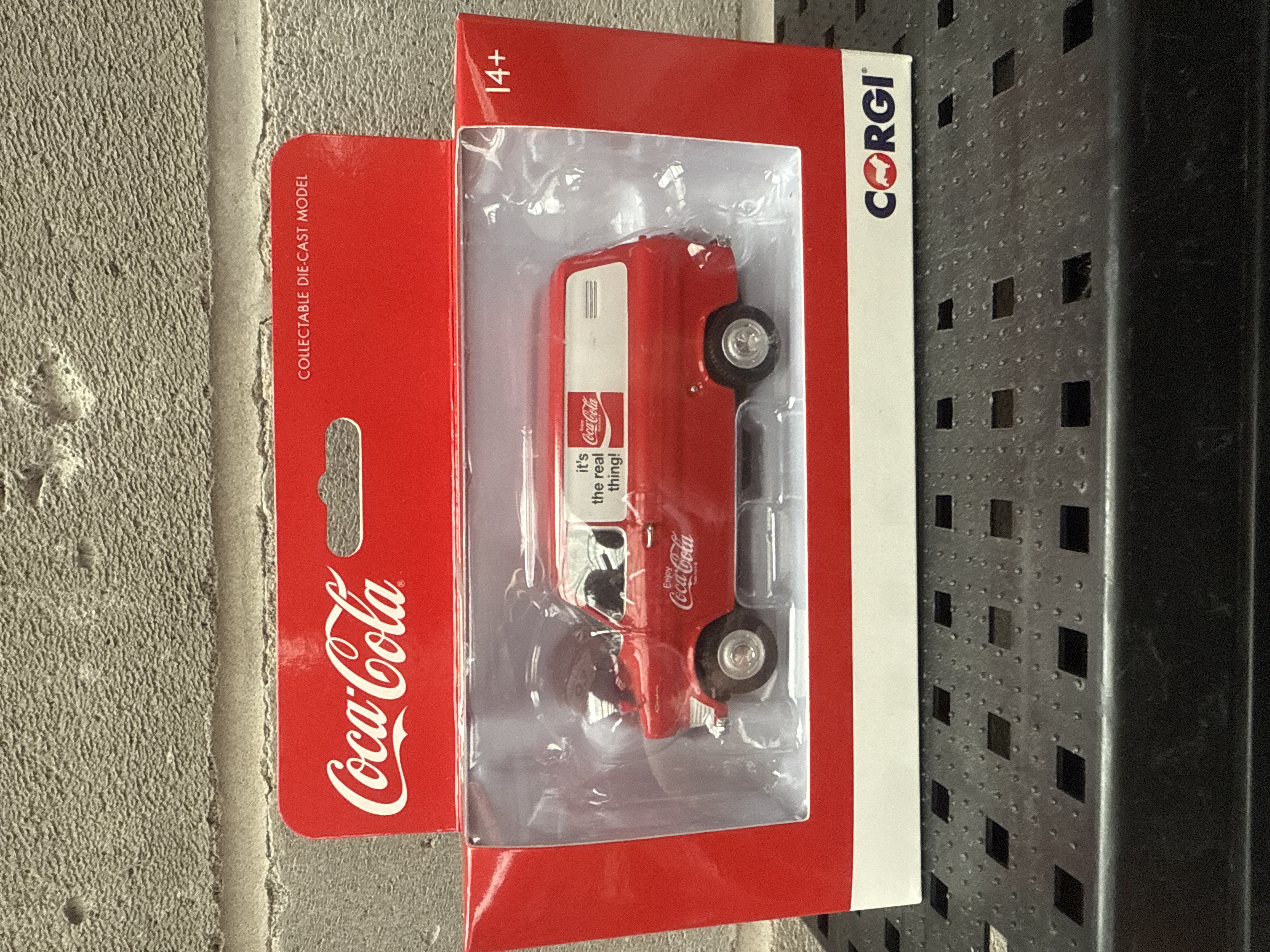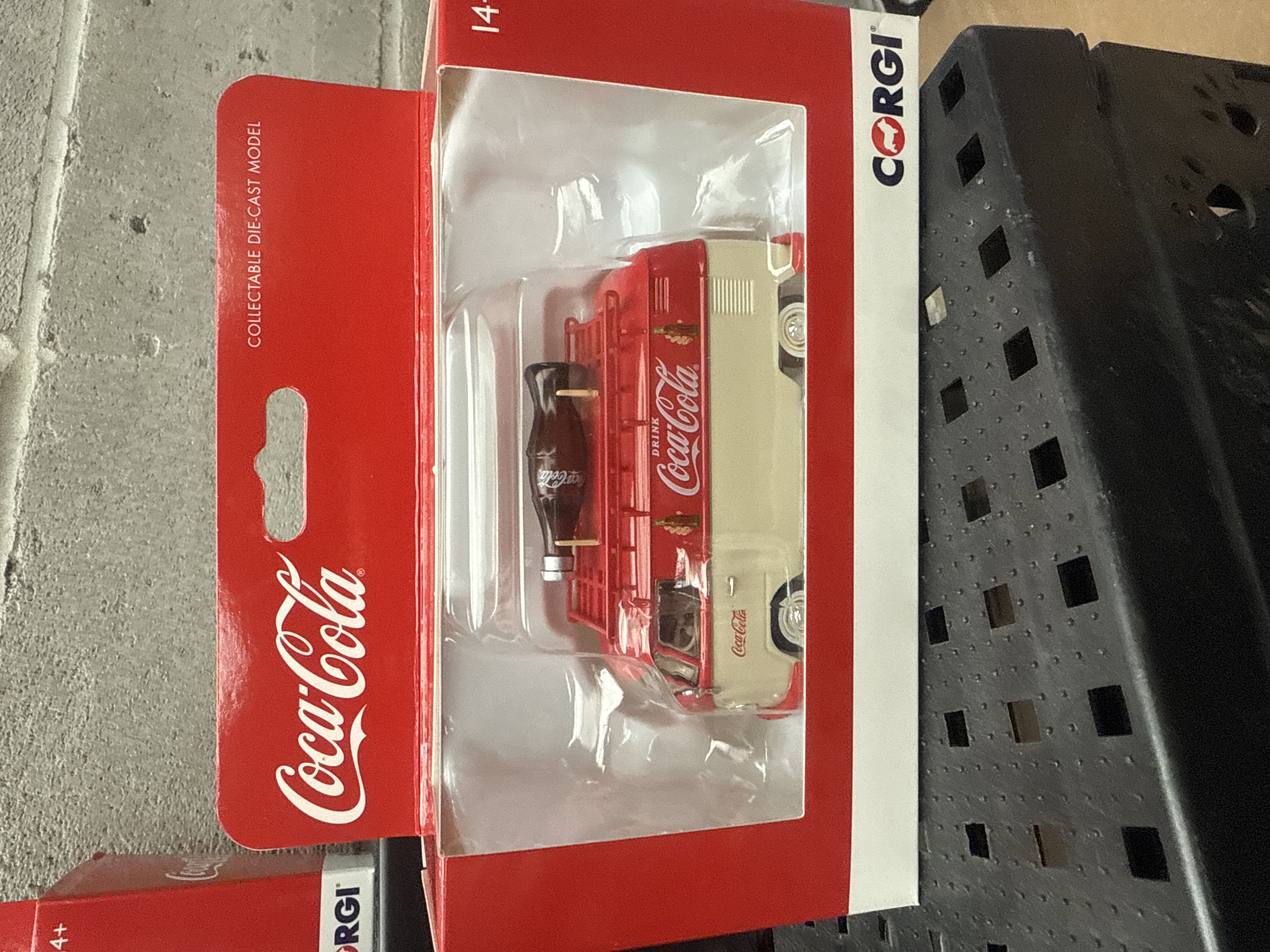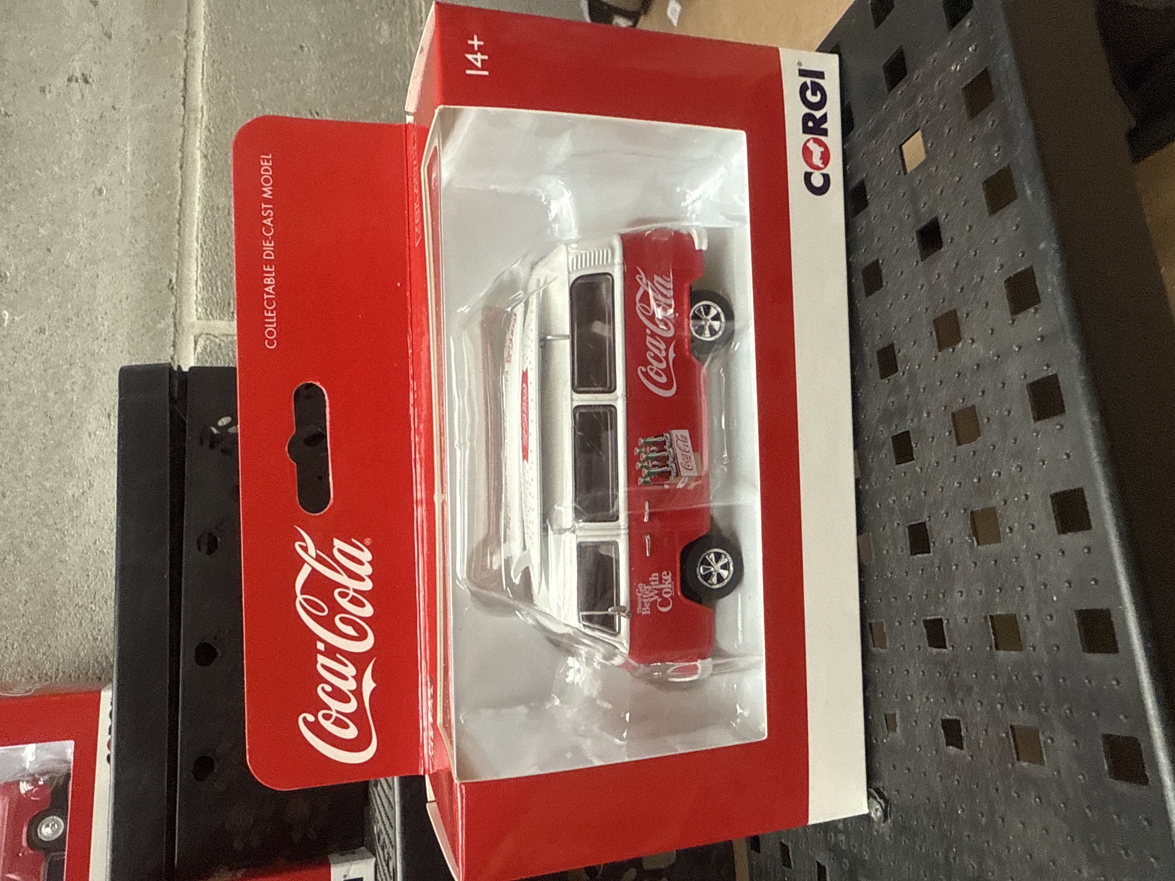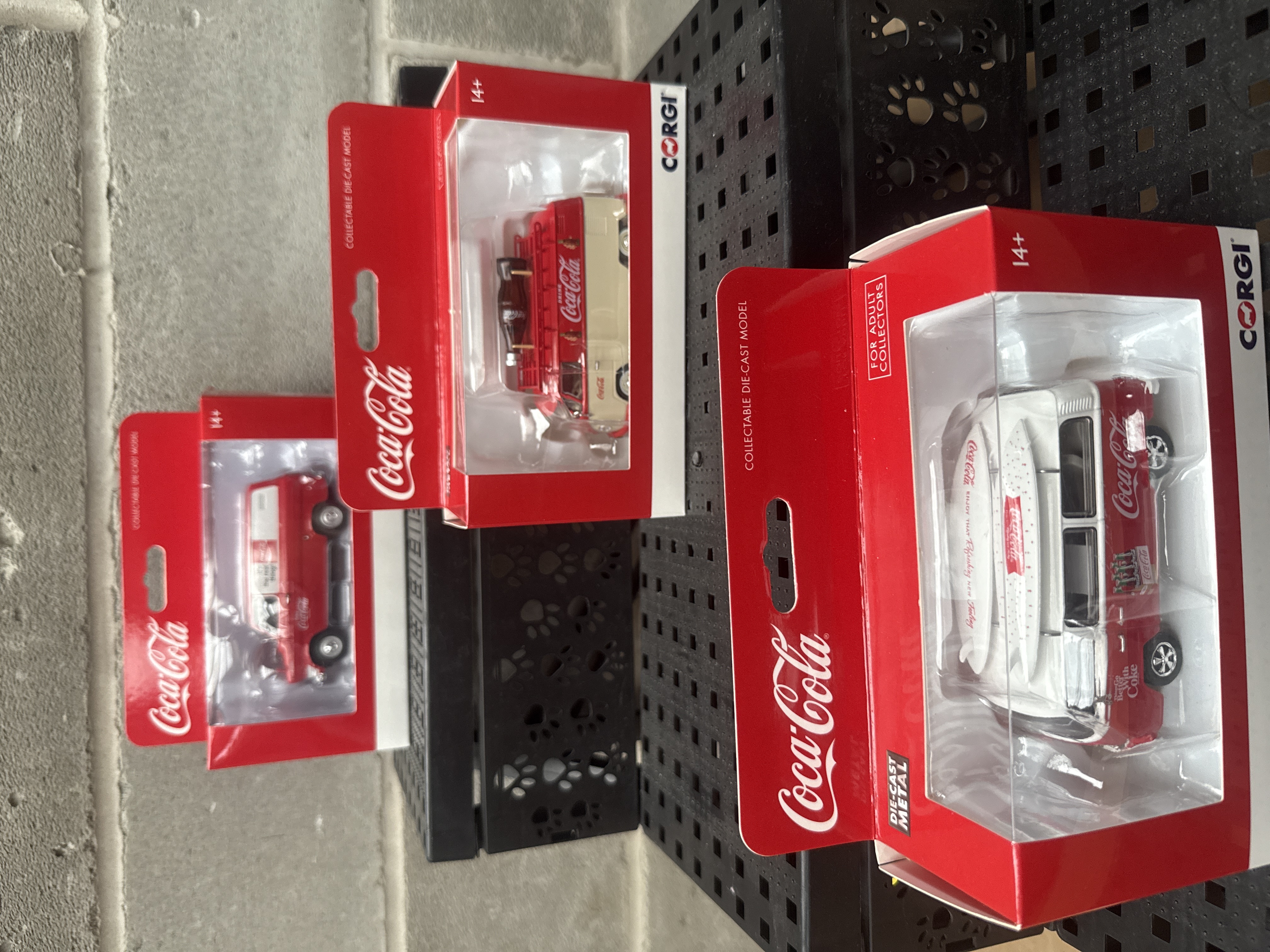 A collection of three Corgi Coca-Cola die-cast model vehicles, all presented in their original, unopened red and white cardboard packaging. The models include a red and white delivery van featuring “Enjoy Coca-Cola” and “it’s the real thing!” slogans, and two variations of a Volkswagen Type 2 bus. One bus is in red and cream with “DRINK Coca-Cola” and a large Coke bottle on its roof rack. The other bus is red and white with surfboards on top, displaying “Enjoy Coca-Cola,” “Best with Coke,” and “Refreshing” text. Each package is marked as “COLLECTABLE DIE-CAST MODEL” and “FOR ADULT COLLECTORS” with a “14+” age rating.