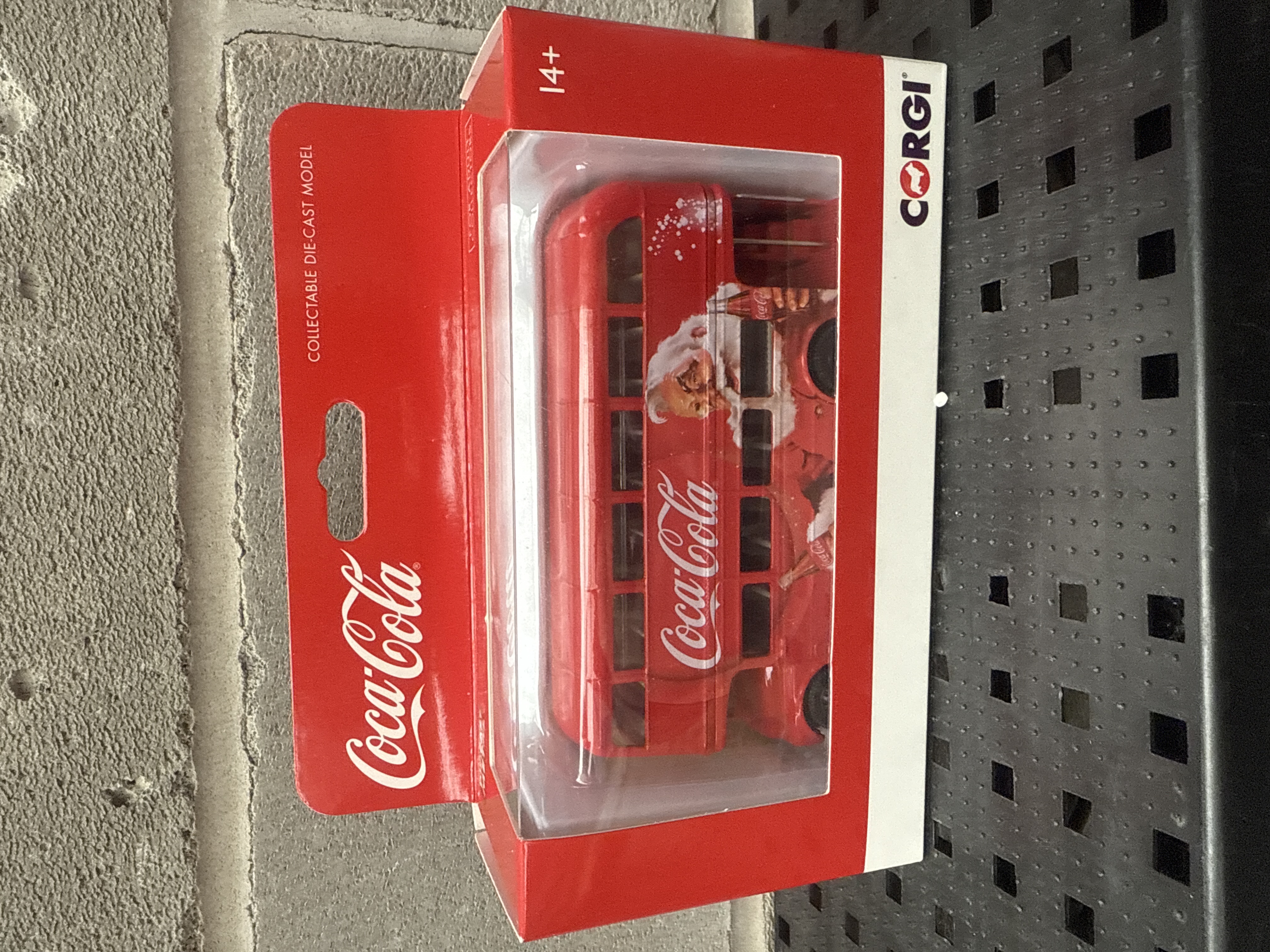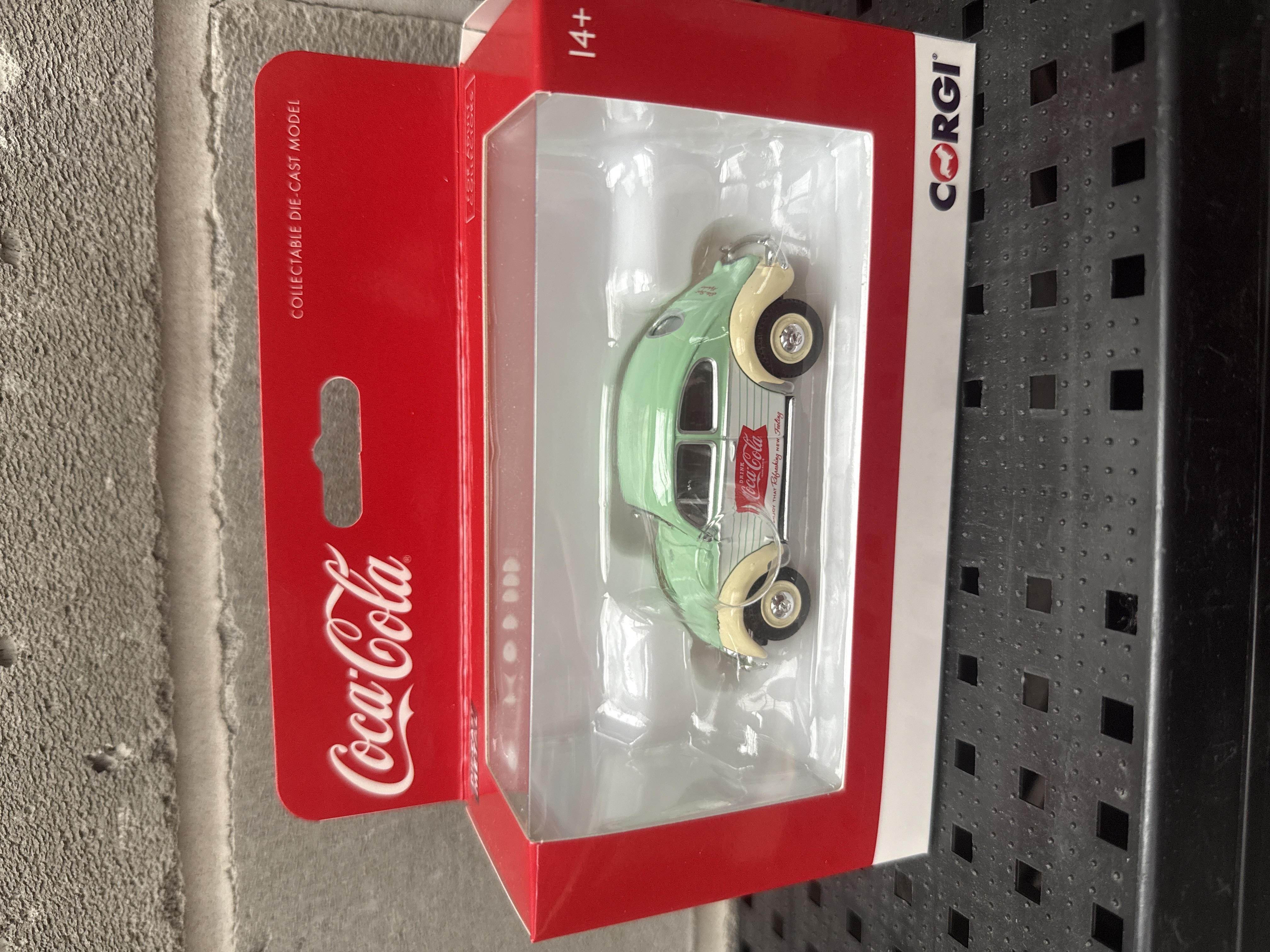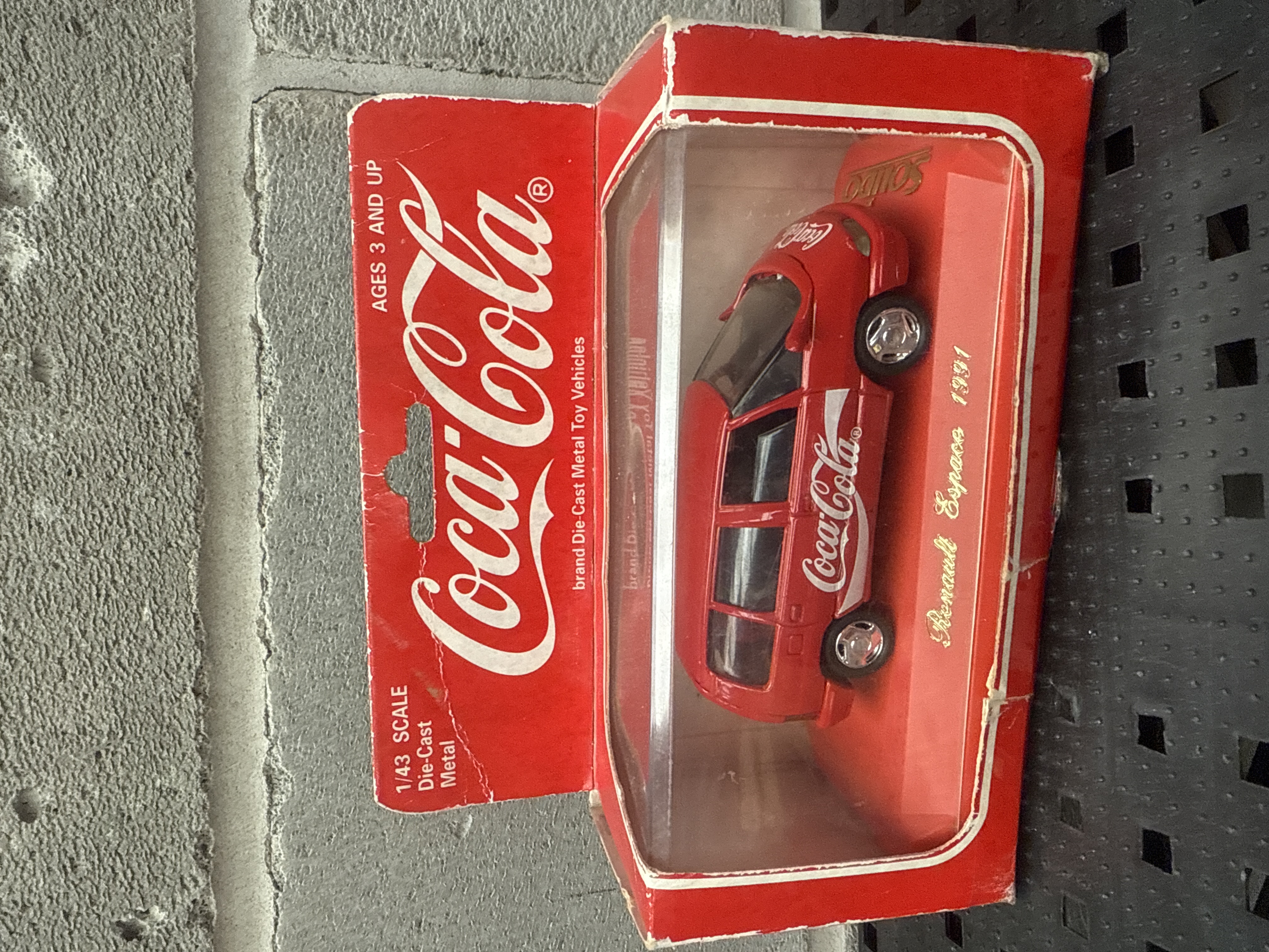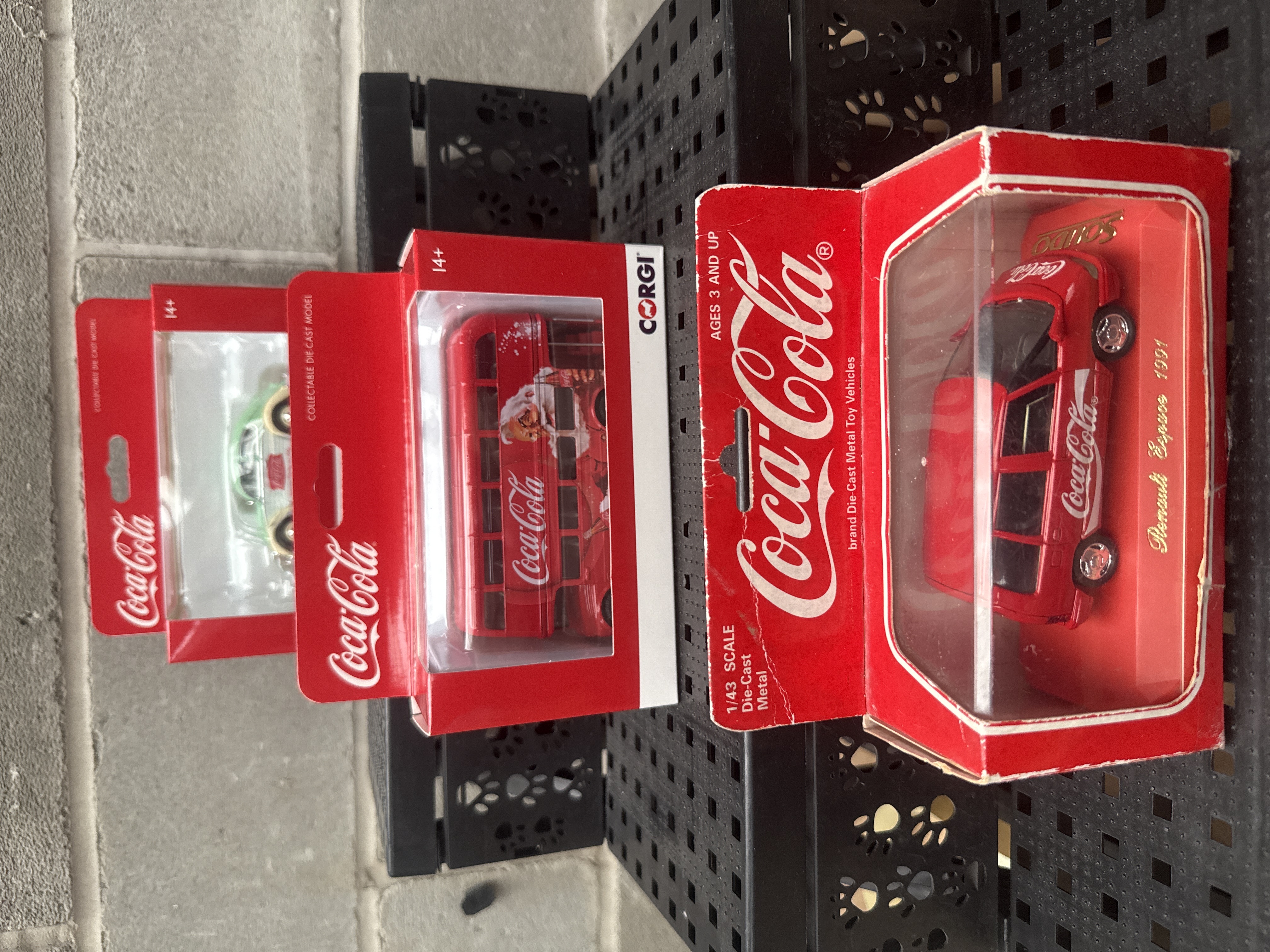 A collection of three distinct collectible die-cast model vehicles, each prominently featuring Coca-Cola branding and presented in their original, unopened packaging. The lot includes two Corgi-branded models: a light green and cream Volkswagen Beetle, labeled as a “Collectable Die-Cast Model” suitable for “14+” and above, also bearing the slogan “Pure refreshment with a feeling”; and a red double-decker bus depicting Santa Claus, also a “Collectable Die-Cast Model” for “14+” and above. The third model is a red 1/43 scale Renault Espace, specifically marked “1991” and described as “Die-Cast Metal Toy Vehicles” for “Ages 3 and Up.”
