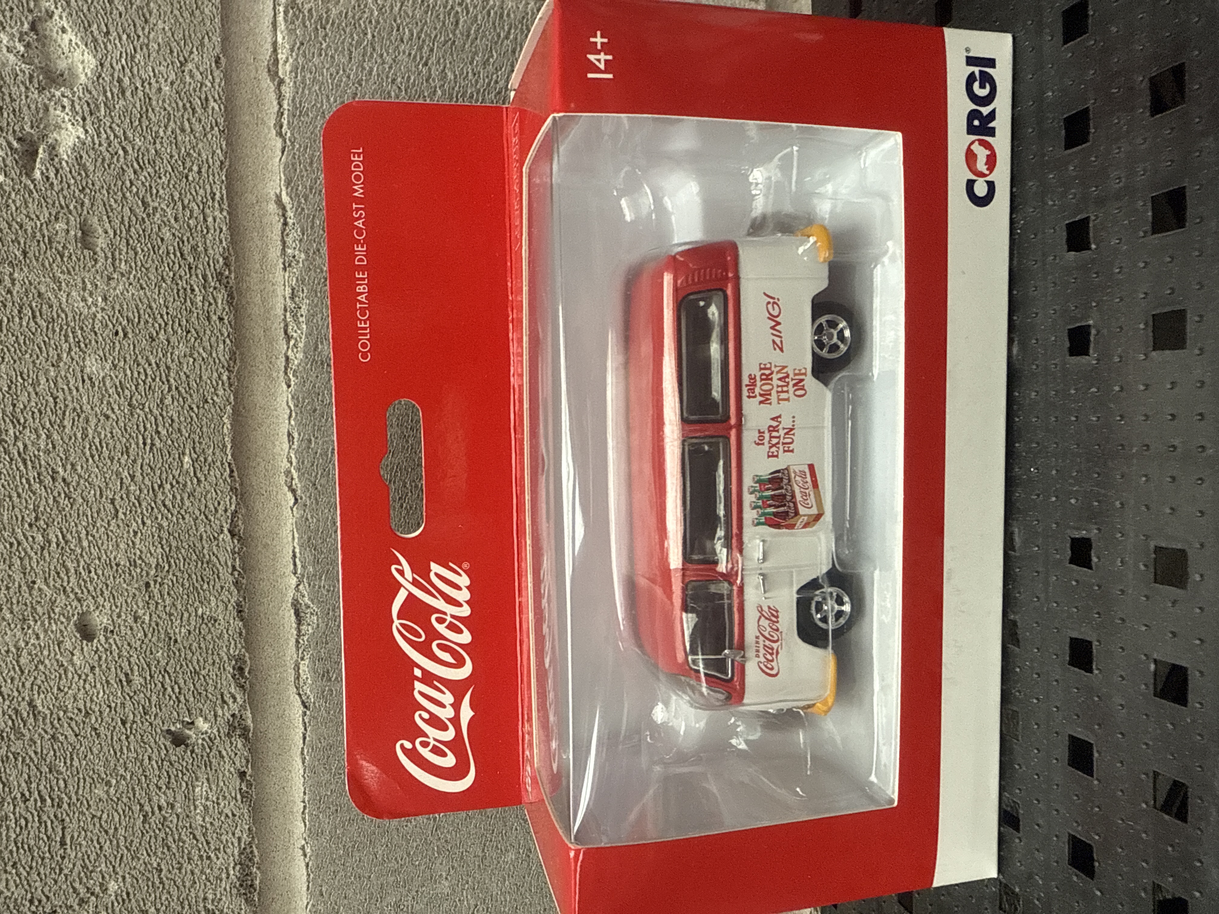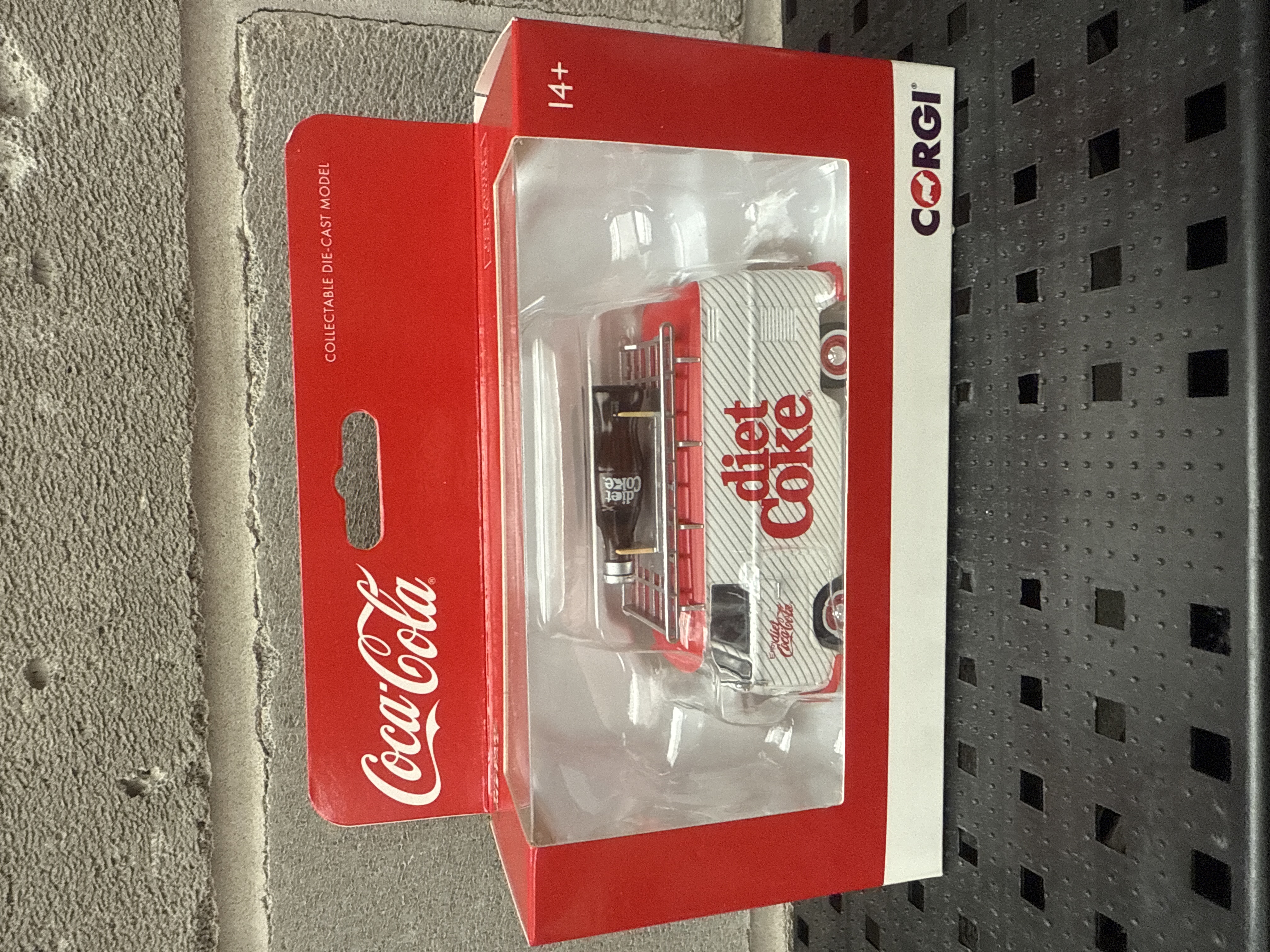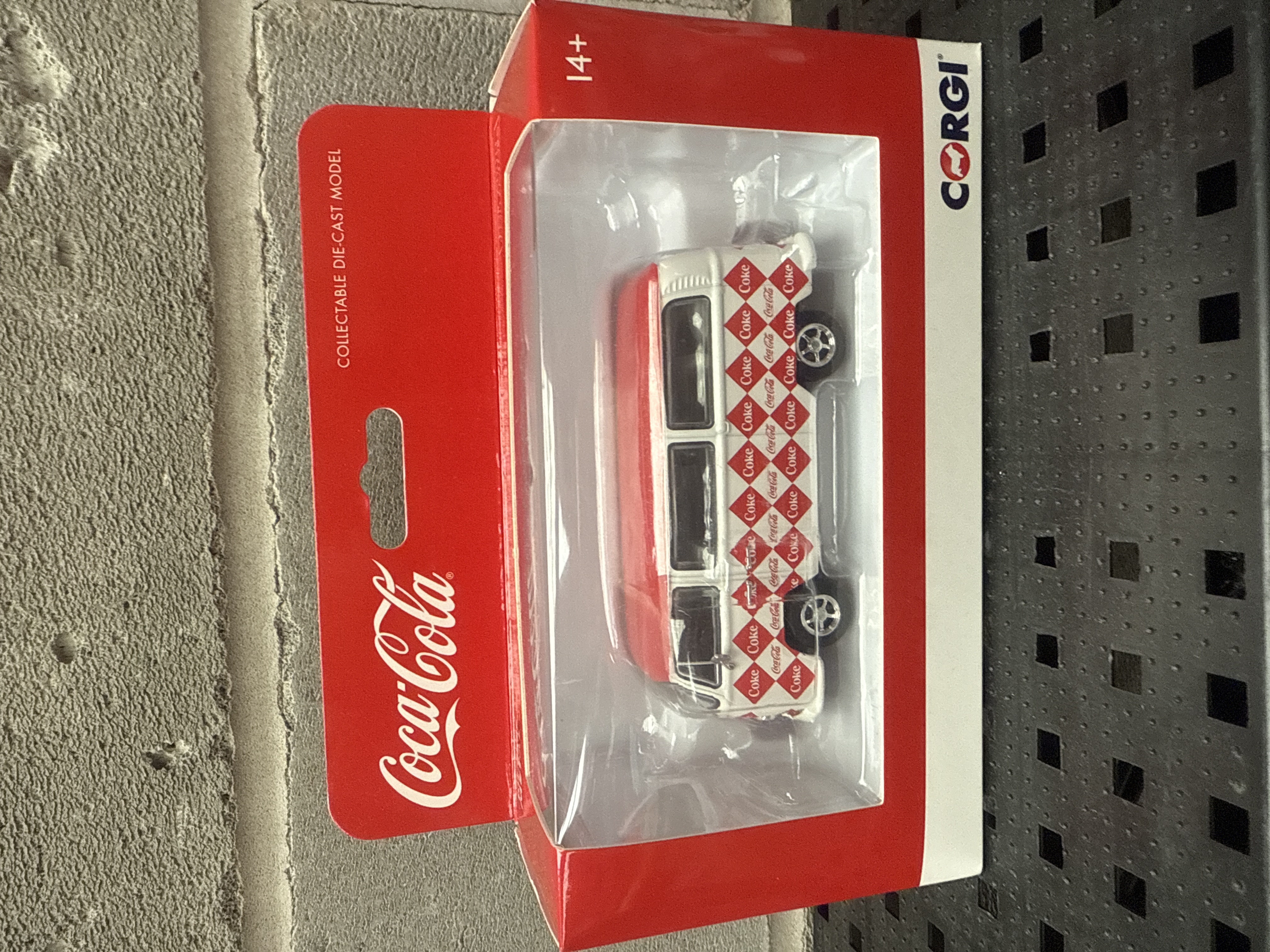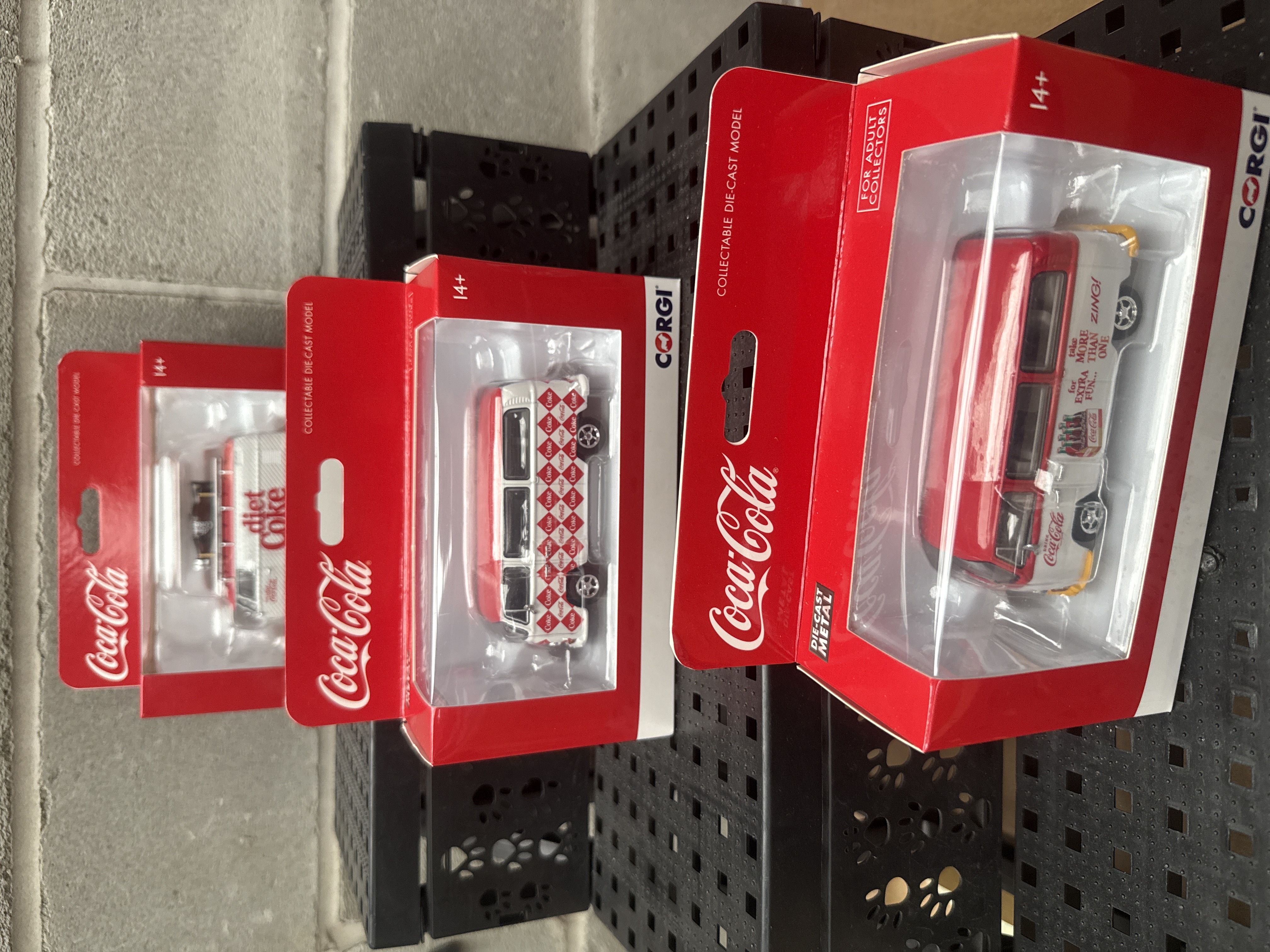 A group of three Corgi Volkswagen T1-style Campervan die-cast models, each themed with Coca-Cola branding. Each model is presented new, unboxed, and visible through clear plastic windows within its original red and white cardboard packaging. The top model is a white and red “diet Coke” variant, featuring a miniature bottle on a roof rack. The middle model is white and red with a repeating diamond pattern of “Coke” logos. The bottom model is a red and white design showcasing multiple Coca-Cola bottles and slogans including “for EXTRA FUN… take MORE THAN ONE!” and “ZING!”. The packaging is marked “14+” and “DI-CAST METAL” and “FOR ADULT COLLECTORS” on the lowest box.