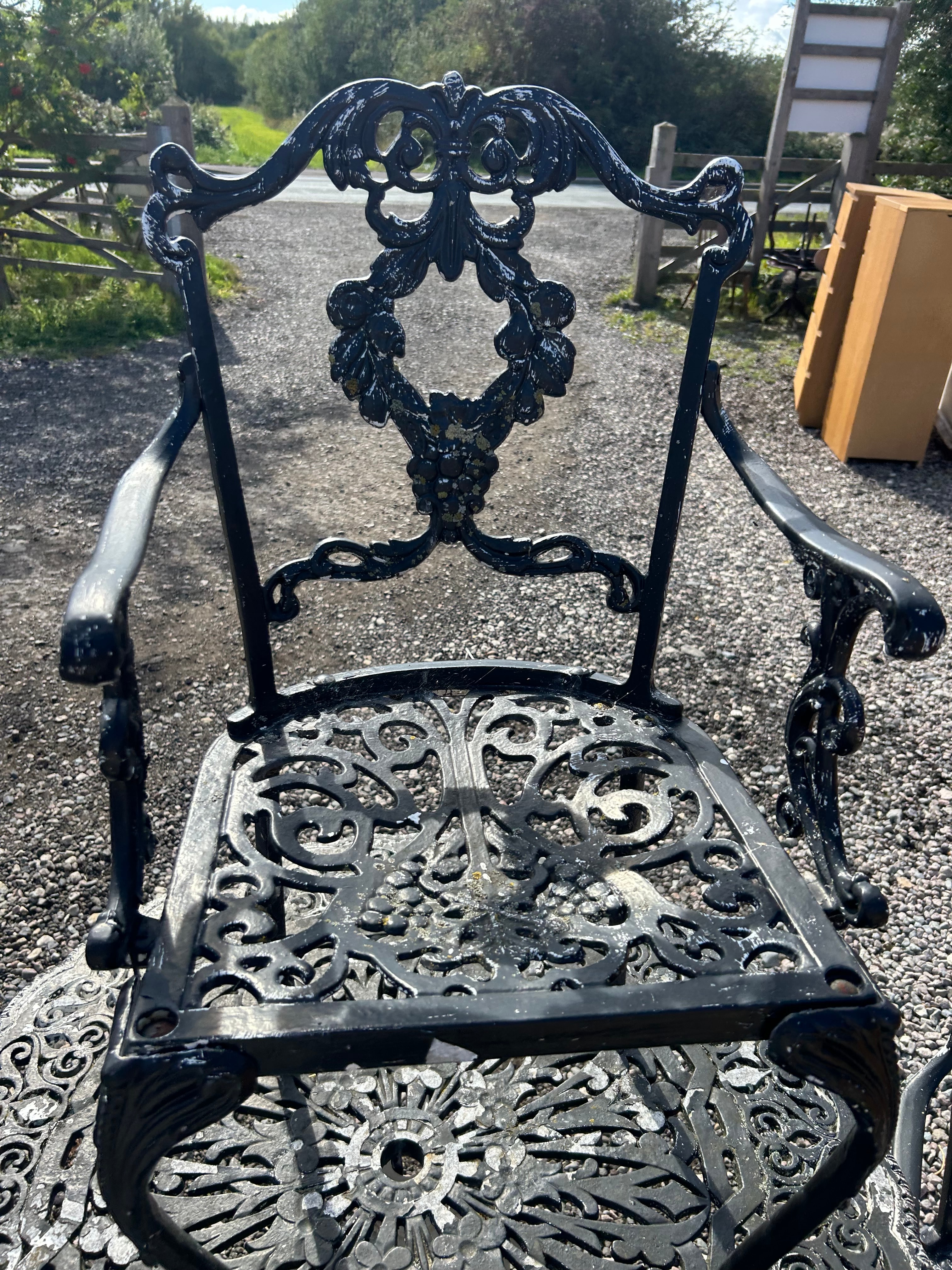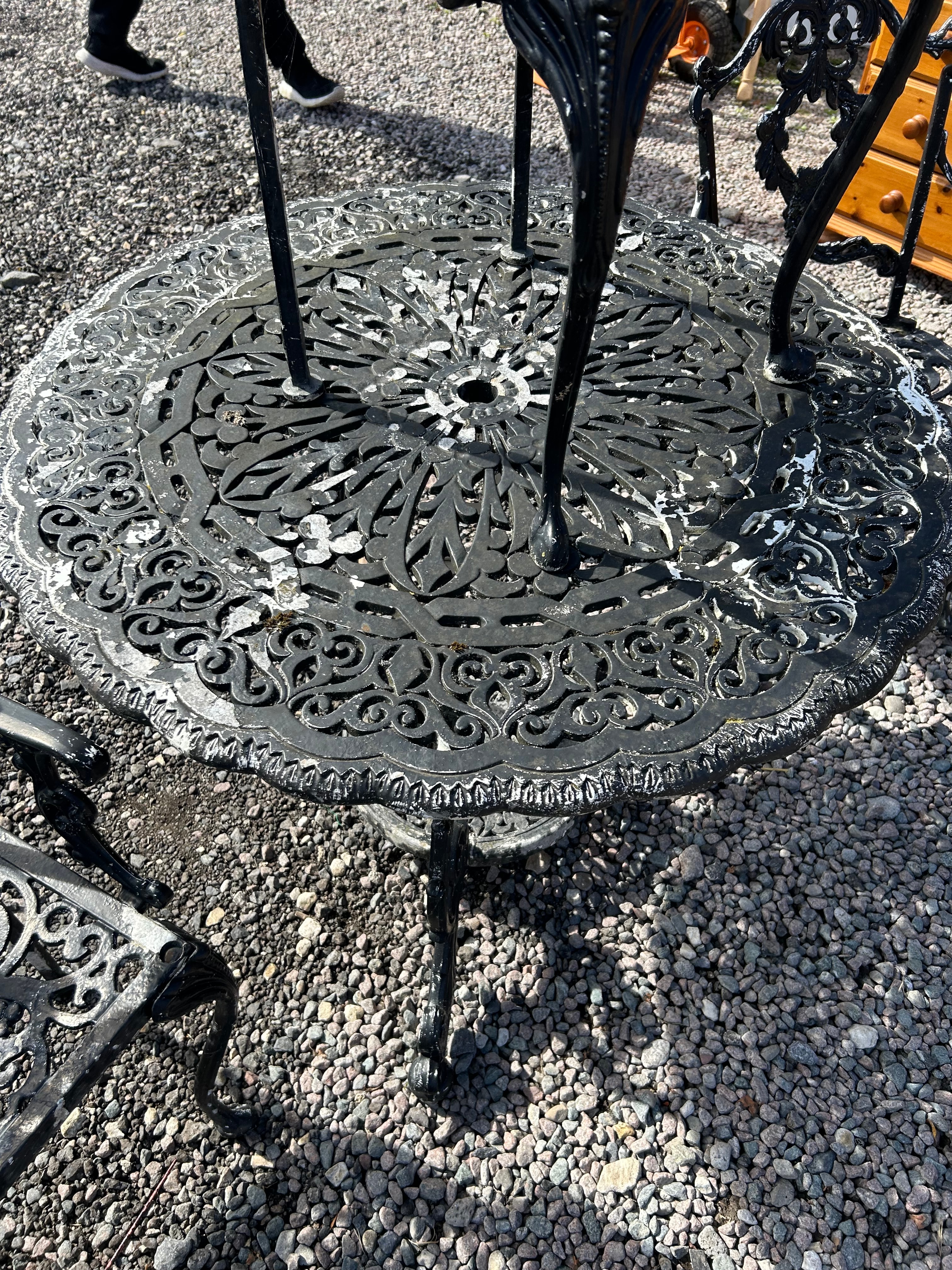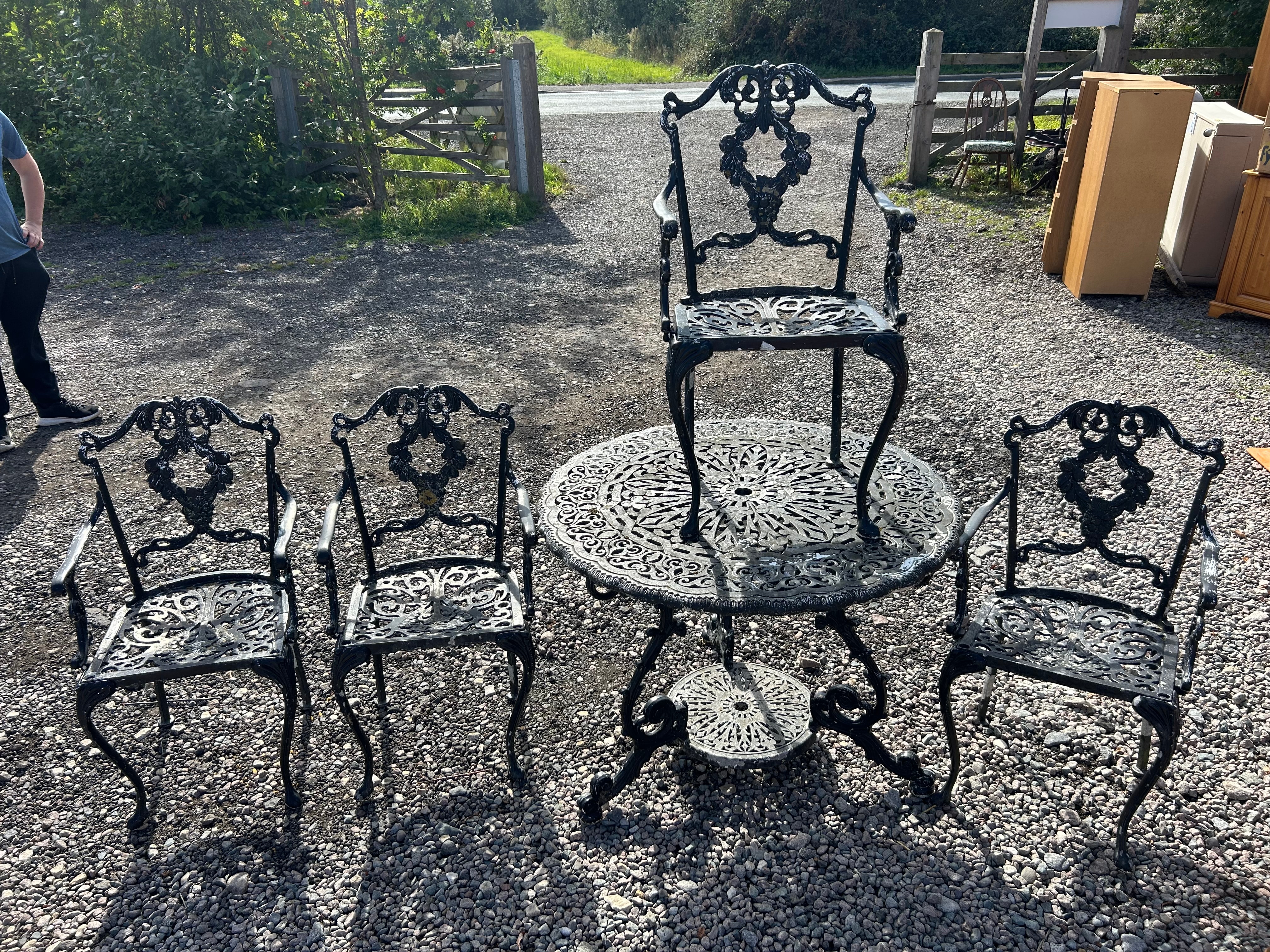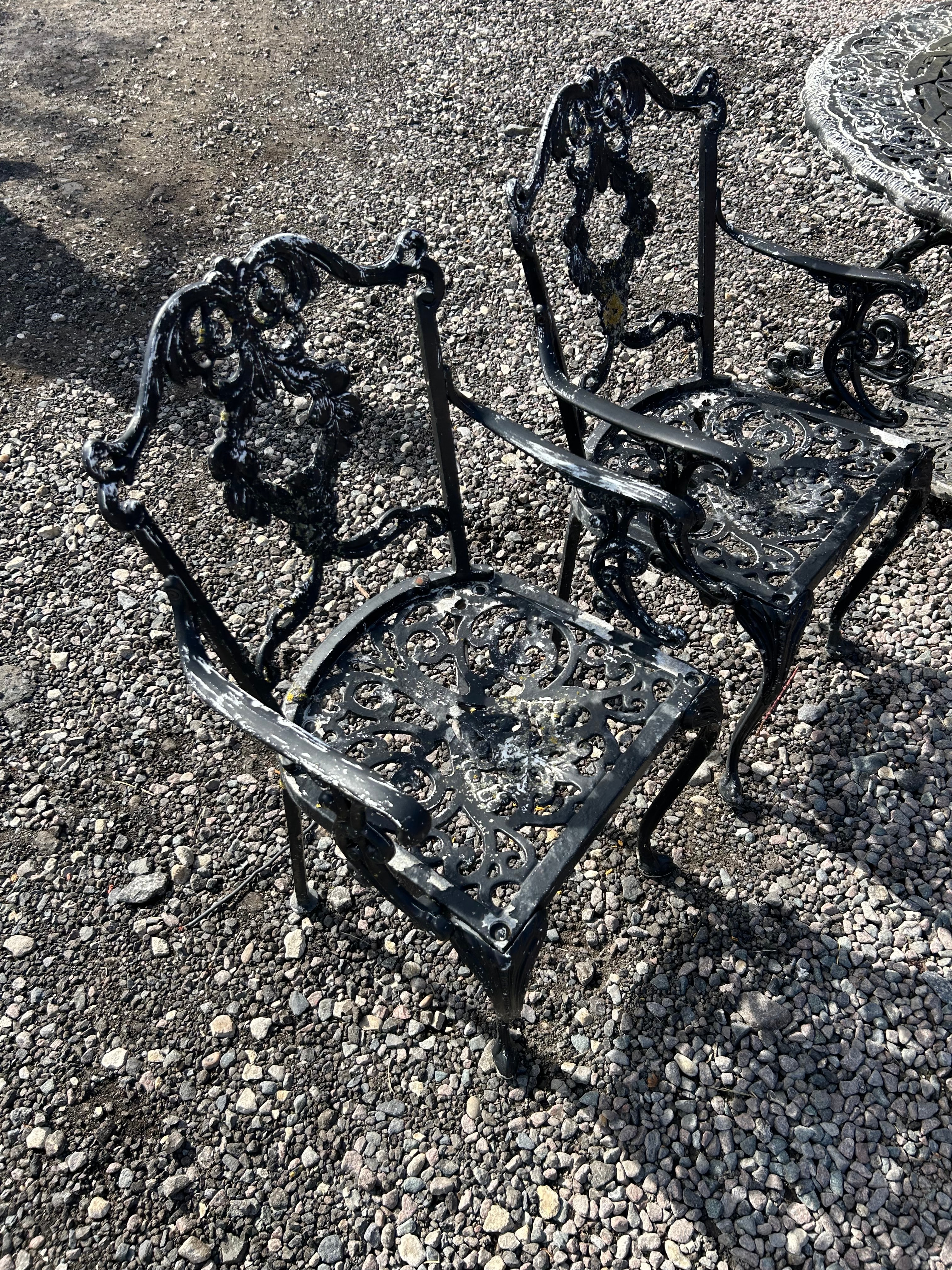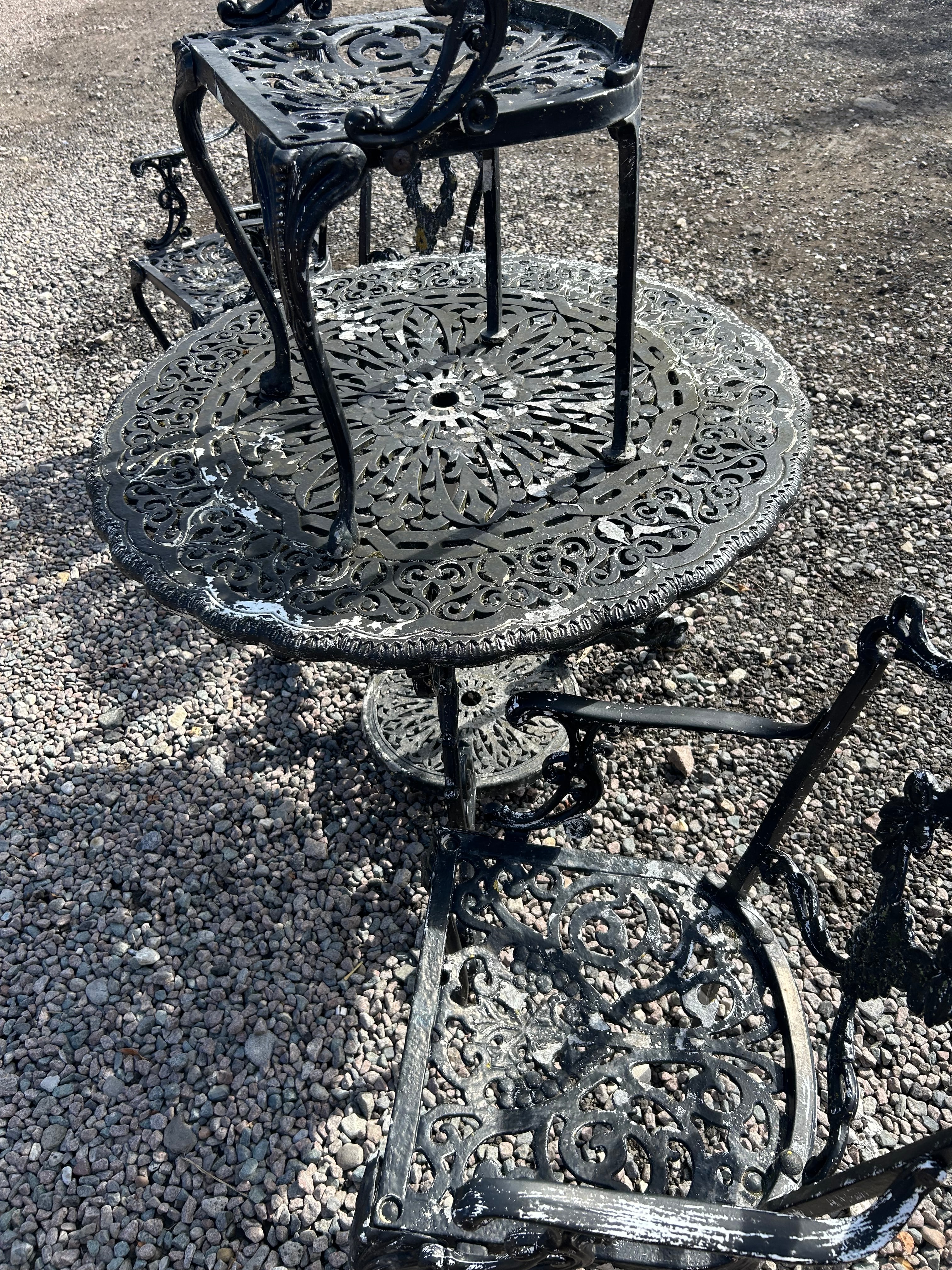 An Atlanta Stove Works Victorian style garden furniture set, comprising a round table and four matching armchairs, all constructed from aluminium. The pieces exhibit an elaborate Rococo Revival or Victorian-style design, characterized by intricate scrolling floral and foliate openwork motifs, including a central wreath-like medallion on the chair backs and a radial pattern on the table surface and chair seats. No discernible manufacturer’s marks or text are visible.