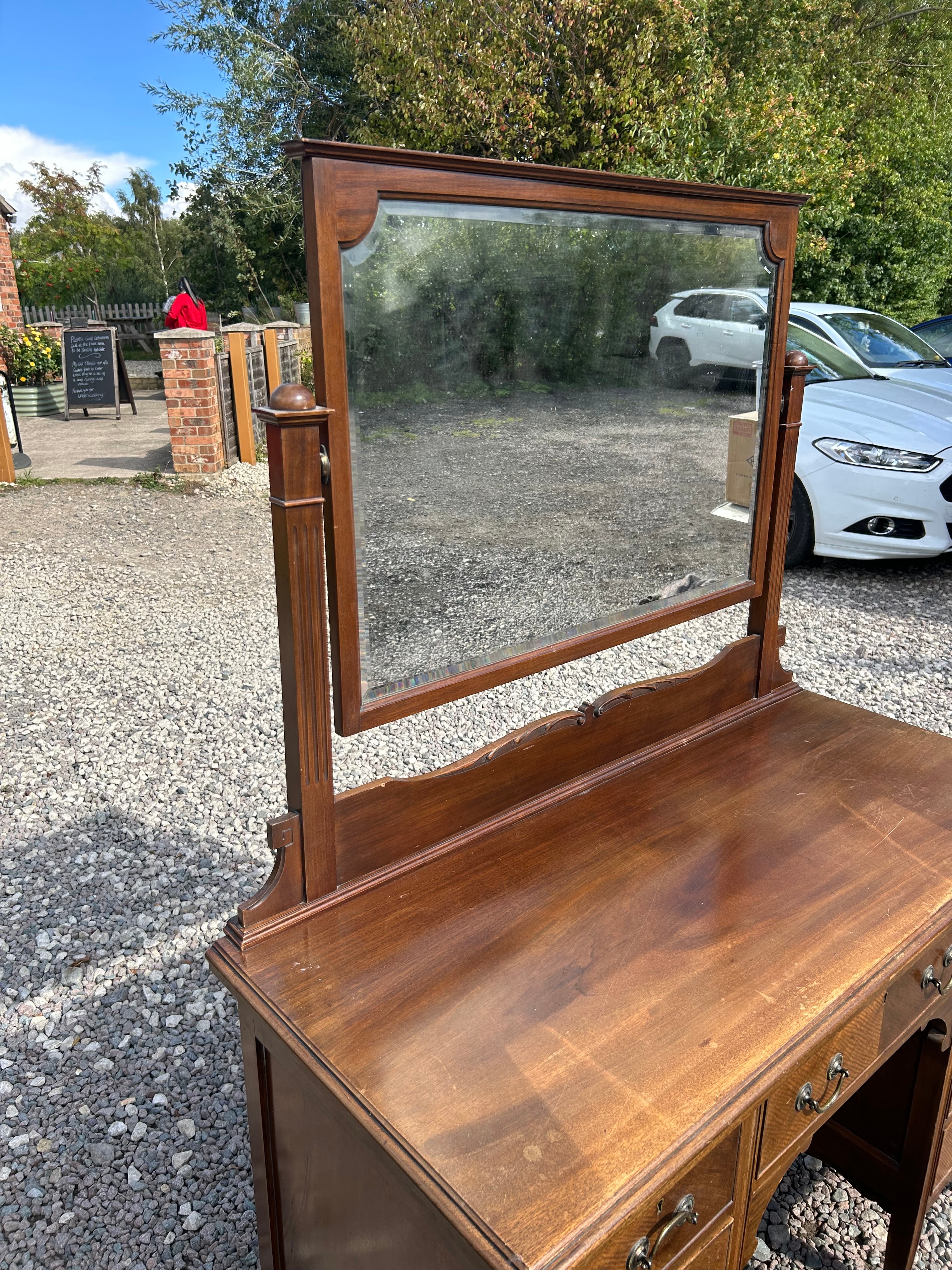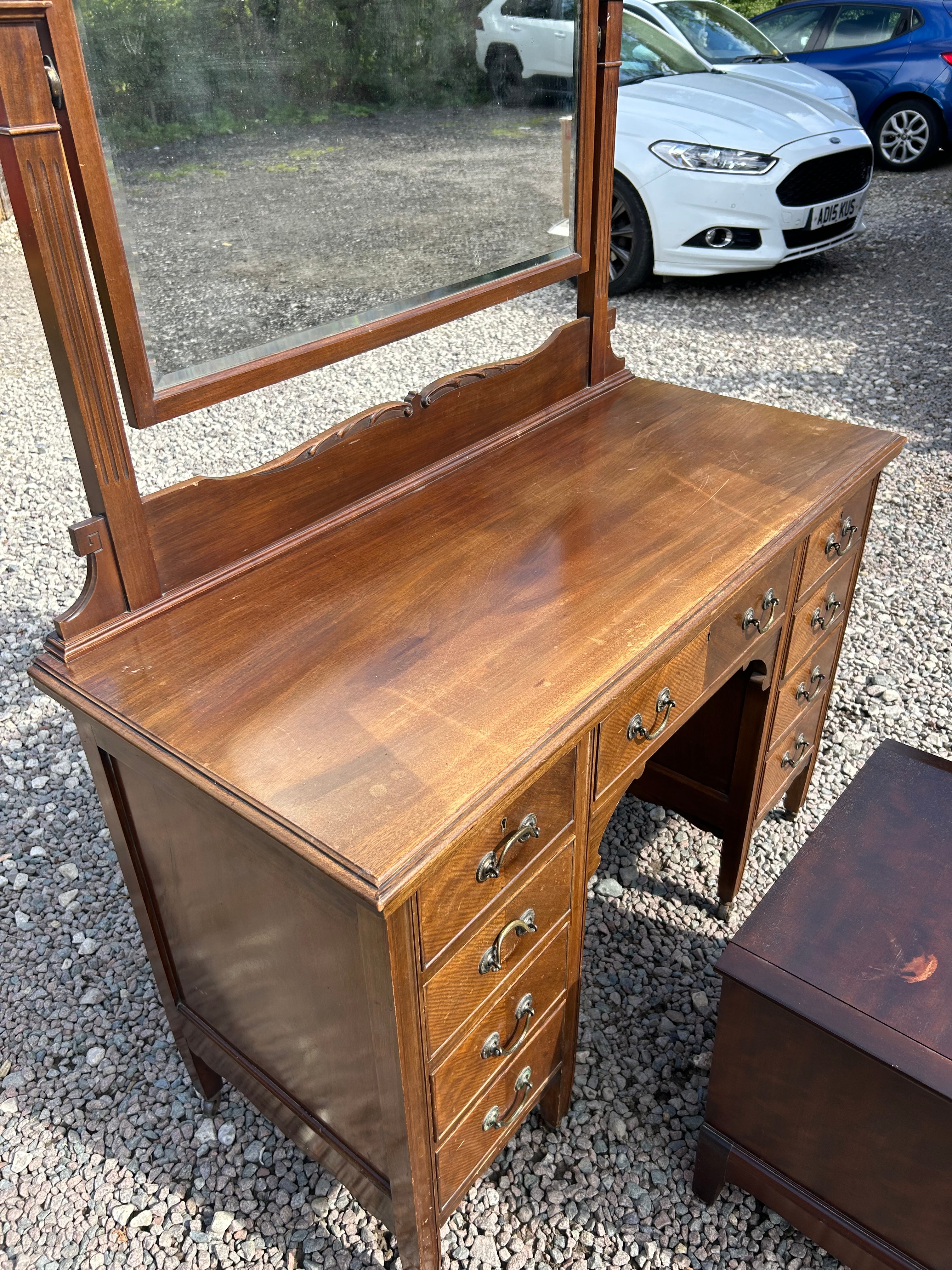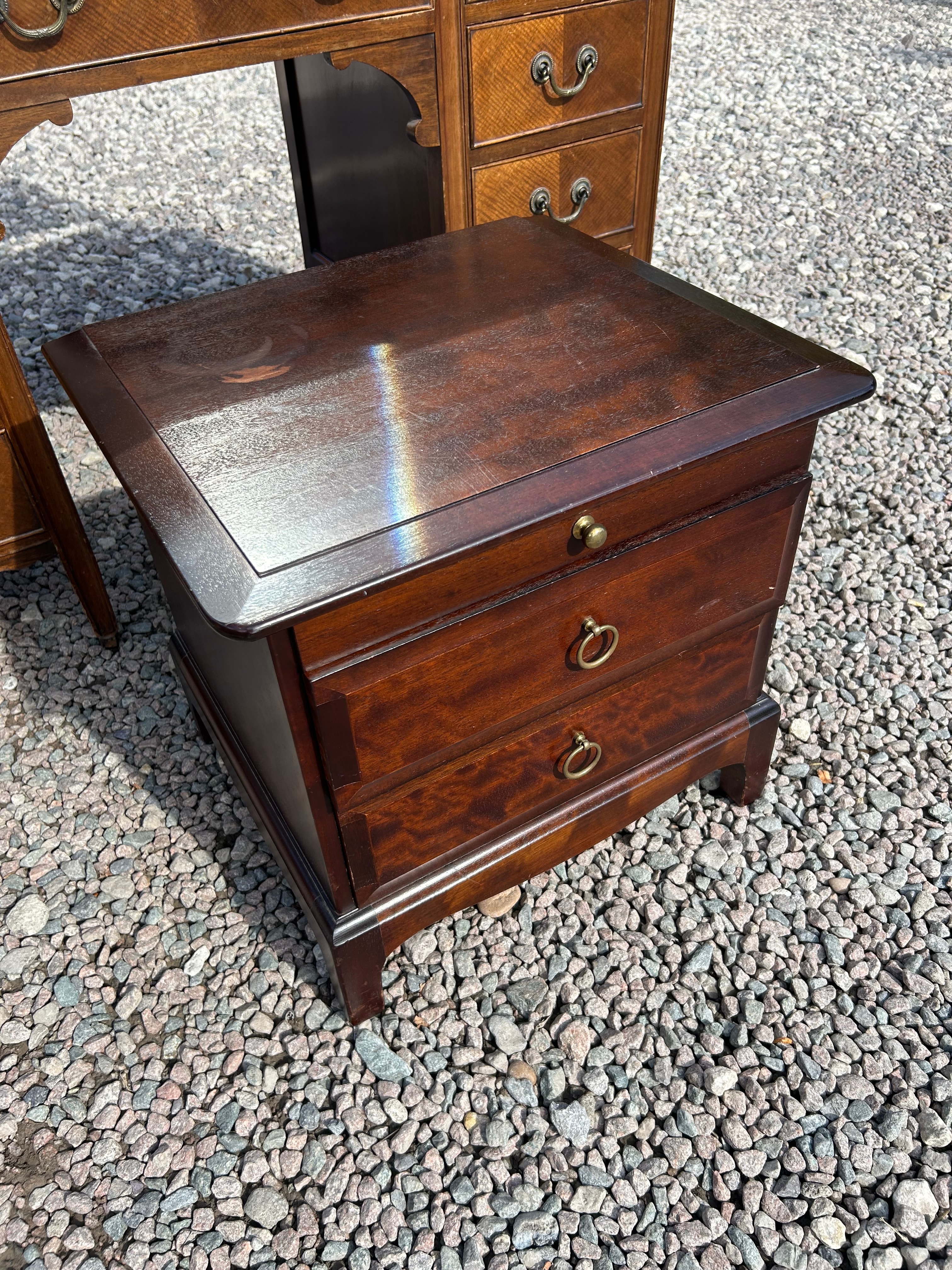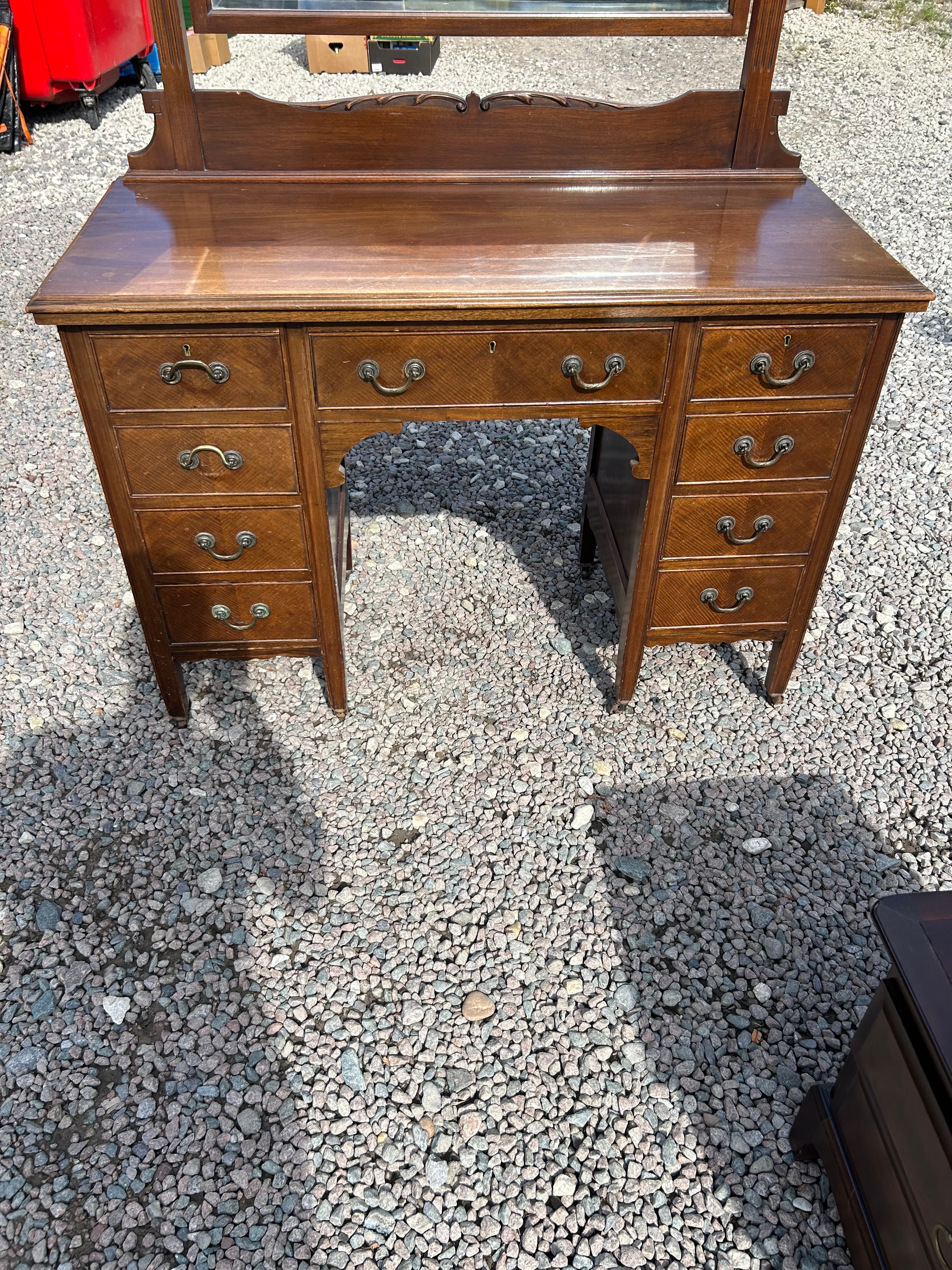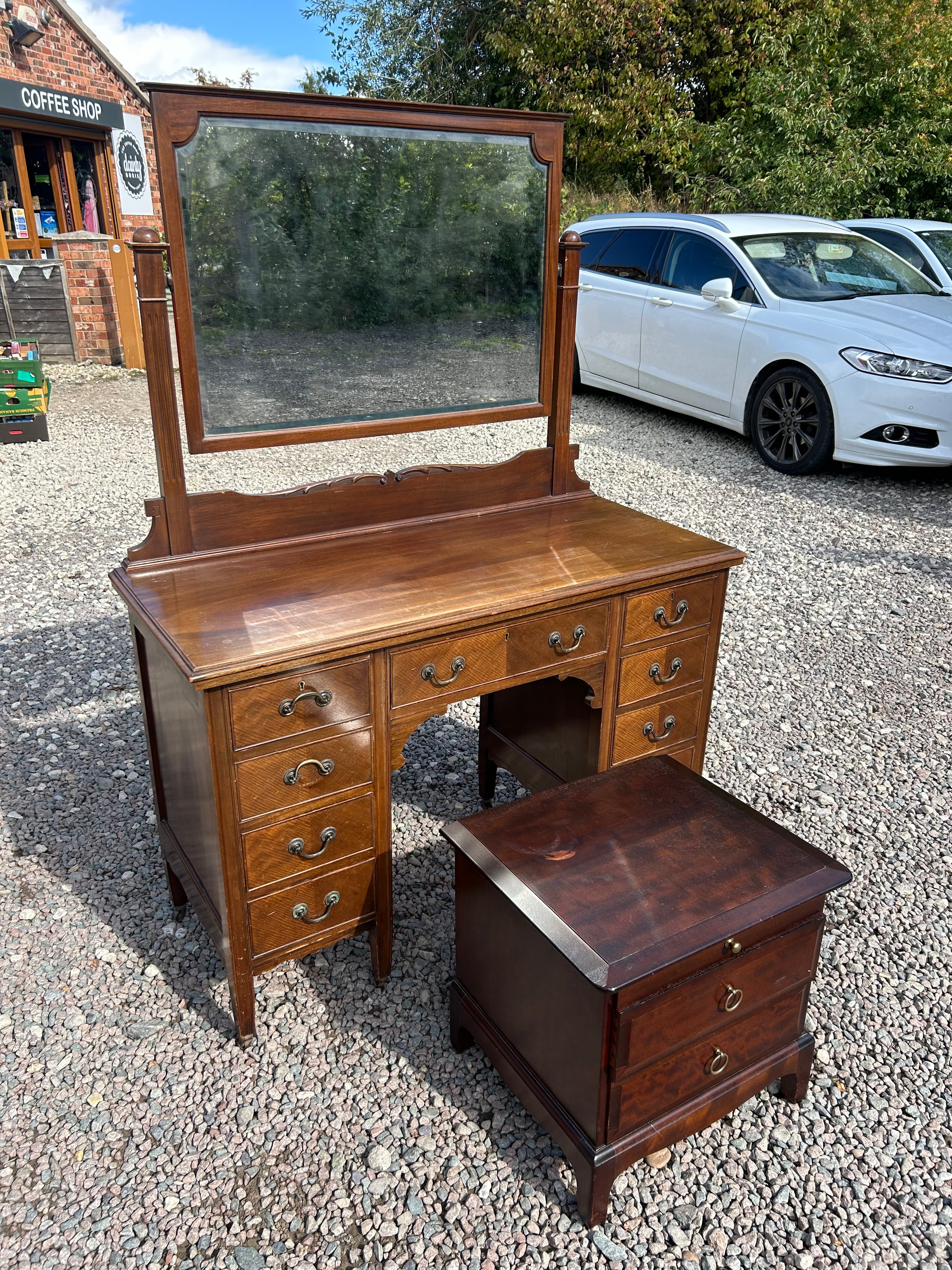 This lot comprises a traditional style hardwood dressing table and a coordinating small cabinet. The dressing table features a rectangular, swivel mirror supported by turned uprights, surmounting a tabletop with a shaped splashback. The table itself is constructed with a central kneehole arch flanked by two pedestals, each containing multiple drawers fitted with brass drop-ring handles and decorative escutcheons. The accompanying cabinet is square-shaped, featuring a flat top and two drawers, also fitted with brass ring handles. Both pieces appear to be crafted from a dark-stained hardwood, possibly mahogany or a similar species. No visible text or manufacturer’s markings are present on either item.