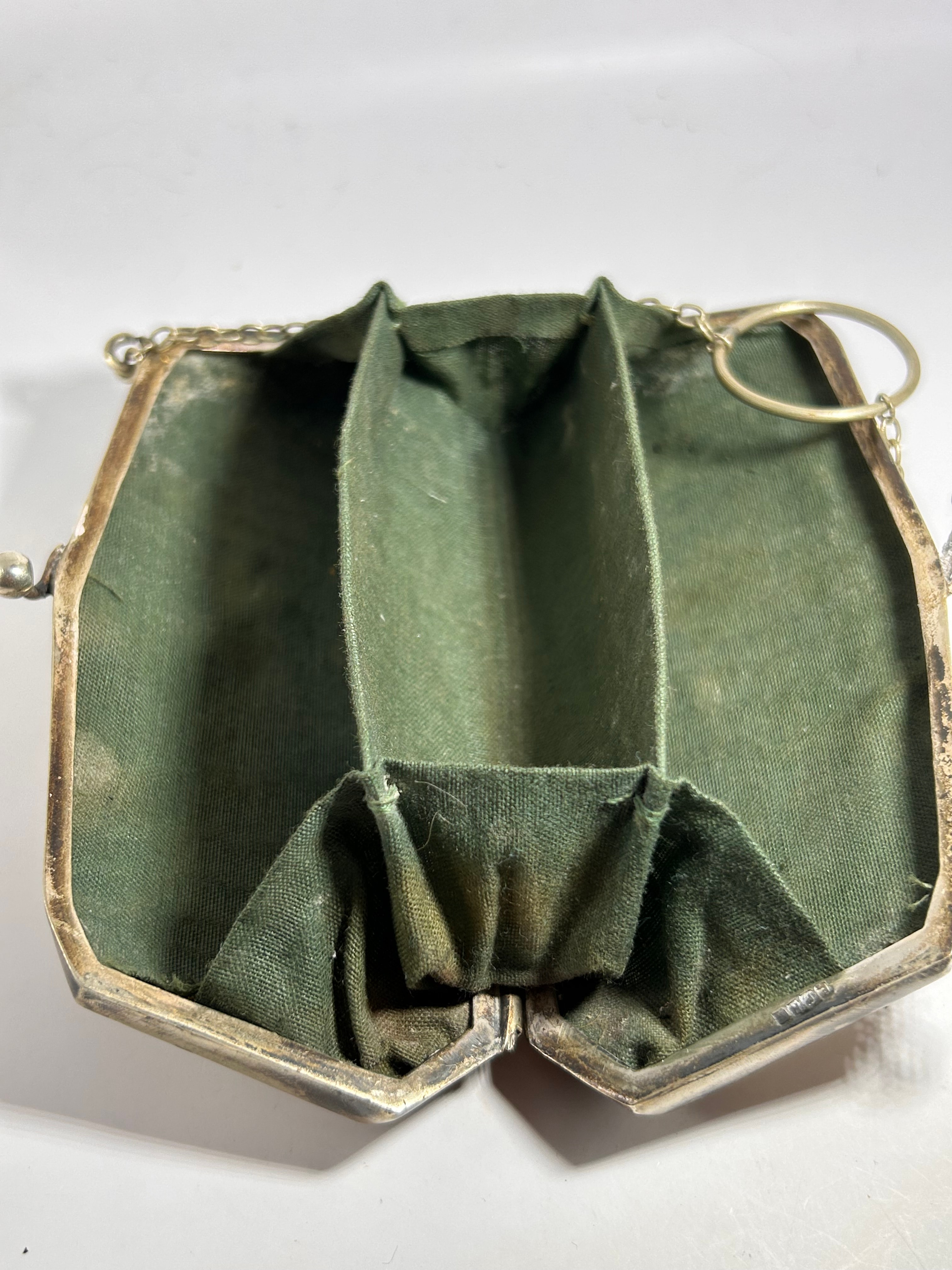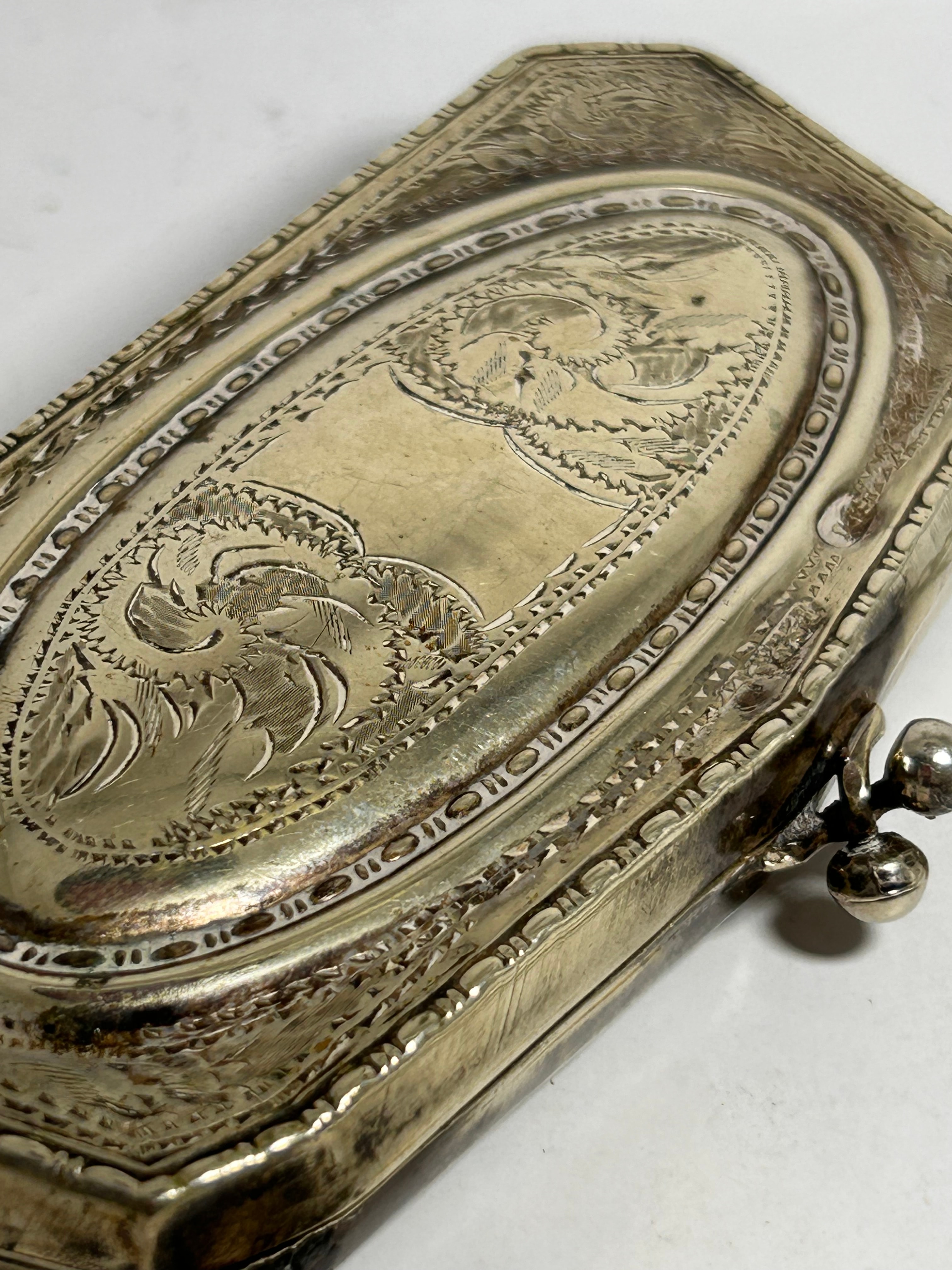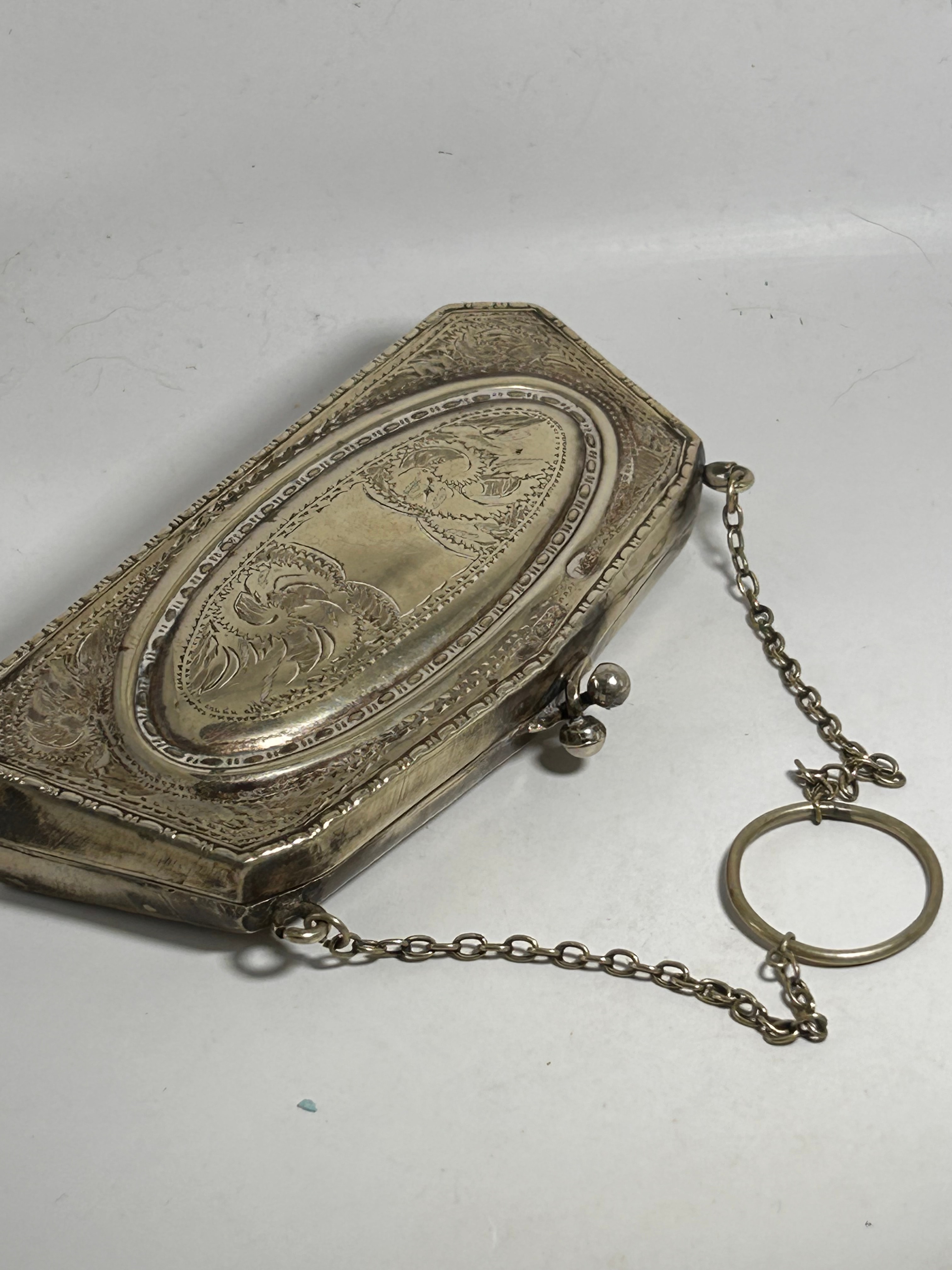 A Victorian silver plated coin purse, likely EPNS (Electro-Plated Nickel Silver). This rectangular hinged purse features ornate deeply engraved decoration on its exterior, including a central oval cartouche flanked by scrolling foliate or floral motifs and bordered by a repetitive geometric pattern. It is fitted with a ball clasp closure and an attached metal chain with a ring. The interior is lined with a dark green fabric, divided into at least three compartments.