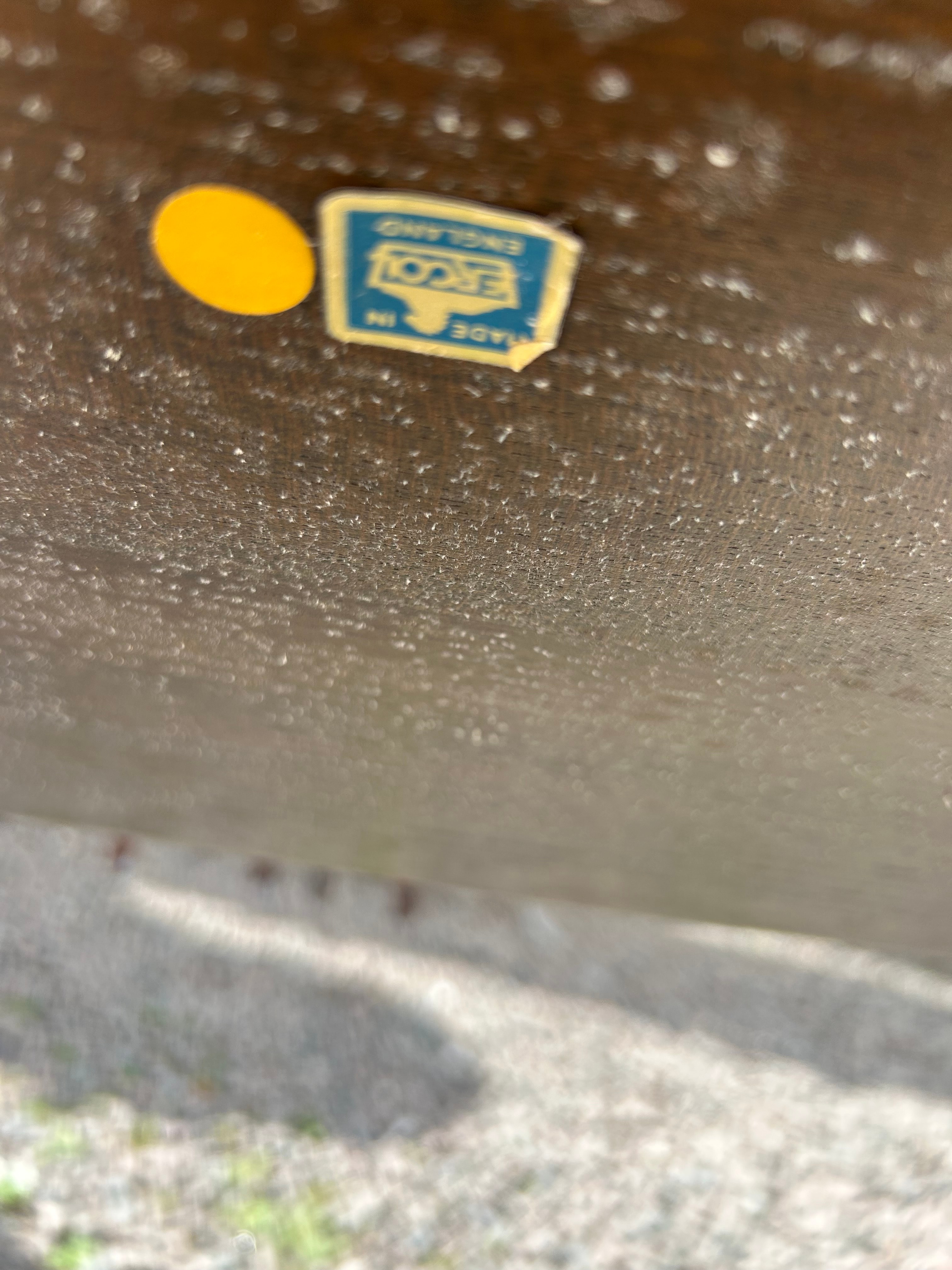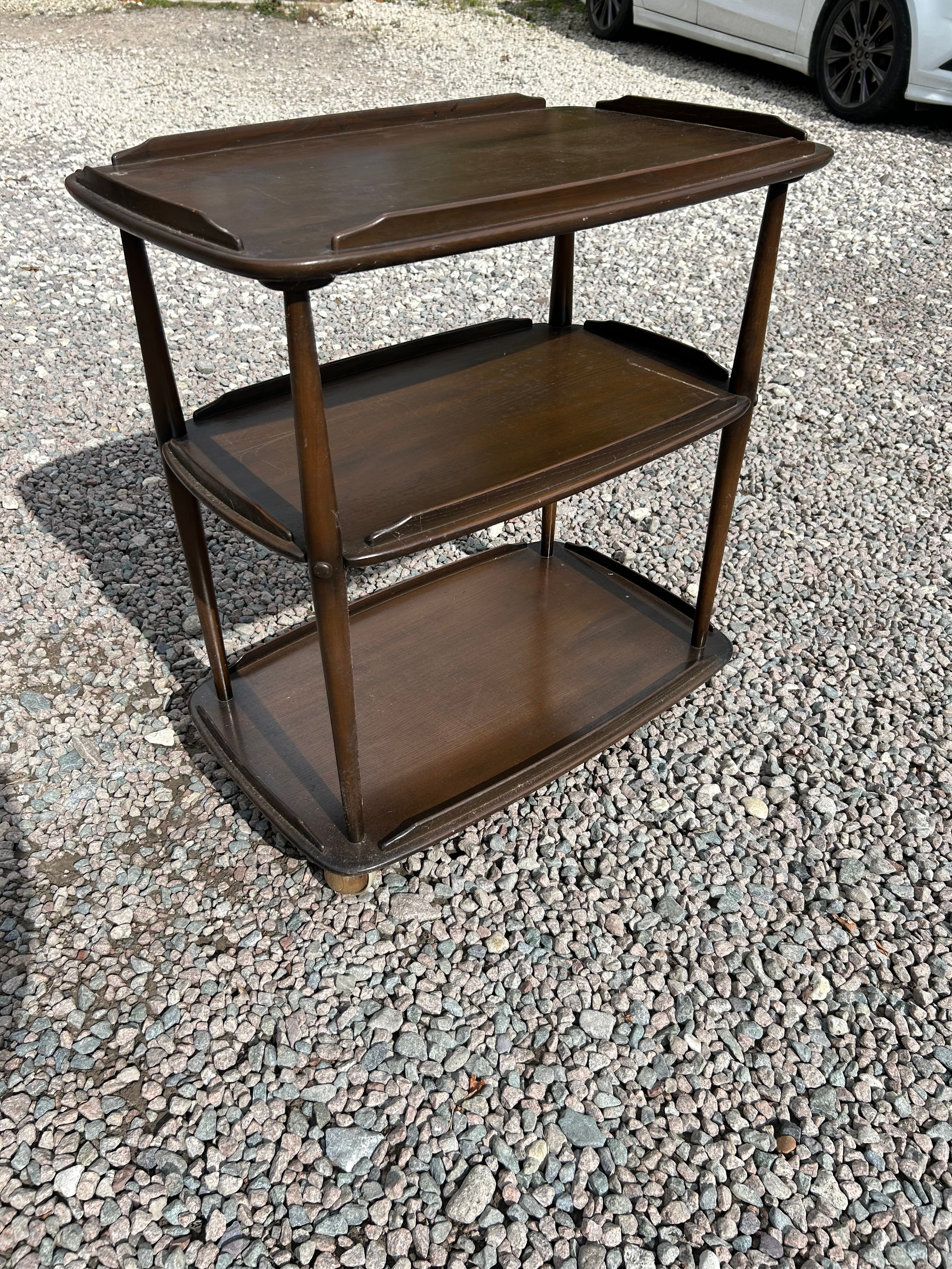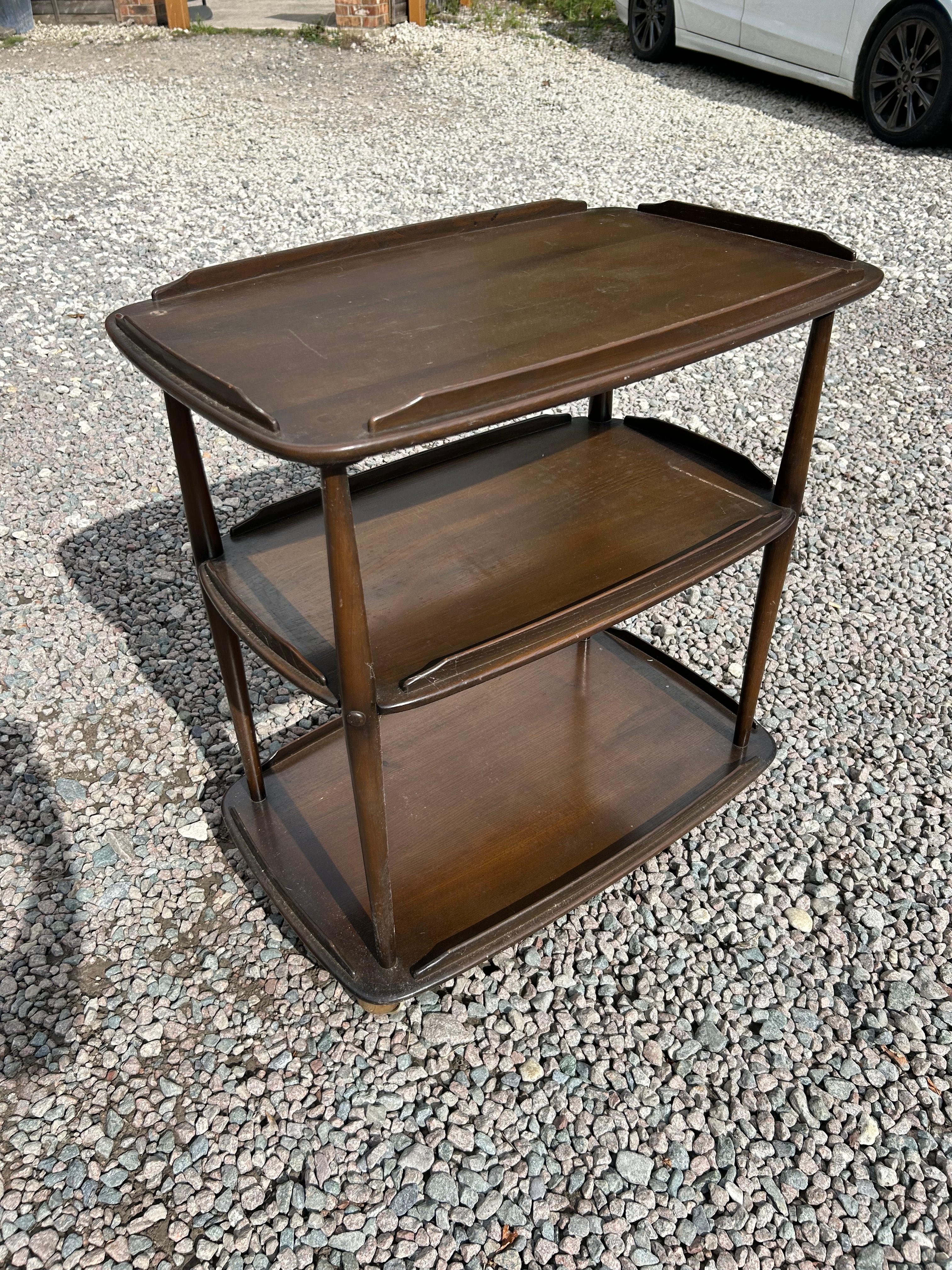 An Ercol three-tier drinks trolley, featuring a mid-century modern design. The cart is constructed from dark stained wood, likely beech or elm, with clean lines and slightly rounded, lipped rectangular shelves supported by turned posts. A manufacturer’s label on the underside identifies it as “ERCOL MADE IN ENGLAND.”