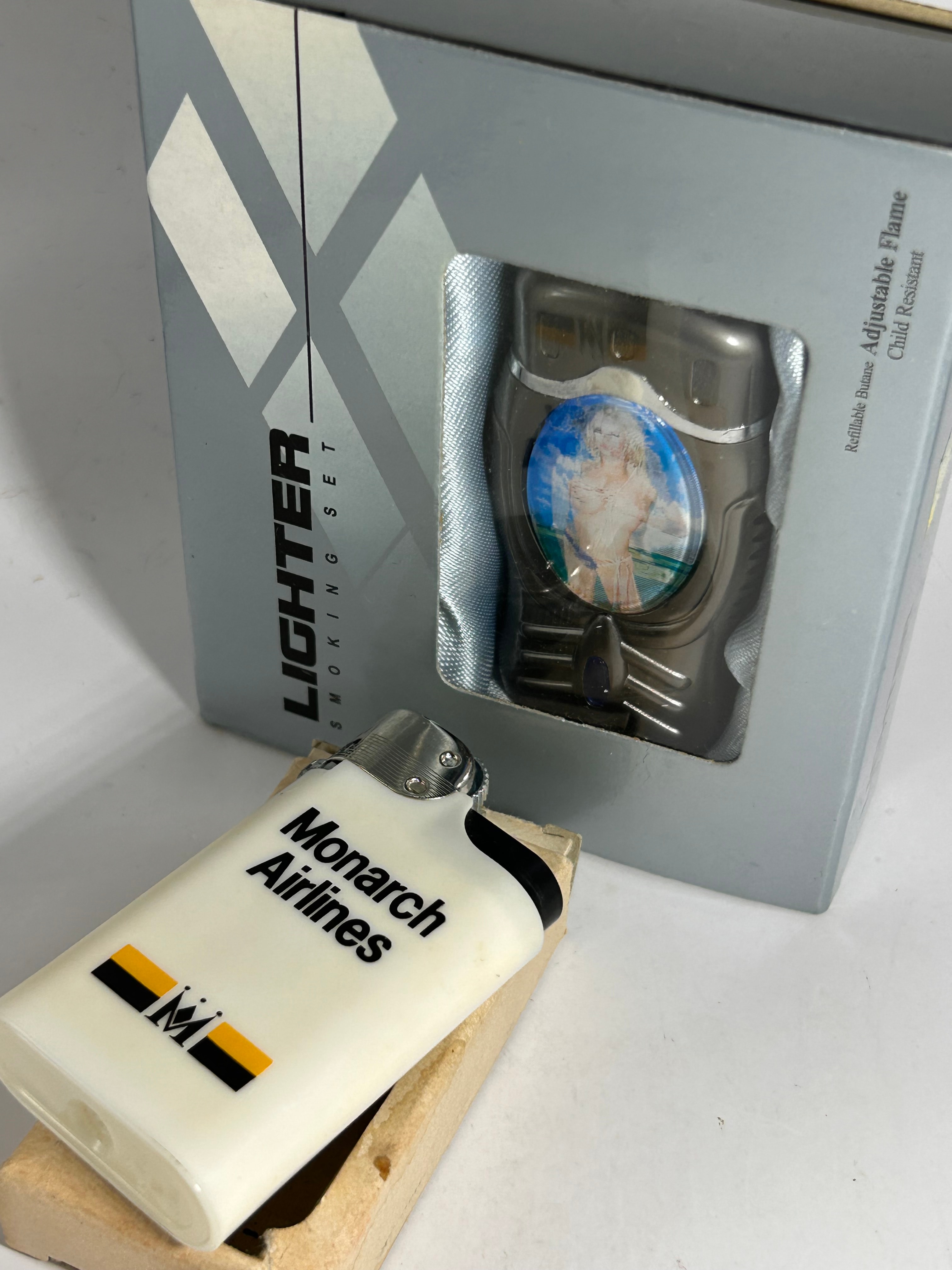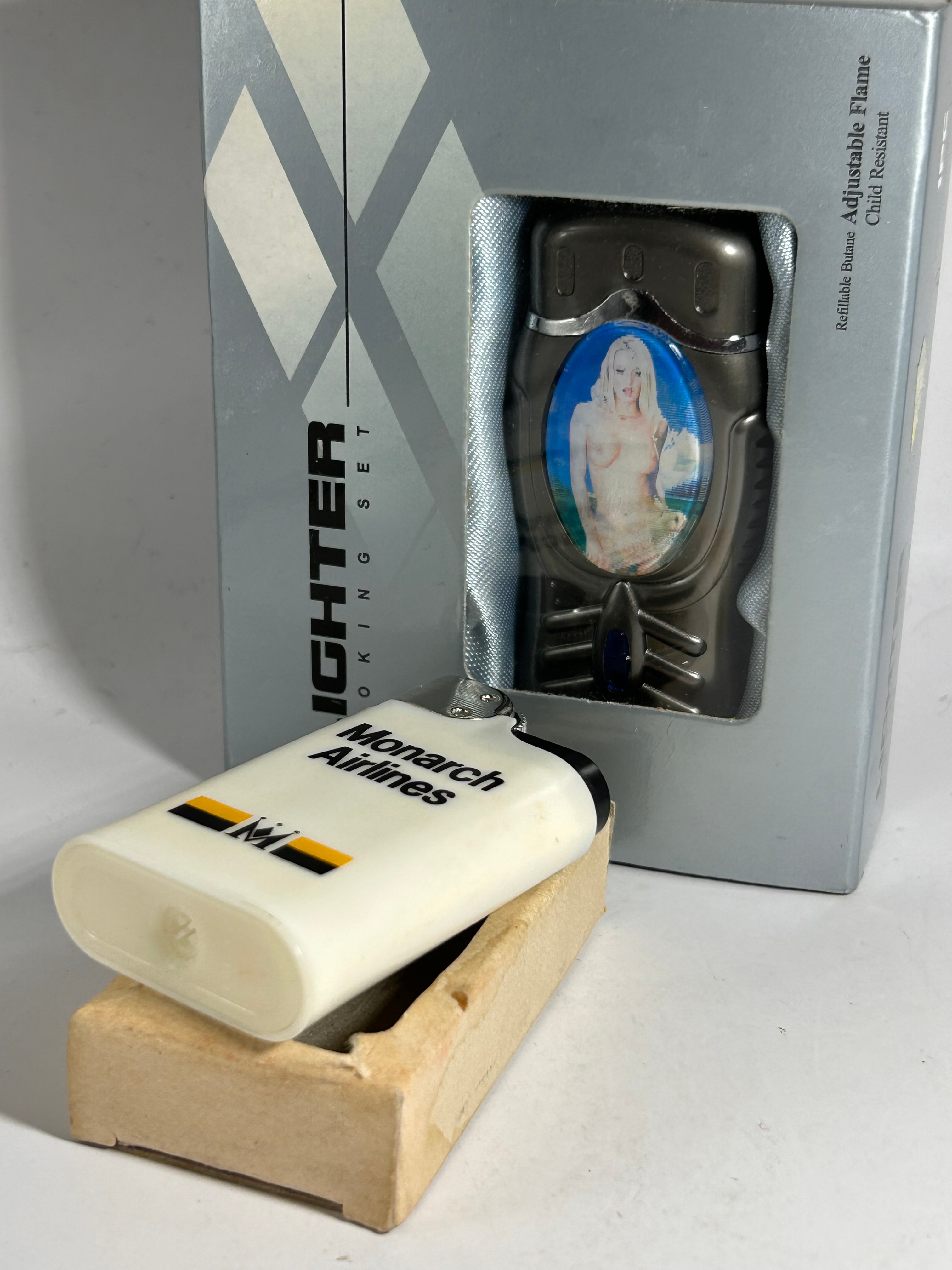 A group of two modern butane lighters. The first is presented in its original silver cardboard retail packaging, labeled “LIGHTER SMOKING SET” and detailing “Refillable Butane Adjustable Flame Child Resistant.” This lighter features a dark, possibly gunmetal finish and an ergonomic design, with a central oval insert depicting a blonde, fair-skinned woman, nude from the waist up, against a tropical background, in a classic pin-up style. The second lighter is a white rectangular model, likely plastic with a metal top, clearly marked “Monarch Airlines” and adorned with the airline’s “M” emblem in orange and black stripes; it is currently displayed in a small, light-colored wooden stand. Both lighters and the packaging are consistent with late 20th to early 21st-century manufacturing.