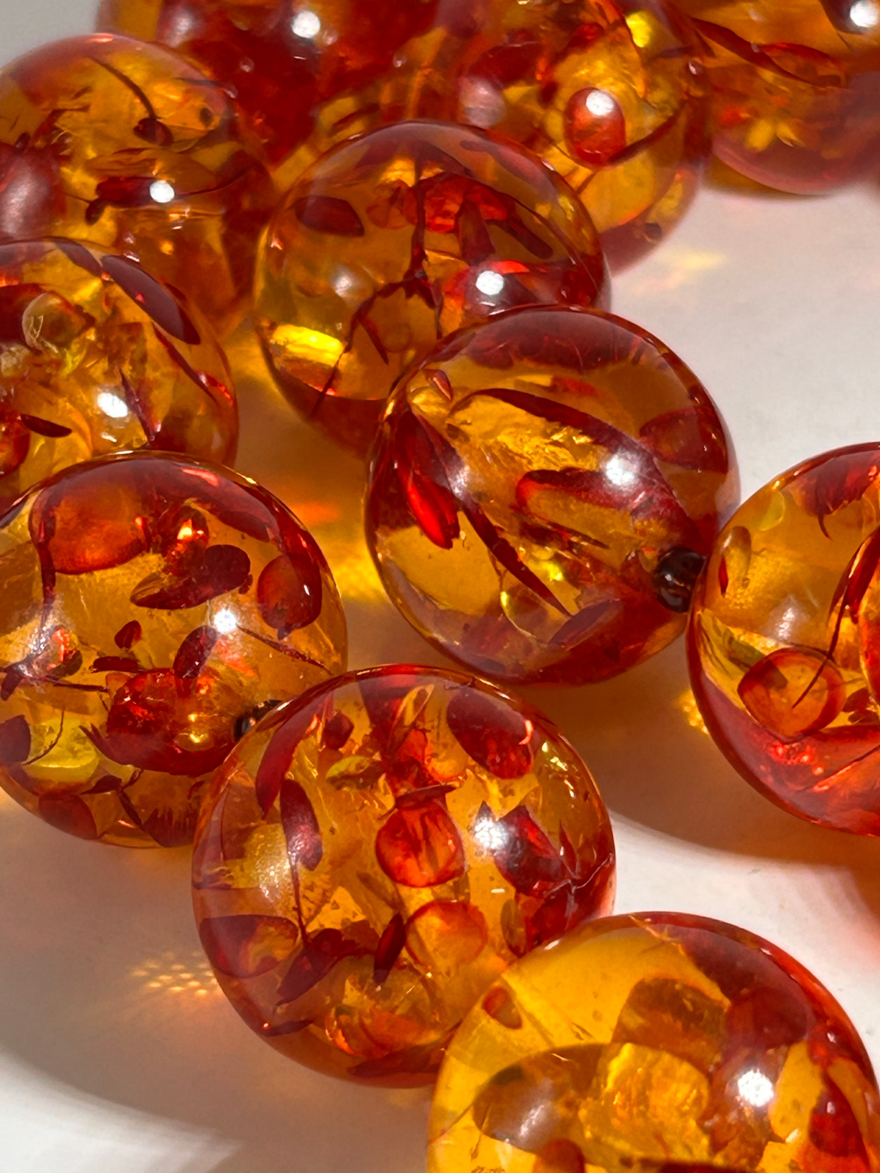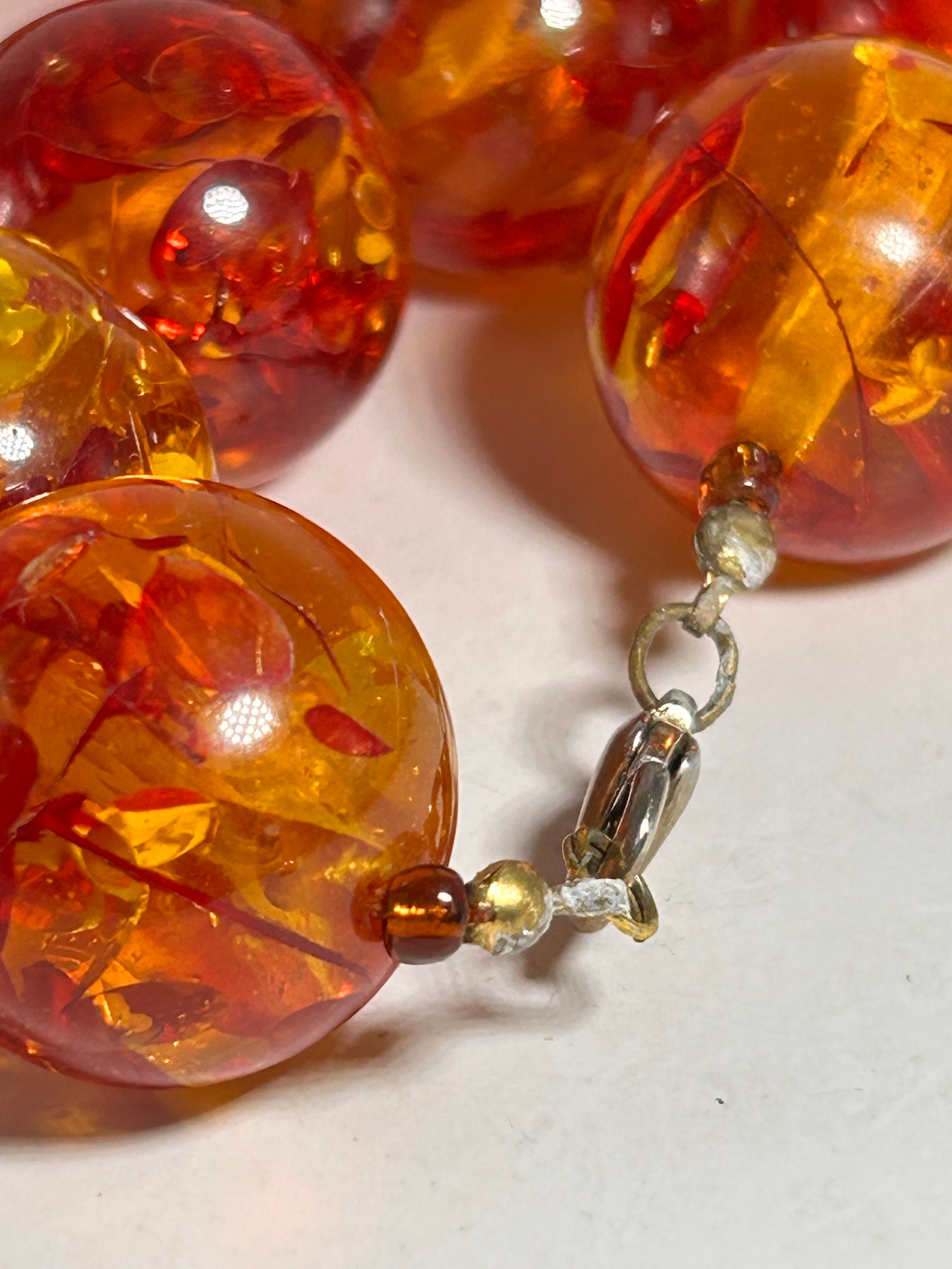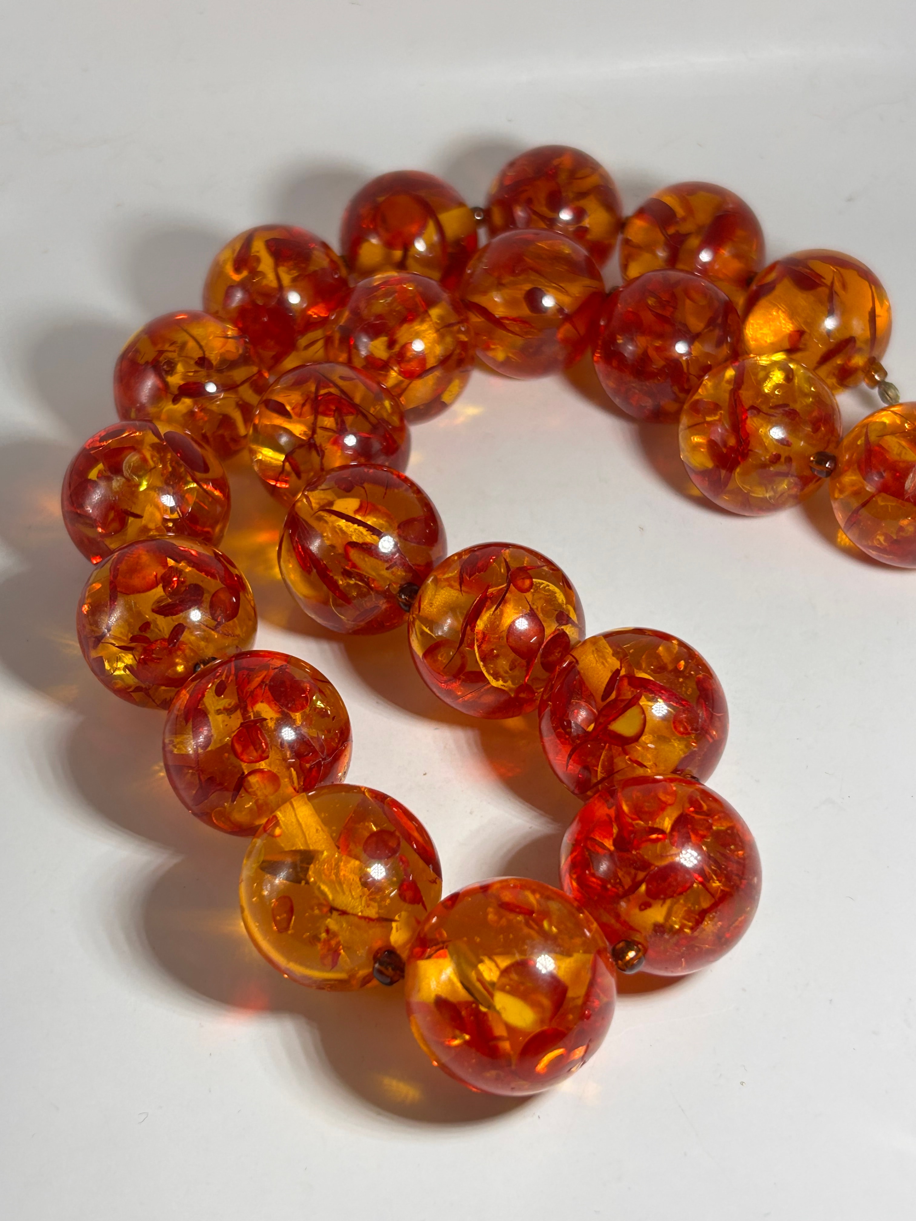 A long vintage Baltic amber? beaded necklace, composed of numerous spherical beads, largely uniform in size. The beads exhibit a translucent, warm amber-orange hue, each containing various internal inclusions that appear as irregular, fragmented pieces of darker red material suspended within the matrix. The necklace is secured by a tarnished metal barrel clasp. No visible text or markings are present on the beads or clasp. The style suggests a vintage period, possibly mid-20th century.