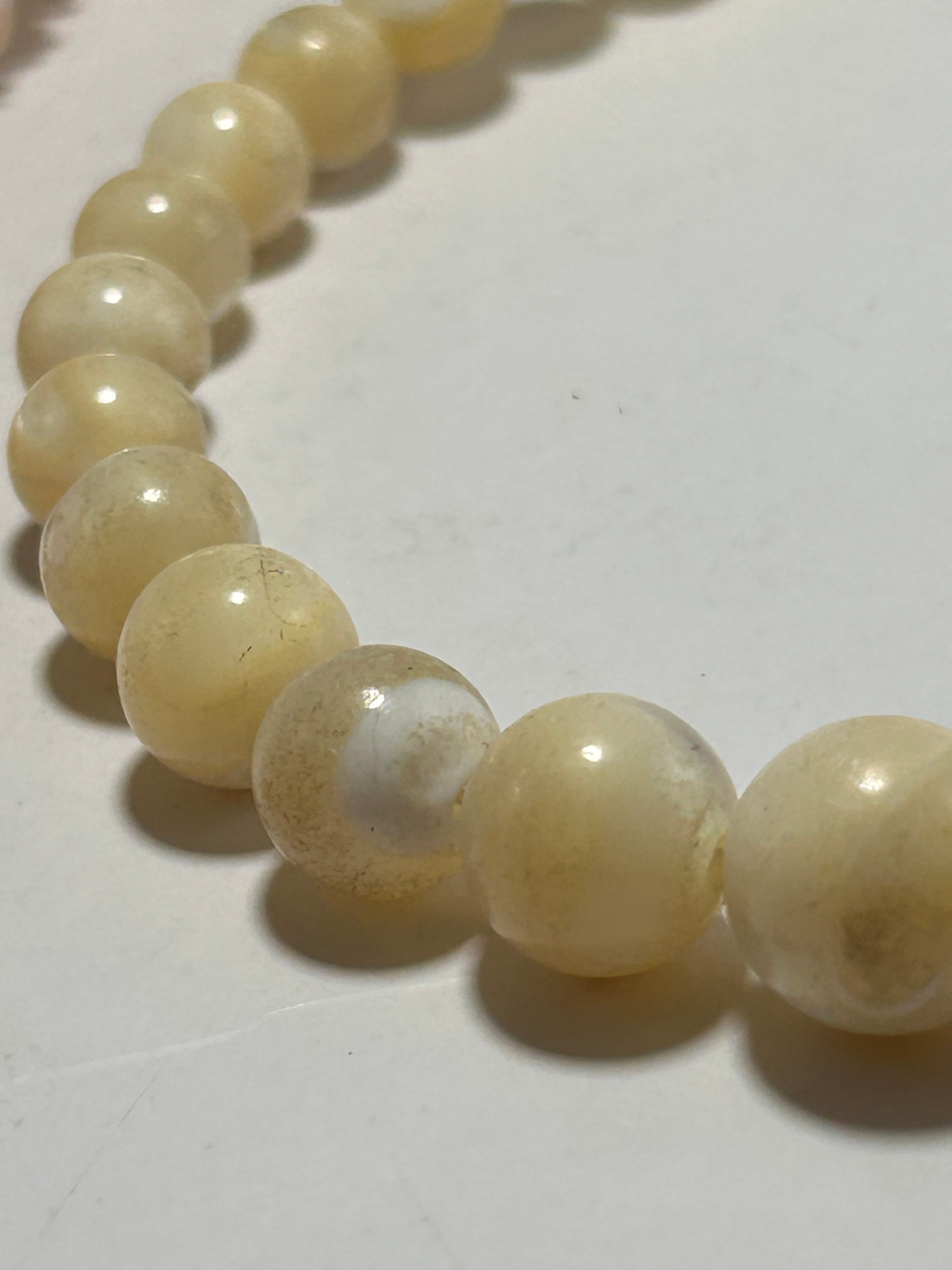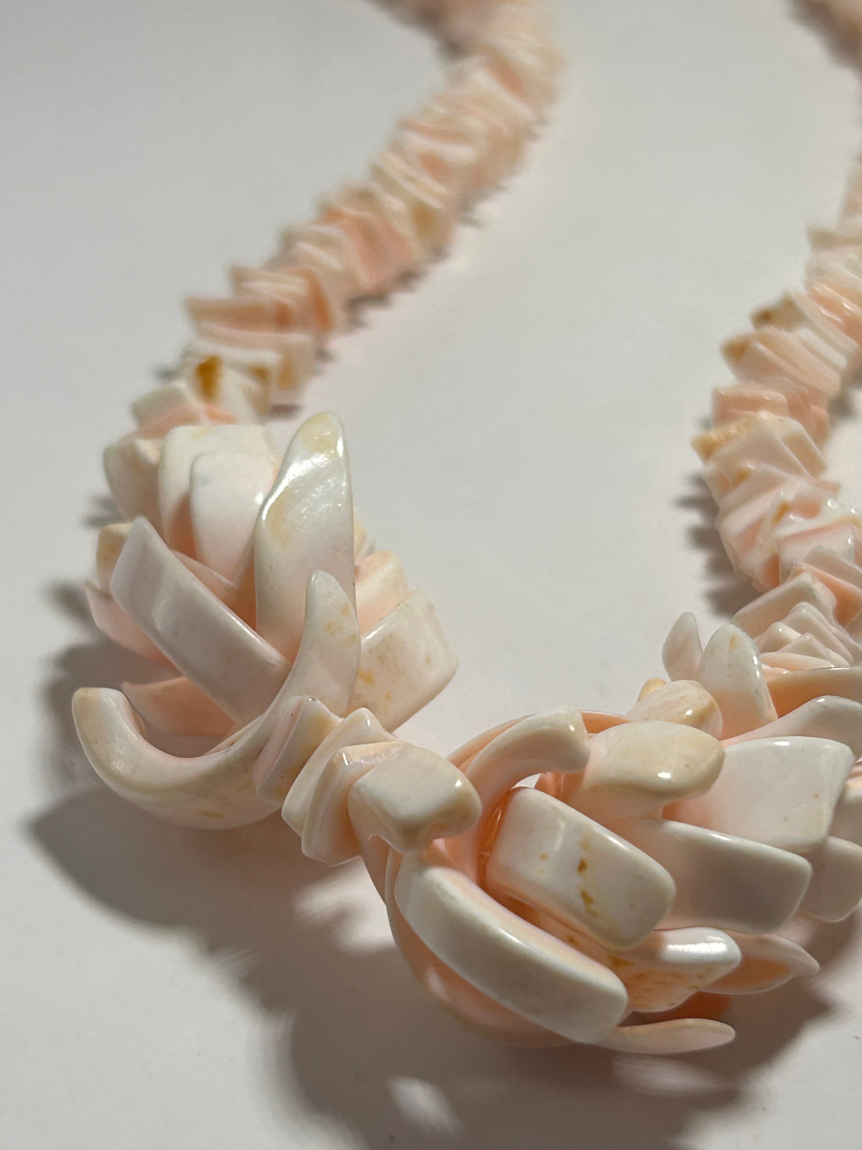 A vintage graduated mother of pearl bead necklace, consisting of uniformly spherical beads, exhibiting a cream-to-light-yellow hue and a nacreous luster. It is secured by a silver-toned barrel screw clasp. Accompanying this is a necklace constructed from numerous polished, irregular light pink to peach-toned shell pieces, with several larger, layered shell elements creating a focal point near the front. This necklace is secured by a brass-toned barrel screw clasp. Both items suggest a natural or bohemian style, likely from the 20th century or contemporary period.