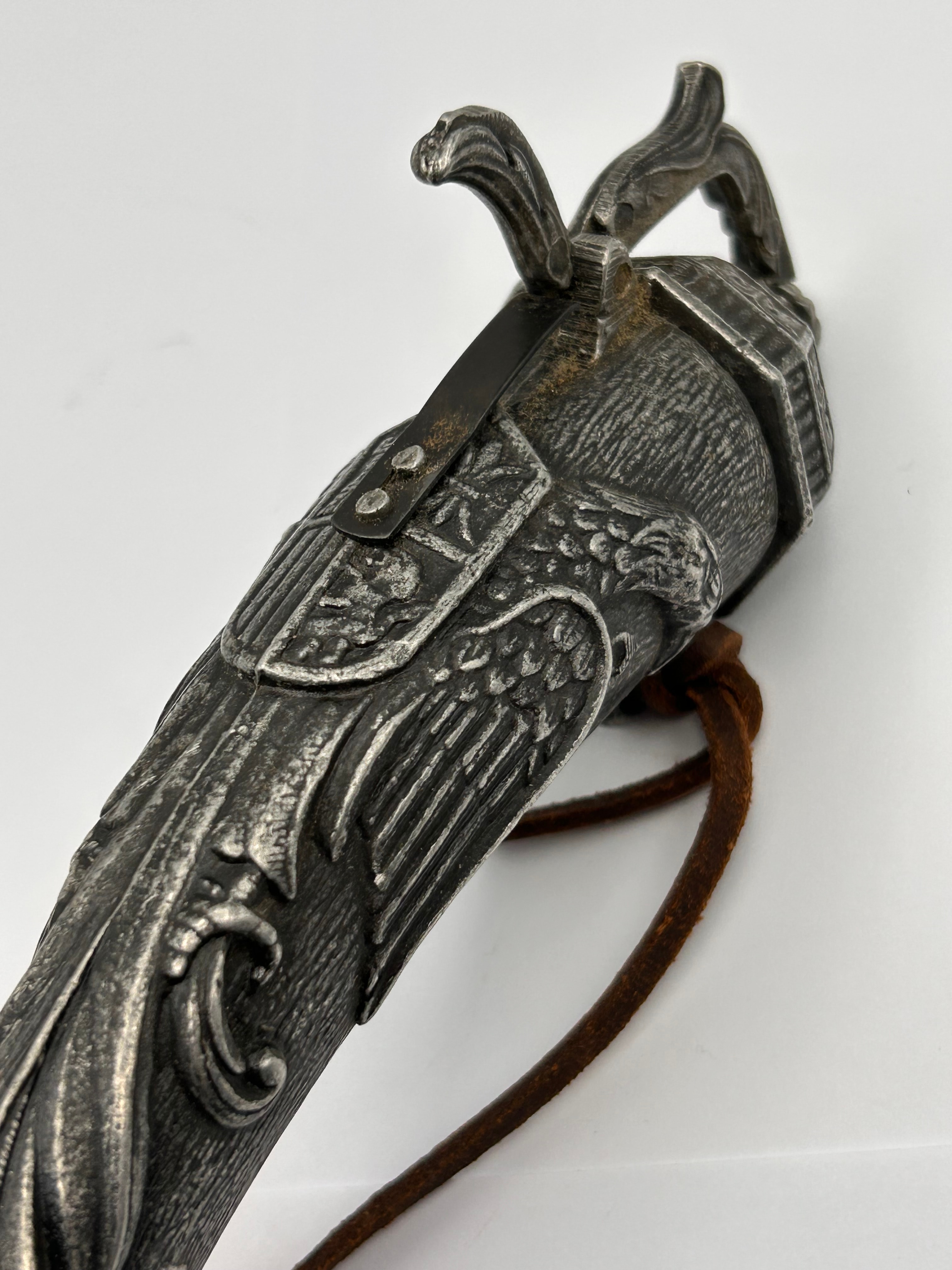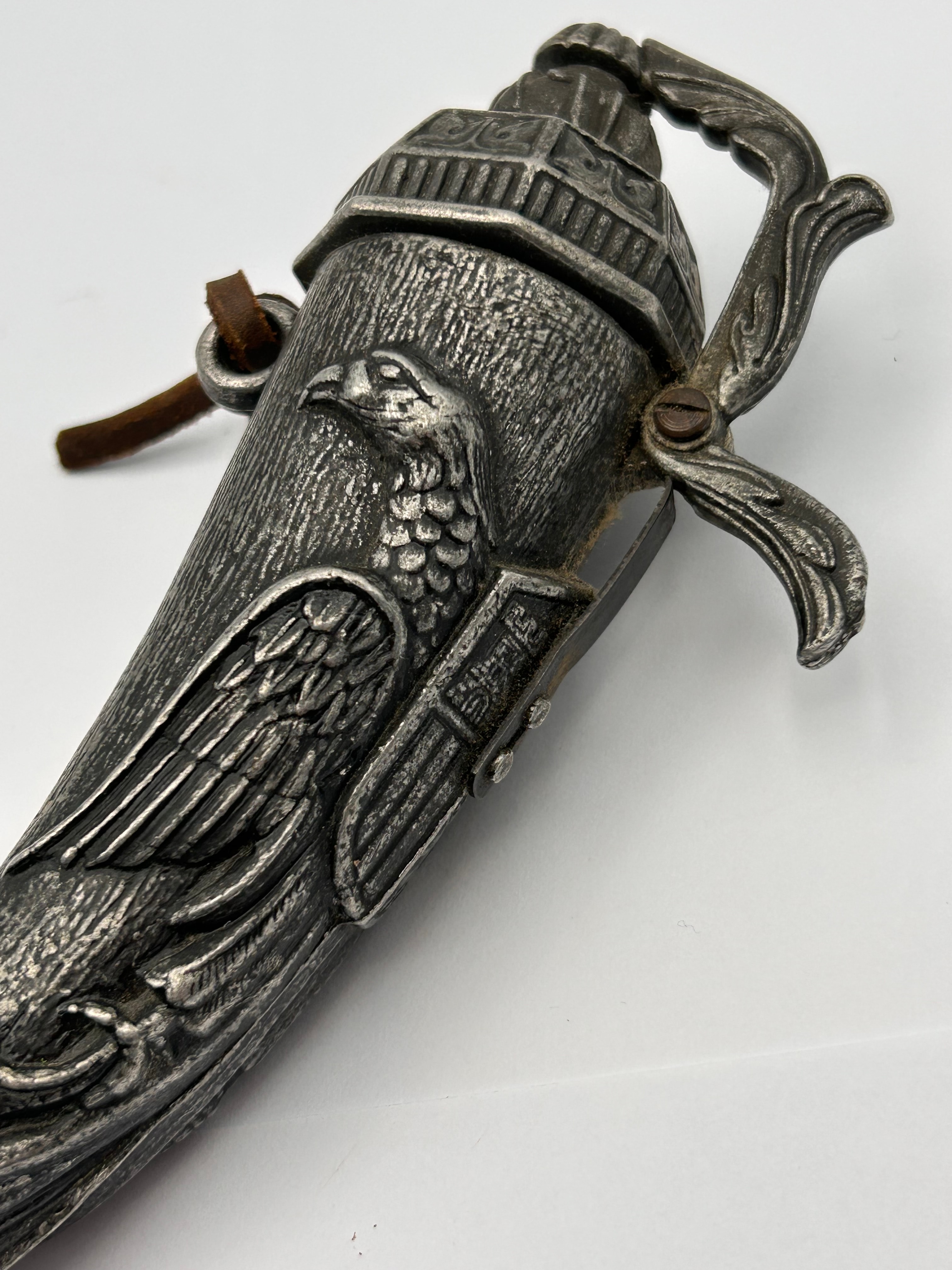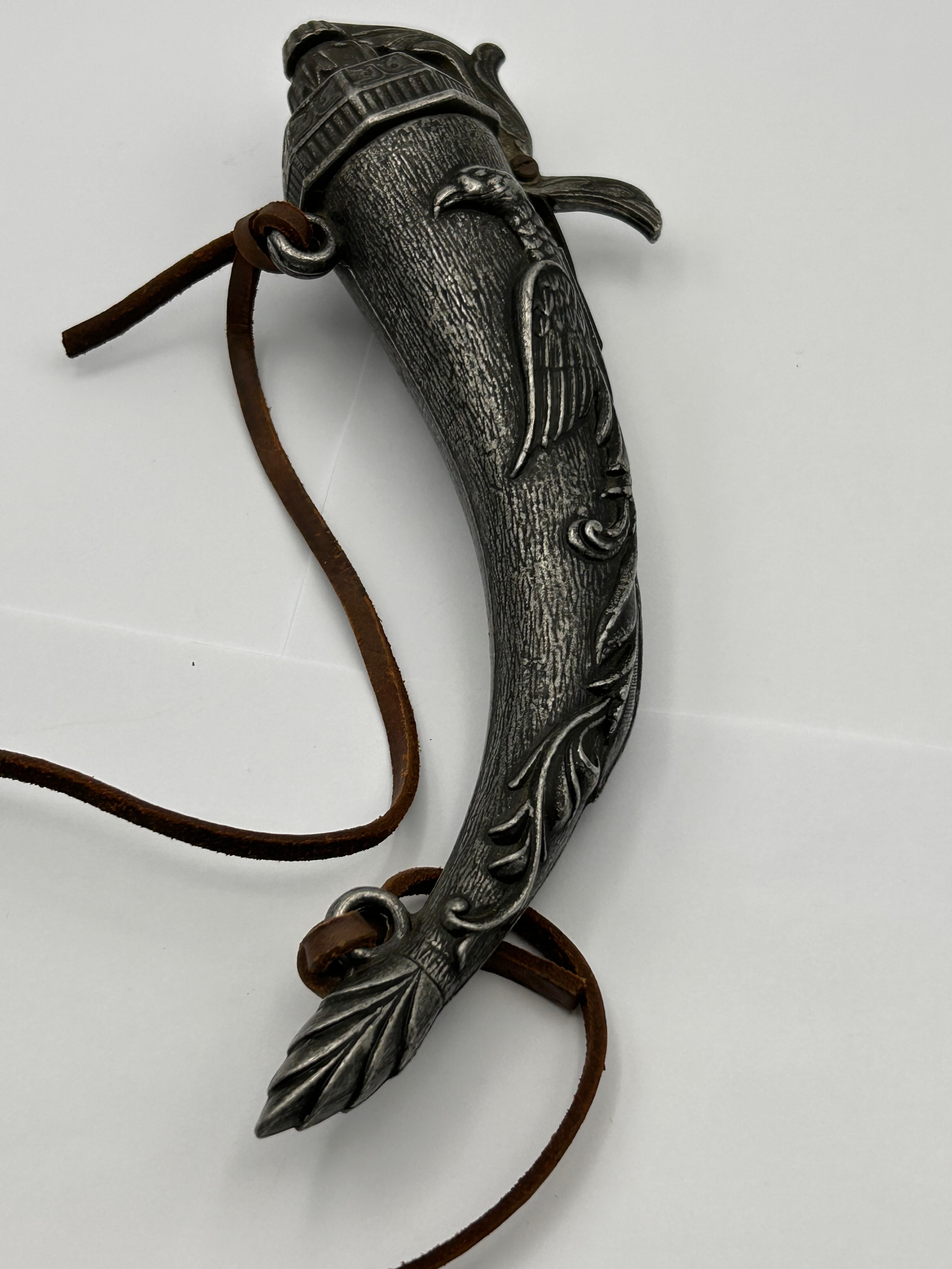 A Denix Spain pewter horn powder flask, crafted from a cast base metal with an antiqued, silver-toned finish and a textured surface mimicking wood grain. It features a prominent relief-carved eagle motif on one side, flanked by scrolling foliage and decorative bands, with a faceted design on the cap and an integrated handle/loop. A thin, dark brown leather strap is attached through metal rings.