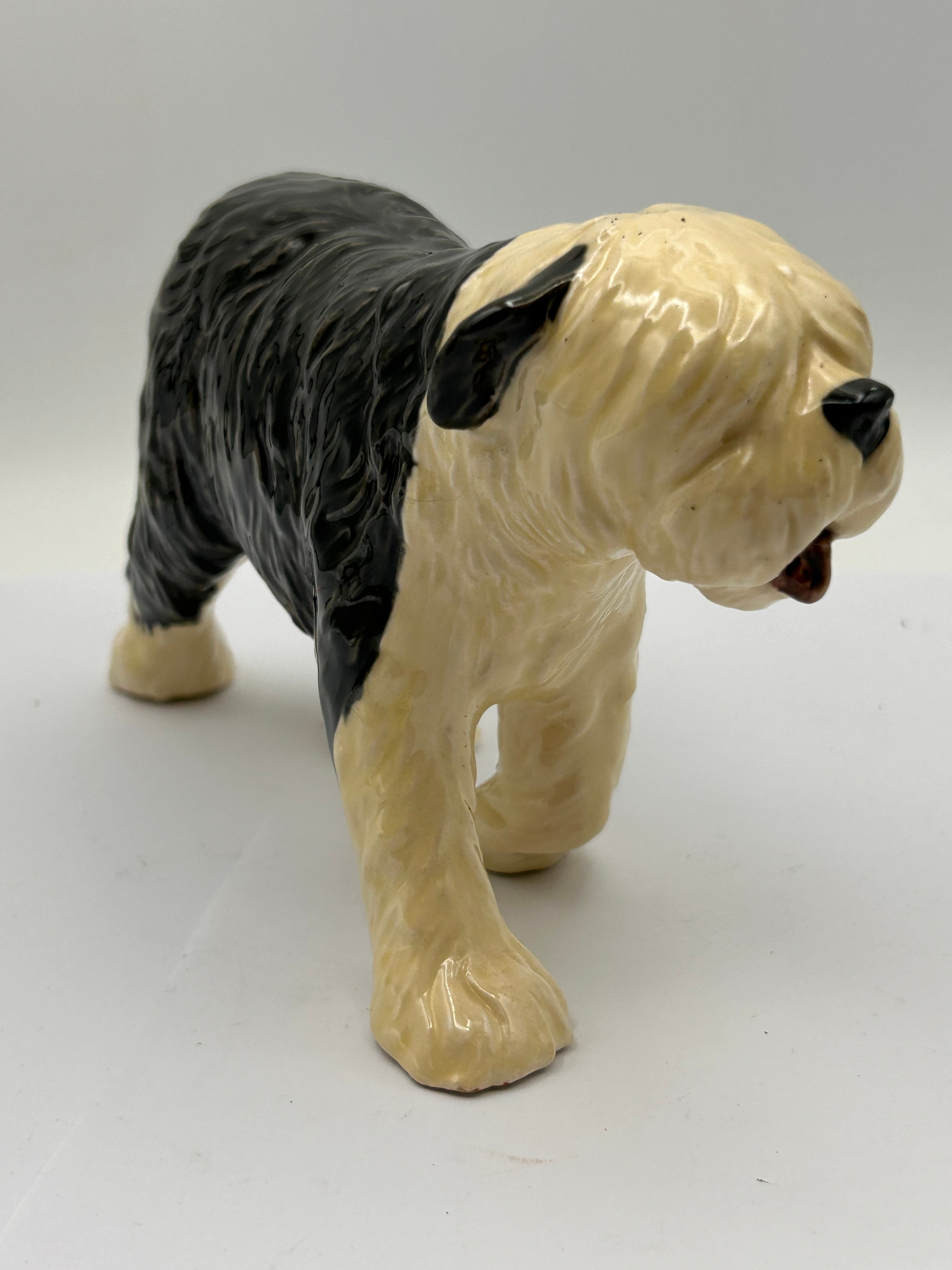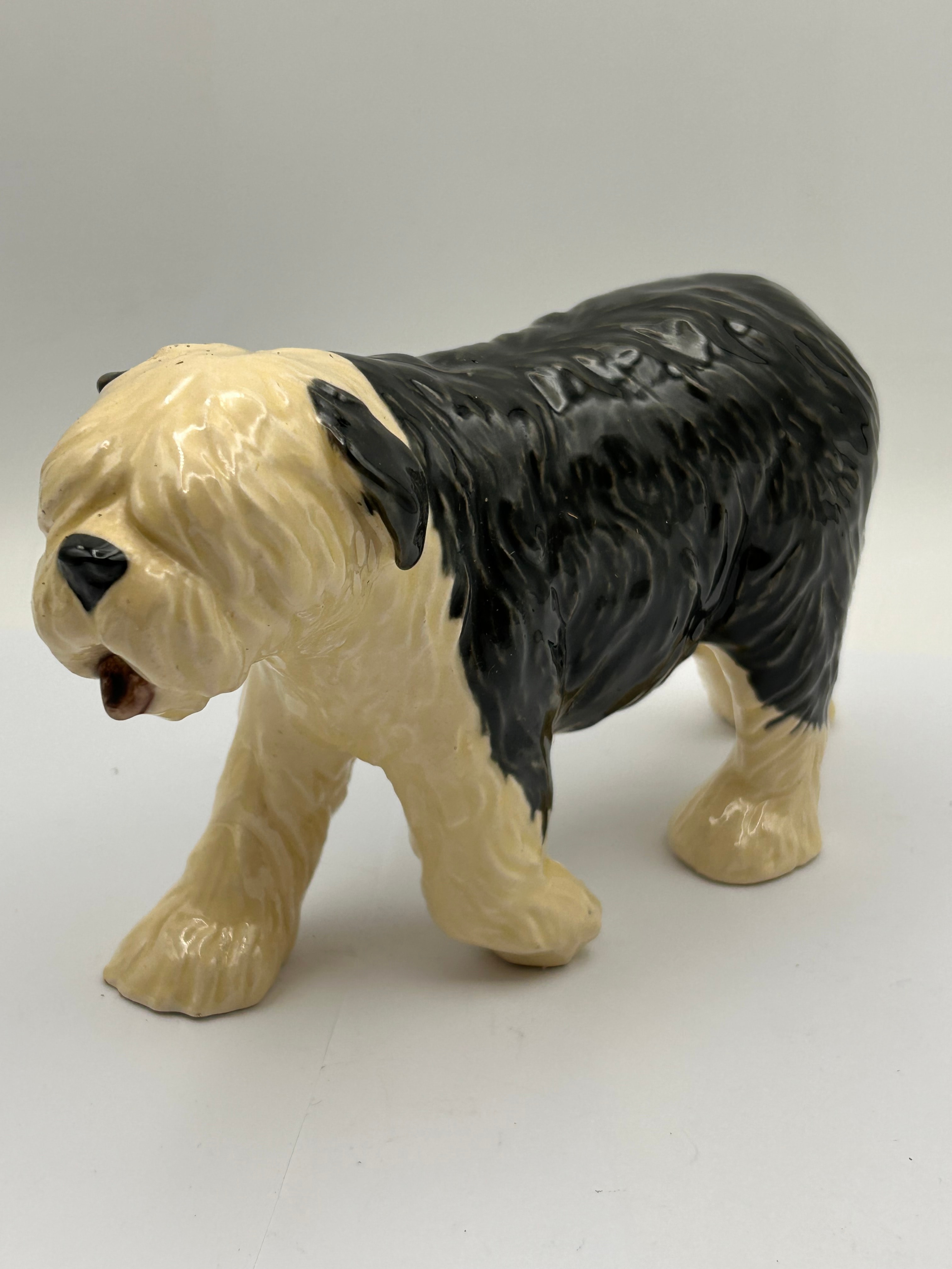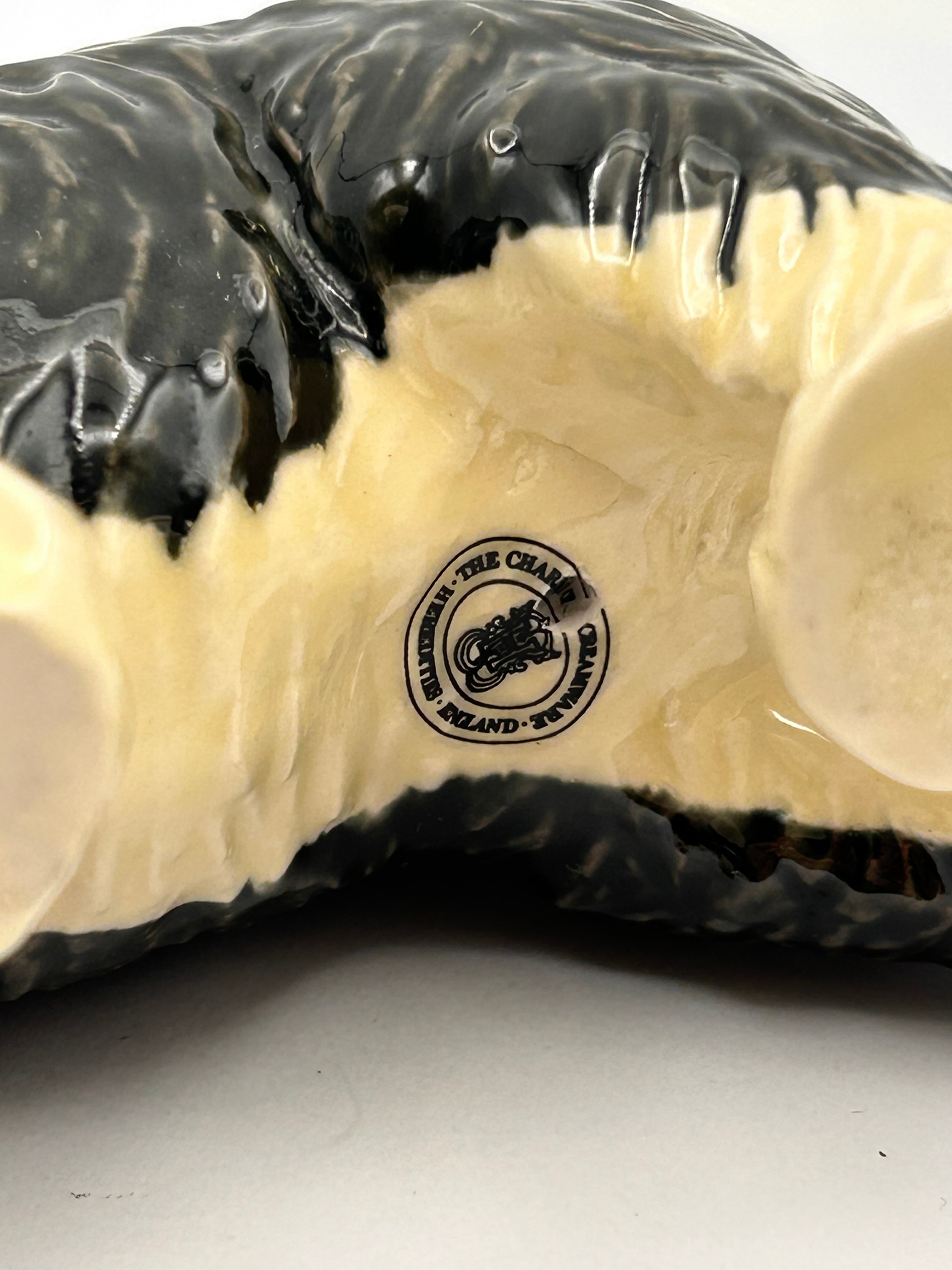 A Heredities Creamware Old English Sheepdog figurine. This glazed ceramic dog figurine depicts an Old English Sheepdog, characterized by its shaggy cream-colored head and front half, contrasting with a dark black body and hindquarters. On the underside, a clear circular stamp is visible, bearing the text “BULLDOG – THE CHELSEA” at the top and “ENGLAND – CERAMWARE” at the bottom, encircling a central stylized bulldog motif.