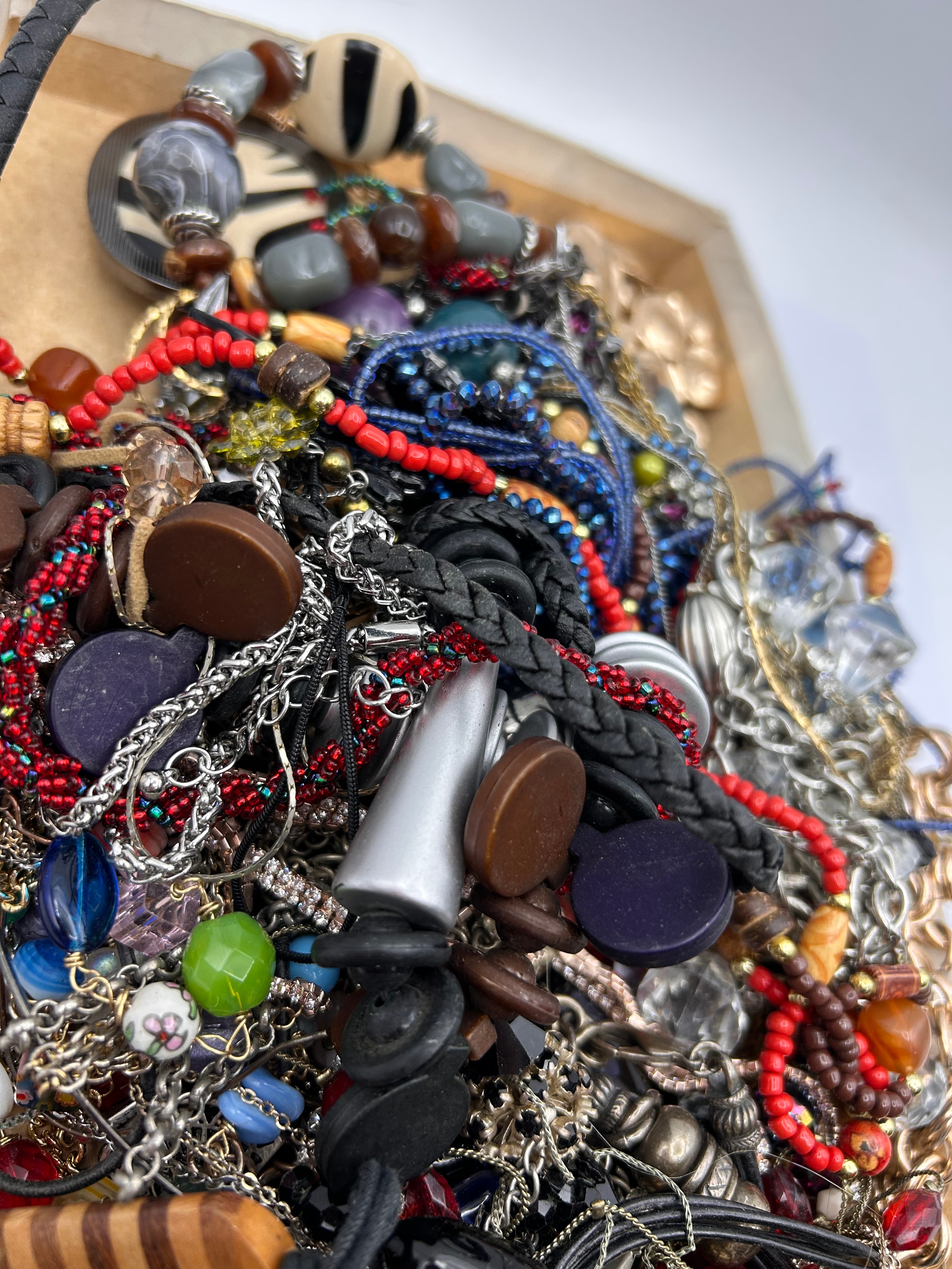 A diverse collection of predominantly costume jewelry, contained within a shallow cardboard box. The items comprise numerous necklaces and bracelets, featuring a wide array of materials including various base metals (gold-tone and silver-tone chains), plastic, glass, wood, resin, beads of various sizes and colors, and textile cords. Styles range from chunky and bohemian designs with large wooden or plastic elements, to finer beaded pieces and metal chains, suggesting a mixed period from mid-20th century to contemporary. No specific manufacturer markings or visible text are discernible.