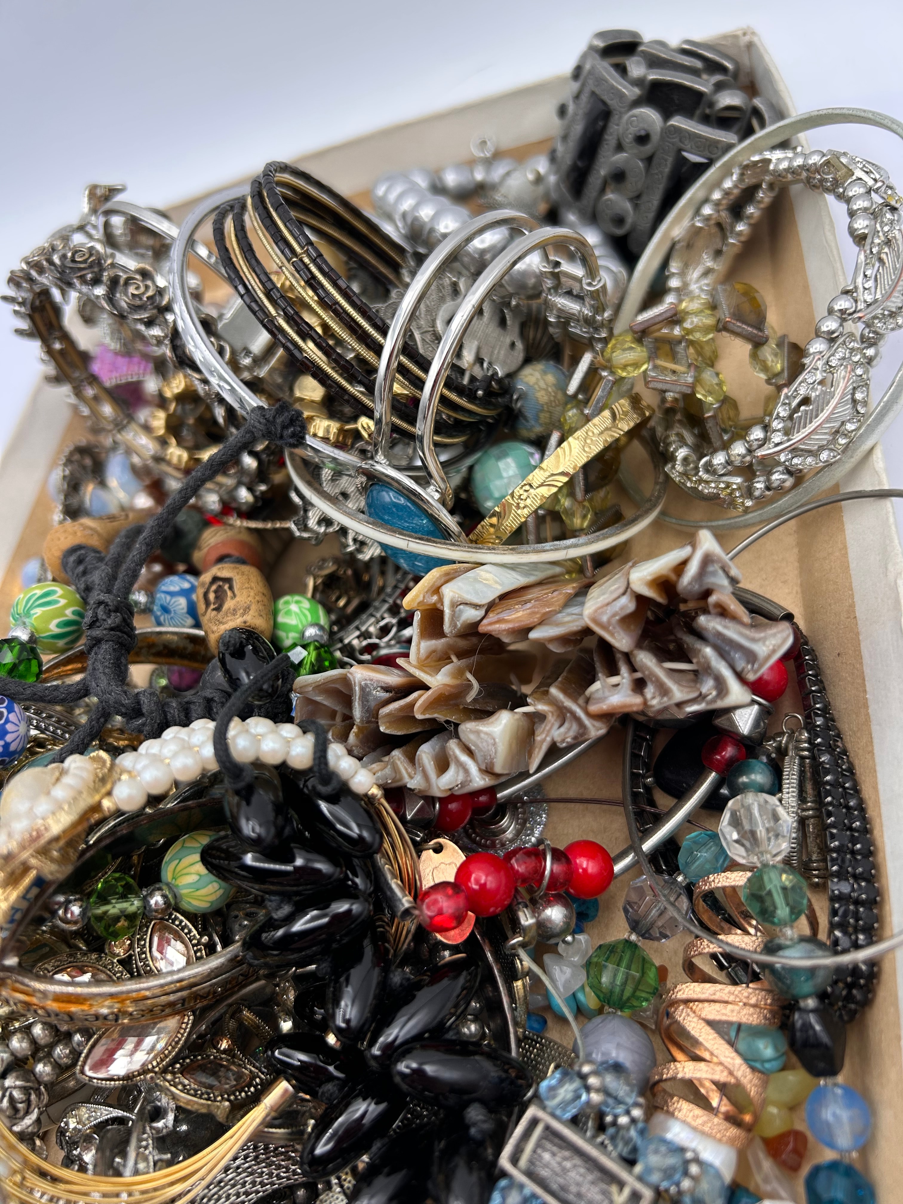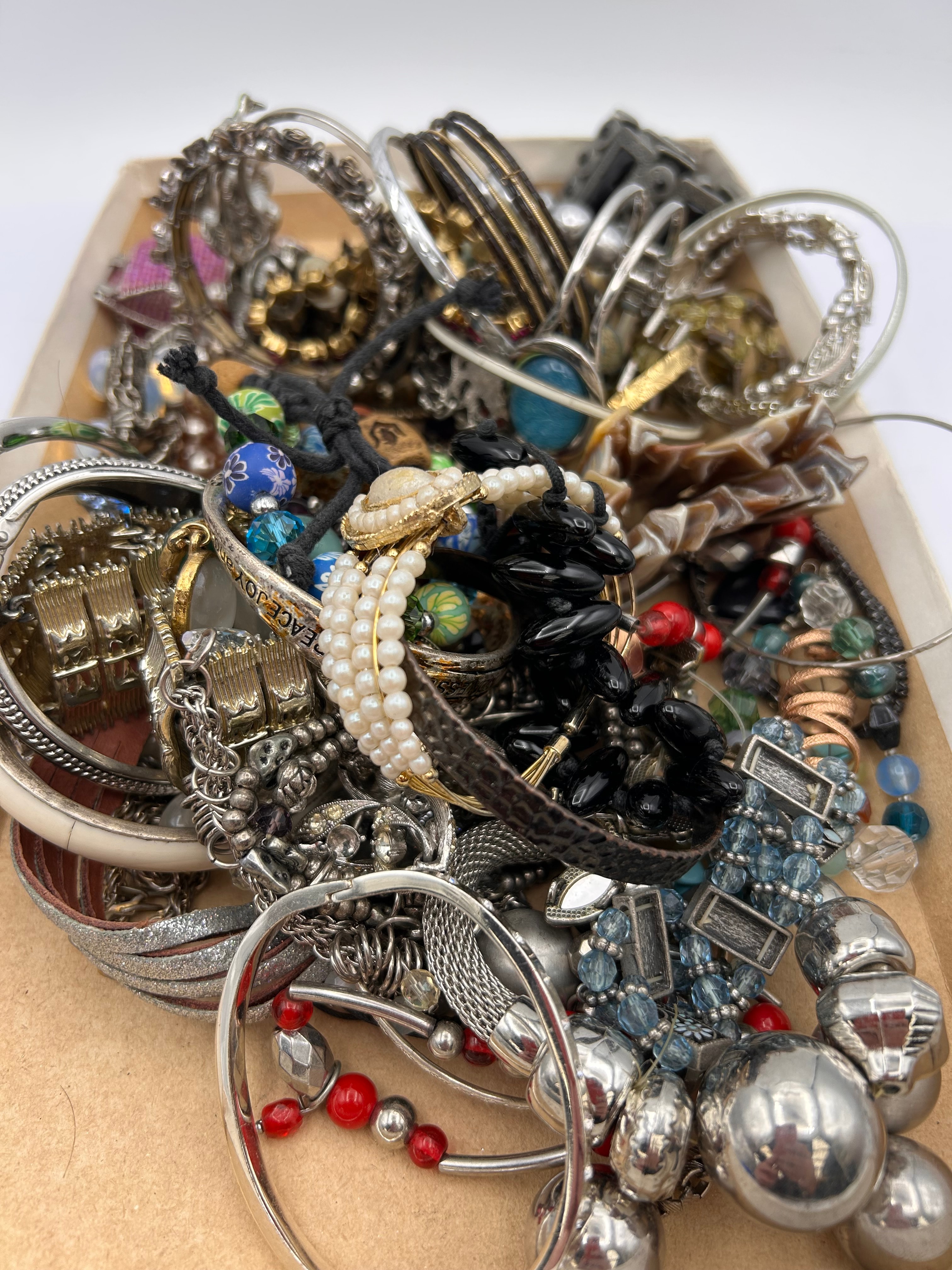 This diverse collection comprises predominantly costume jewelry, featuring various bracelets including bangles, chain, and beaded styles, alongside rings and necklace elements. Materials are varied, incorporating silver-tone, gold-tone, and copper-tone metals, various glass and plastic beads, faux pearls, natural shell, and cord. One silver-tone bracelet is visibly inscribed with the English word ‘PEACE’. The assortment reflects a range of styles and periods, from vintage to modern.