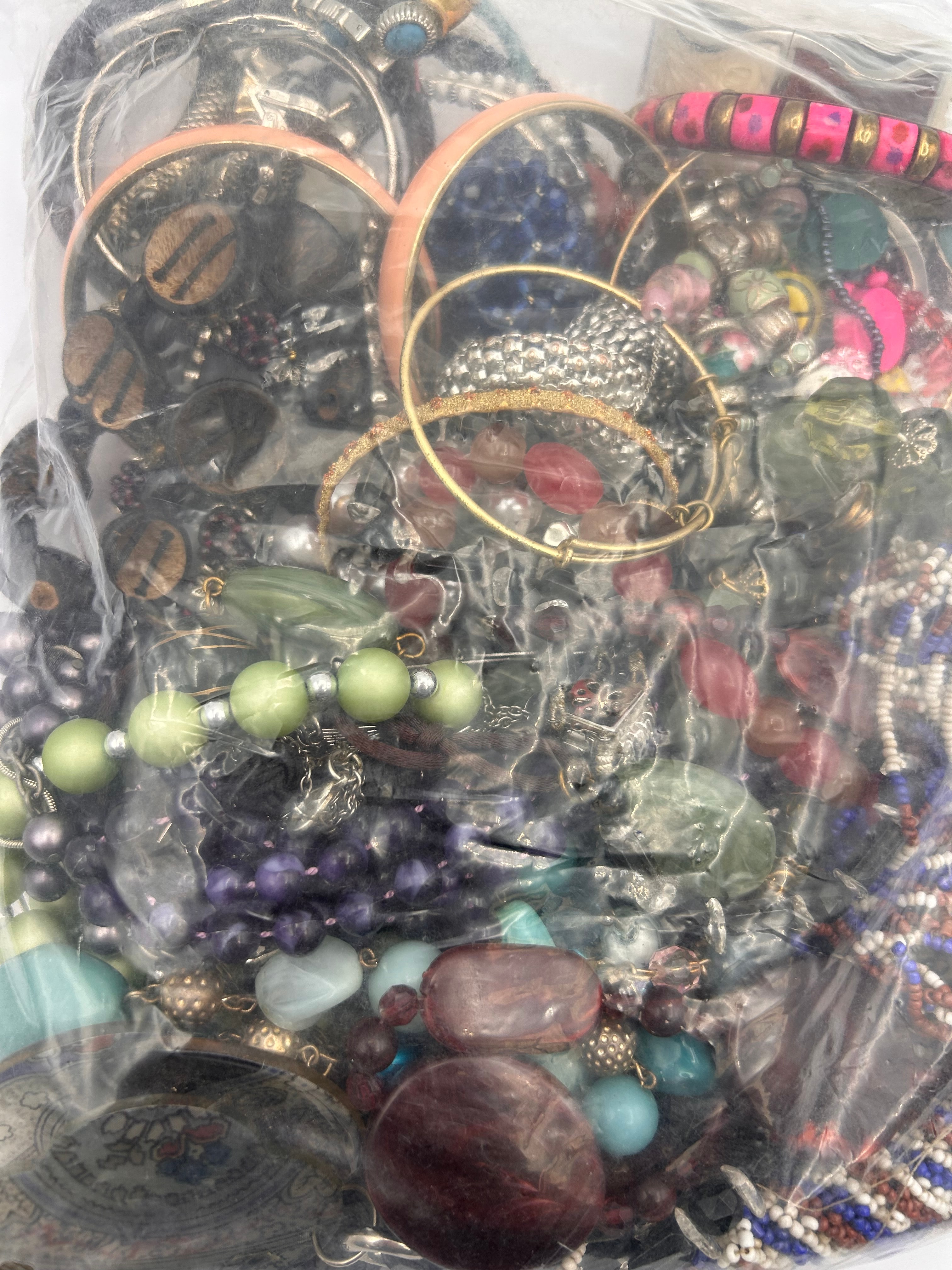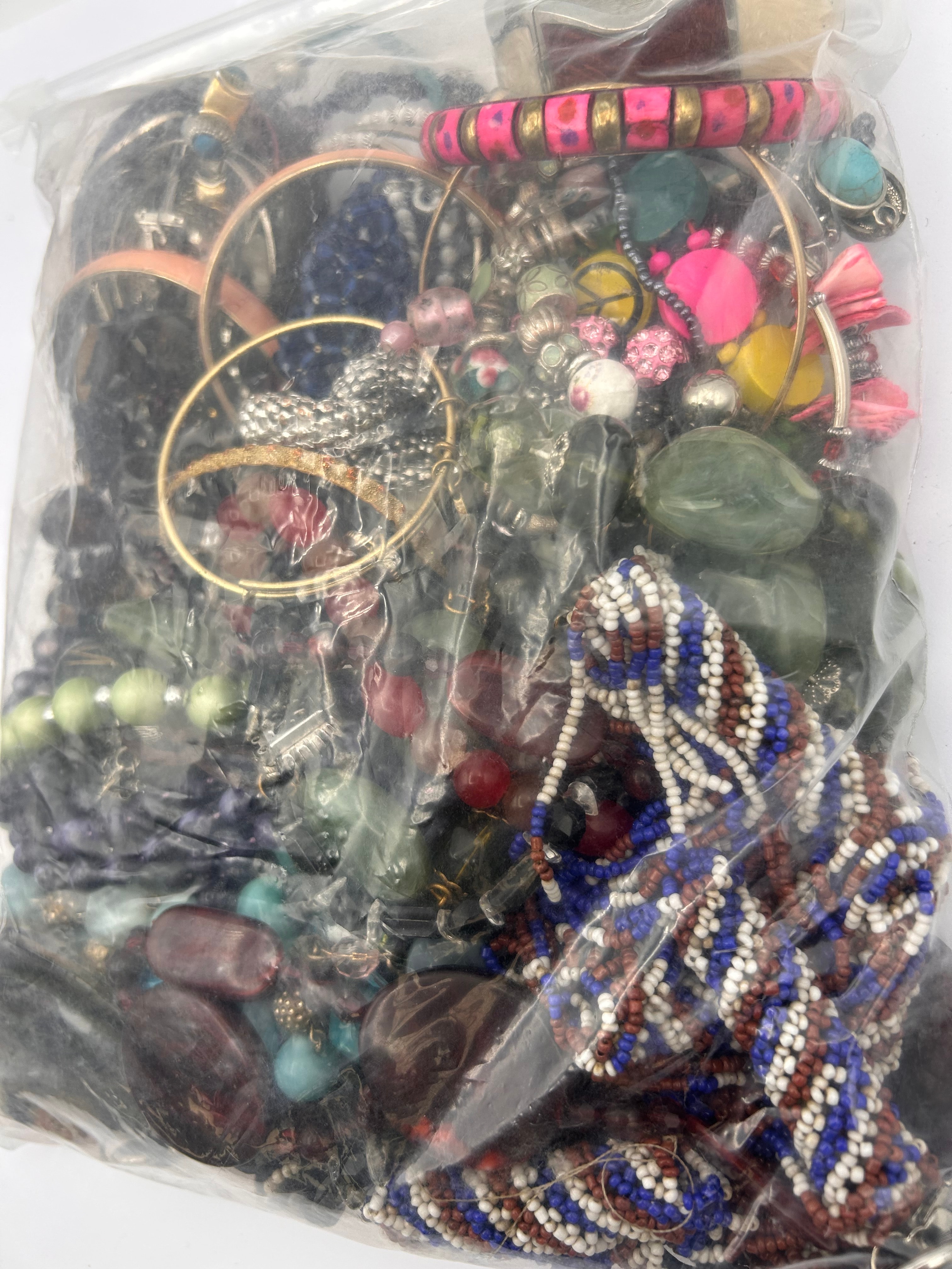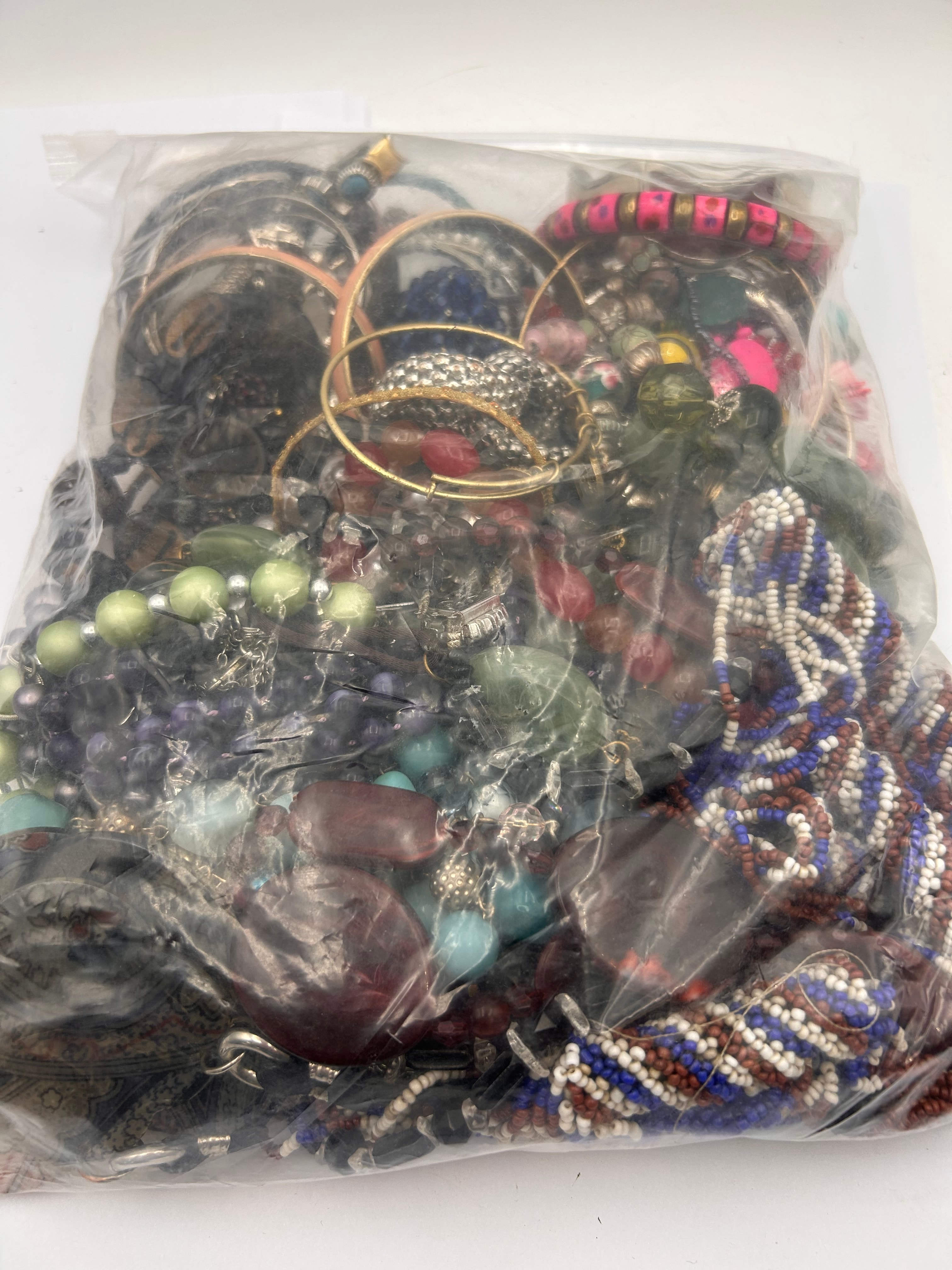 A large collection of mixed vintage to contemporary costume jewelry, presented in a clear plastic bag. The assortment primarily features contemporary styles and includes a diverse range of necklaces, bracelets (including bangles and beaded designs), and other small items. Materials comprise mixed metals (gold-tone and silver-tone), glass, plastic, and ceramic or stone-like beads, offered in a varied palette of colors such as green, blue, purple, red, pink, and multi-colored seed beads. Notable visible pieces include multiple metal bangles, a prominent multi-strand seed bead necklace with a zigzag pattern in blue, brown, and white, and various other beaded necklaces featuring both large and small beads. No specific text or maker’s marks are discernible through the packaging.
